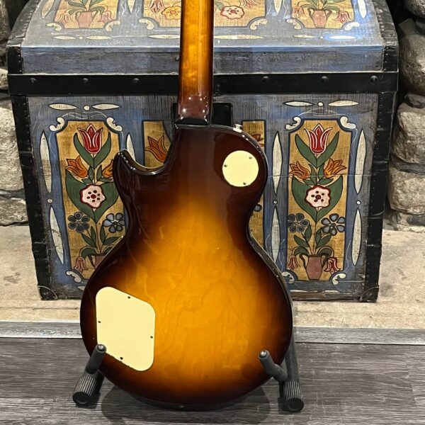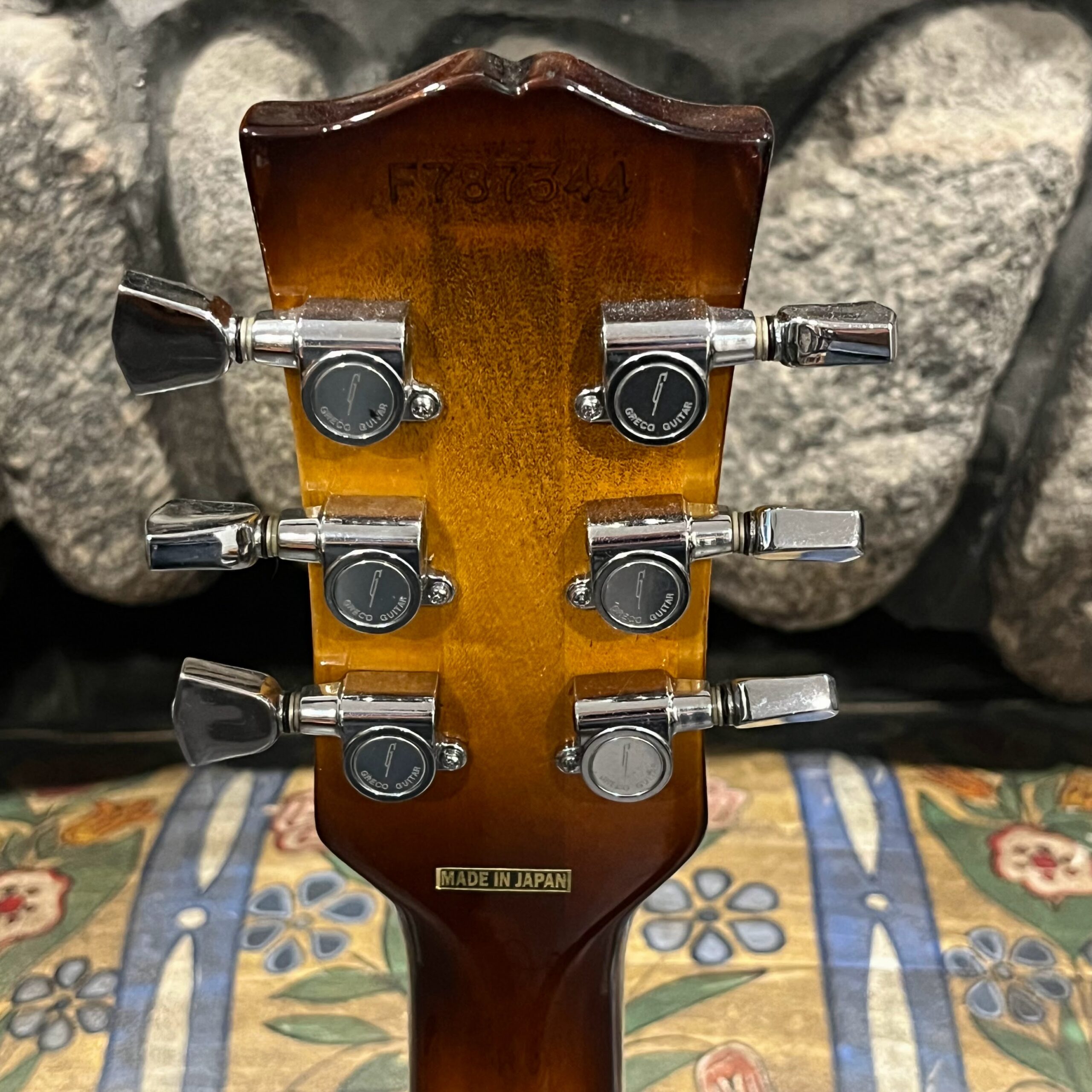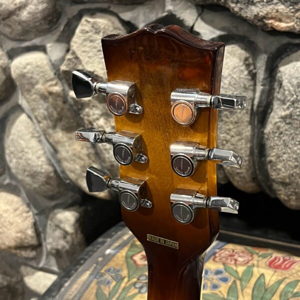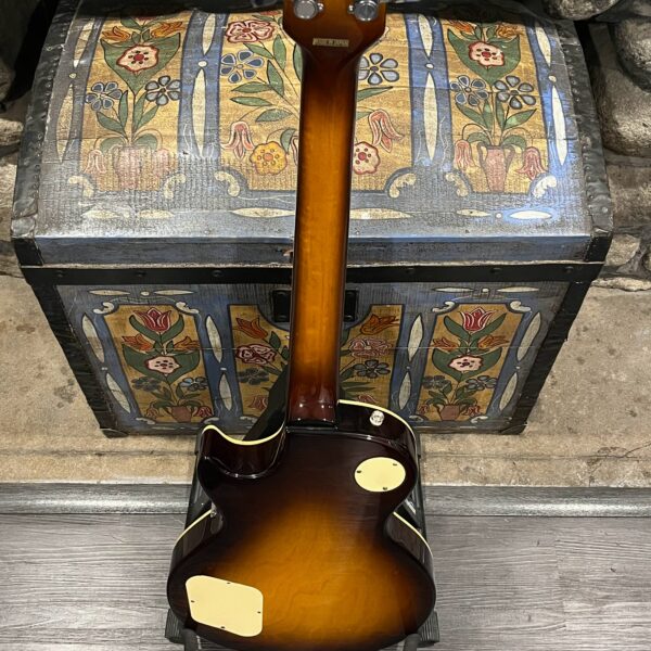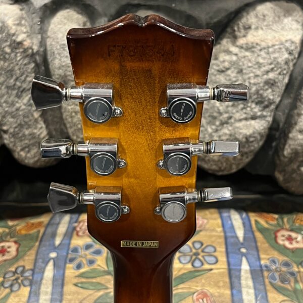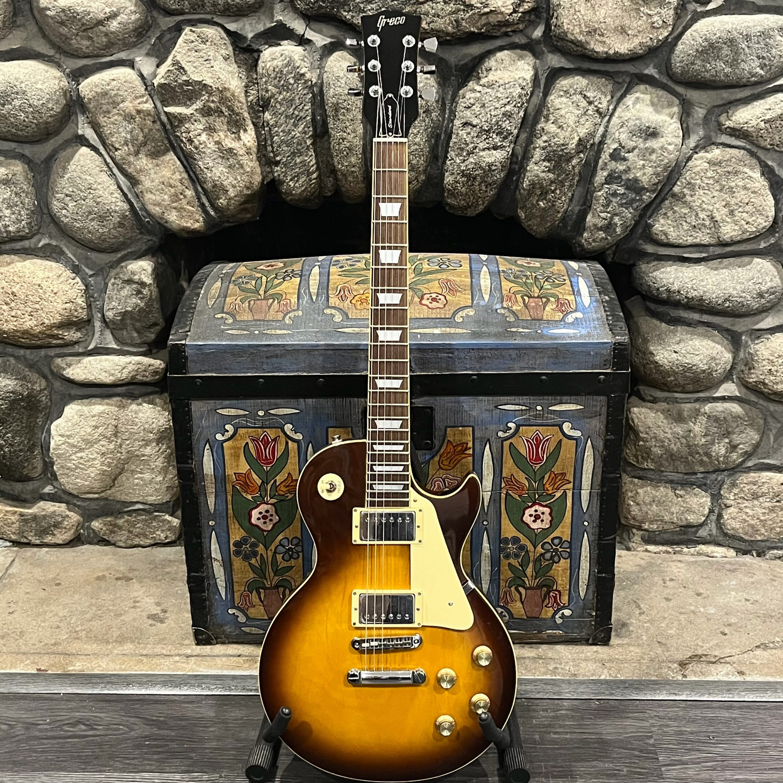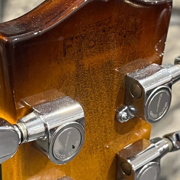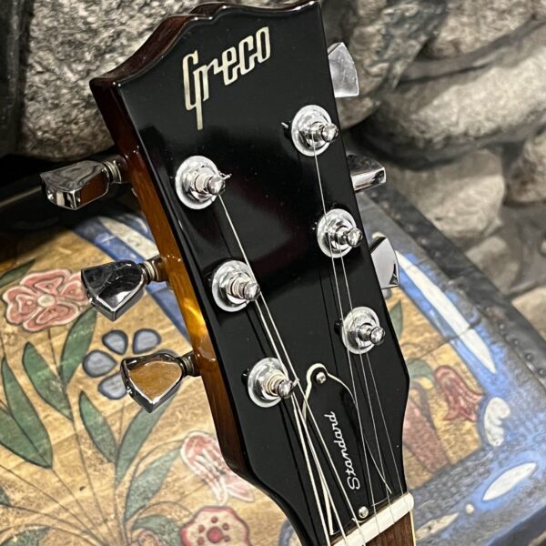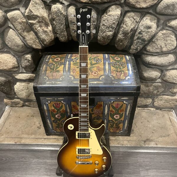 Beautiful looking and sounding 1978 Greco EG (Electric Guitar) 500. This is an odd guitar, I can’t find a catalog entry for it, has some unique and interesting touches that make it different than a standard Greco EG-500. For a start, this one has a single piece front and back with a semi chambered construction, not how a standard – Standard EG-500 is made, those things are solid and heavy too. This one is fairly light in comparison at 8.5lb. Excellent sounding original pickups, U1000 by Maxon, very high end Japanese PAF copies, same in construction and output to an Ibanez Super70. The neck is thin and blade like, actually thinner than any Gibson slim-taper without a 70s volute. It’s a very odd bird indeed. As stated, I haven’t found a catalog entry for any instrument that resembles these particular specs during this late lawsuit period. This is a domestic market instrument, so Greco never stopped copying Gibson like Ibanez was forced to, though the instruments were made beside each other at the same factories. If I had to guess, I’d say it was a Japan market special with features designed to appeal to the home audience. Traditional aesthetics with super lightweight and a thin neck, something smaller for the Japanese frame. Setup on 10s, weighs an excellent and lightweight (for the period) 8lb and 10oz, and comes in a Gibson gig bag. Made in June of 1978 in the Fujijen facility in Japan. Pro setup by Eric’s Guitars, rock solid instrument with classic PAF tones. Beautiful flaming in the slim tapered mahogany neck. Aging gracefully.
