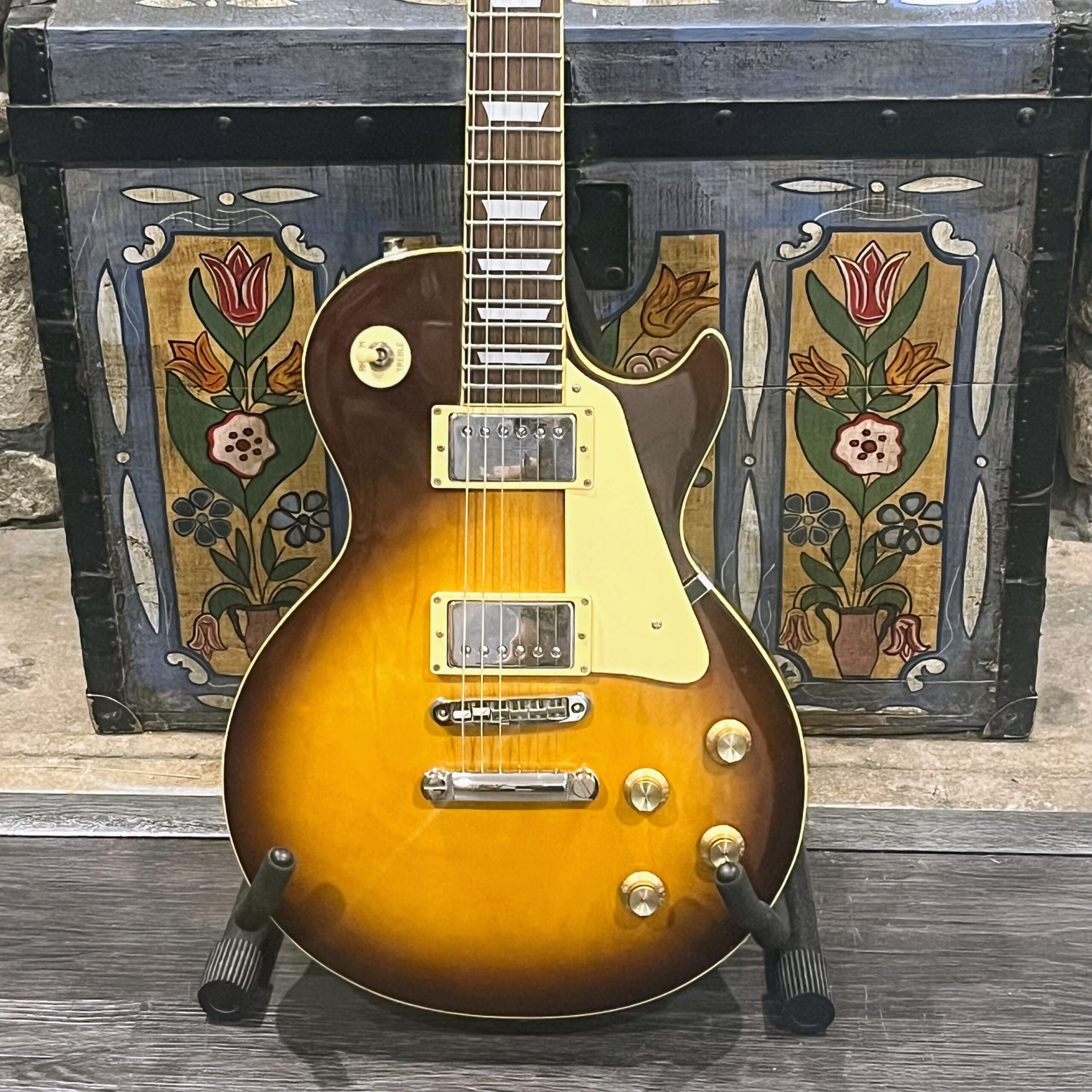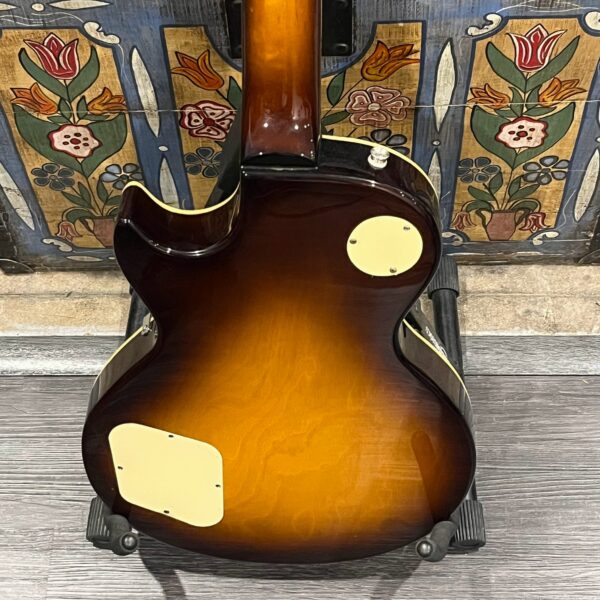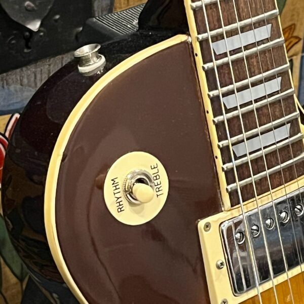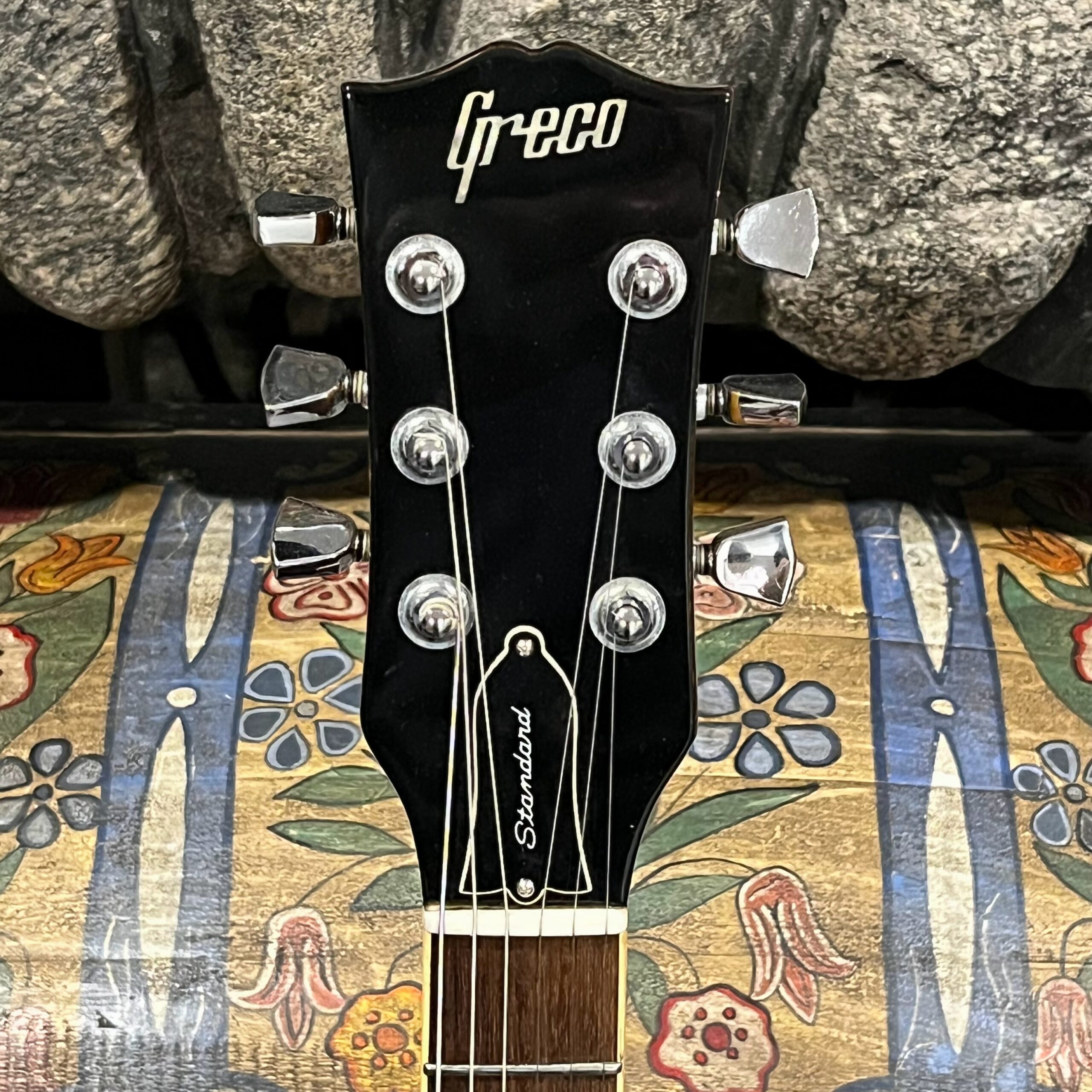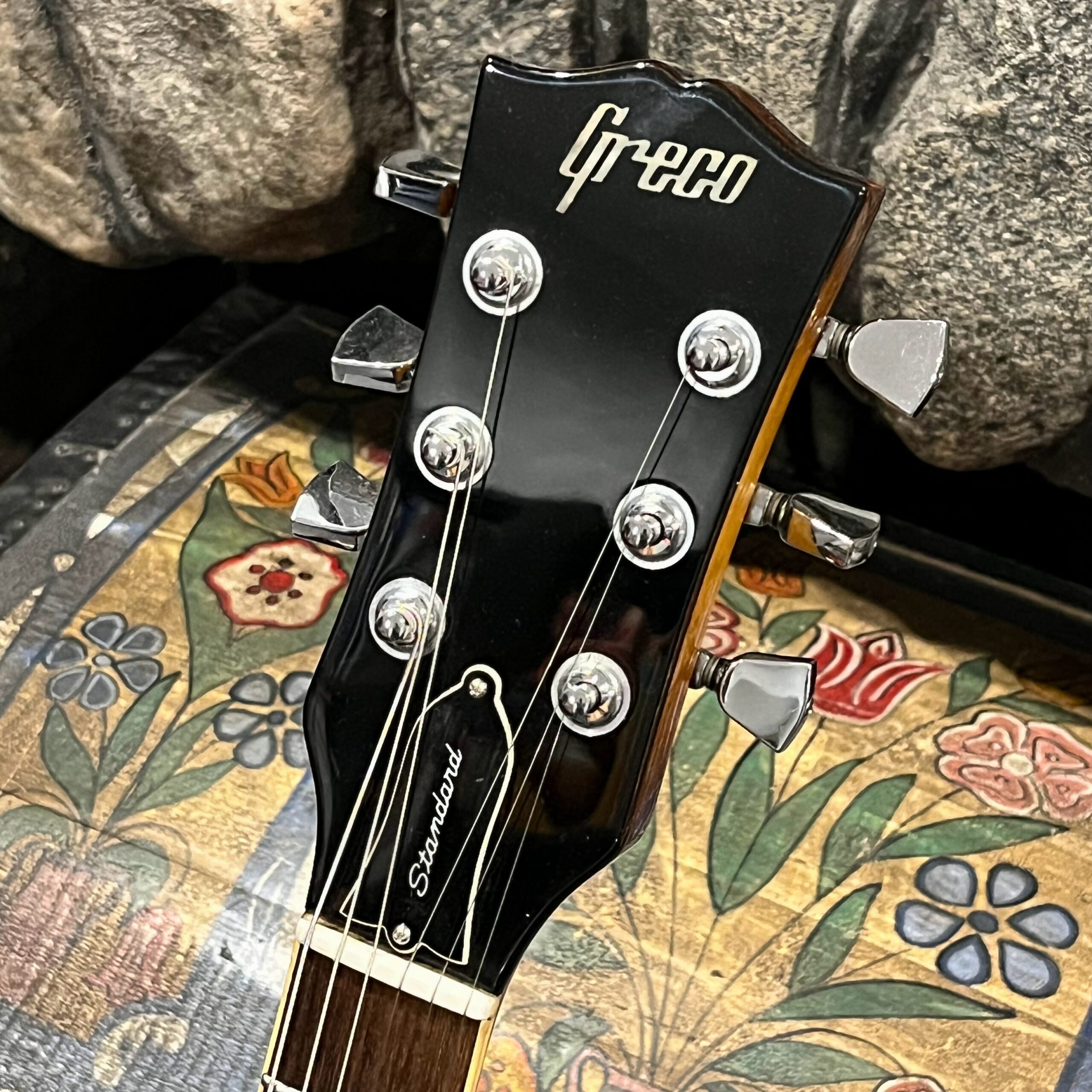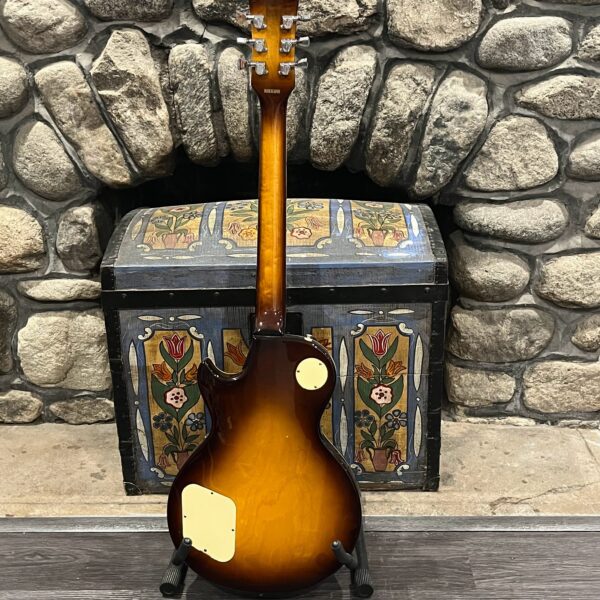 Beautiful looking and sounding 1978 Greco EG (Electric Guitar) 500. This is an odd guitar, I can’t find a catalog entry for it, has some unique and interesting touches that make it different than a standard Greco EG-500. For a start, this one has a single piece front and back with a semi chambered construction, not how a standard – Standard EG-500 is made, those things are solid and heavy too. This one is fairly light in comparison at 8.5lb. Excellent sounding original pickups, U1000 by Maxon, very high end Japanese PAF copies, same in construction and output to an Ibanez Super70. The neck is thin and blade like, actually thinner than any Gibson slim-taper without a 70s volute. It’s a very odd bird indeed. As stated, I haven’t found a catalog entry for any instrument that resembles these particular specs during this late lawsuit period. This is a domestic market instrument, so Greco never stopped copying Gibson like Ibanez was forced to, though the instruments were made beside each other at the same factories. If I had to guess, I’d say it was a Japan market special with features designed to appeal to the home audience. Traditional aesthetics with super lightweight and a thin neck, something smaller for the Japanese frame. Setup on 10s, weighs an excellent and lightweight (for the period) 8lb and 10oz, and comes in a Gibson gig bag. Made in June of 1978 in the Fujijen facility in Japan. Pro setup by Eric’s Guitars, rock solid instrument with classic PAF tones. Beautiful flaming in the slim tapered mahogany neck. Aging gracefully.