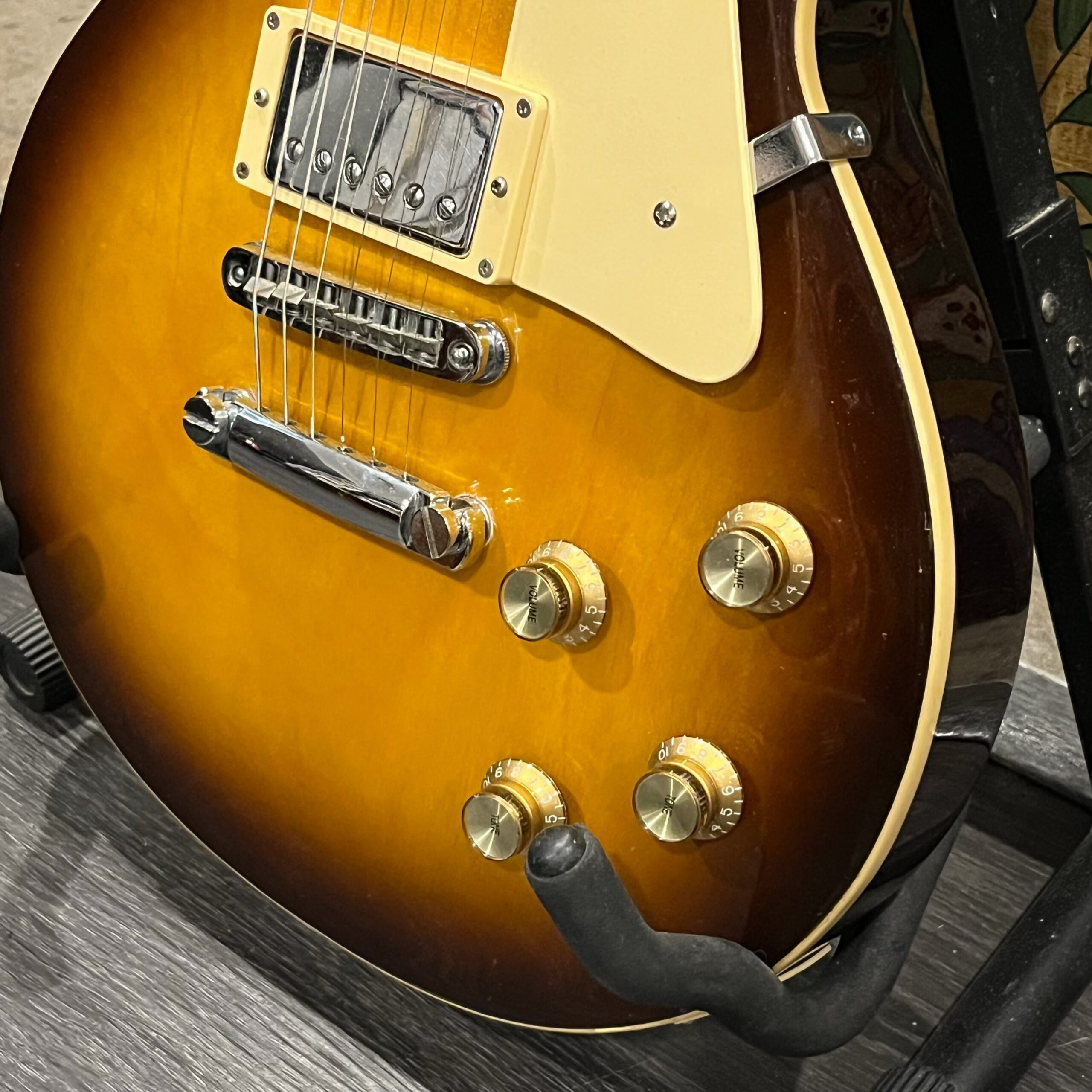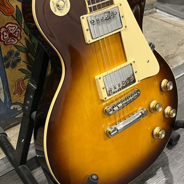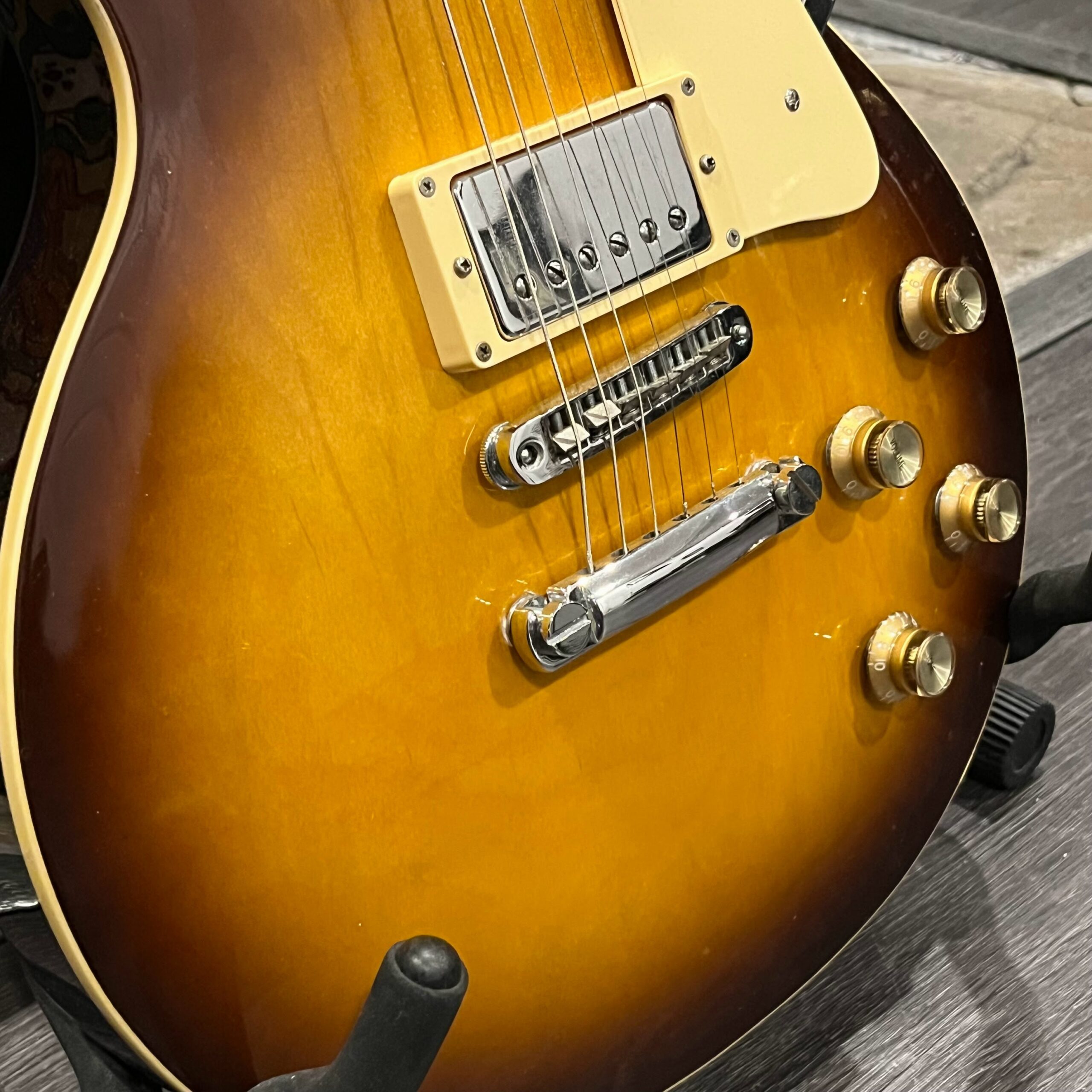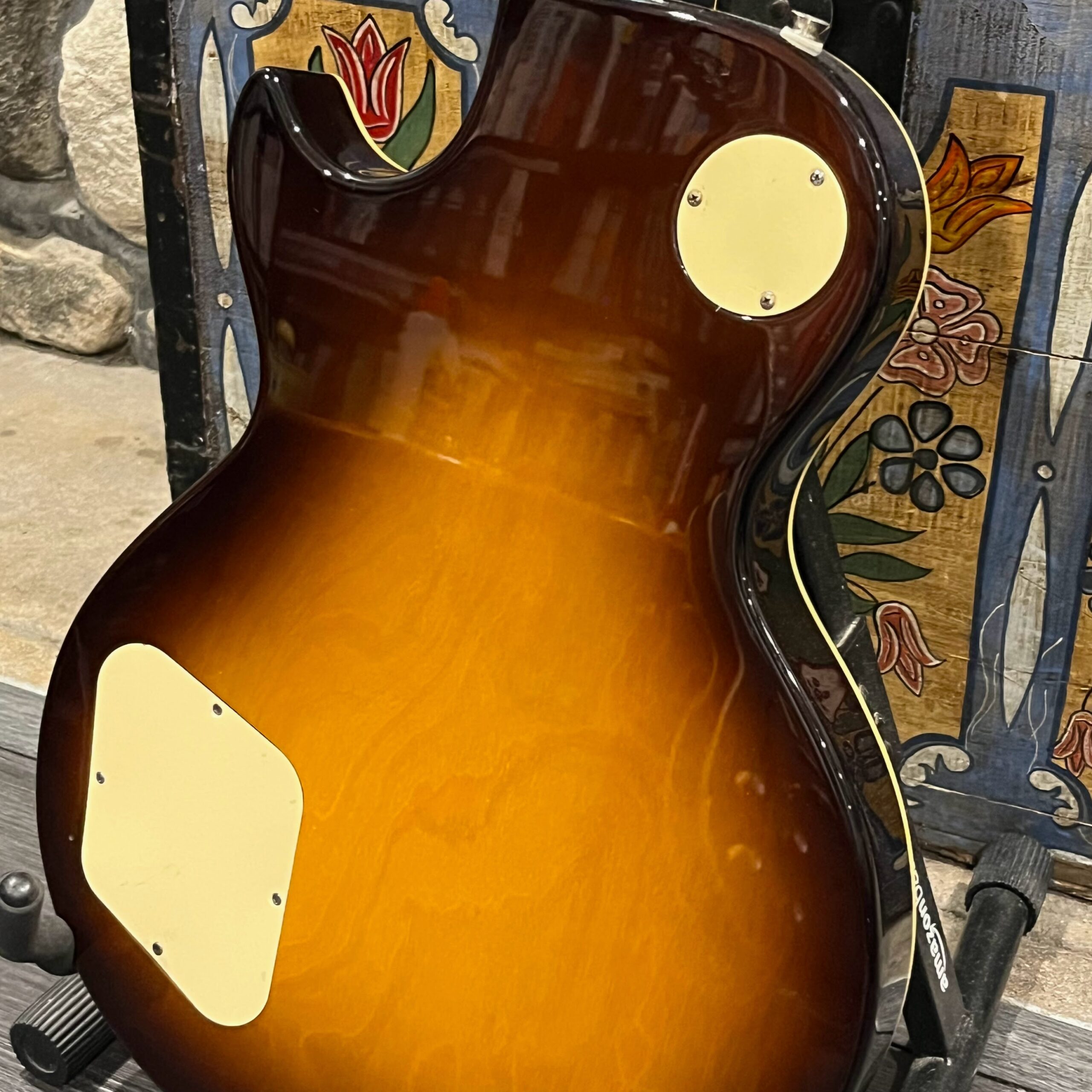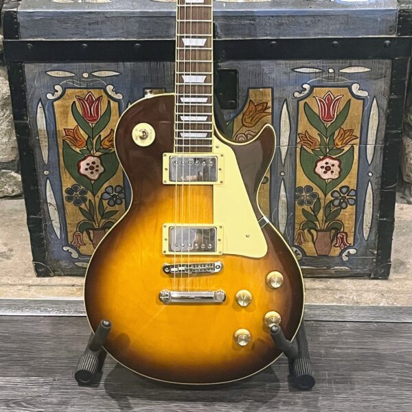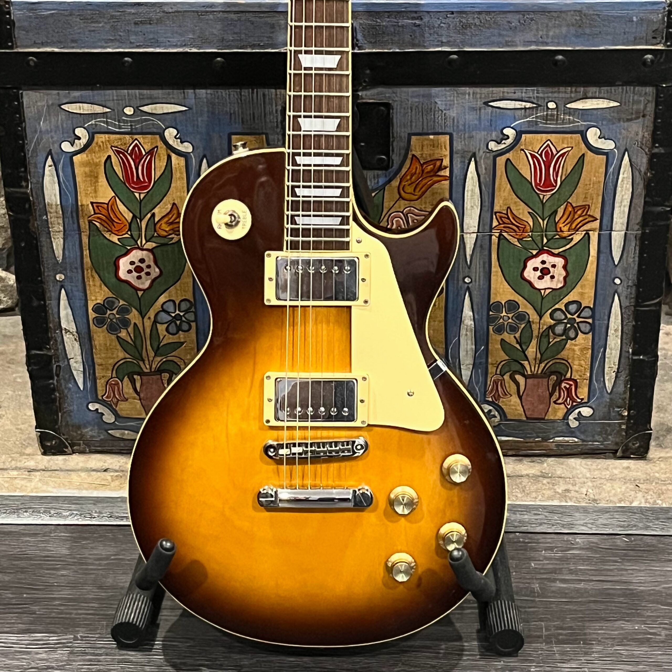Beautiful looking and sounding 1978 Greco EG (Electric Guitar) 500. This is an odd guitar, I can’t find a catalog entry for it, has some unique and interesting touches that make it different than a standard Greco EG-500. For a start, this one has a single piece front and back with a semi chambered construction, not how a standard – Standard EG-500 is made, those things are solid and heavy too. This one is fairly light in comparison at 8.5lb. Excellent sounding original pickups, U1000 by Maxon, very high end Japanese PAF copies, same in construction and output to an Ibanez Super70. The neck is thin and blade like, actually thinner than any Gibson slim-taper without a 70s volute. It’s a very odd bird indeed. As stated, I haven’t found a catalog entry for any instrument that resembles these particular specs during this late lawsuit period. This is a domestic market instrument, so Greco never stopped copying Gibson like Ibanez was forced to, though the instruments were made beside each other at the same factories. If I had to guess, I’d say it was a Japan market special with features designed to appeal to the home audience. Traditional aesthetics with super lightweight and a thin neck, something smaller for the Japanese frame. Setup on 10s, weighs an excellent and lightweight (for the period) 8lb and 10oz, and comes in a Gibson gig bag. Made in June of 1978 in the Fujijen facility in Japan. Pro setup by Eric’s Guitars, rock solid instrument with classic PAF tones. Beautiful flaming in the slim tapered mahogany neck. Aging gracefully.
