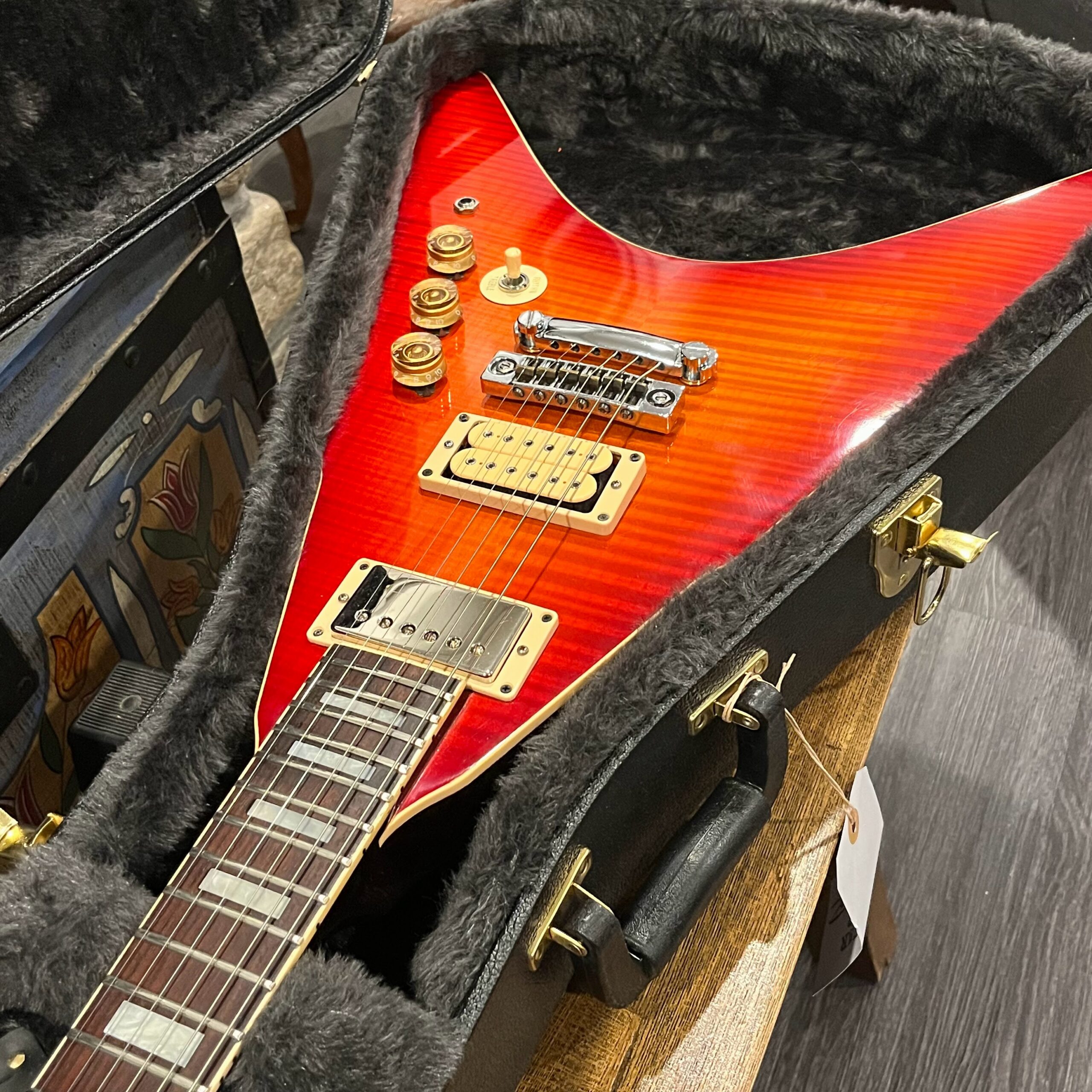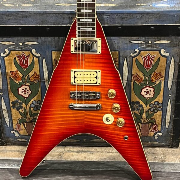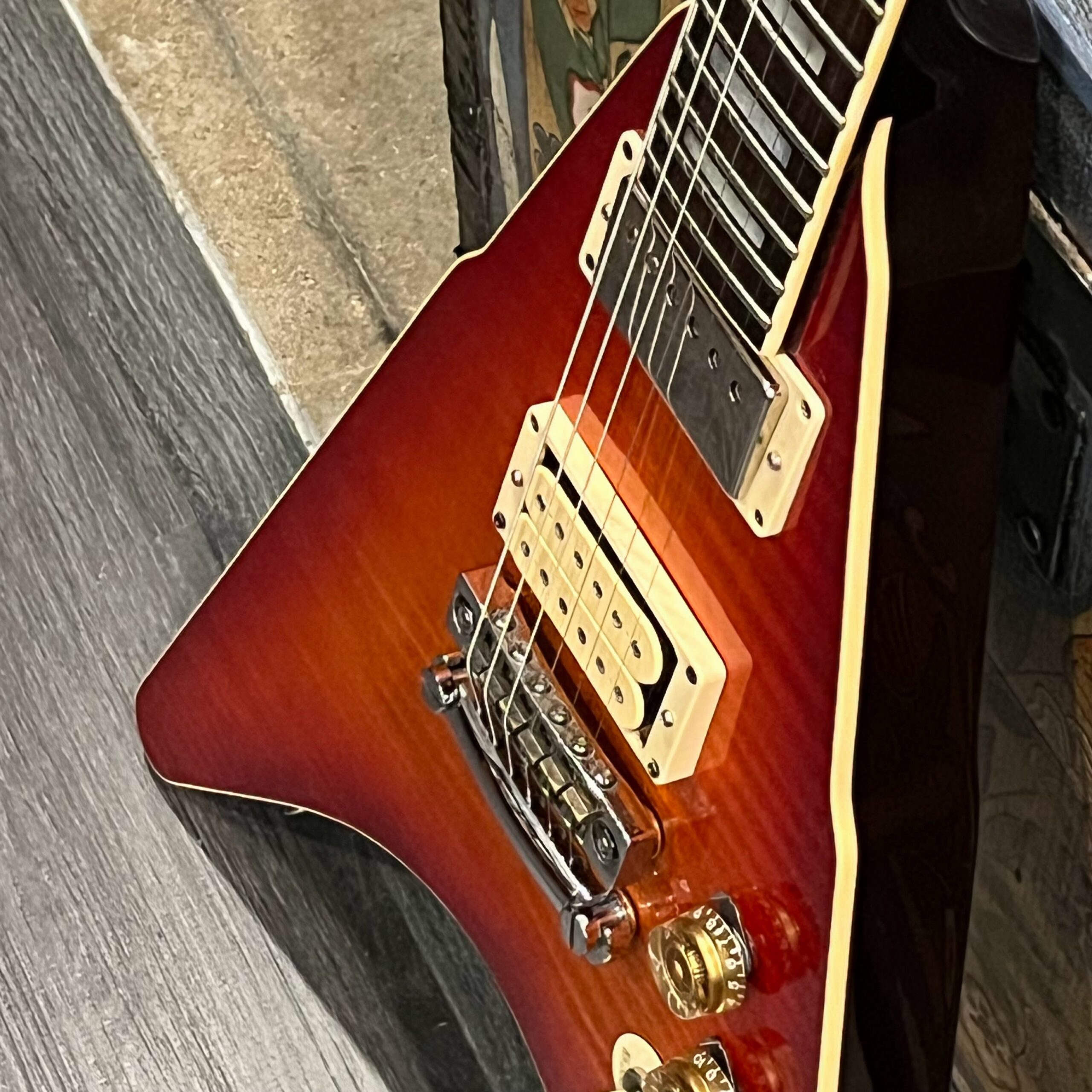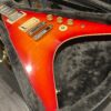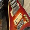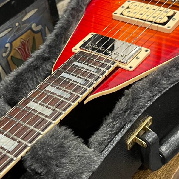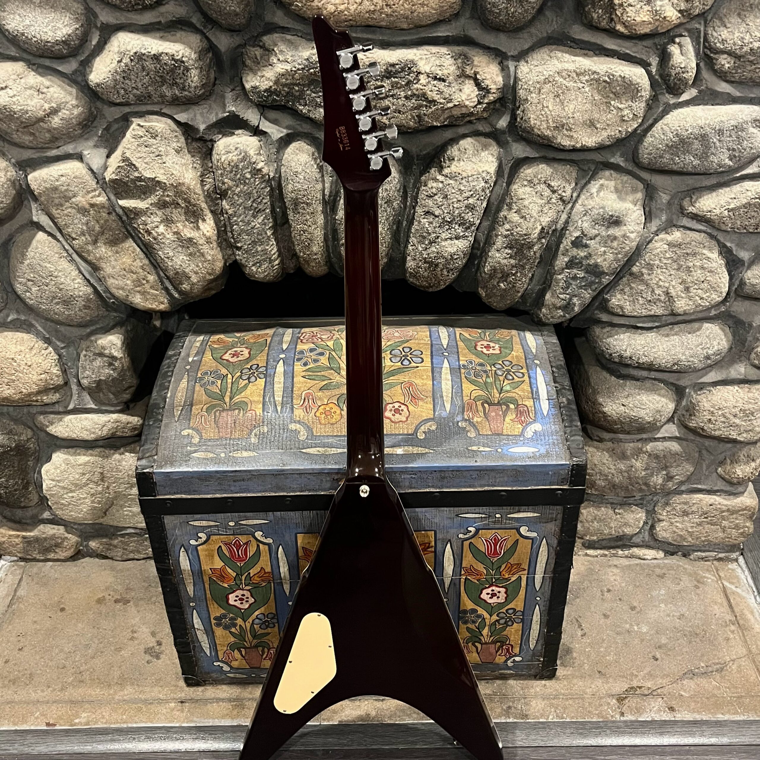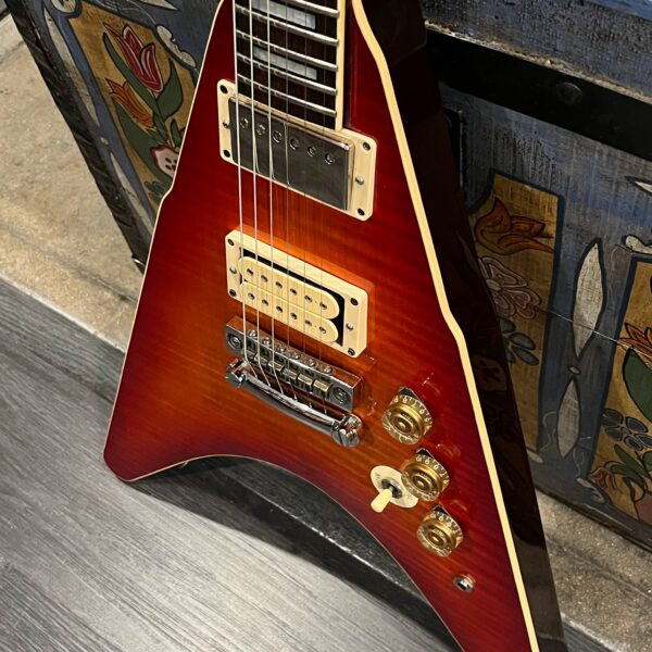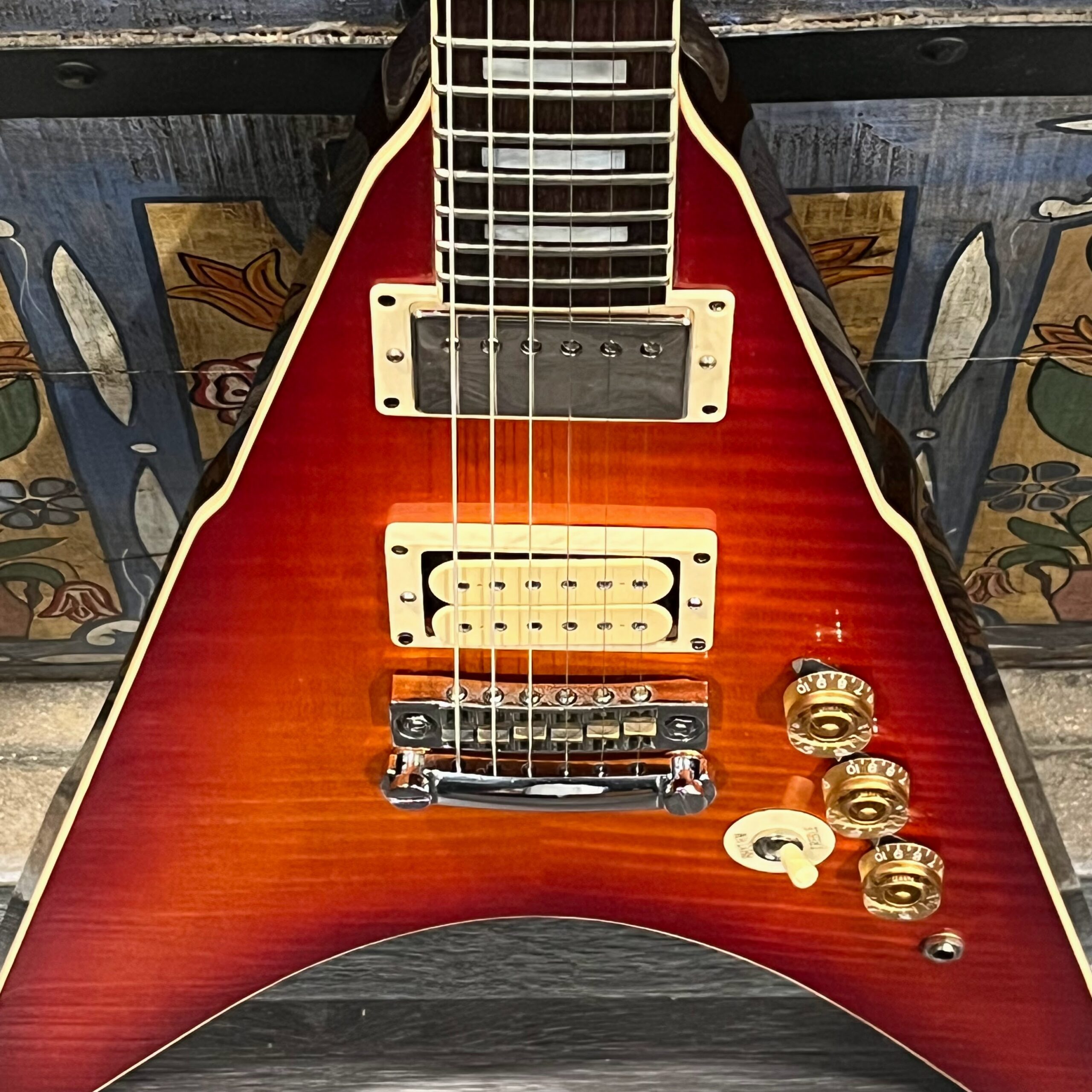 Check out this custom creation starting with an original ’83 Ibanez Rocket Roll II Flying V in Cherry Sunburst. It came from the Fujijen factory an 83 RR550 CS spec’d with an Ibanez HardRocker tremolo in February 1983, then at some point routed for a Kahler, which didn’t work out, so routed it for a Floyd-rose, which also didn’t work. The holes were then plugged with a large piece of pine, and the instrument was converted to a string-through. Terrible things happen to Vs. That’s where I found it a few years ago.