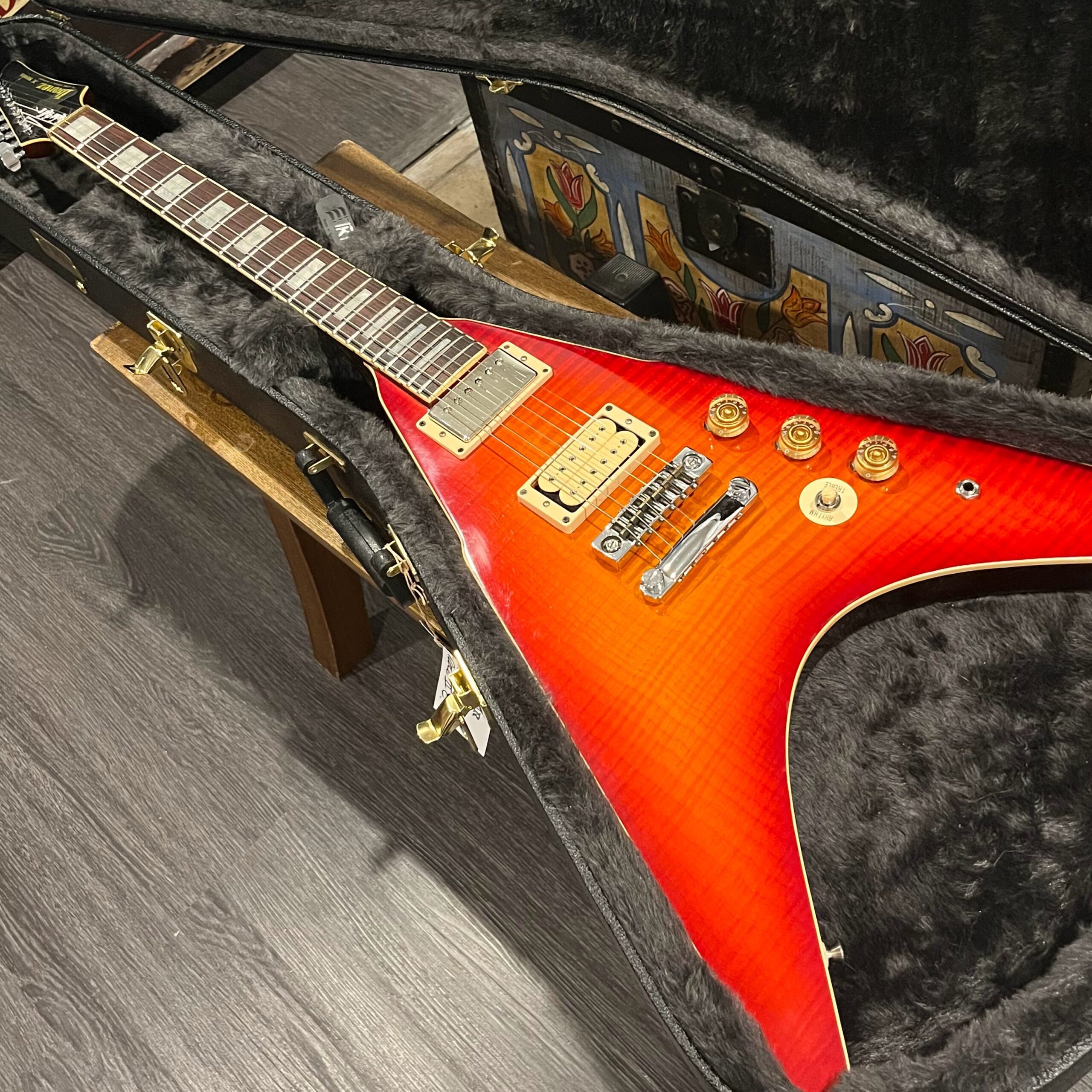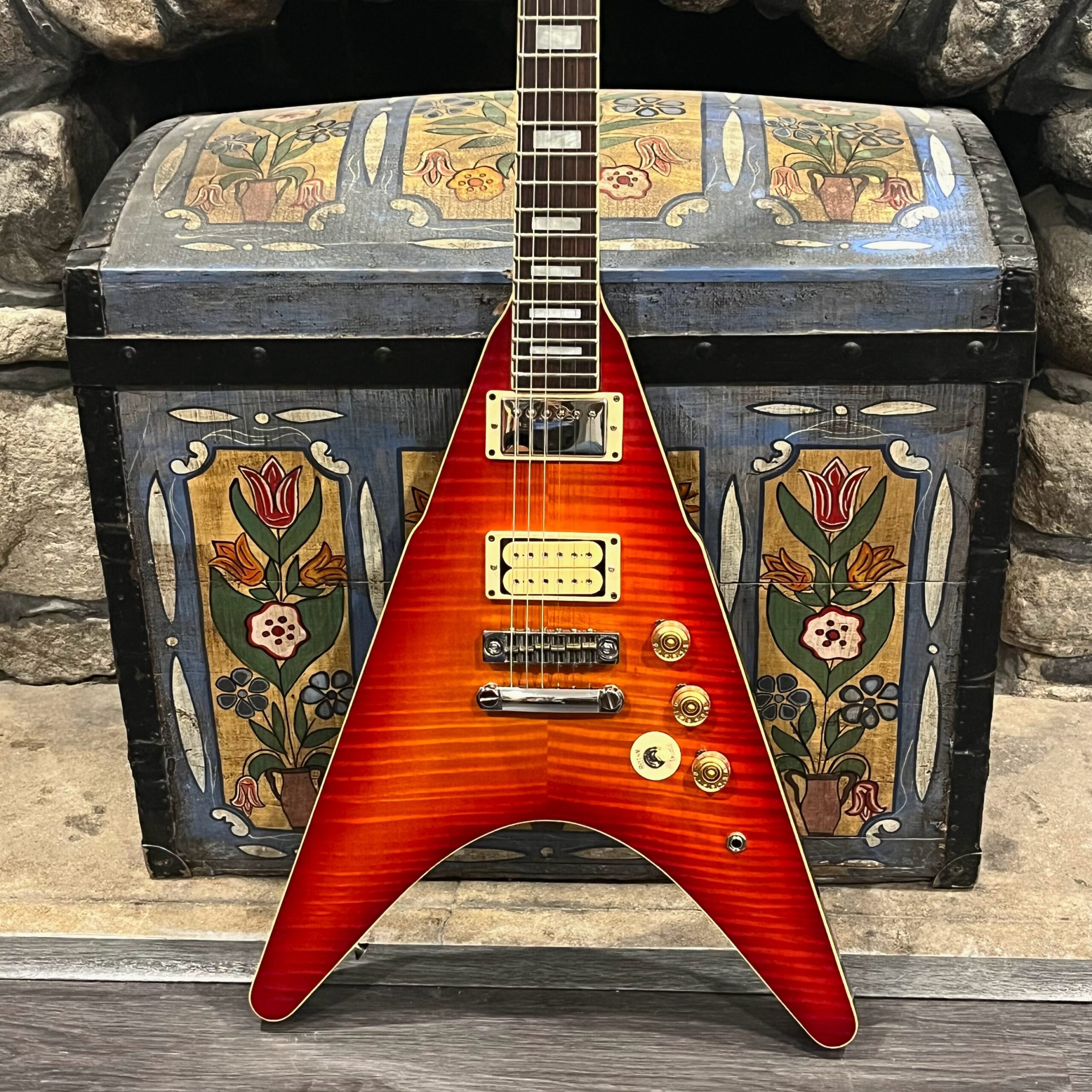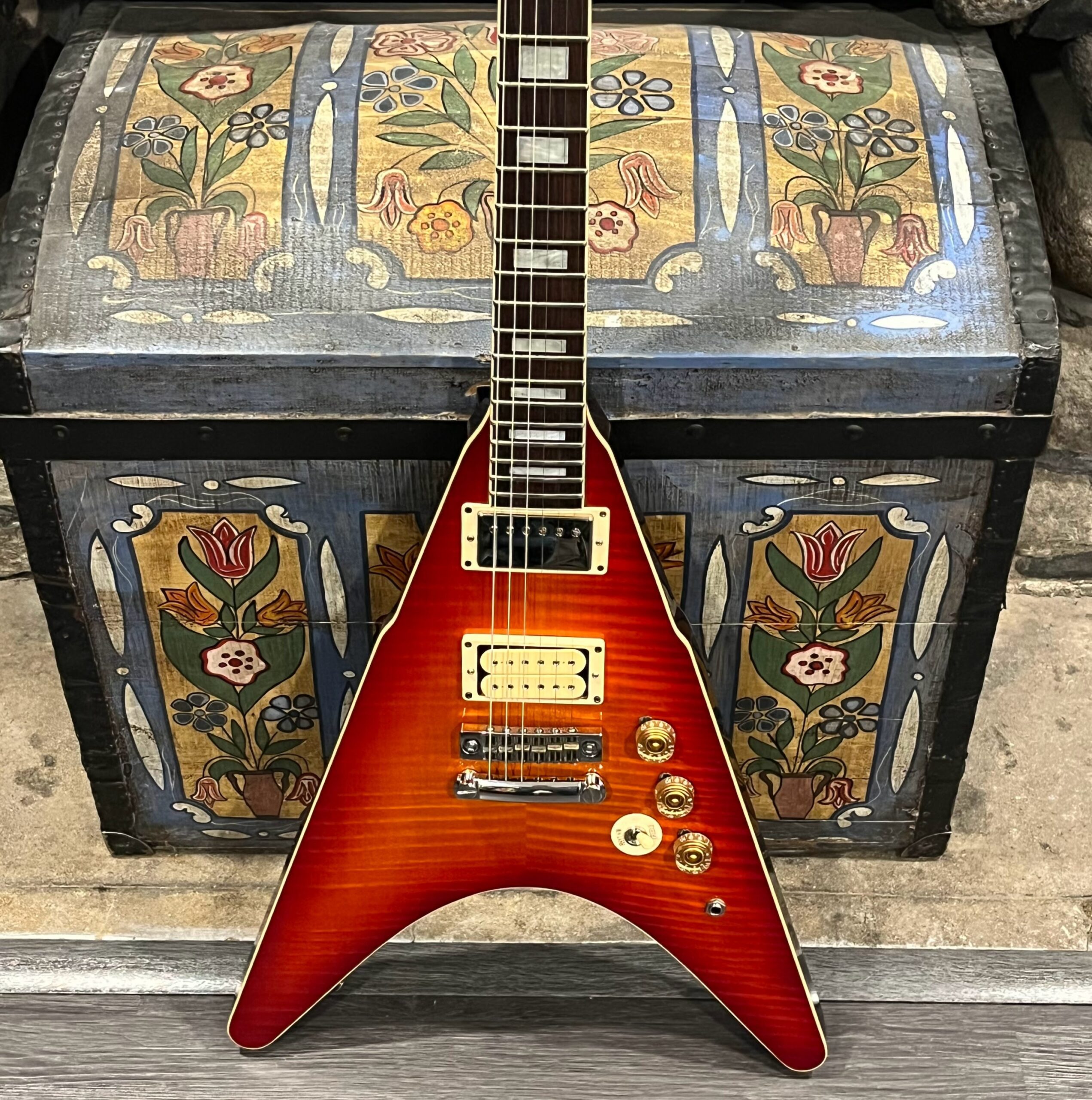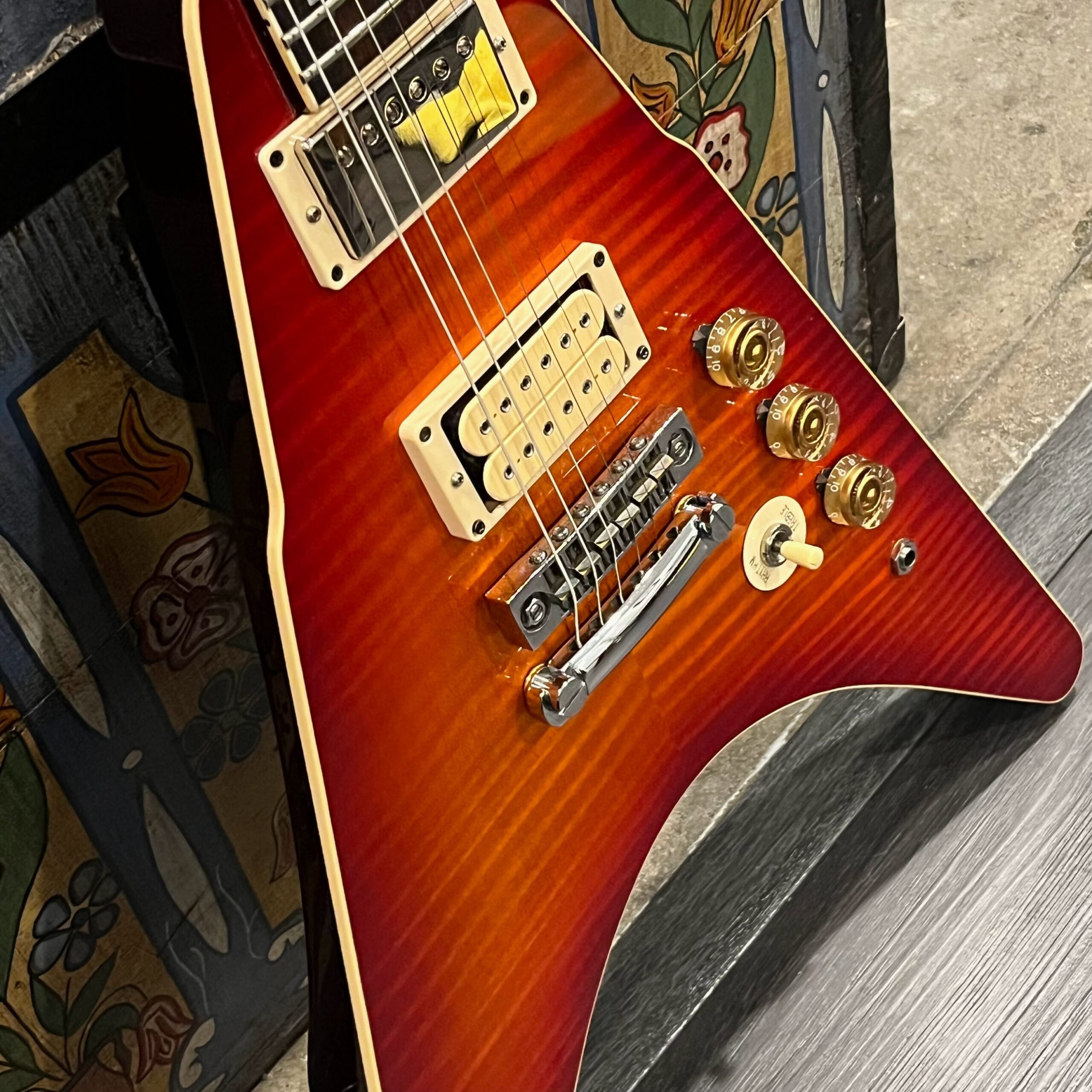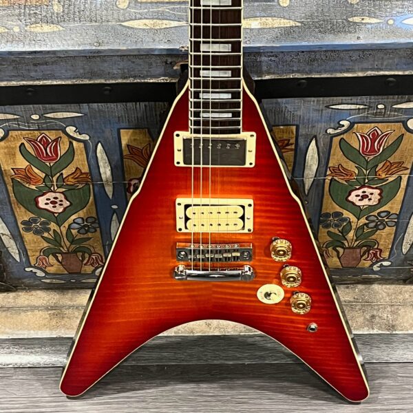 Check out this custom creation starting with an original ’83 Ibanez Rocket Roll II Flying V in Cherry Sunburst. It came from the Fujijen factory an 83 RR550 CS spec’d with an Ibanez HardRocker tremolo in February 1983, then at some point routed for a Kahler, which didn’t work out, so routed it for a Floyd-rose, which also didn’t work. The holes were then plugged with a large piece of pine, and the instrument was converted to a string-through. Terrible things happen to Vs. That’s where I found it a few years ago.