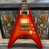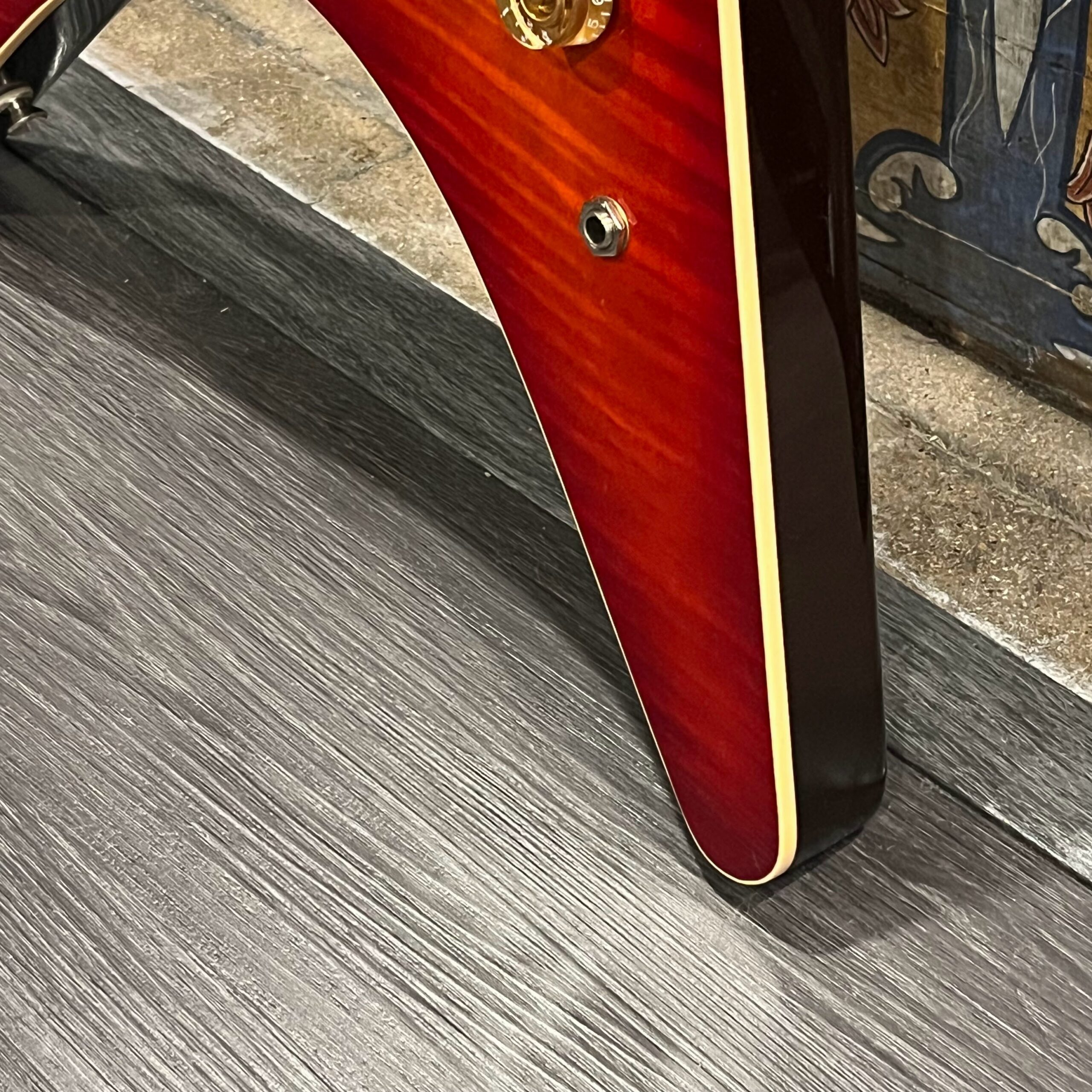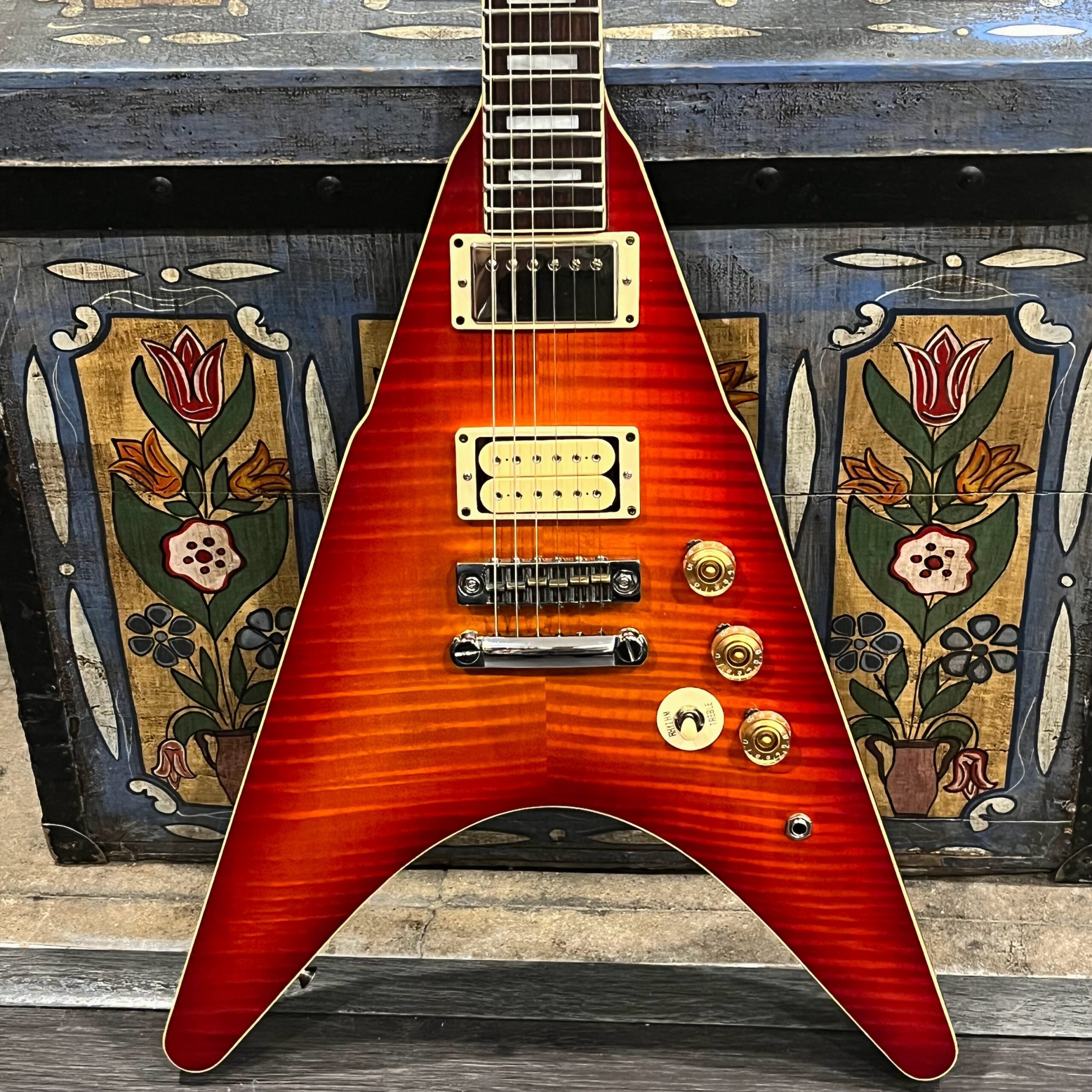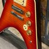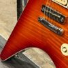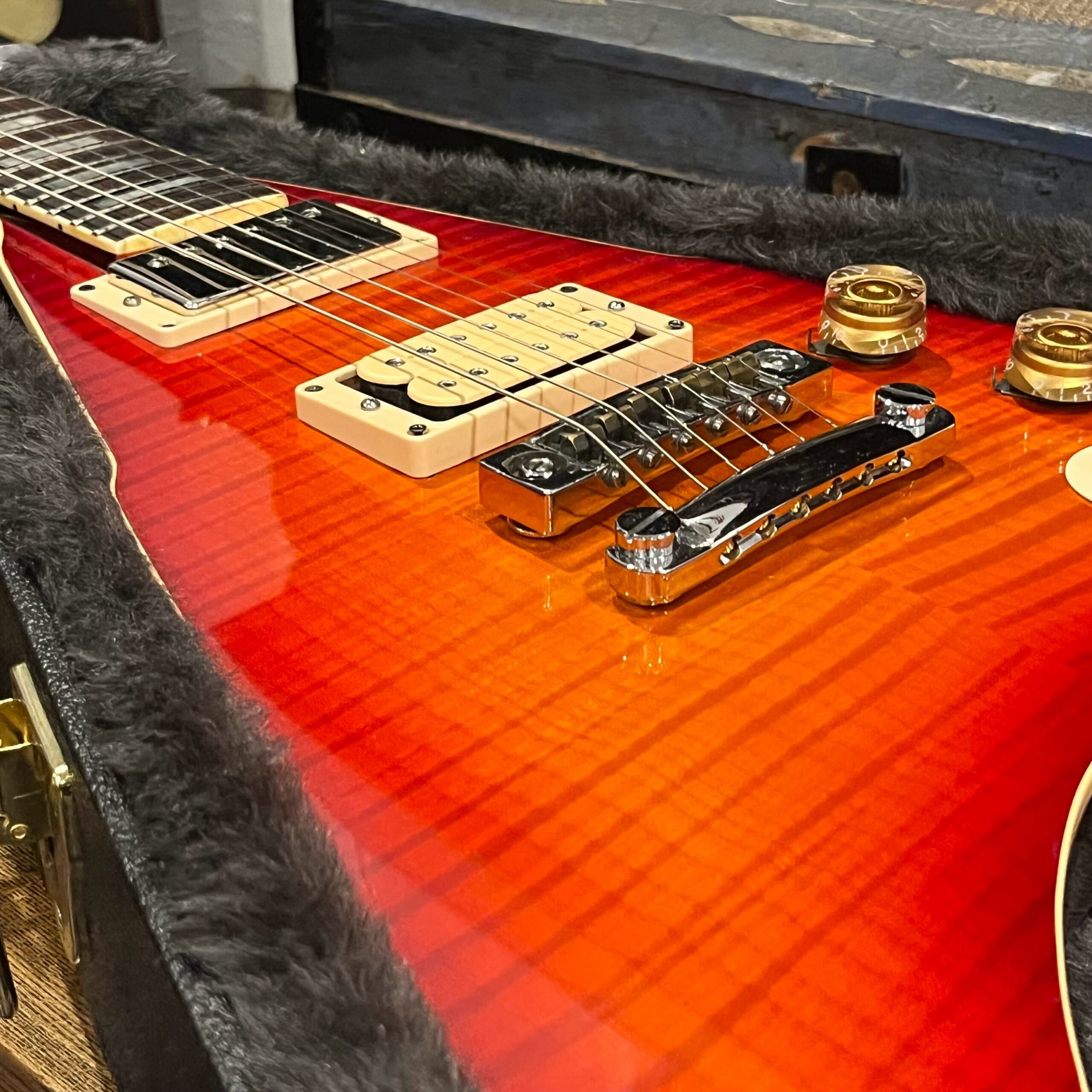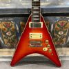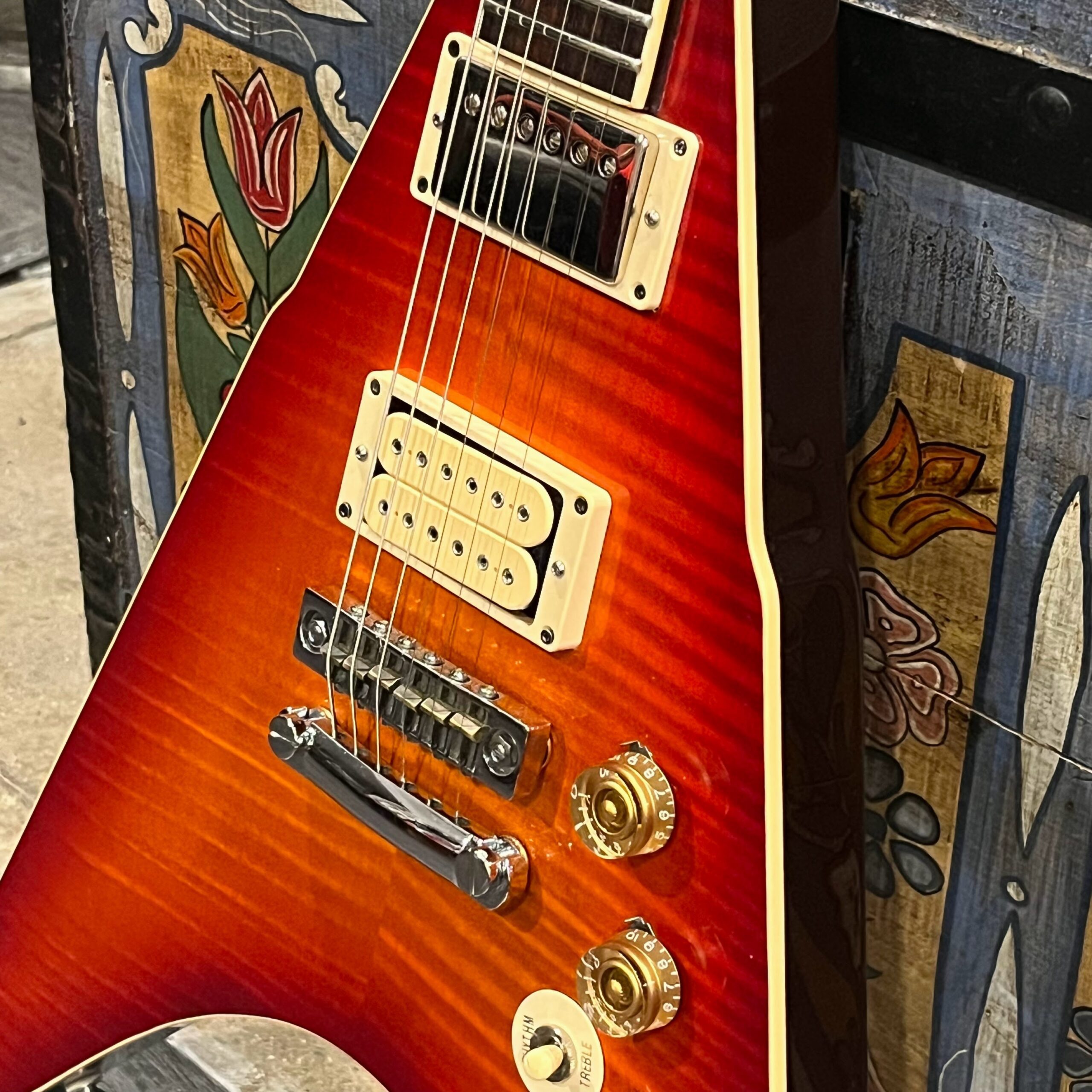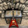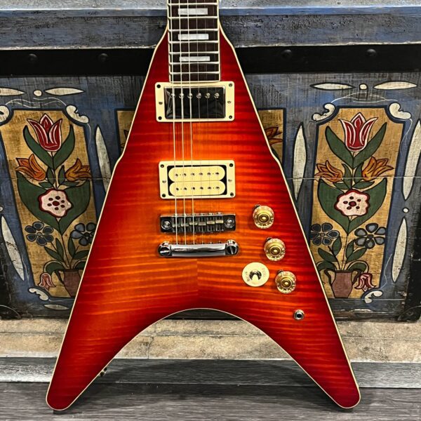 Check out this custom creation starting with an original ’83 Ibanez Rocket Roll II Flying V in Cherry Sunburst. It came from the Fujijen factory an 83 RR550 CS spec’d with an Ibanez HardRocker tremolo in February 1983, then at some point routed for a Kahler, which didn’t work out, so routed it for a Floyd-rose, which also didn’t work. The holes were then plugged with a large piece of pine, and the instrument was converted to a string-through. Terrible things happen to Vs. That’s where I found it a few years ago.