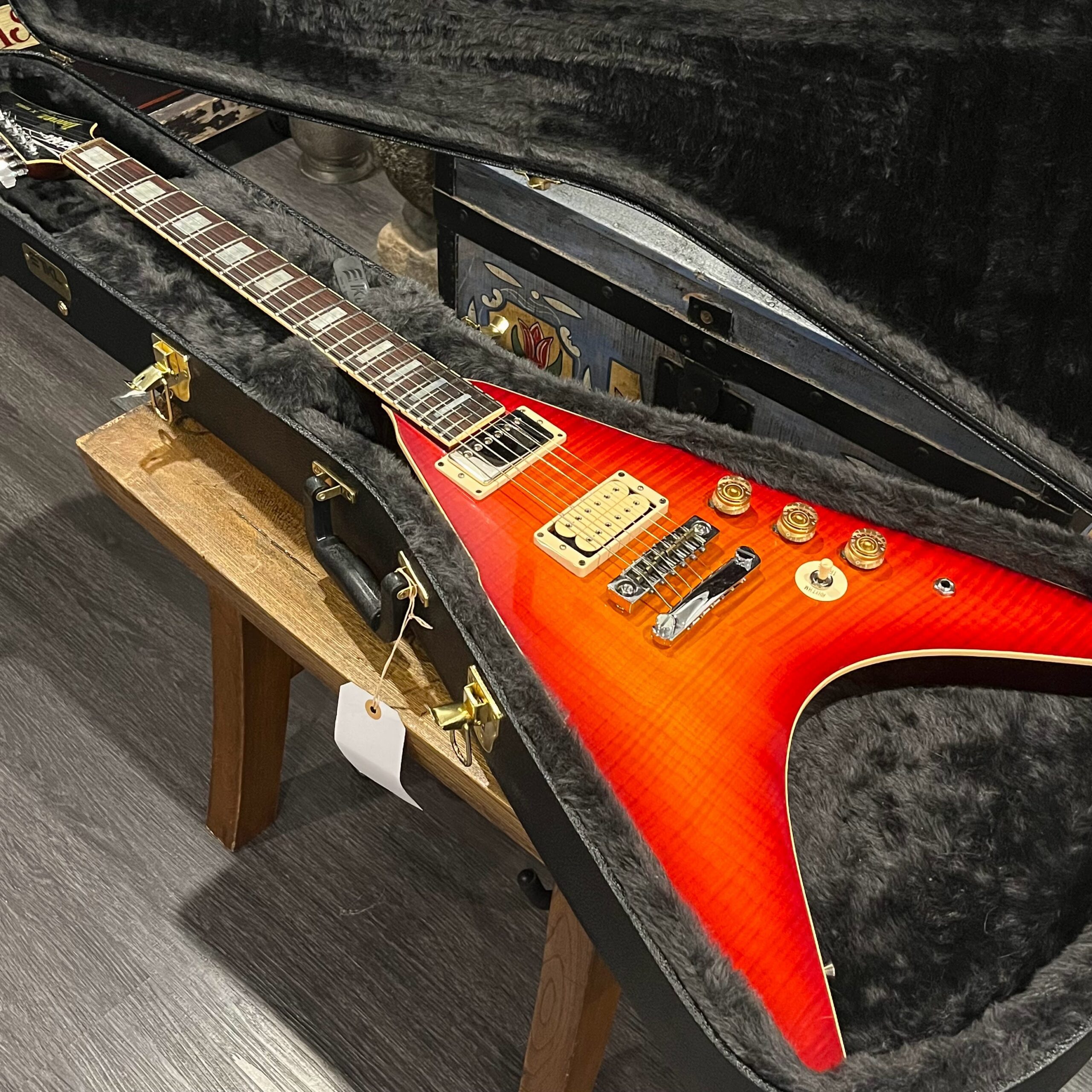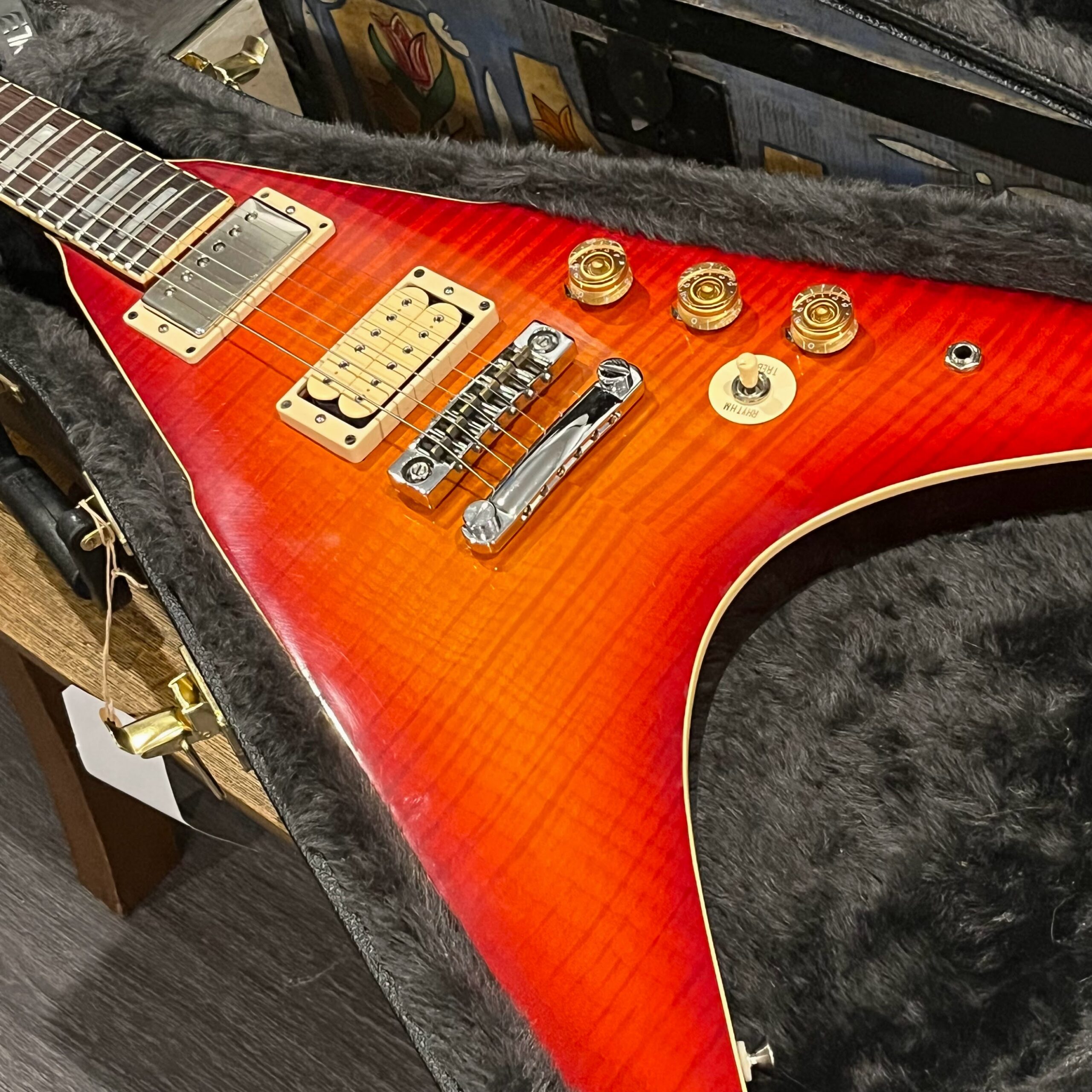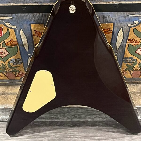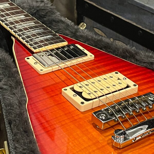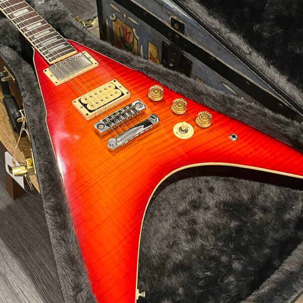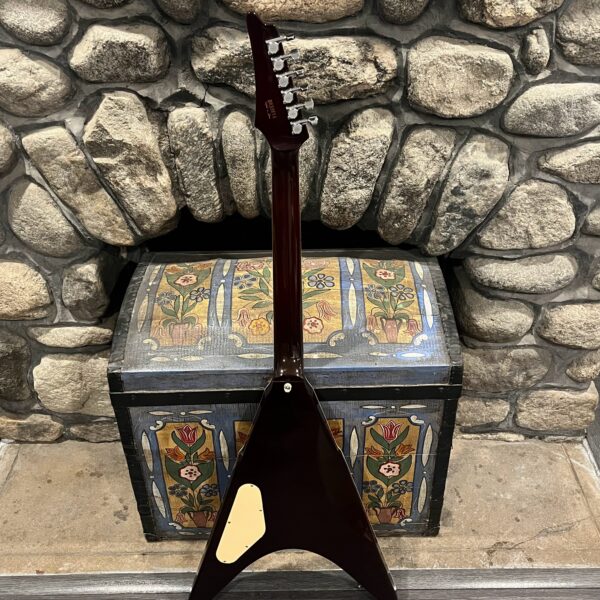 Extra holes drilled for original tuners, patina on metal parts. The paint on the horns reacted to the first case that this was kept in which affected the finish, hard to spot unless you look. There’s also wear on the tips from resting on the ground or in a stand, typical V wear, but presents as excellent. Impressions on the back from a stand or strap, harsh lighting required, guitar presents as excellent. Not new, not pristine, looks fantastic. See the pictures, ask for more. As always, lots more pictures of this one at my site which Reverb doesn’t want me to link to, but if you put a dotcom behind my shop name, you’d already be there.