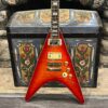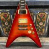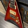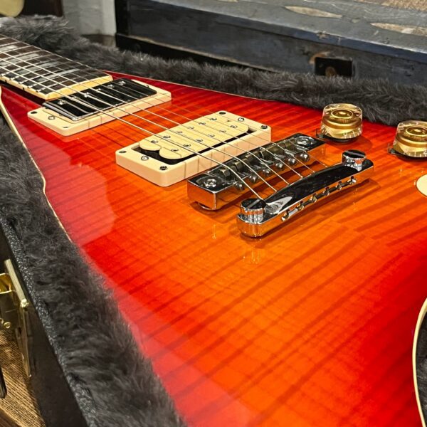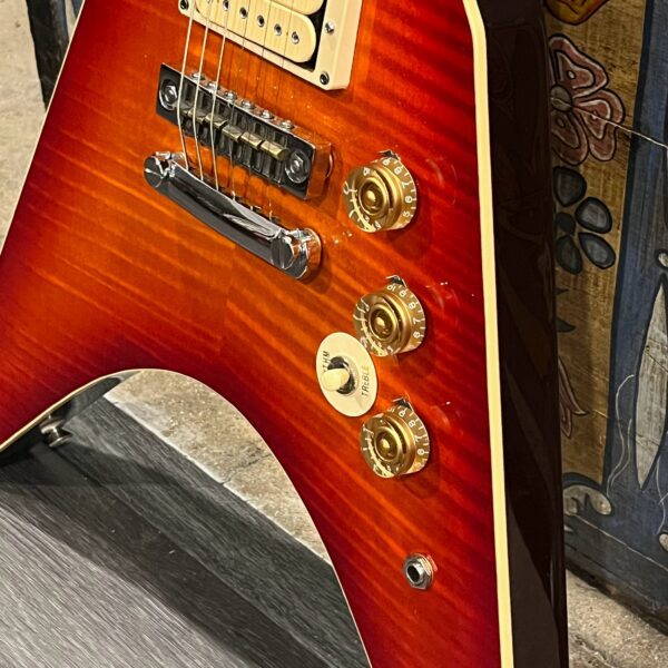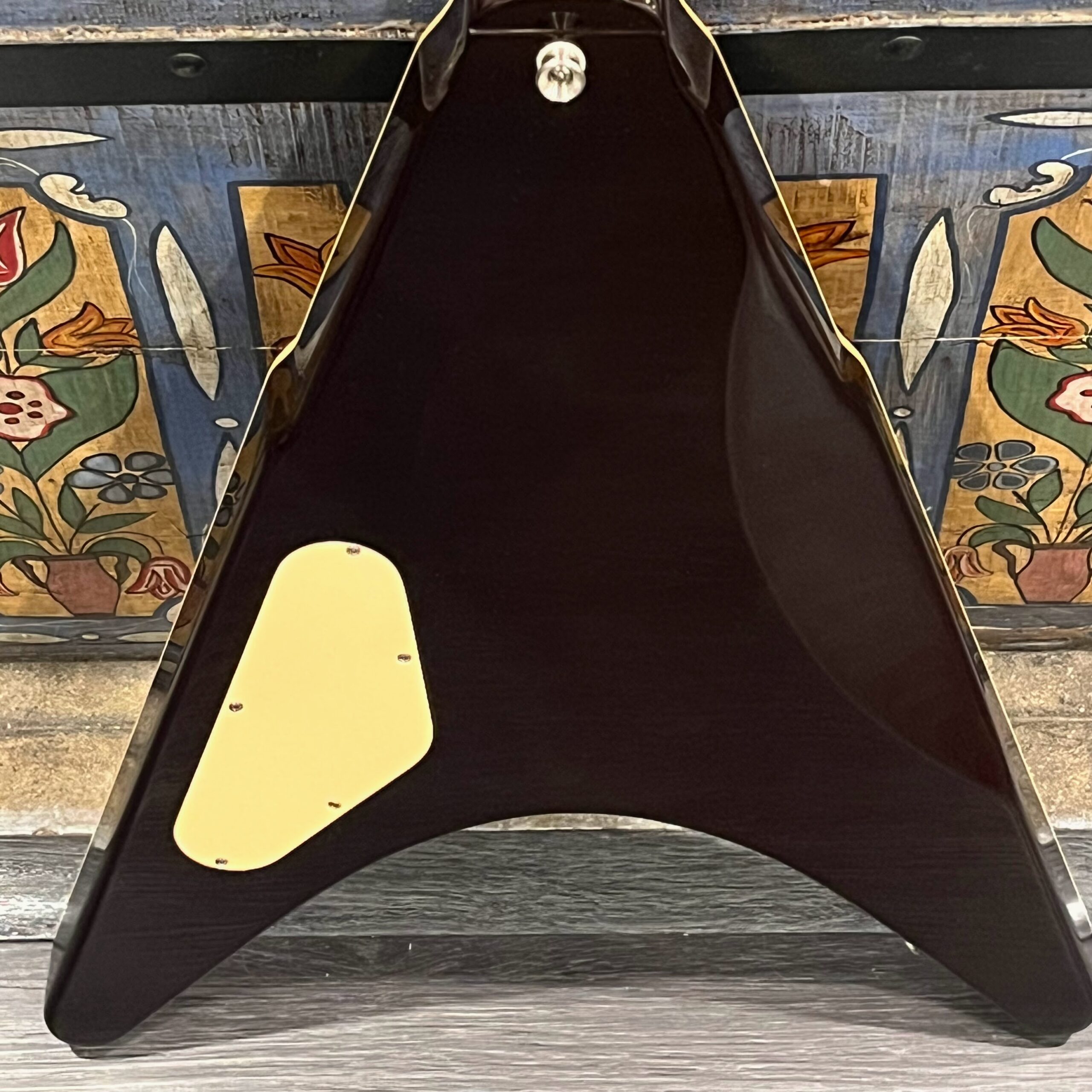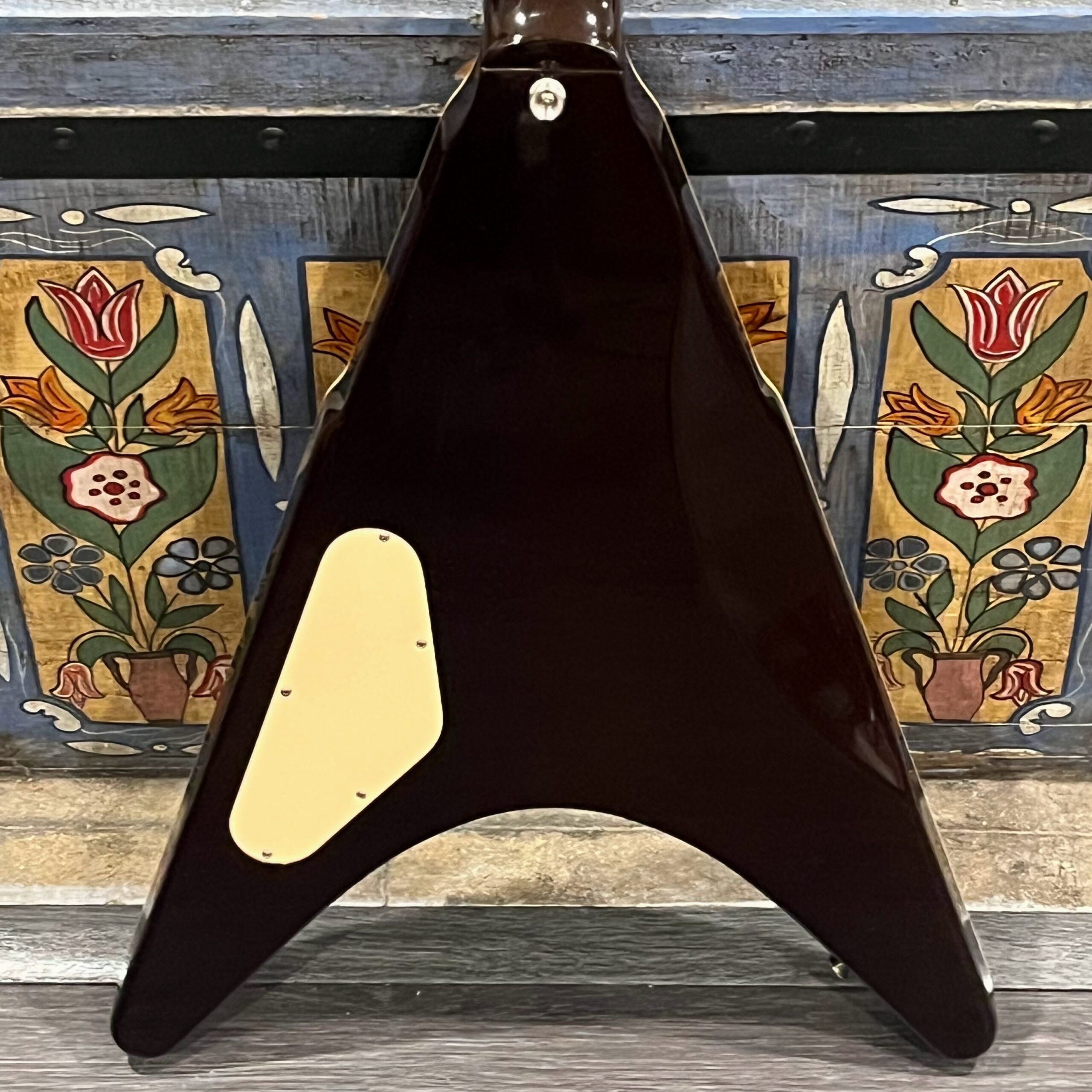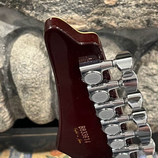 Extra holes drilled for original tuners, patina on metal parts. The paint on the horns reacted to the first case that this was kept in which affected the finish, hard to spot unless you look. There’s also wear on the tips from resting on the ground or in a stand, typical V wear, but presents as excellent. Impressions on the back from a stand or strap, harsh lighting required, guitar presents as excellent. Not new, not pristine, looks fantastic. See the pictures, ask for more. As always, lots more pictures of this one at my site which Reverb doesn’t want me to link to, but if you put a dotcom behind my shop name, you’d already be there.