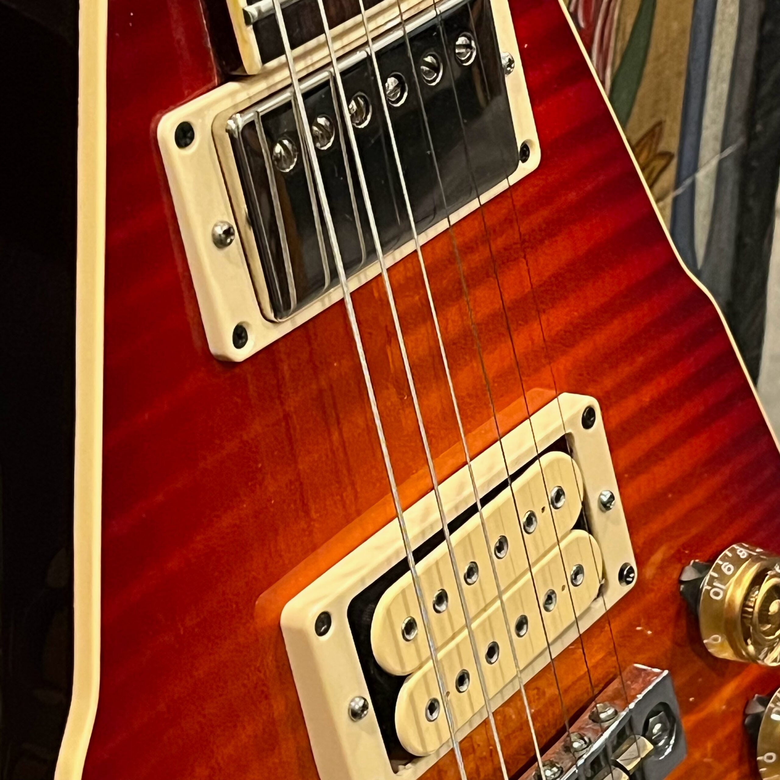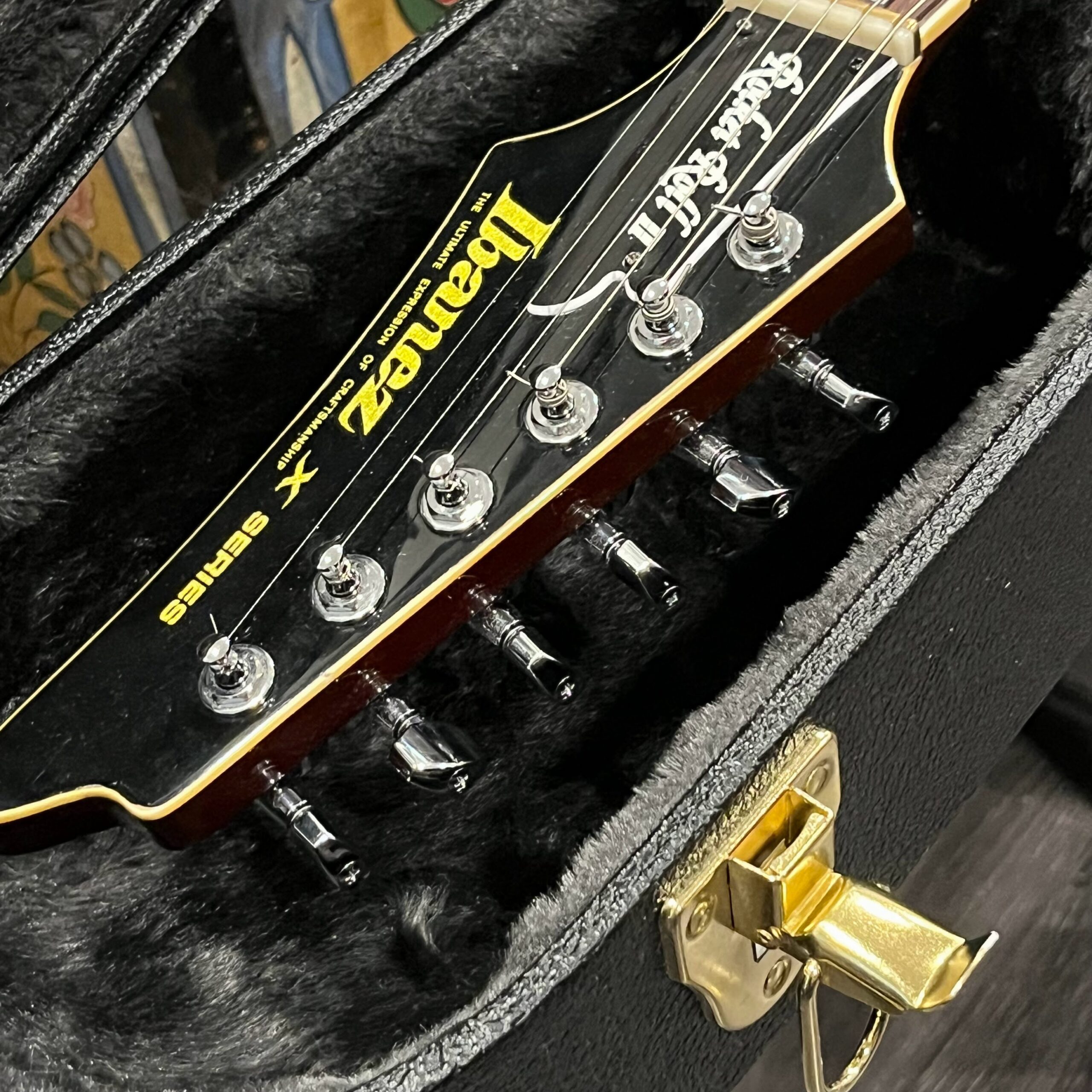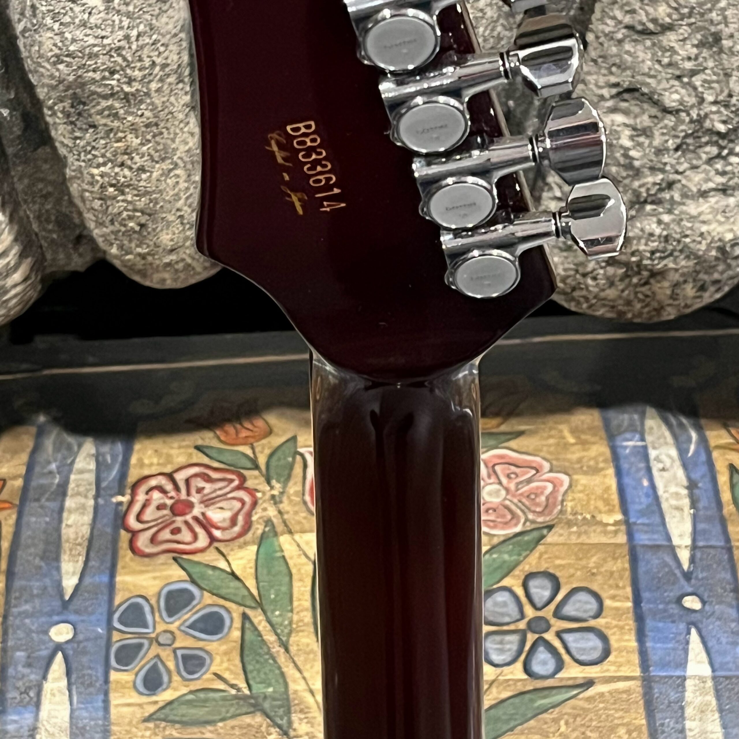 The instrument was professionally rebuilt in 2018/2019 here in LA and converted to a hardtail with vintage Gibraltar bridge setup ala Destroyers and Rocket Rolls from 1980-1982 and other high end Ibanez instruments. A new flamed top was added, binding was replaced, and then the instrument was painted up as far as its original headstock so the serial number from the factory is retained. Everything above the level of the volute is original finish, looking very good. The pickups are a mix of Maxon/Ibanez Super58 in the neck, and a cream D’Marzio Super Distortion in the bridge position to do the job of the V2 on a stock guitar. This makes for a very versatile instrument that can handle rhythm and lead, high-gain and blues. The Super Distortion reads at 13.5k, the Super58 at 7.2k. Any hardware not Ibanez is Gotoh. The guitar has a brass and bone nut, custom truss rod cover, flat, wide neck with 22 jumbo frets, and a beautiful rosewood fretboard, and is one of one.