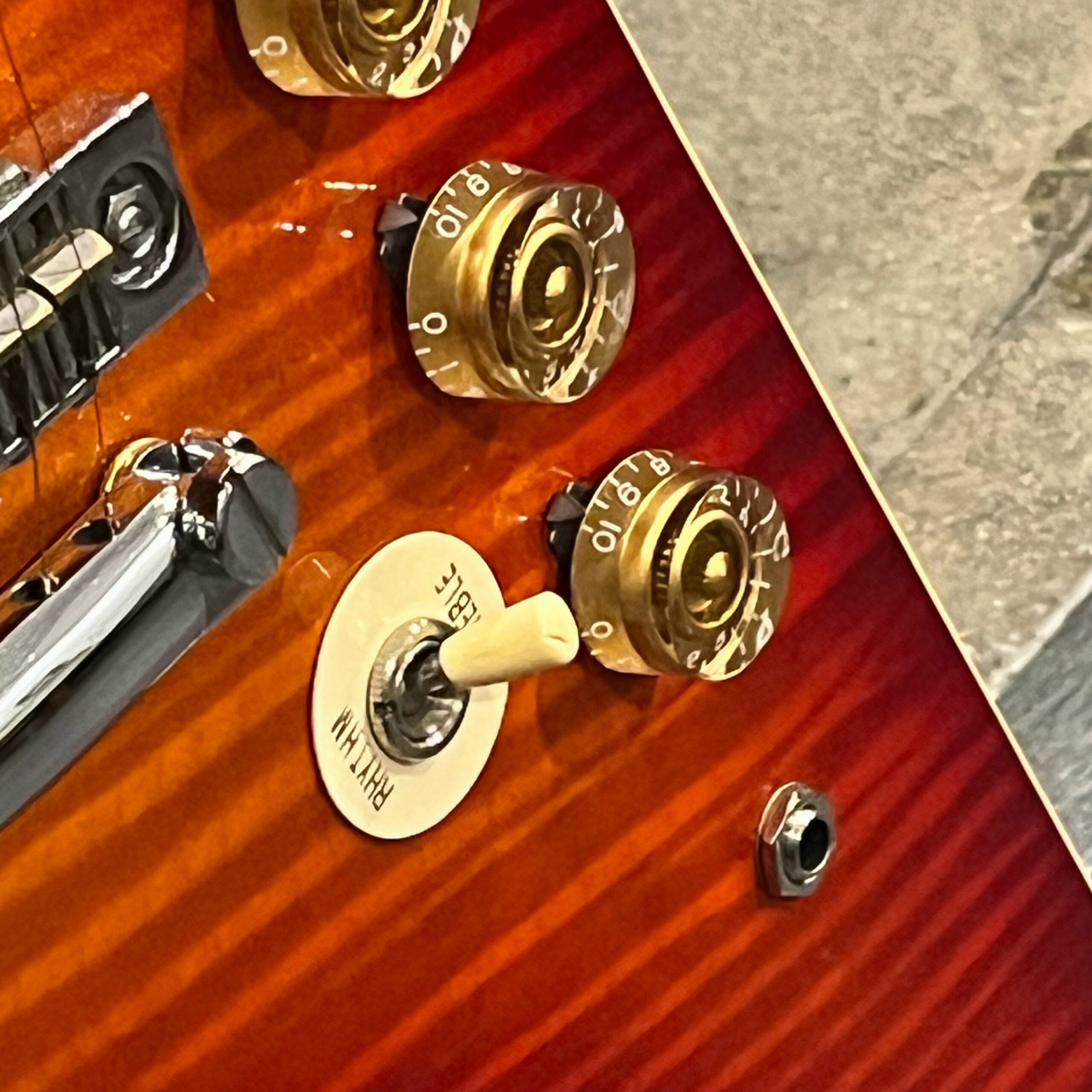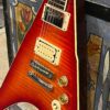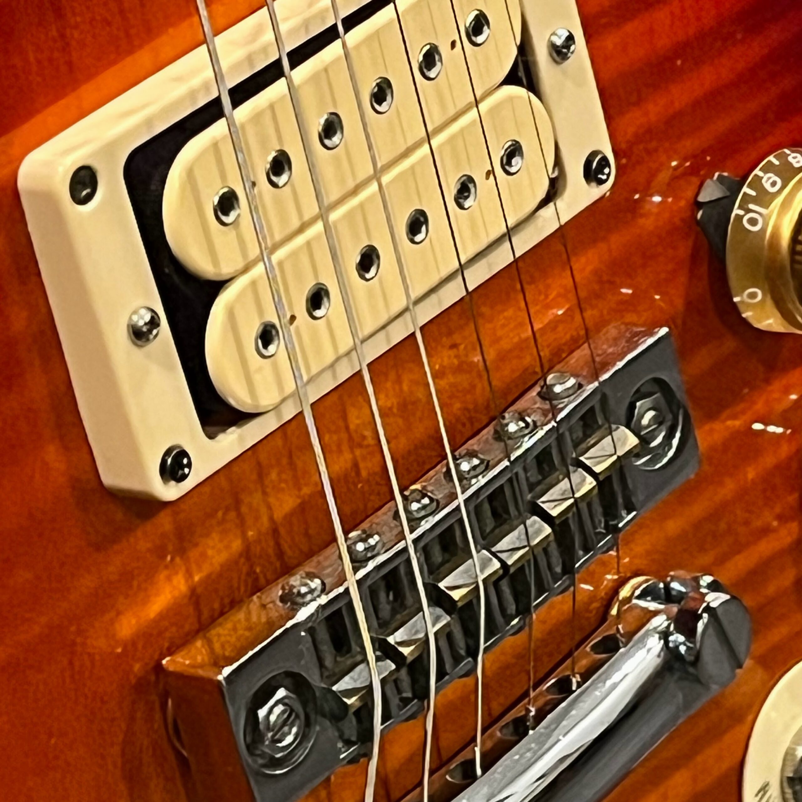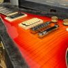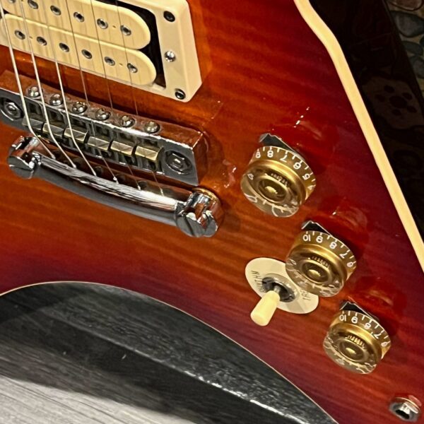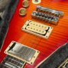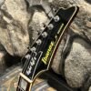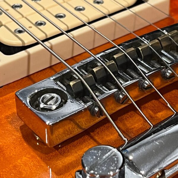 The instrument was professionally rebuilt in 2018/2019 here in LA and converted to a hardtail with vintage Gibraltar bridge setup ala Destroyers and Rocket Rolls from 1980-1982 and other high end Ibanez instruments. A new flamed top was added, binding was replaced, and then the instrument was painted up as far as its original headstock so the serial number from the factory is retained. Everything above the level of the volute is original finish, looking very good. The pickups are a mix of Maxon/Ibanez Super58 in the neck, and a cream D’Marzio Super Distortion in the bridge position to do the job of the V2 on a stock guitar. This makes for a very versatile instrument that can handle rhythm and lead, high-gain and blues. The Super Distortion reads at 13.5k, the Super58 at 7.2k. Any hardware not Ibanez is Gotoh. The guitar has a brass and bone nut, custom truss rod cover, flat, wide neck with 22 jumbo frets, and a beautiful rosewood fretboard, and is one of one.