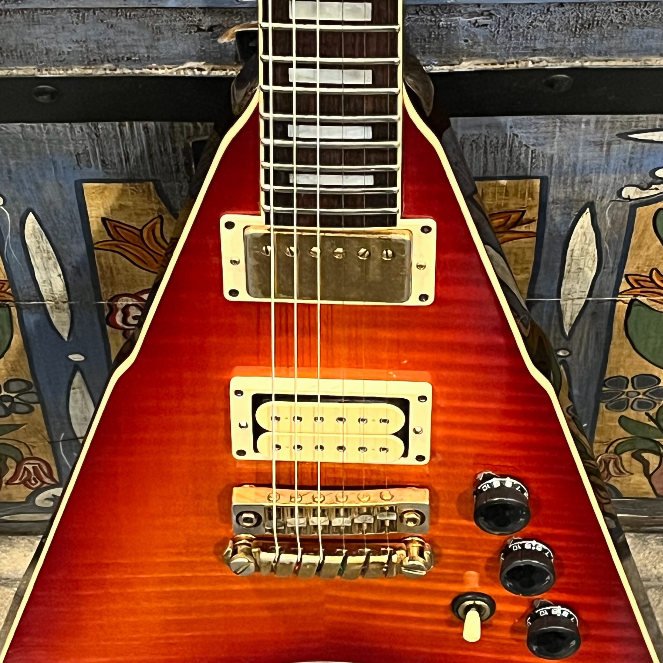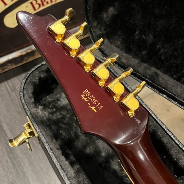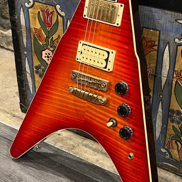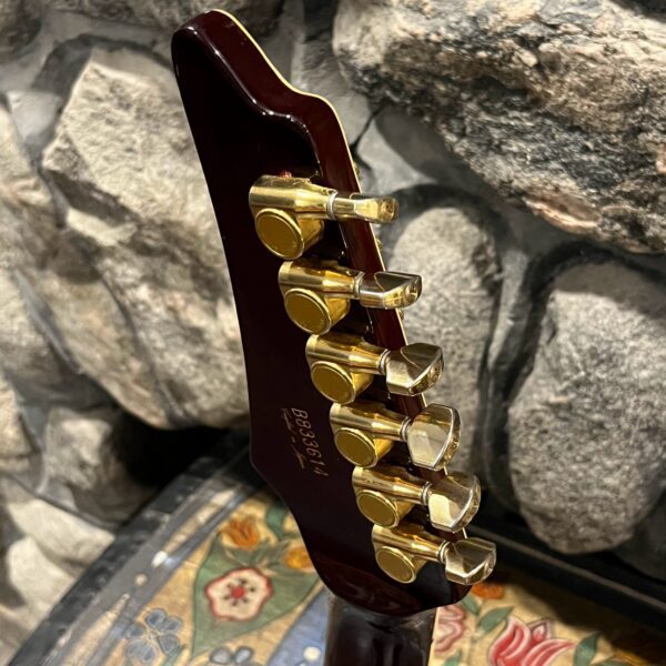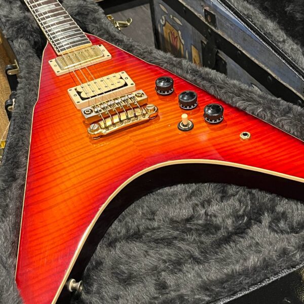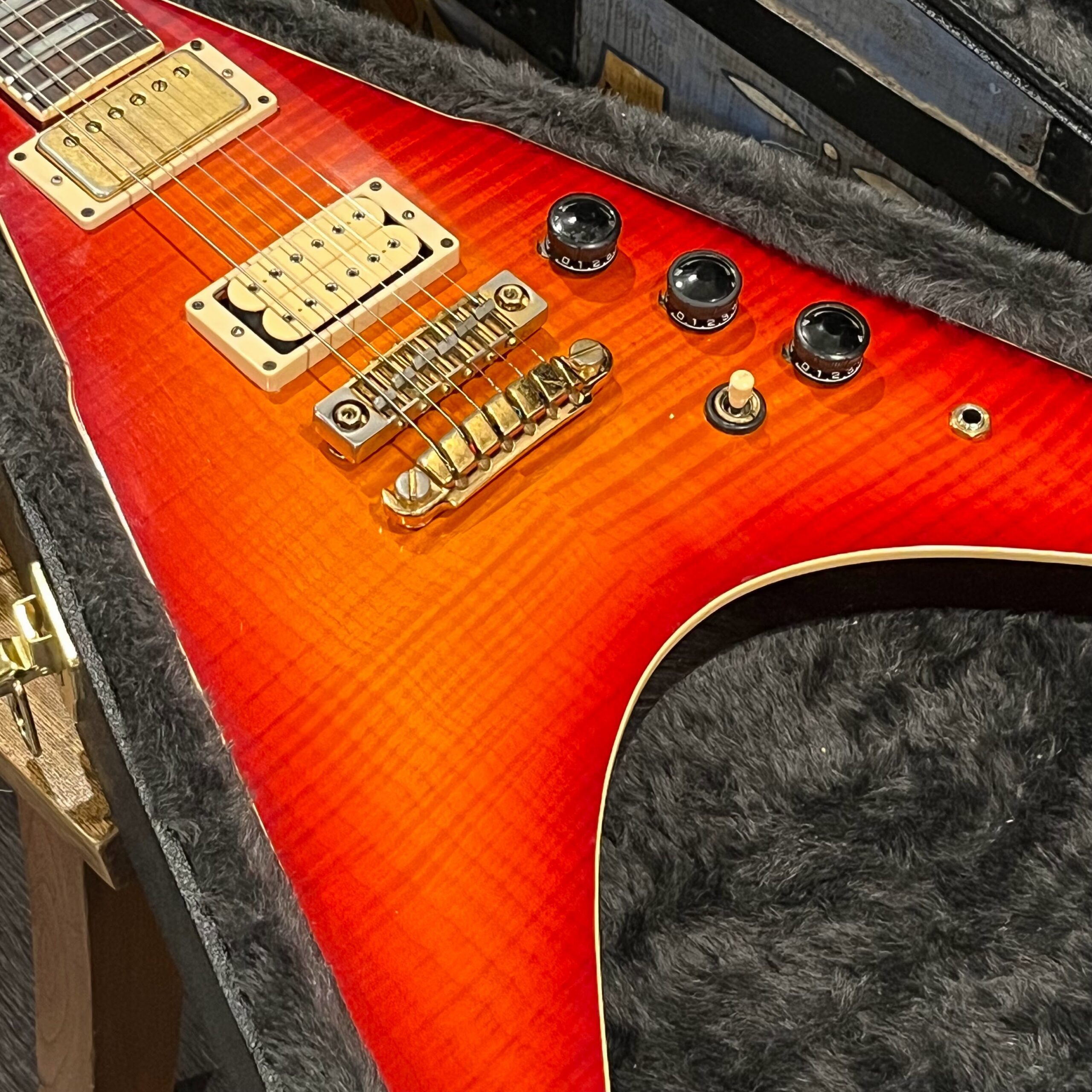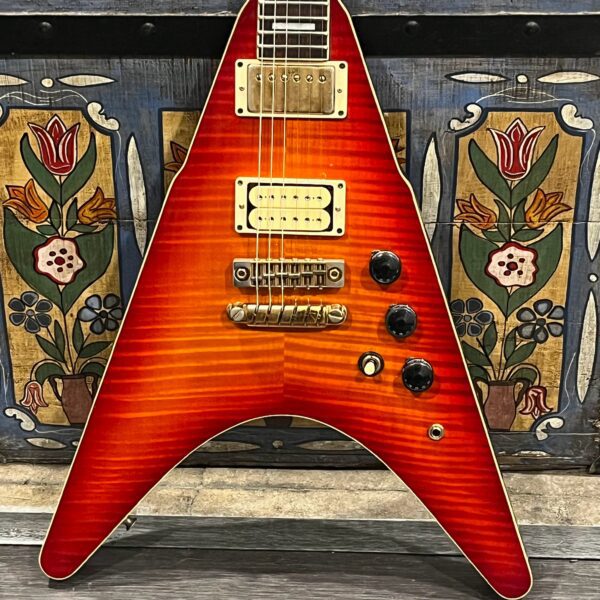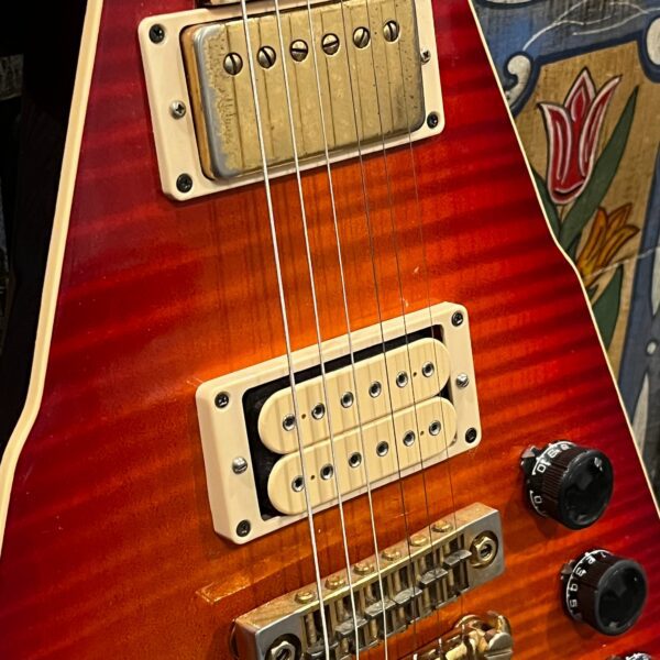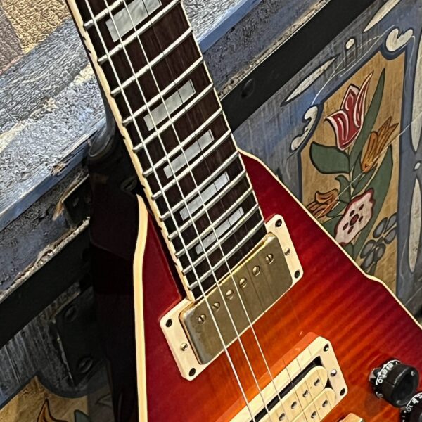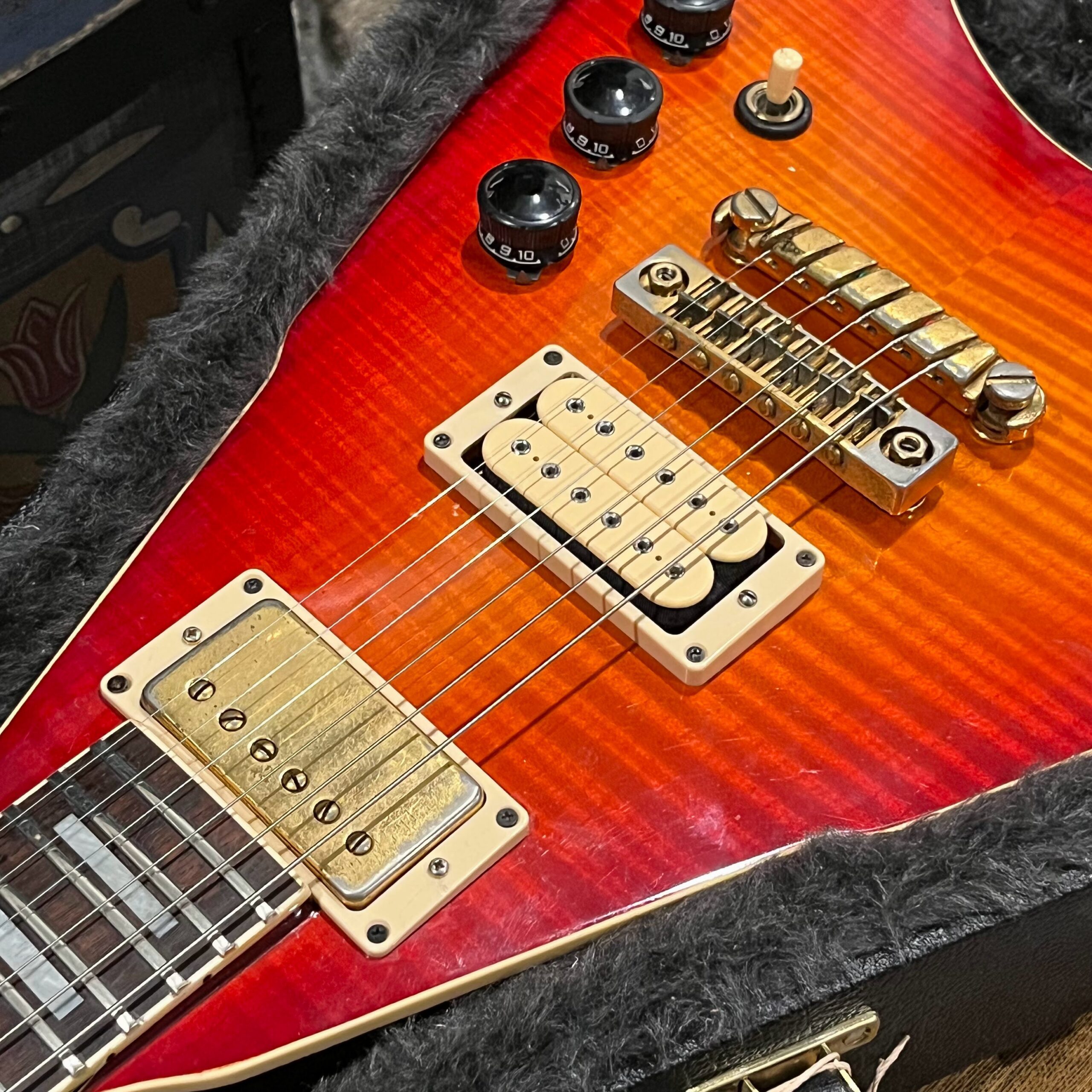 This is a one-of-one Custom creation starting with an original ’83 Ibanez Rocket Roll II RR550 Flying V made in Japan, set-neck beauty in Cherry Sunburst. It came from the Fujijen factory spec’d with an Ibanez HardRocker tremolo in February 1983.