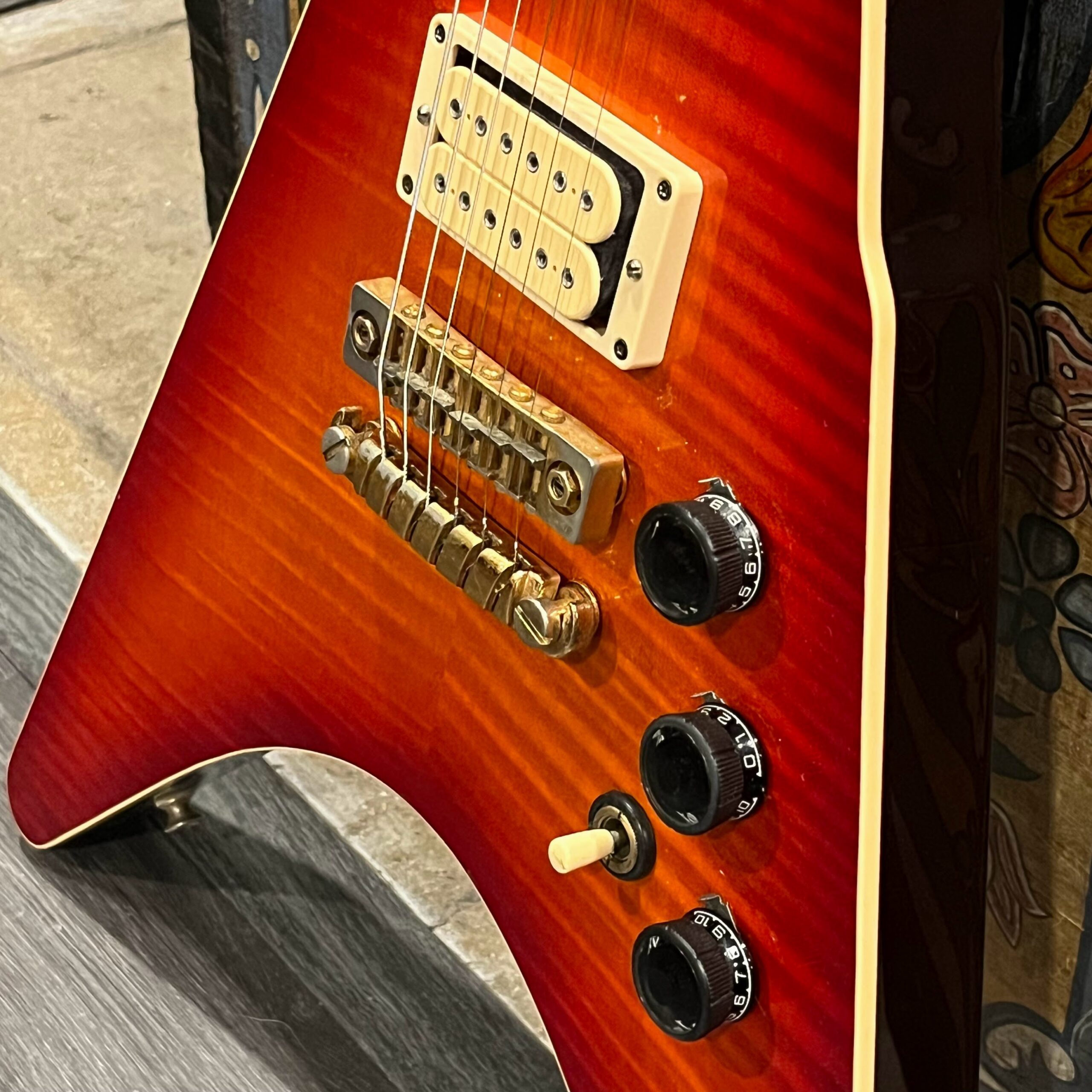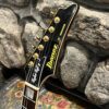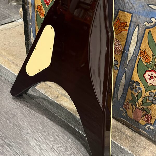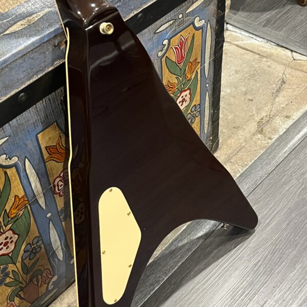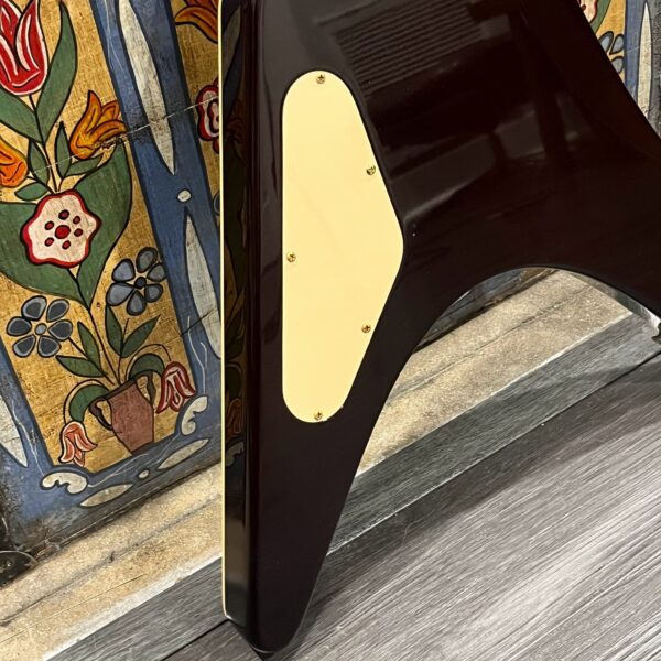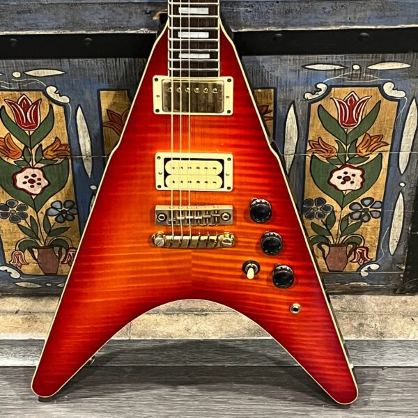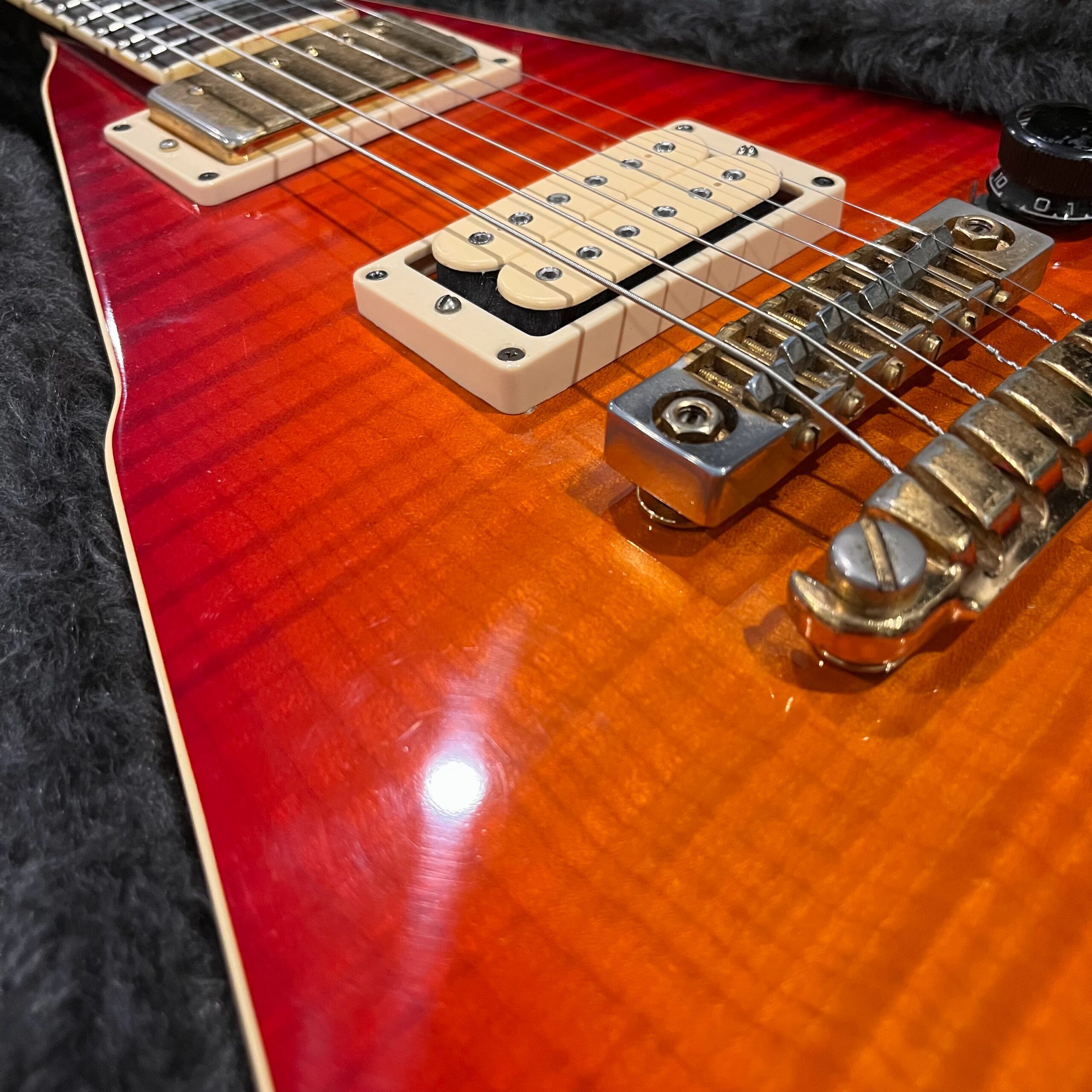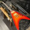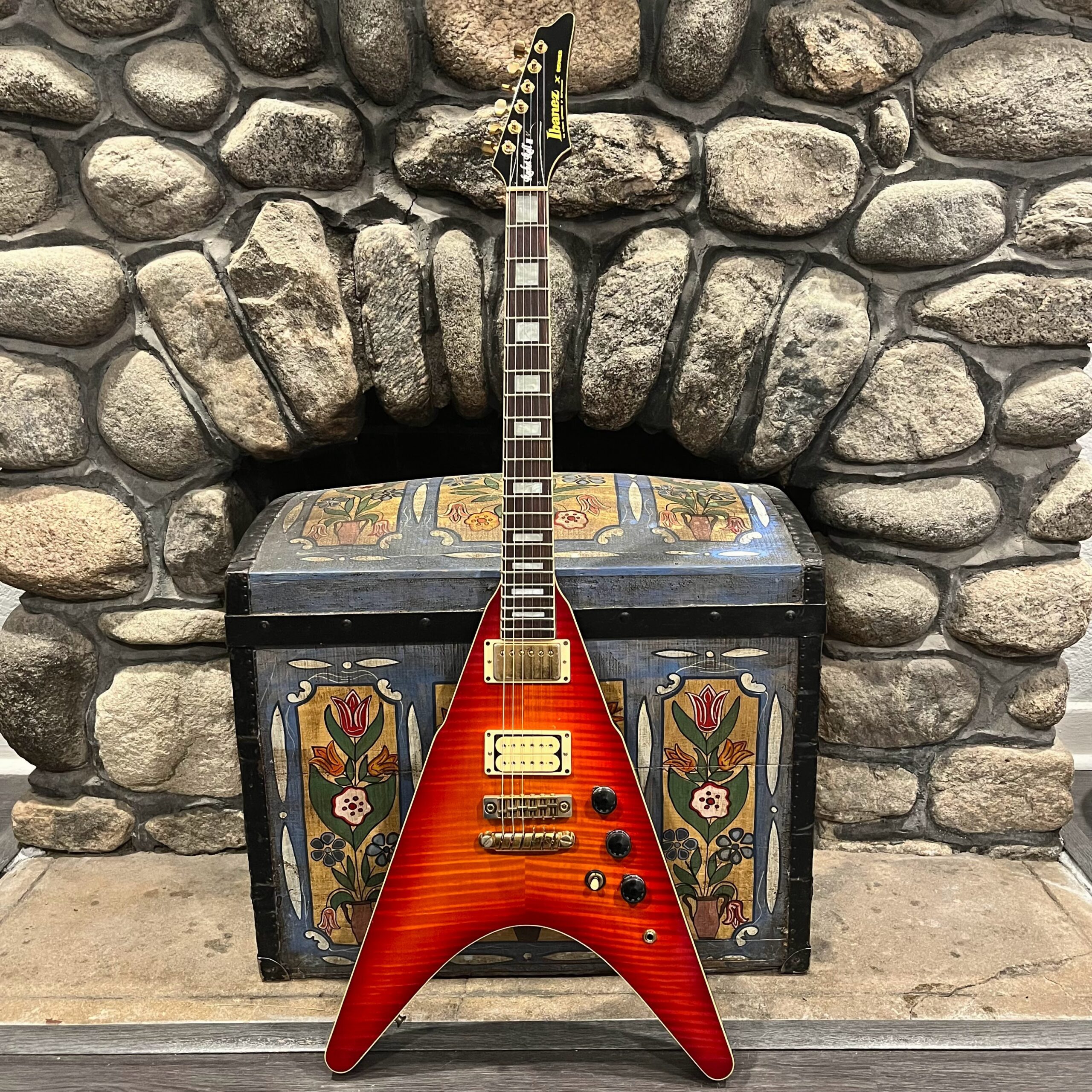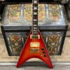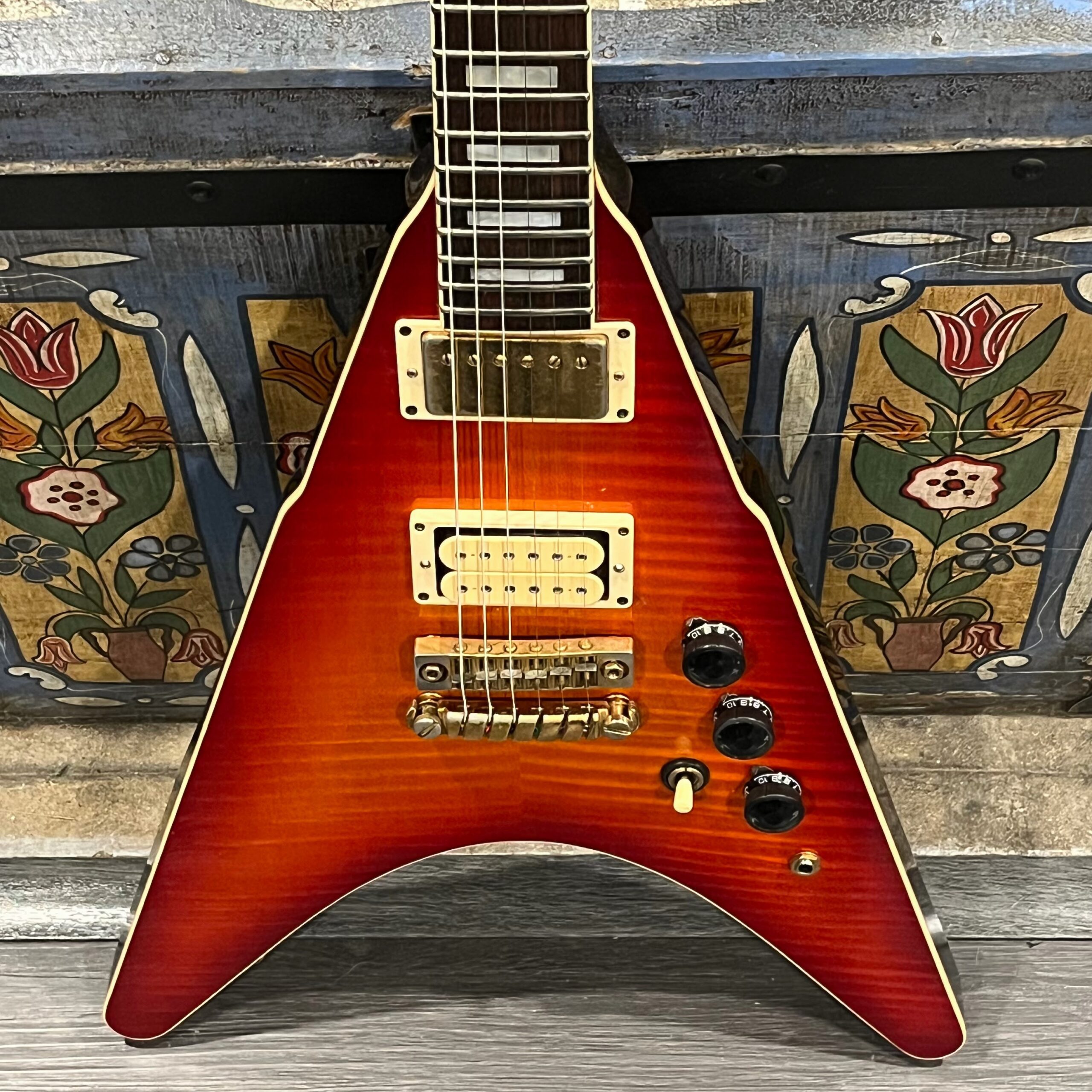This is a one-of-one Custom creation starting with an original ’83 Ibanez Rocket Roll II RR550 Flying V made in Japan, set-neck beauty in Cherry Sunburst. It came from the Fujijen factory spec’d with an Ibanez HardRocker tremolo in February 1983.