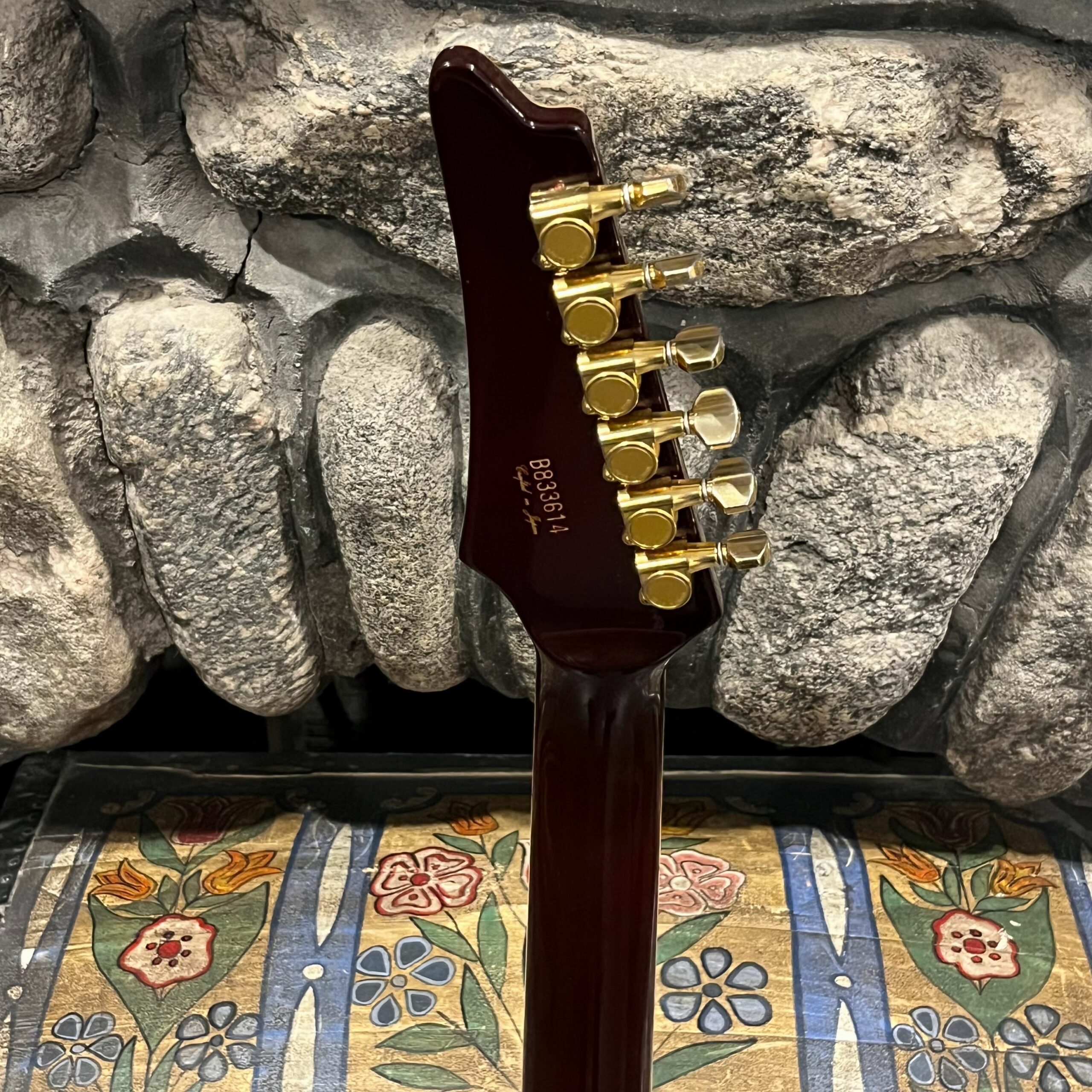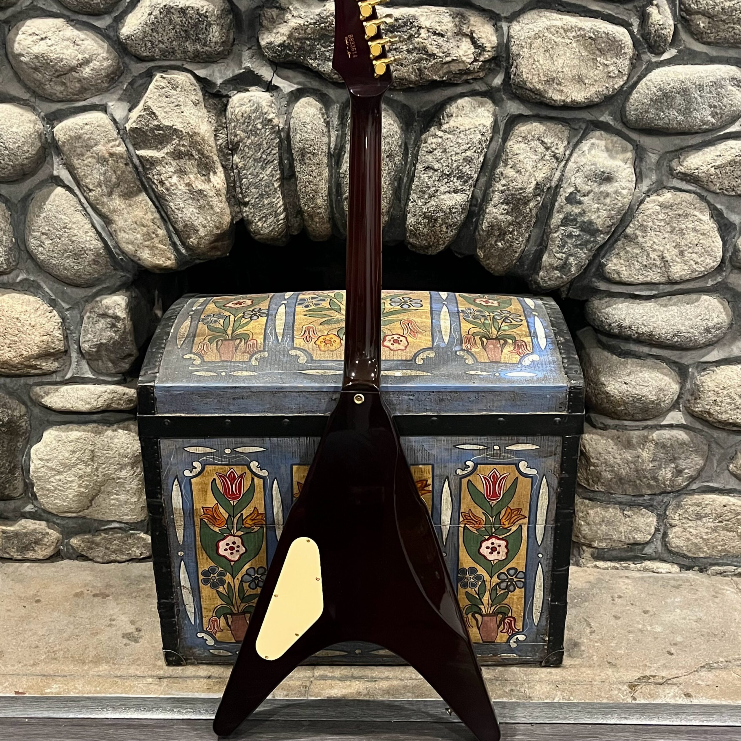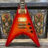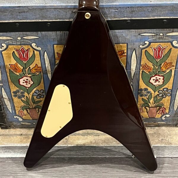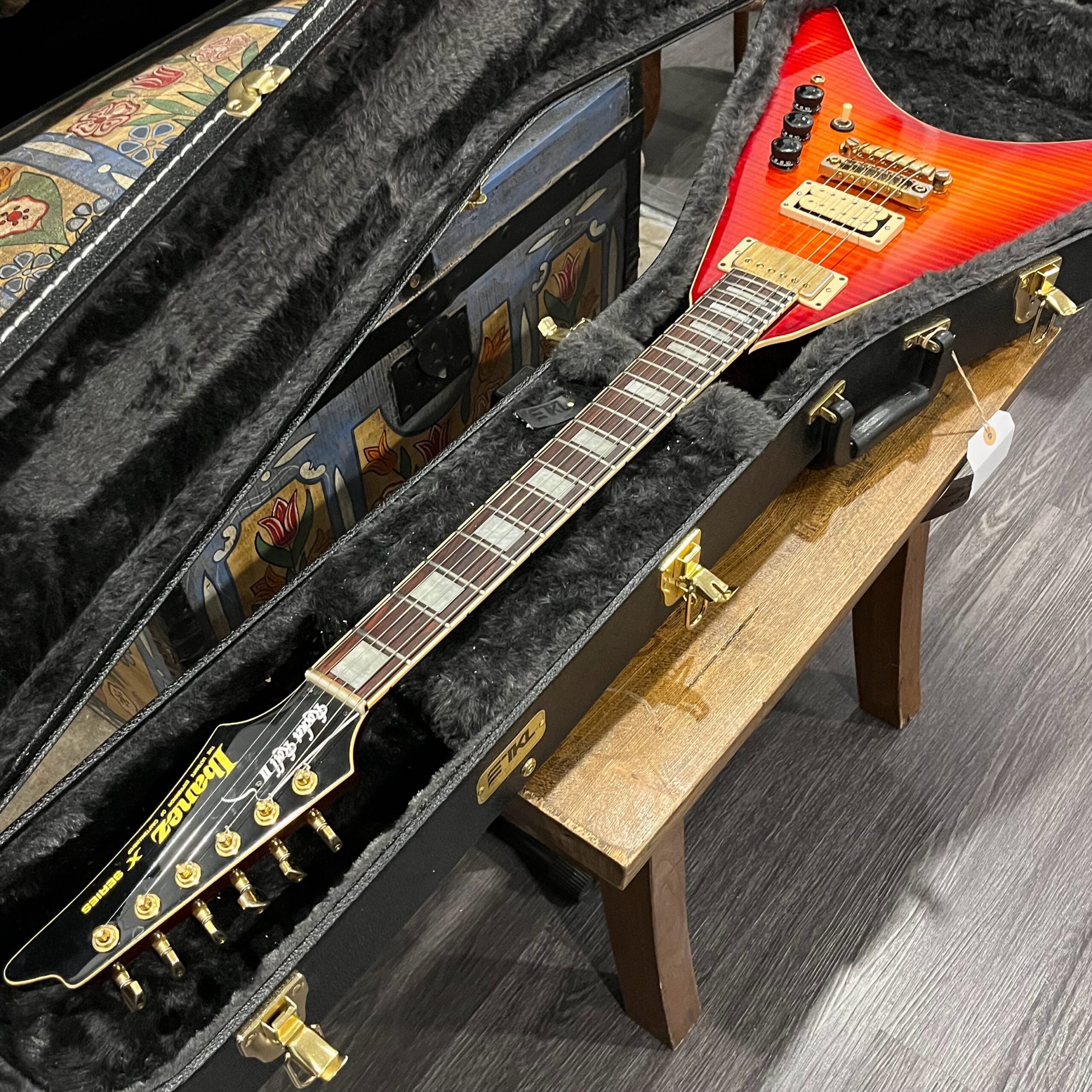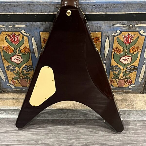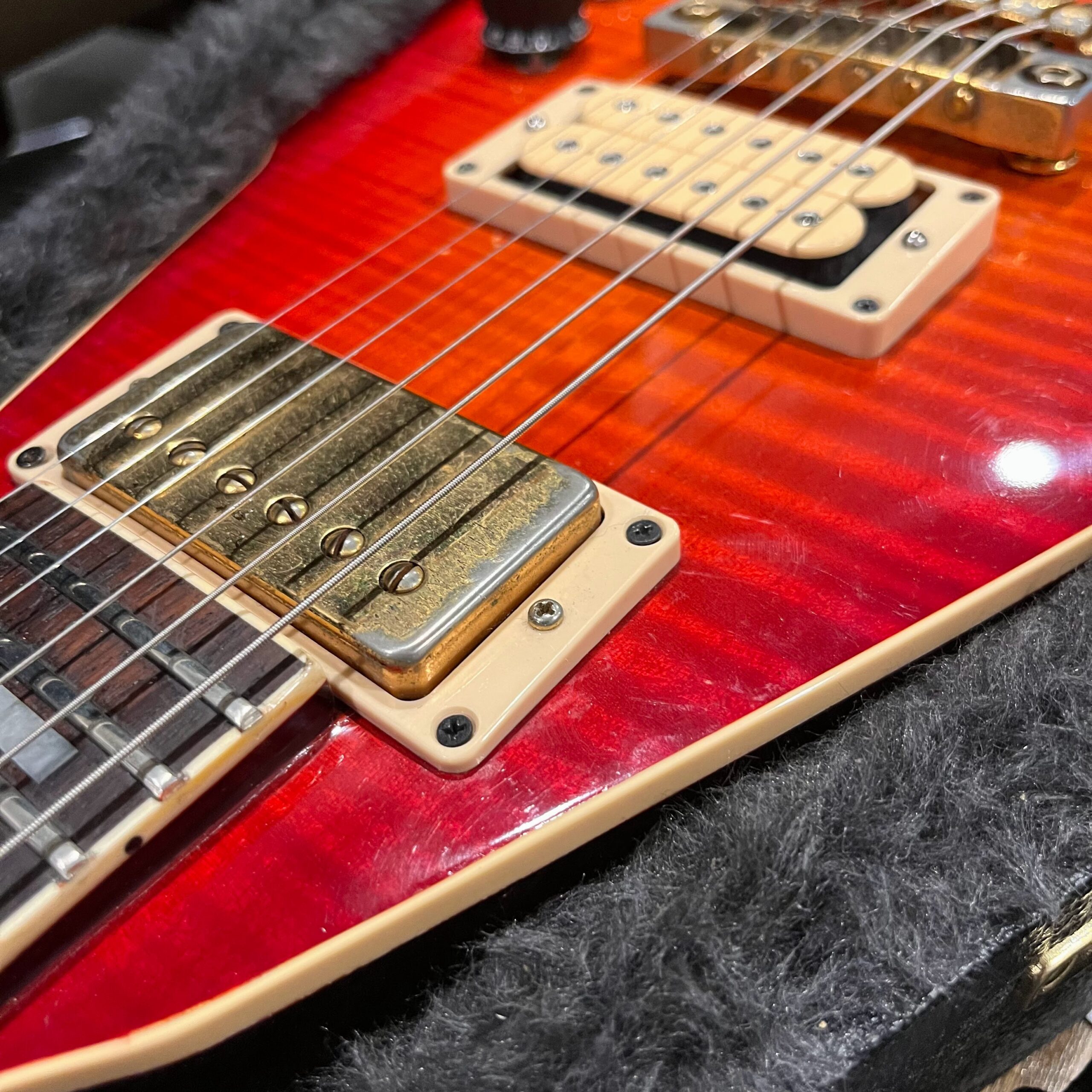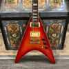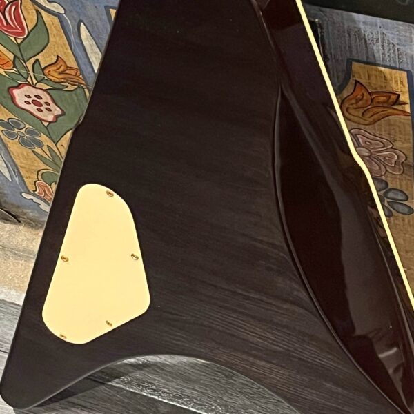 This is a one-of-one Custom creation starting with an original ’83 Ibanez Rocket Roll II RR550 Flying V made in Japan, set-neck beauty in Cherry Sunburst. It came from the Fujijen factory spec’d with an Ibanez HardRocker tremolo in February 1983.