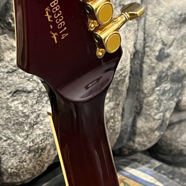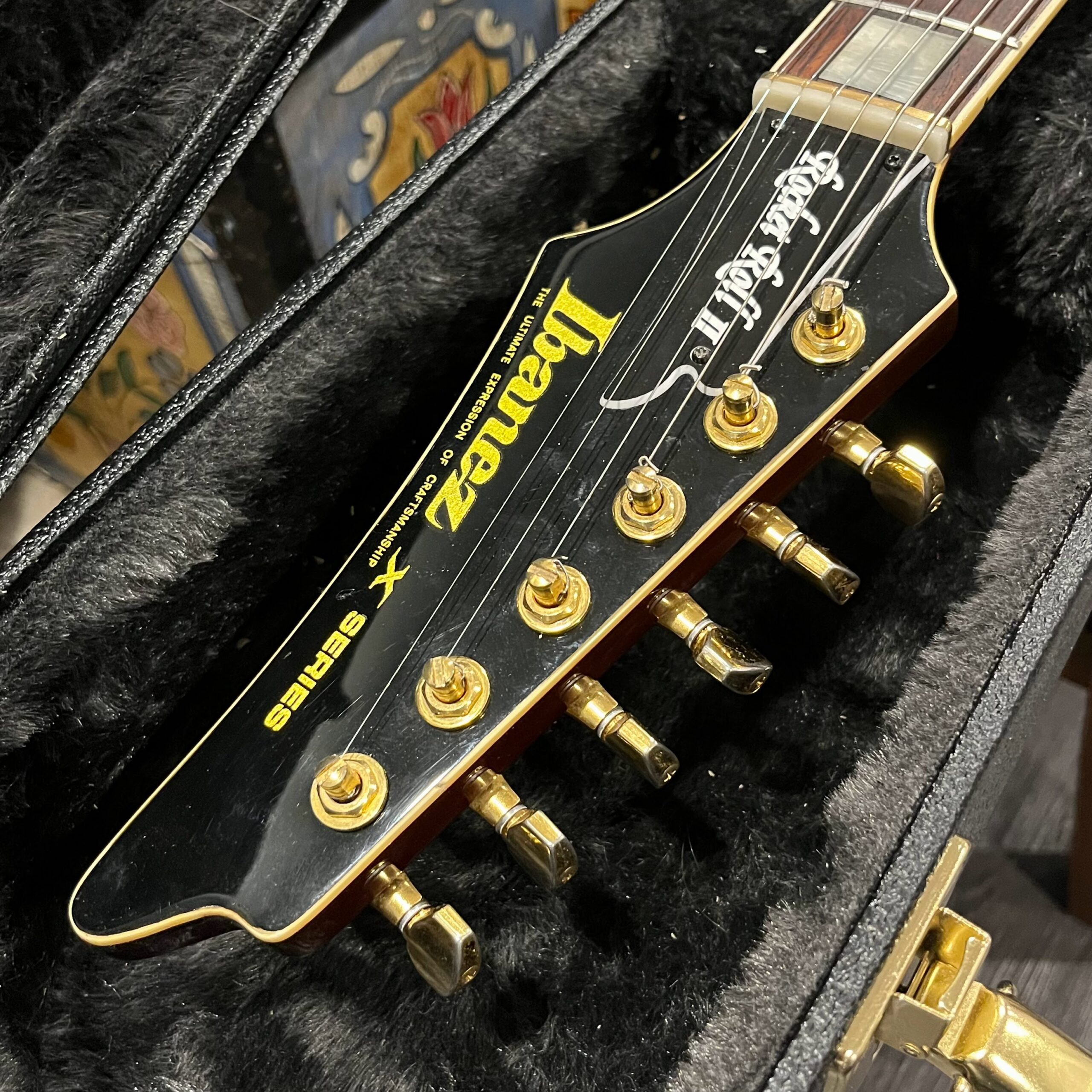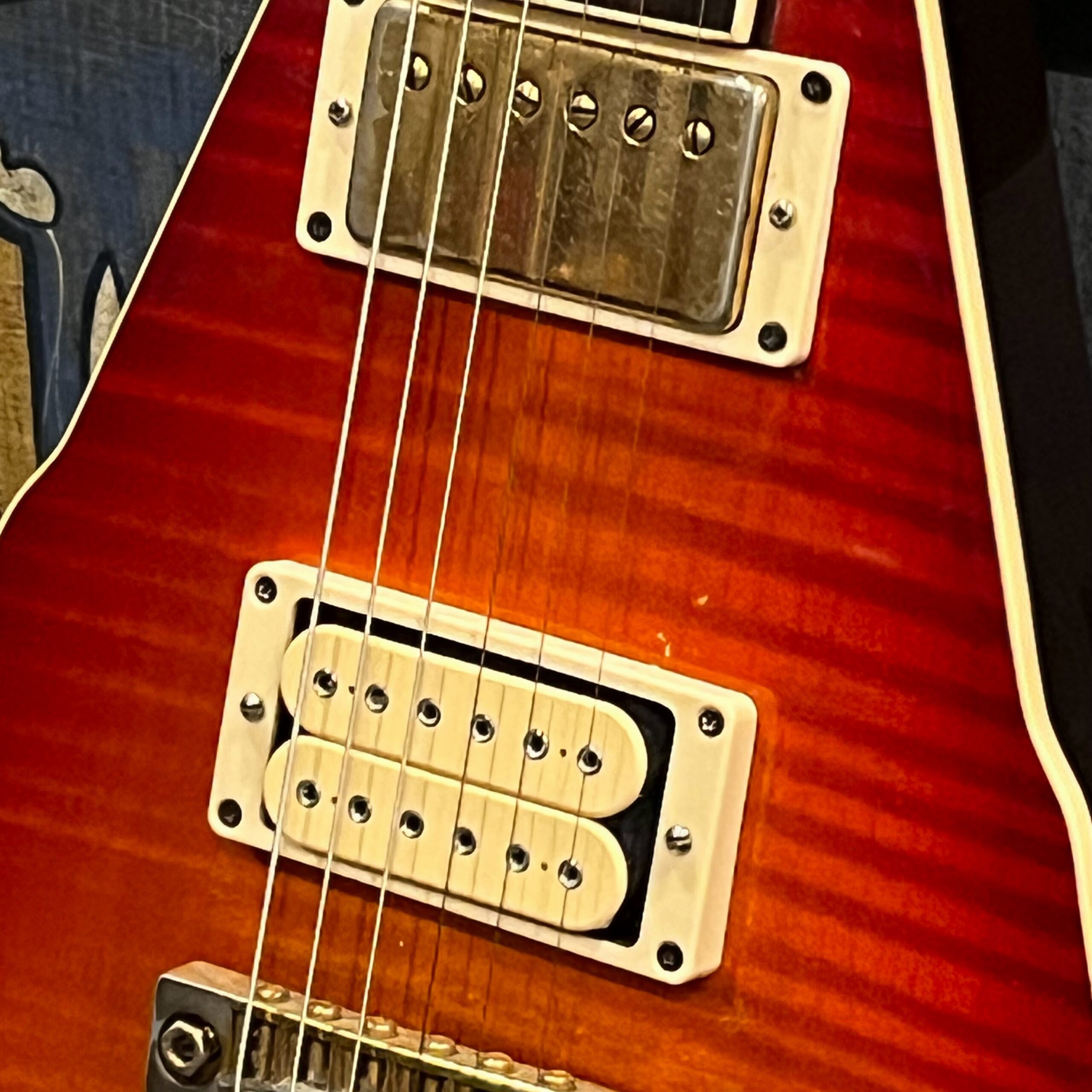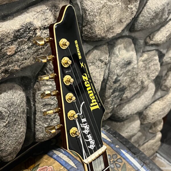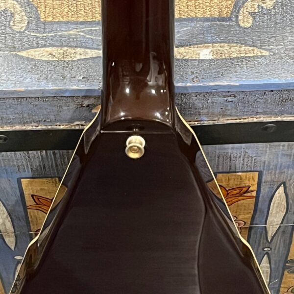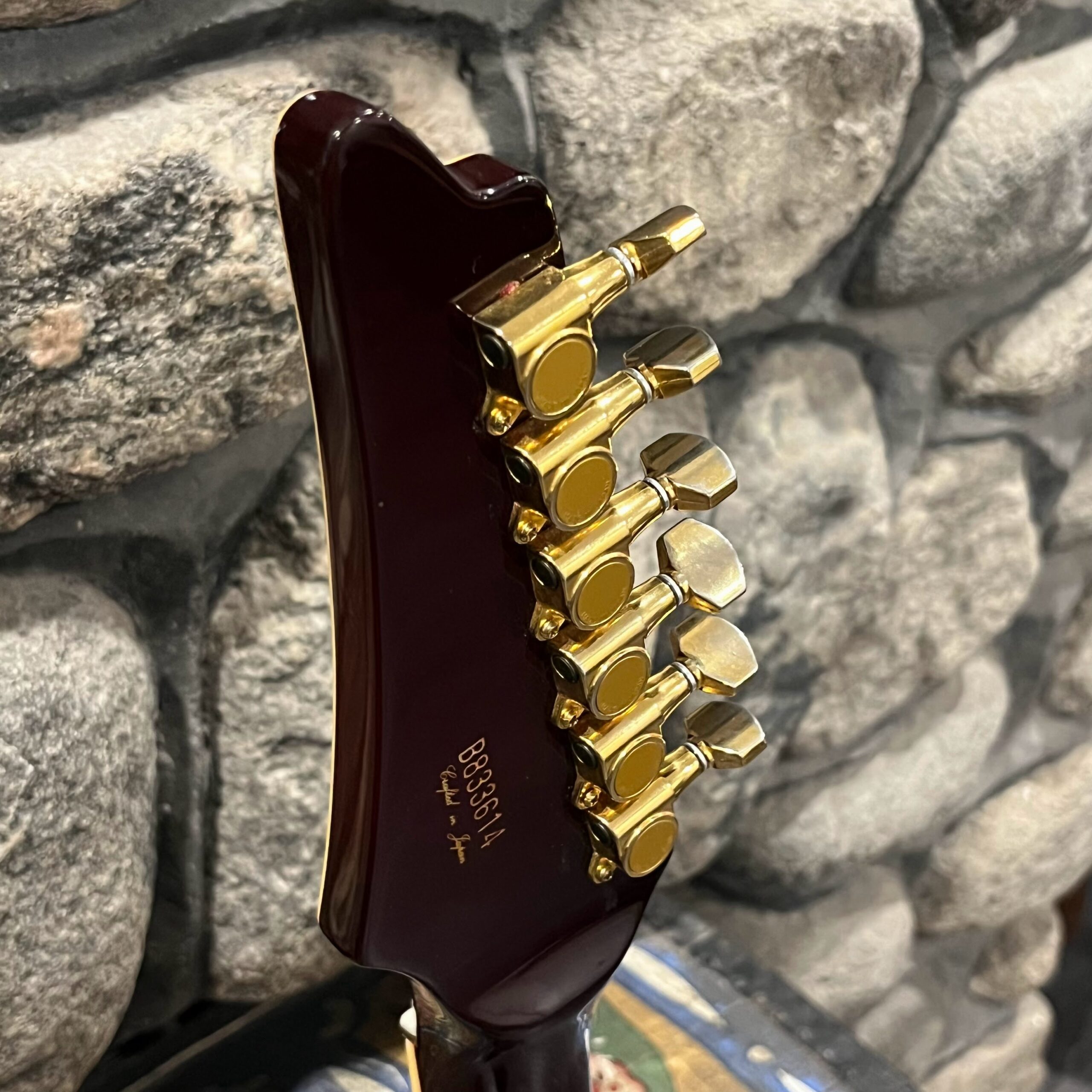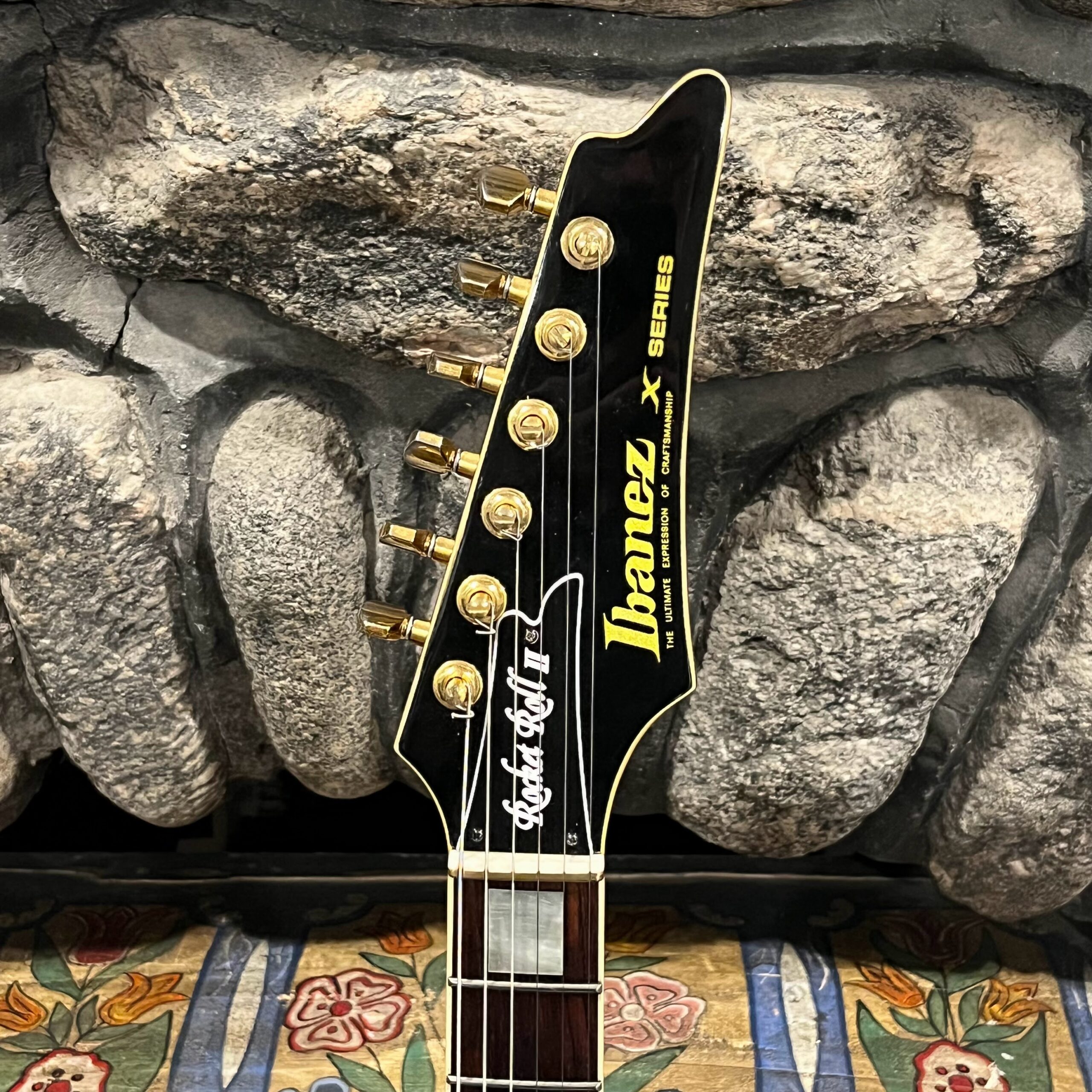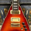 This is a one-of-one Custom creation starting with an original ’83 Ibanez Rocket Roll II RR550 Flying V made in Japan, set-neck beauty in Cherry Sunburst. It came from the Fujijen factory spec’d with an Ibanez HardRocker tremolo in February 1983.