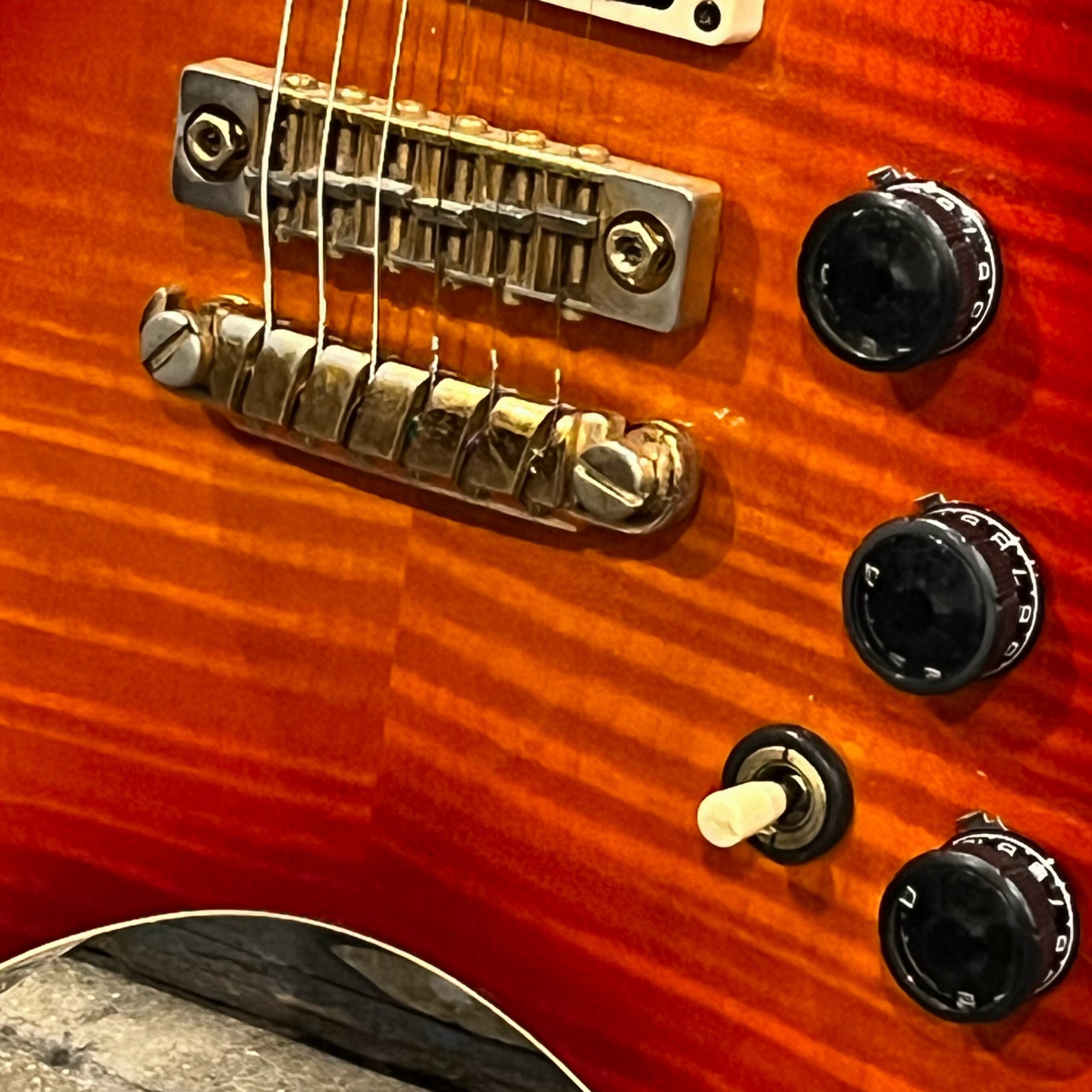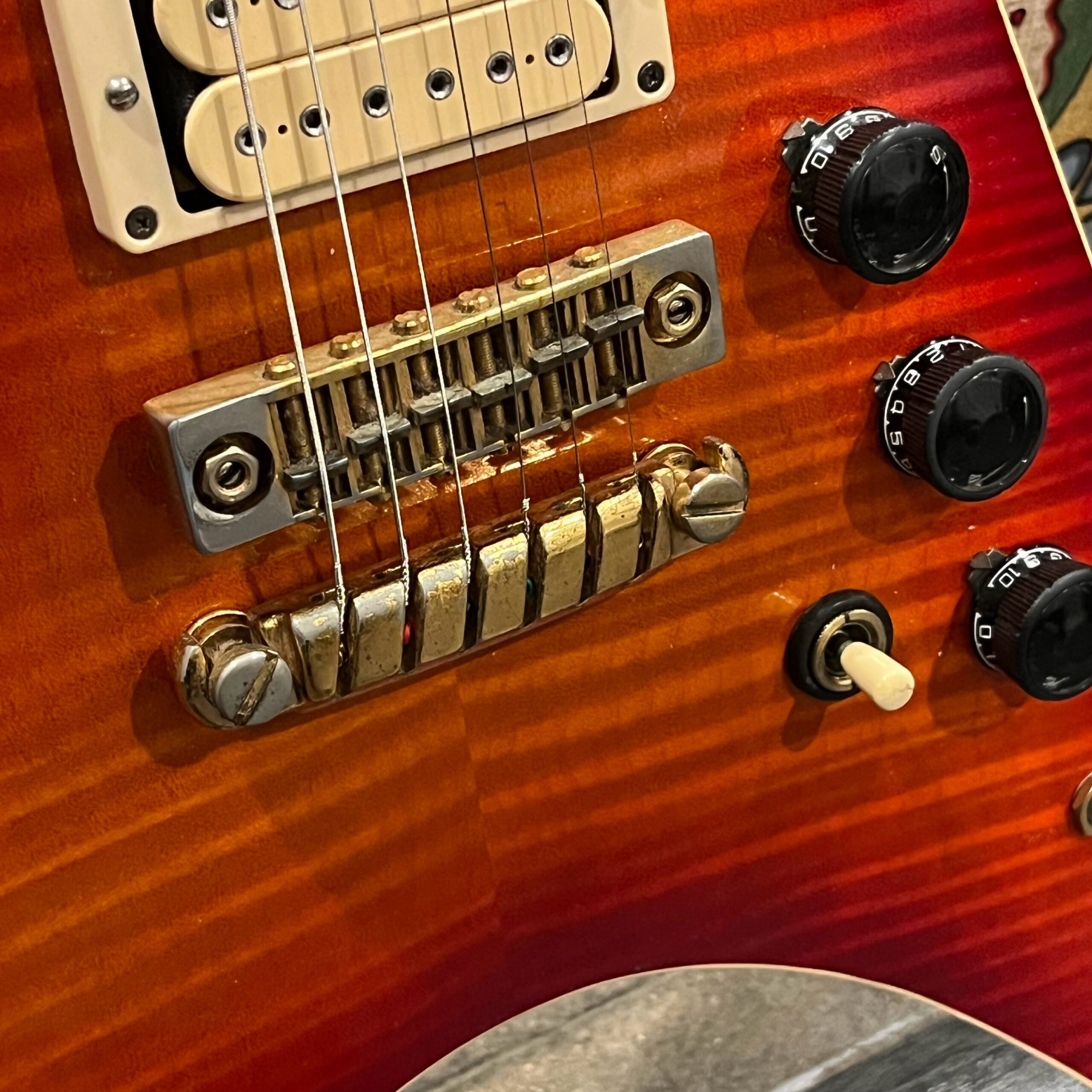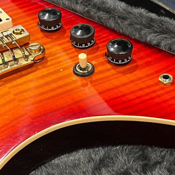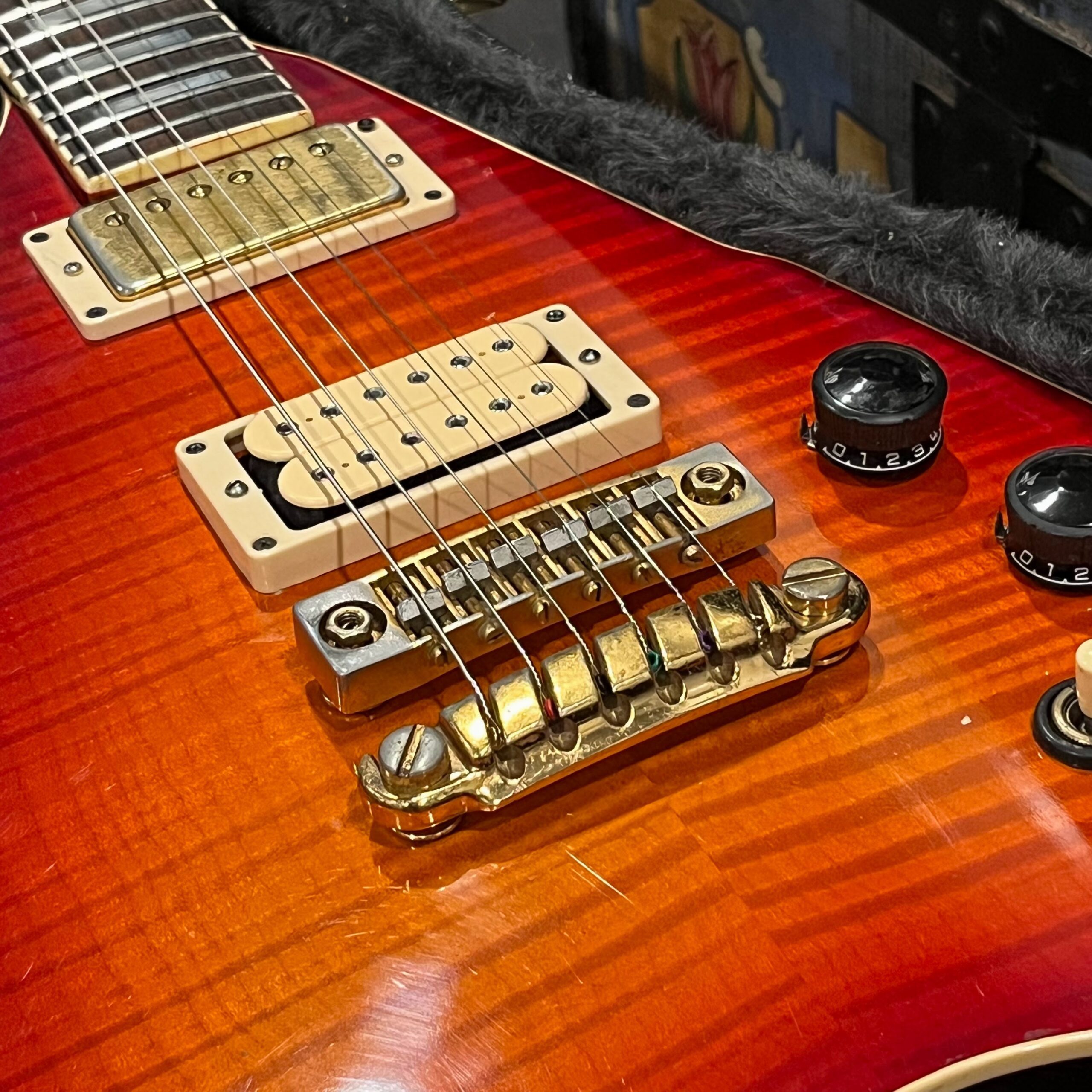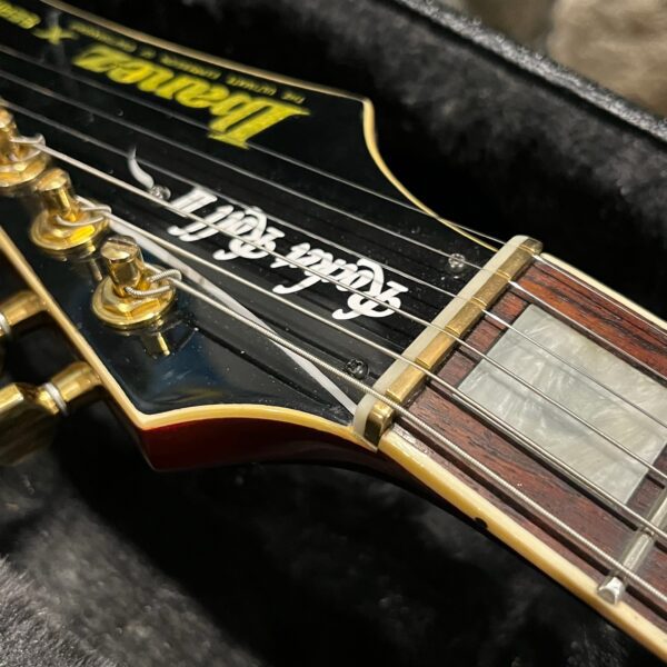 The instrument was professionally rebuilt in 2018/2019 here in LA and converted to a hardtail with vintage Gibraltar bridge setup ala Destroyers and Rocket Rolls from 1978-1982 and other high end Ibanez instruments such as PF Performers and AR Artist series instruments. A new flamed top was added, binding was replaced, and then the instrument was painted up as far as its original headstock so the serial number from the factory is retained. Everything above the level of the volute is original finish, looking very good. The pickups are a cream D’Marzio Super Distortion in the bridge position which make a lot of noise, and a Maxon/Ibanez Super70 PAF style pickup in the neck position, making for a very versatile guitar that can do a lot of things. Any hardware not vintage Ibanez is Gotoh Japan. The guitar has a custom brass and bone nut, Ibanez black flat-topped switch, gold tuners, bridge and tailpiece and vintage SureGrip knobs with new rubber grip rings retrofit from a later model, custom Rocket Roll II truss rod cover, flat, wide neck with 22 jumbo frets, and a beautiful rosewood fretboard, professionally wired, and is obviously for the very few.