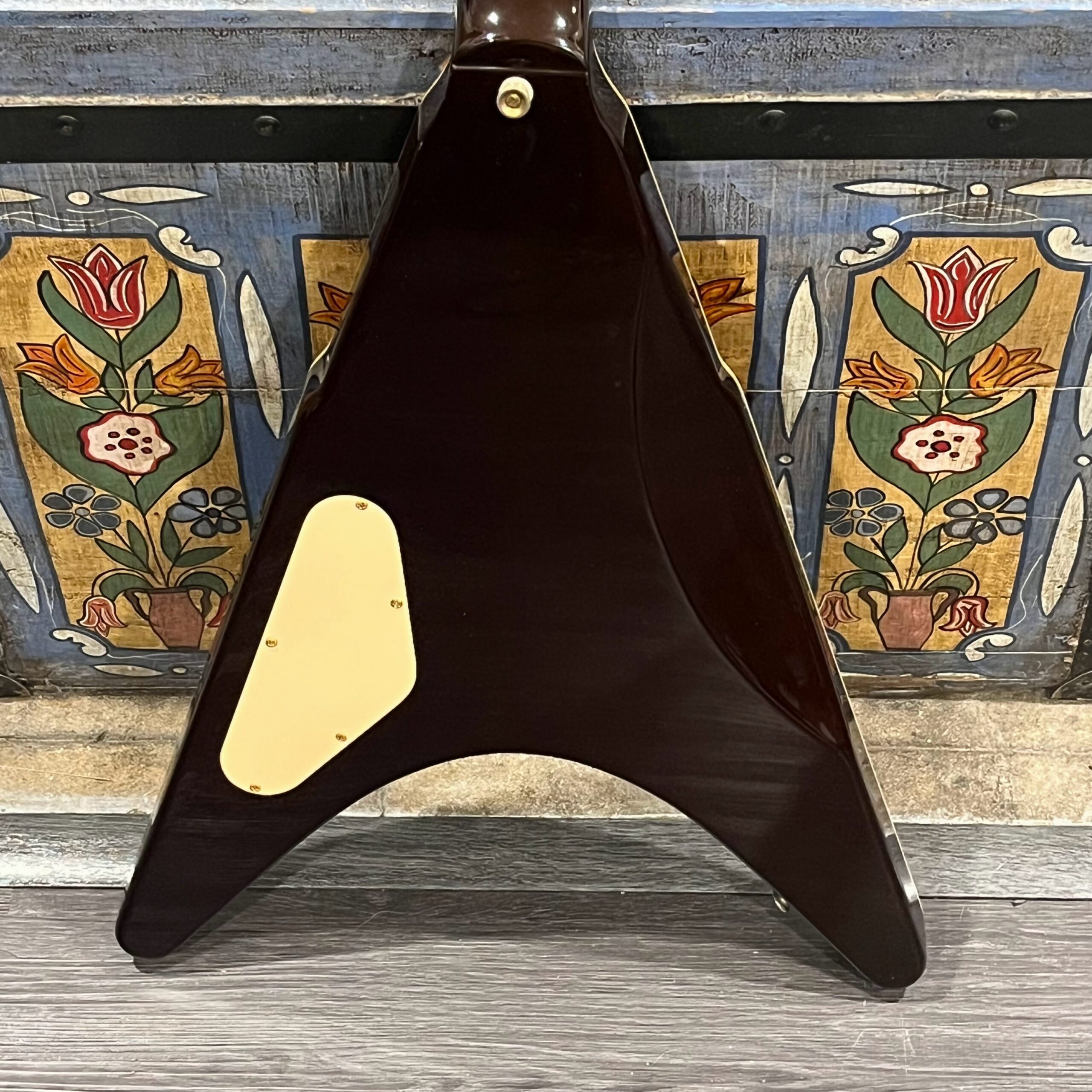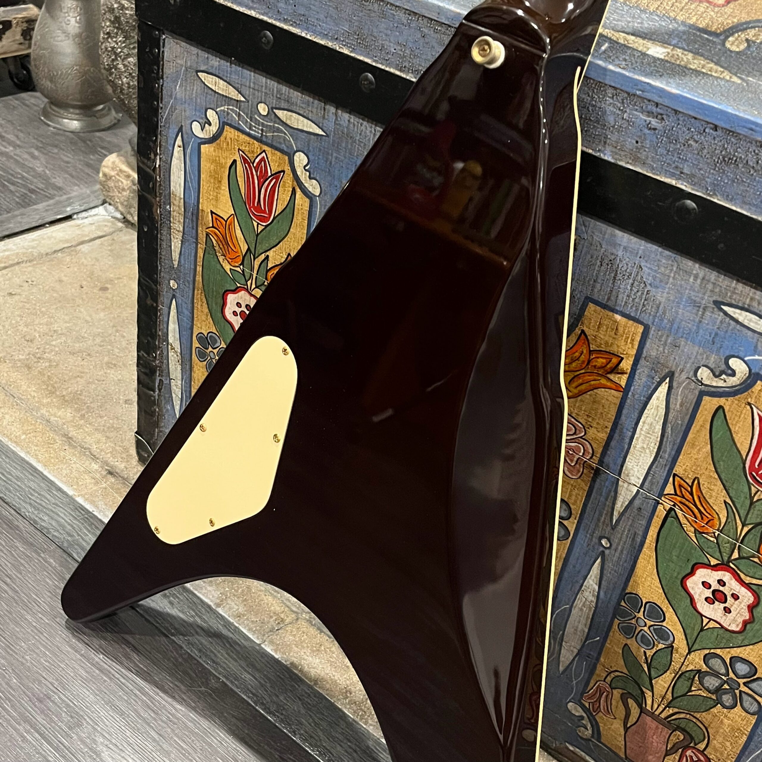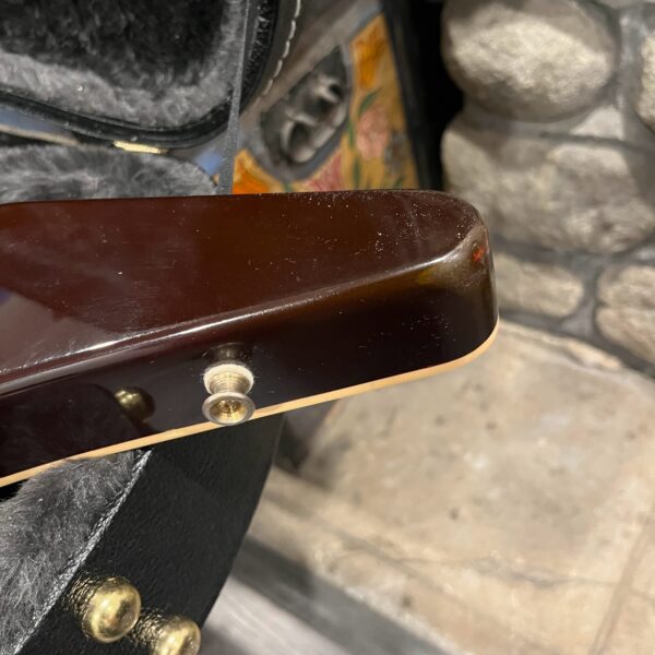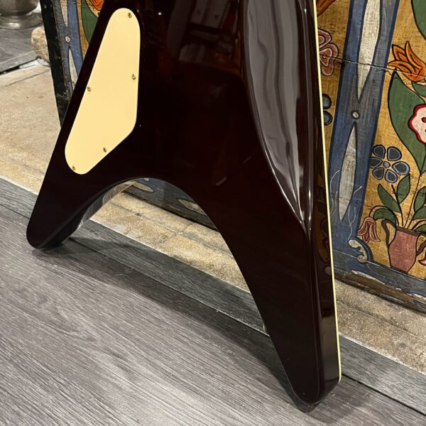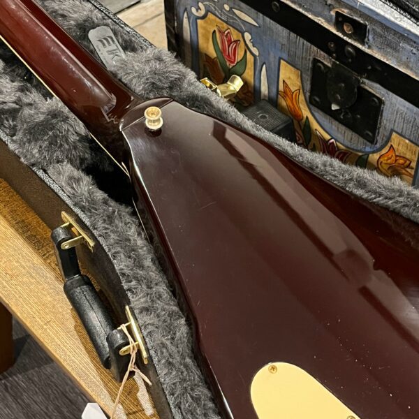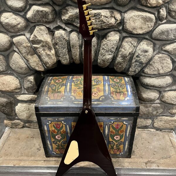 Extra holes drilled for original and non-original tuners, patina on metal parts, none of the hardware is original to the instrument. The paint on the horns reacted to the first case that this was kept in which affected the finish, hard to spot unless you look. There’s also wear on the tips from resting on the ground or in a stand, a few small flakes missing from the front between the pickups from play, typical V wear, not new or pristine but presents as excellent. Impressions on the back from a stand or strap, harsh lighting required, guitar presents as excellent. See the pictures, ask for more. As always, lots more pictures of this one at my site which Reverb doesn’t want me to link to, but if you put a dotcom behind my shop name, you’d already be there.