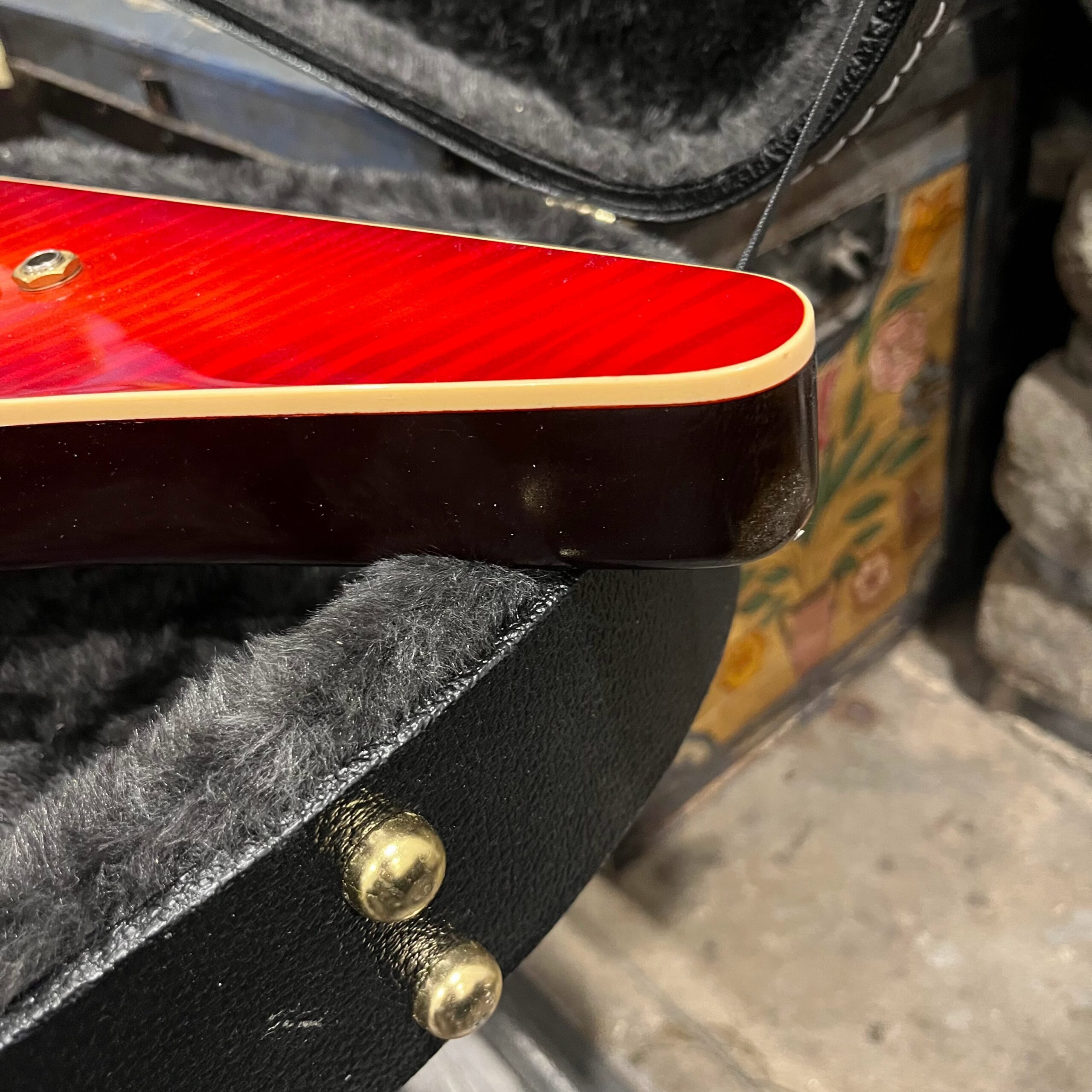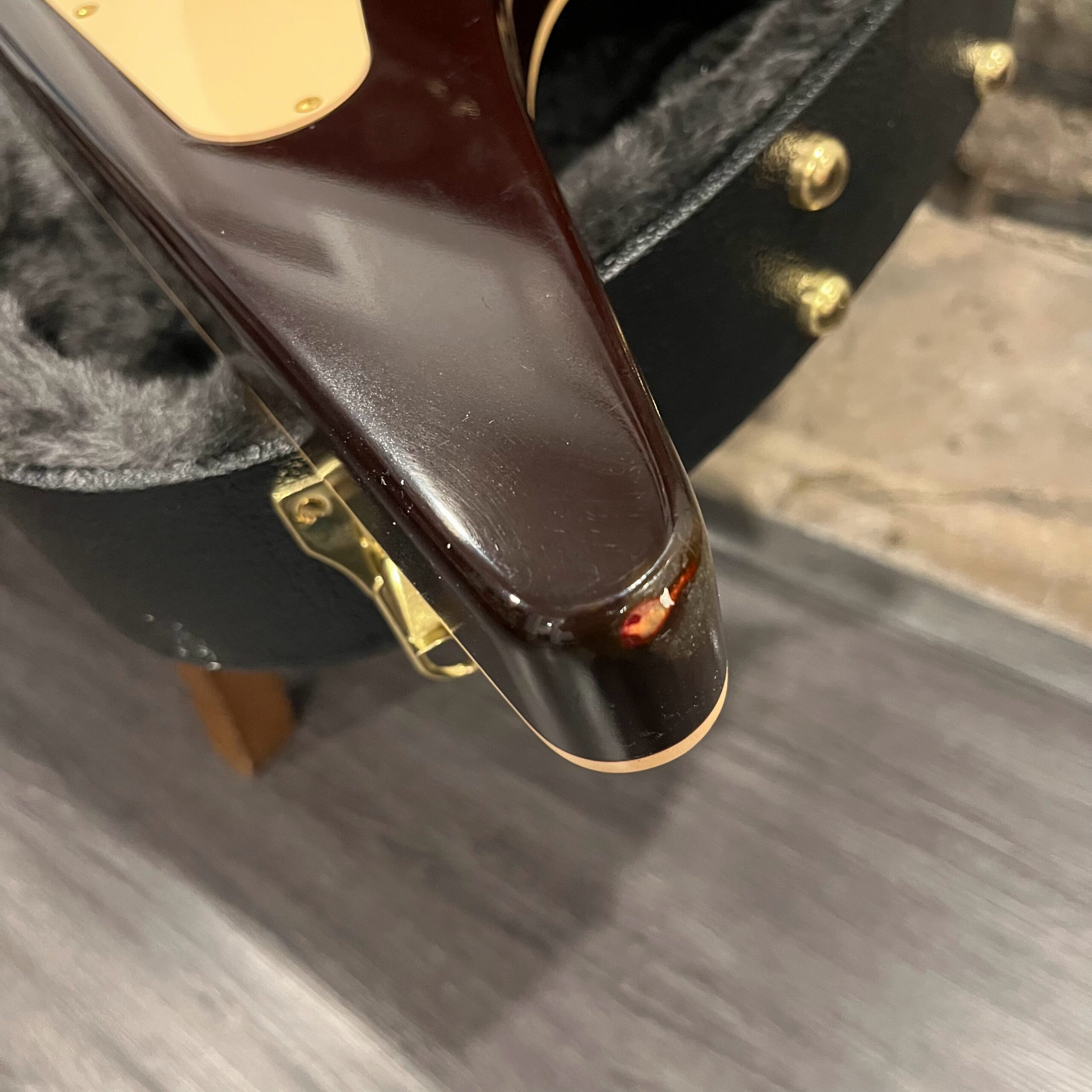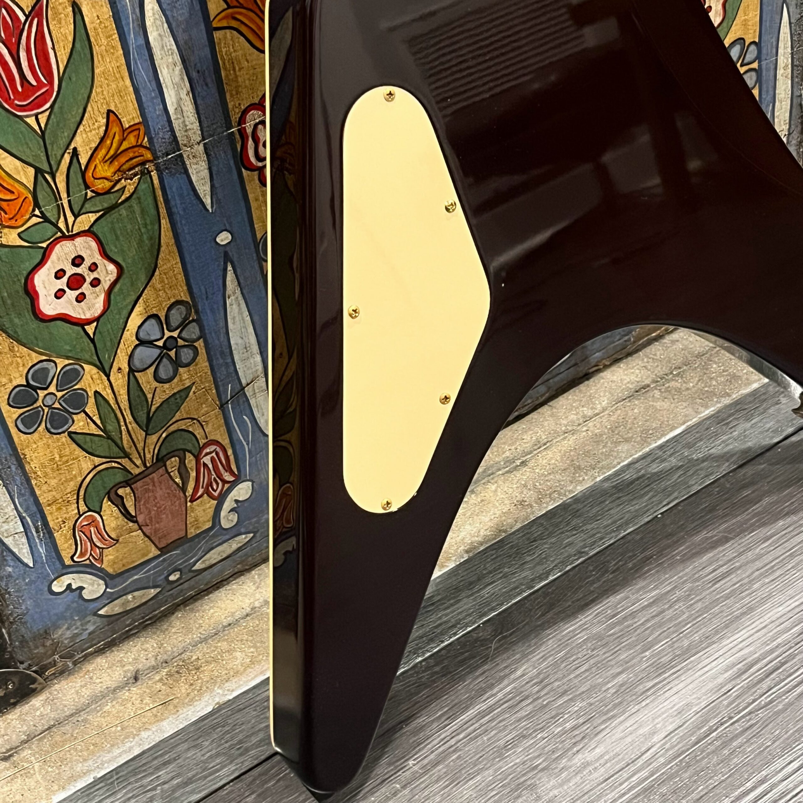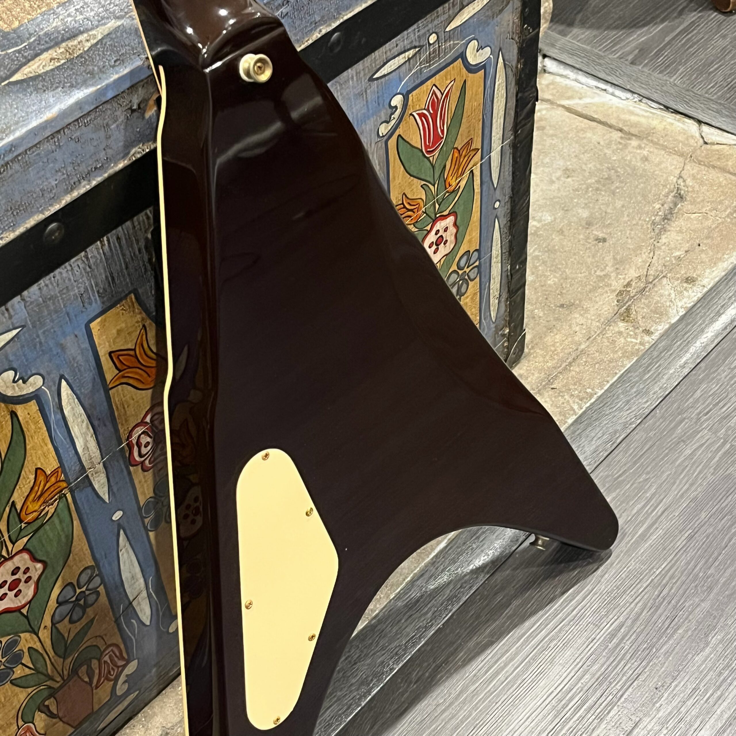 Extra holes drilled for original and non-original tuners, patina on metal parts, none of the hardware is original to the instrument. The paint on the horns reacted to the first case that this was kept in which affected the finish, hard to spot unless you look. There’s also wear on the tips from resting on the ground or in a stand, a few small flakes missing from the front between the pickups from play, typical V wear, not new or pristine but presents as excellent. Impressions on the back from a stand or strap, harsh lighting required, guitar presents as excellent. See the pictures, ask for more. As always, lots more pictures of this one at my site which Reverb doesn’t want me to link to, but if you put a dotcom behind my shop name, you’d already be there.