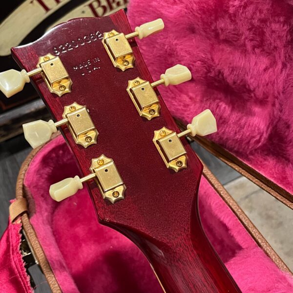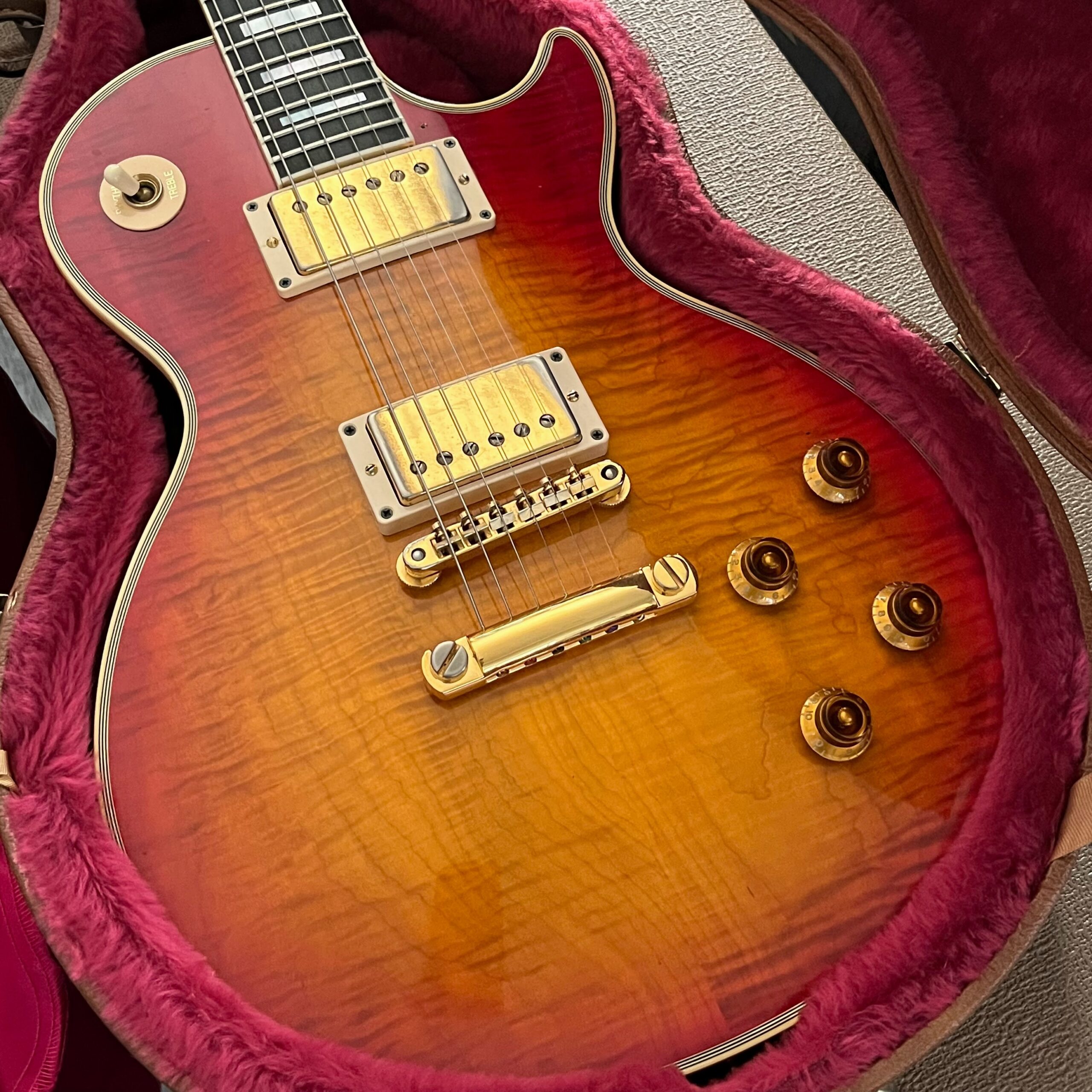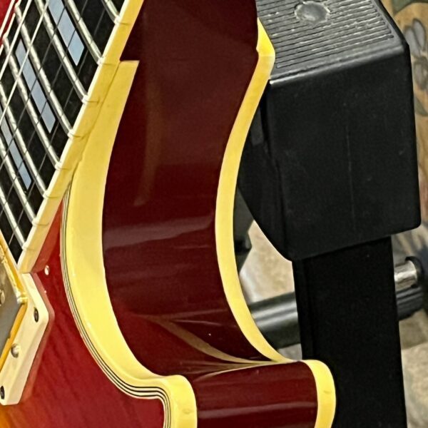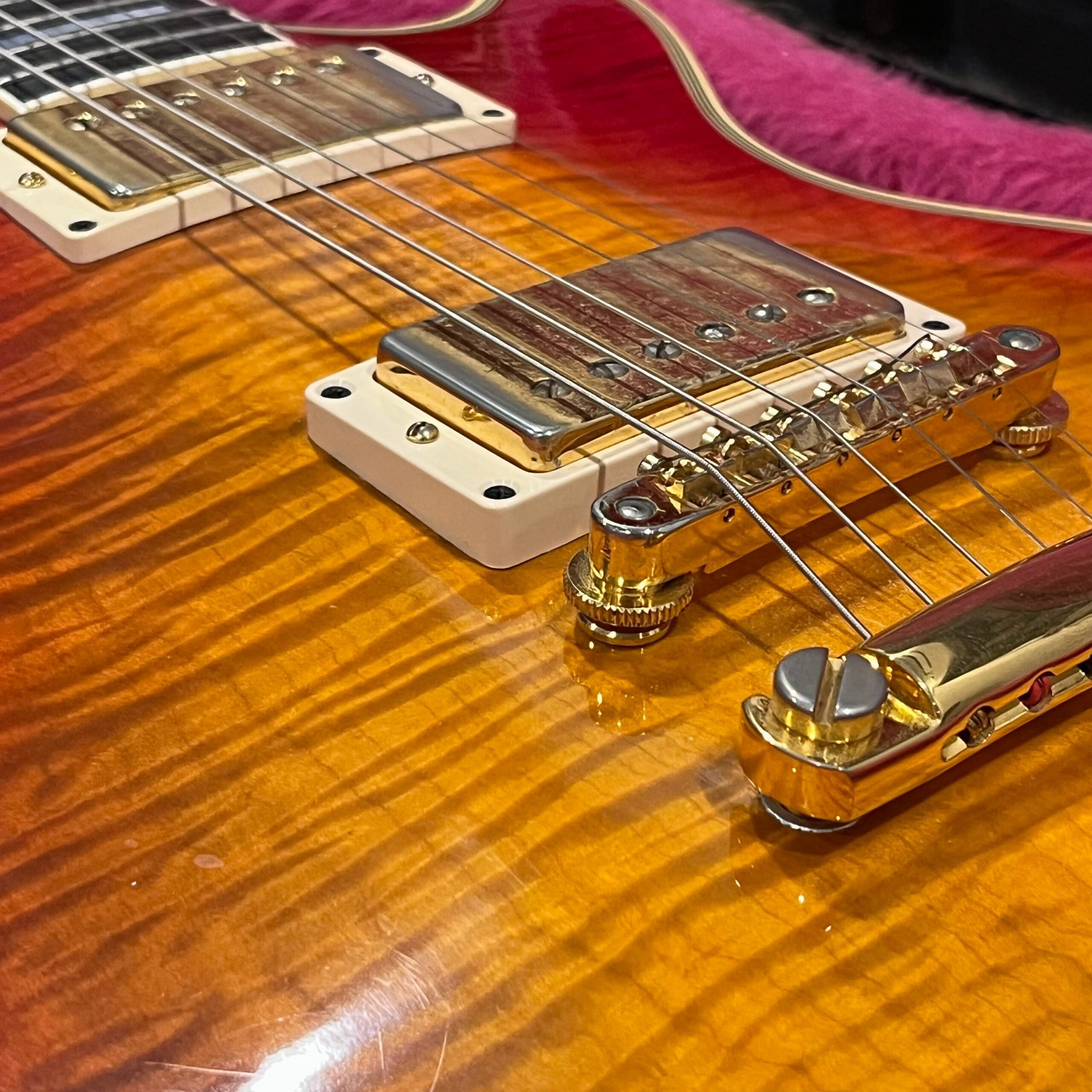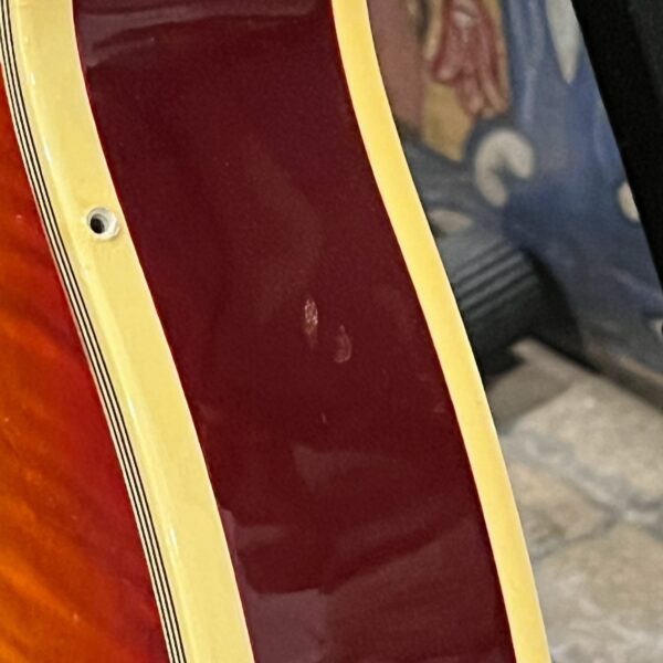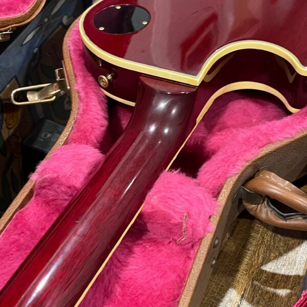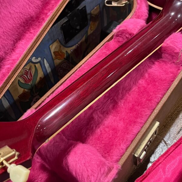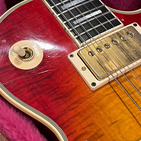 Not new or pristine, shows very light checking, lacquer sink, light impressions from play, swirls, light buckle-rash, small flaws in the binding. Presents as excellent, beautiful instrument with light playwear, no repairs or damage. Gold lightly worn off the bass side tail stud, light patina on metal and plastic, bridge and off the edges of the pickups. Original nut nicely replaced with a bone one in 2006. Heavily figured top looks fantastic. See the pictures, ask for more. As always, lots more pictures of this one at my site which Reverb doesn’t want me to link to, but if you put a dotcom behind my shop name, you’d already be there.