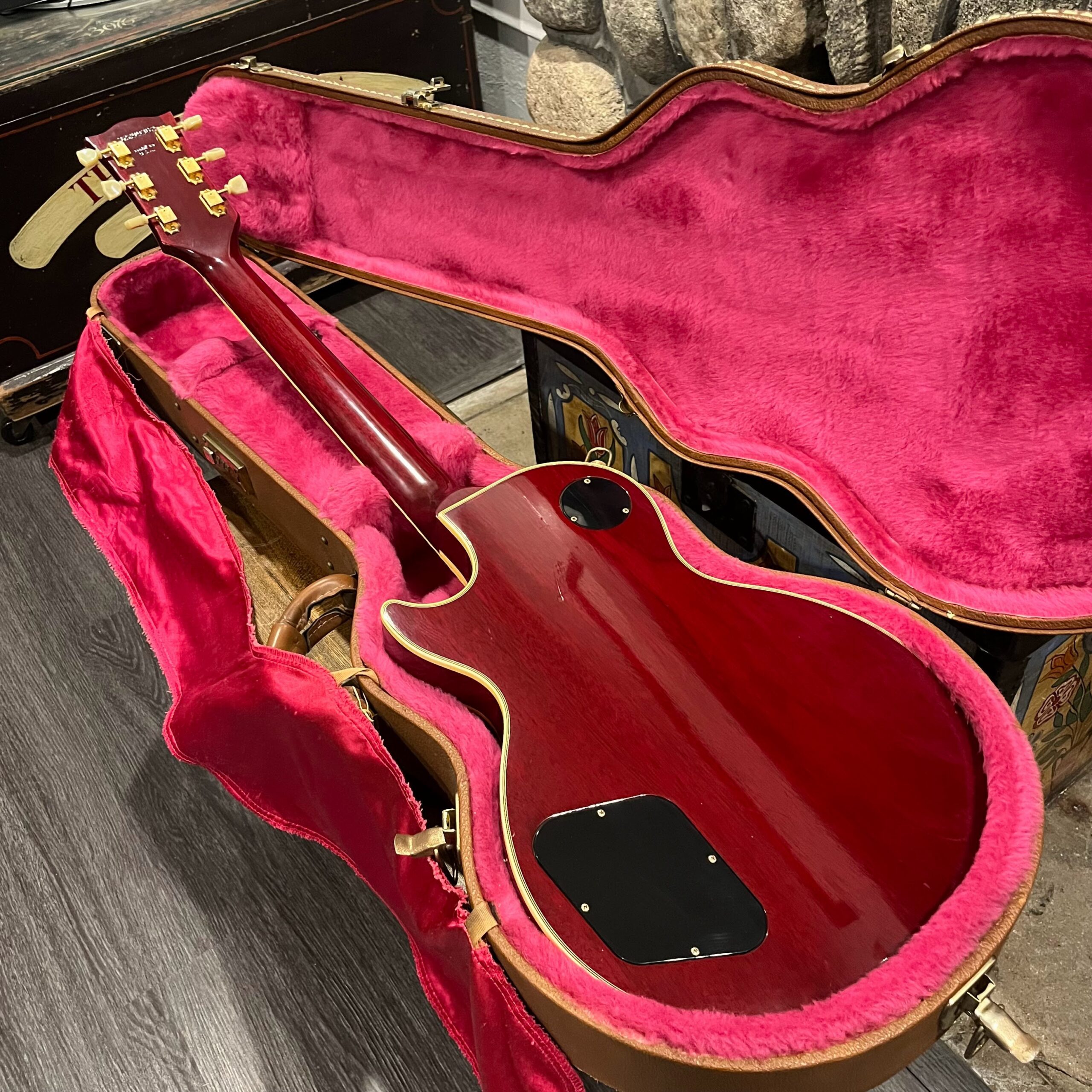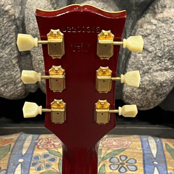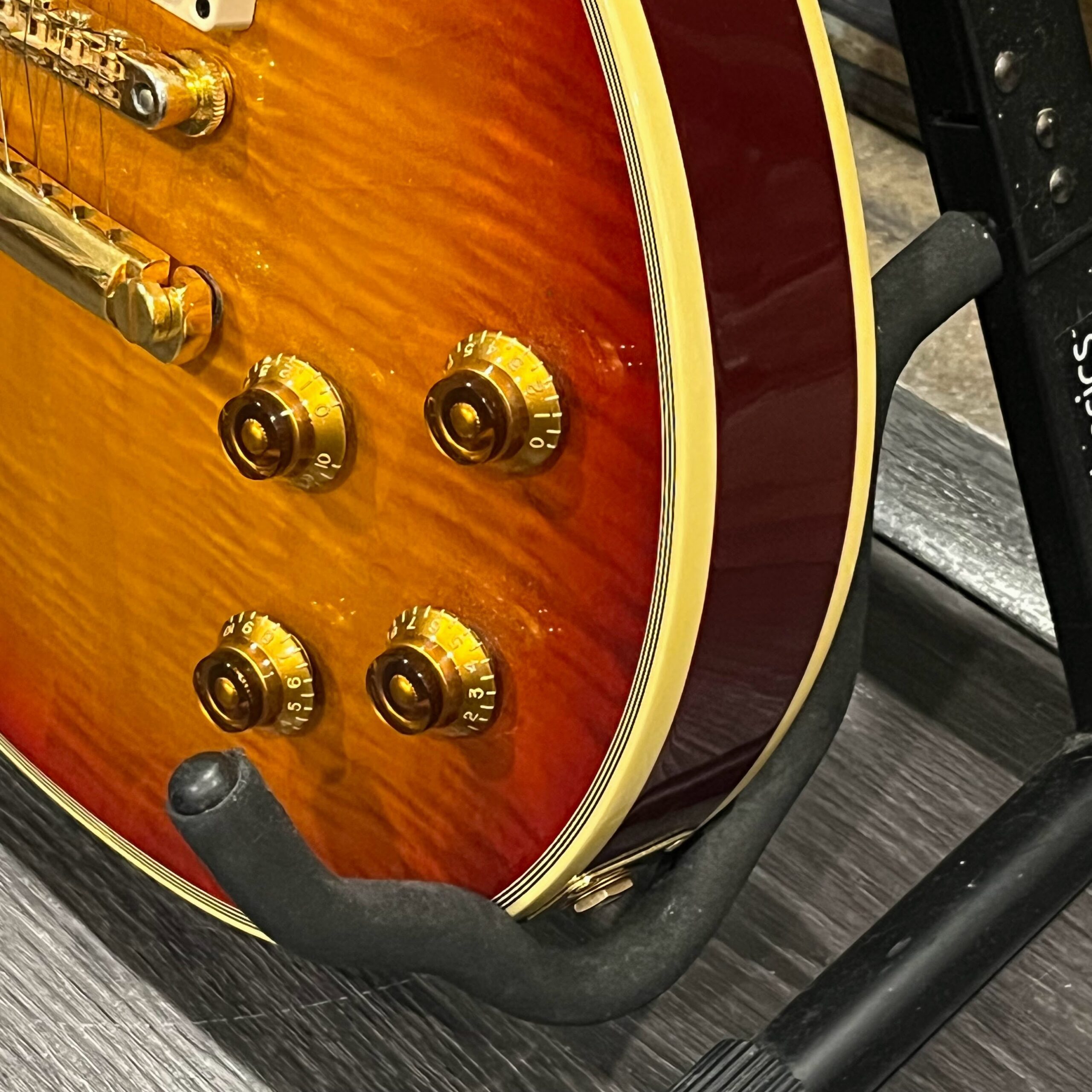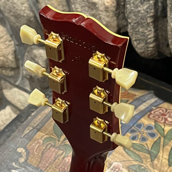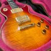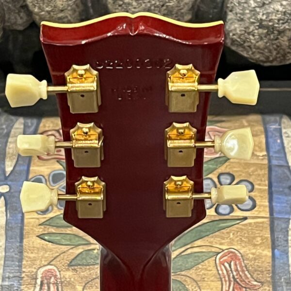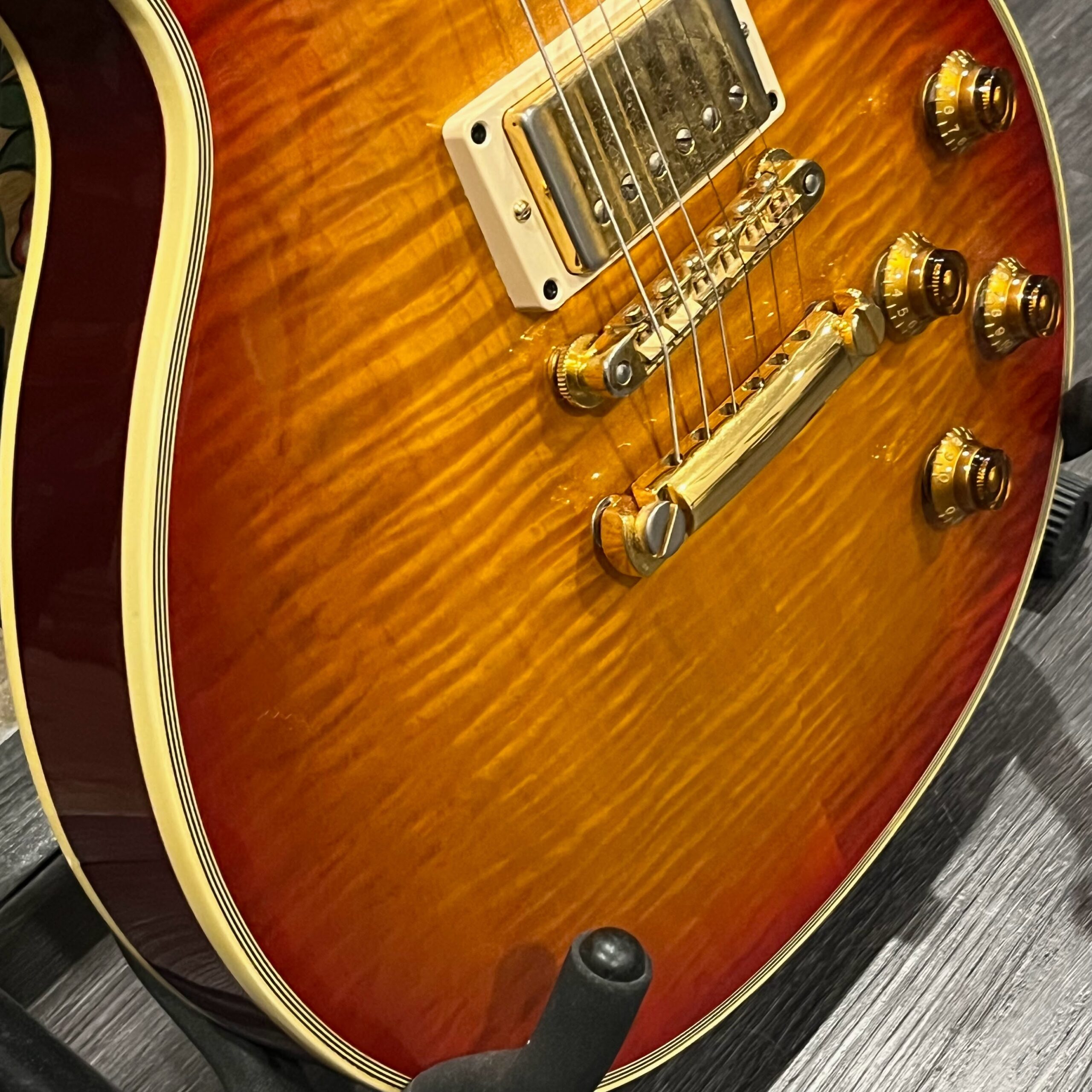 Not new or pristine, shows very light checking, lacquer sink, light impressions from play, swirls, light buckle-rash, small flaws in the binding. Presents as excellent, beautiful instrument with light playwear, no repairs or damage. Gold lightly worn off the bass side tail stud, light patina on metal and plastic, bridge and off the edges of the pickups. Original nut nicely replaced with a bone one in 2006. Heavily figured top looks fantastic. See the pictures, ask for more. As always, lots more pictures of this one at my site which Reverb doesn’t want me to link to, but if you put a dotcom behind my shop name, you’d already be there.