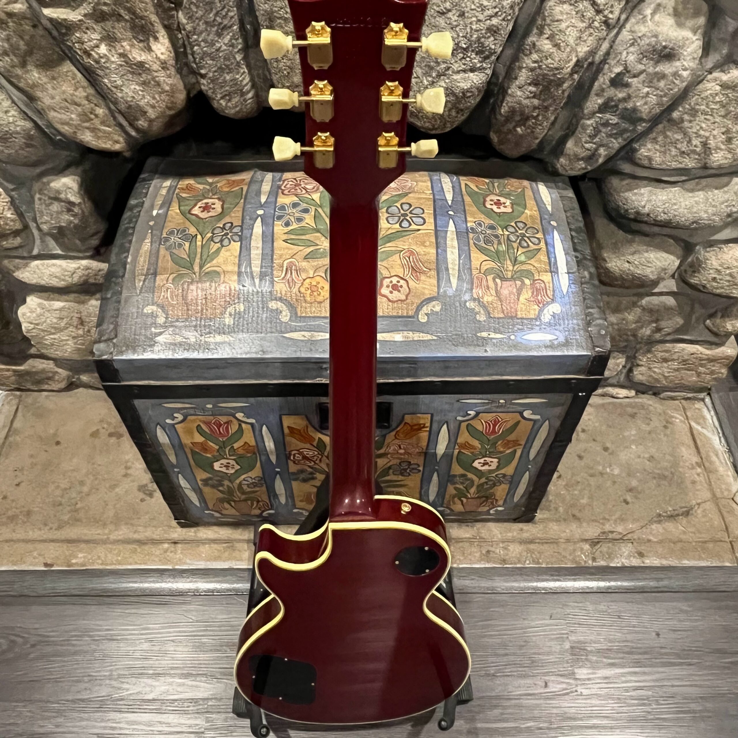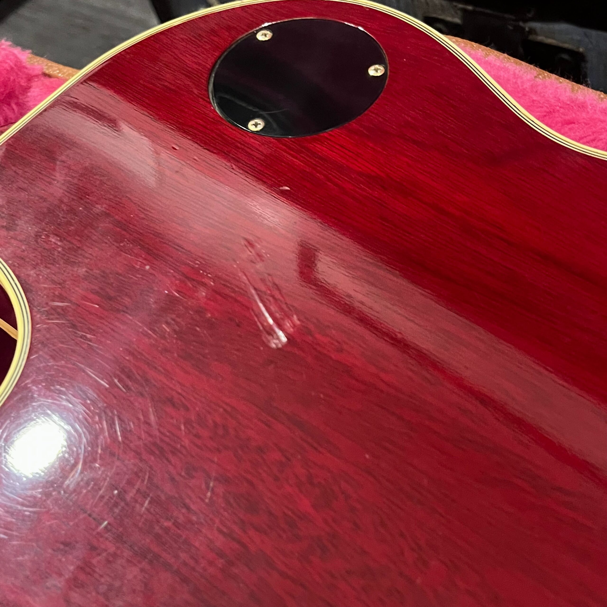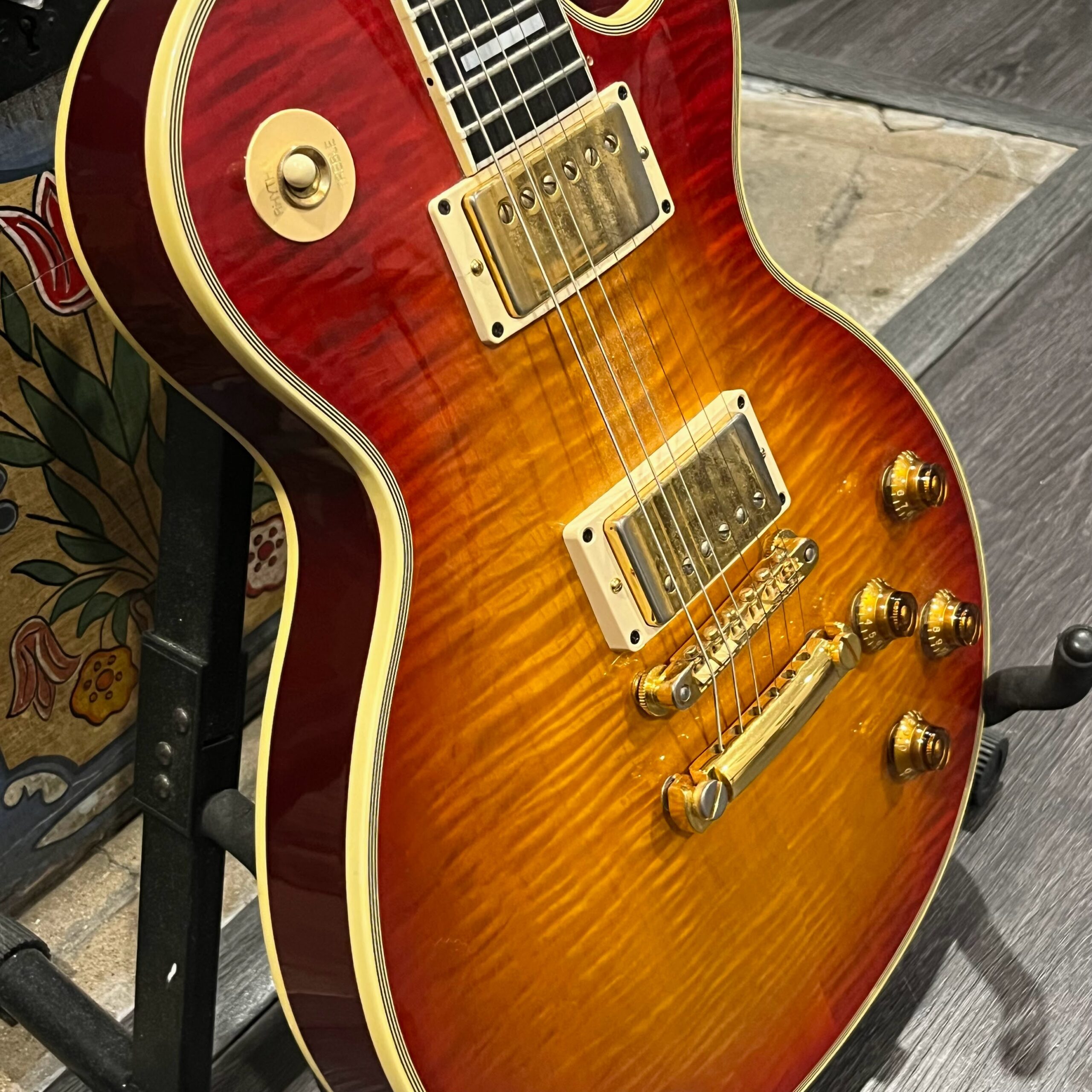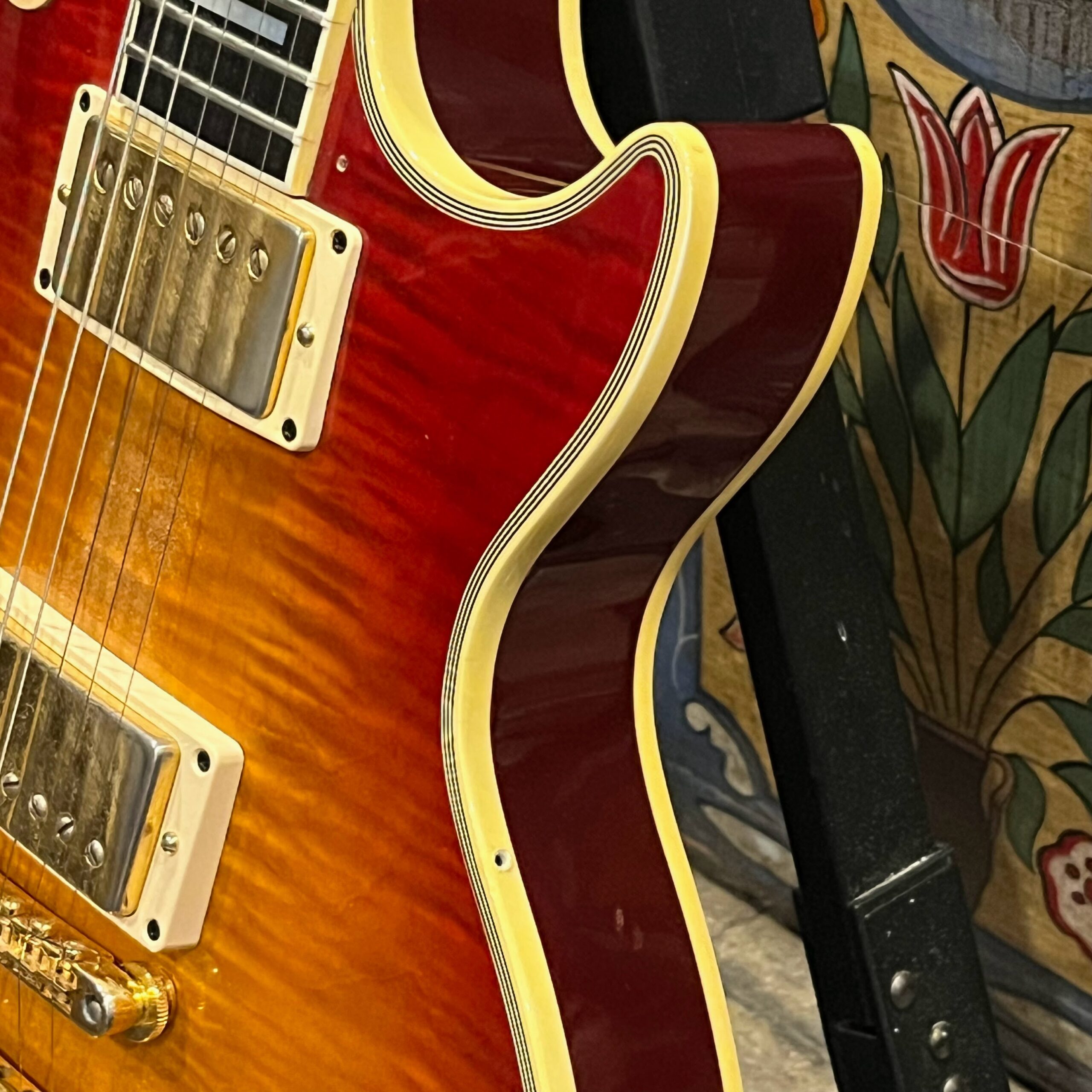 Not new or pristine, shows very light checking, lacquer sink, light impressions from play, swirls, light buckle-rash, small flaws in the binding. Presents as excellent, beautiful instrument with light playwear, no repairs or damage. Gold lightly worn off the bass side tail stud, light patina on metal and plastic, bridge and off the edges of the pickups. Original nut nicely replaced with a bone one in 2006. Heavily figured top looks fantastic. See the pictures, ask for more. As always, lots more pictures of this one at my site which Reverb doesn’t want me to link to, but if you put a dotcom behind my shop name, you’d already be there.