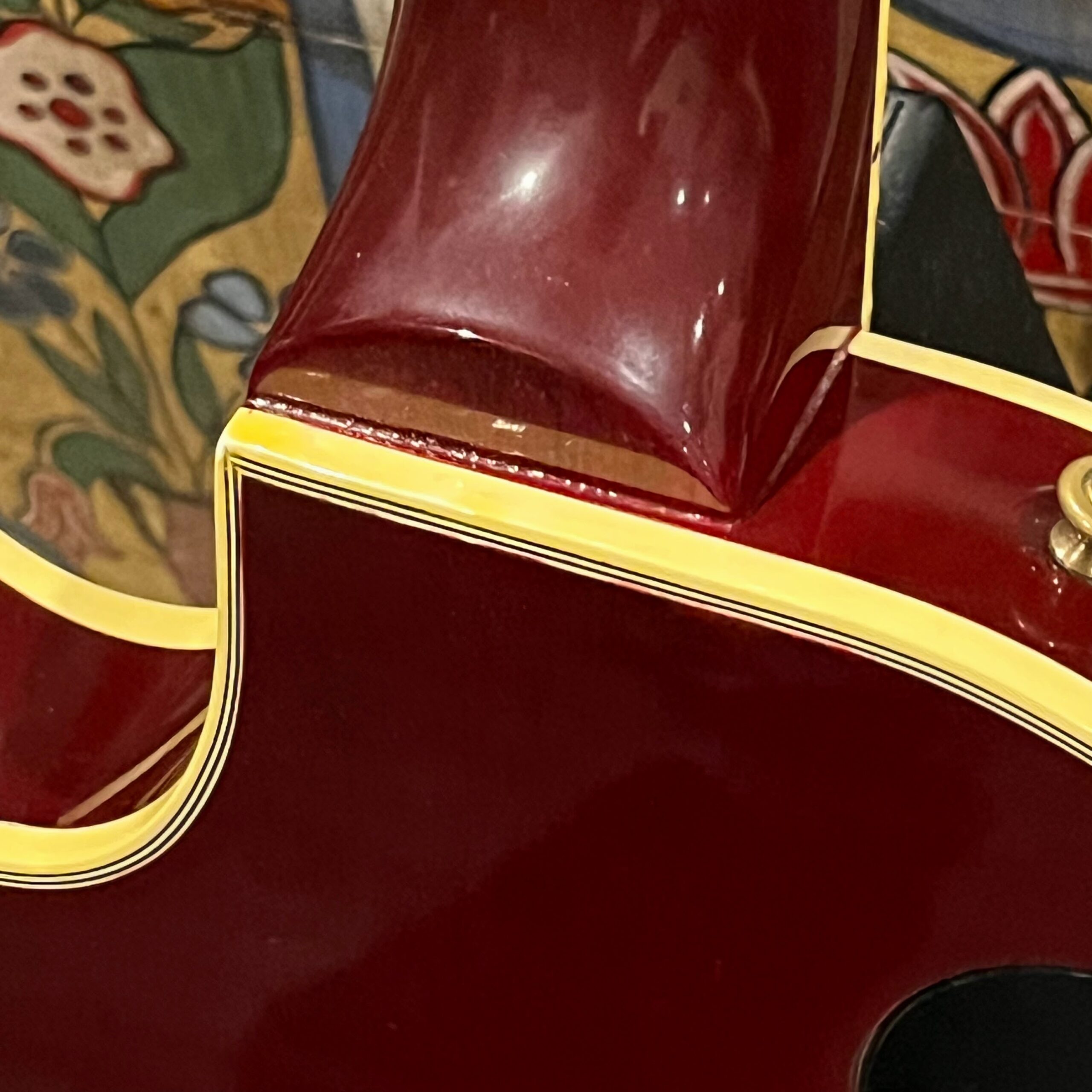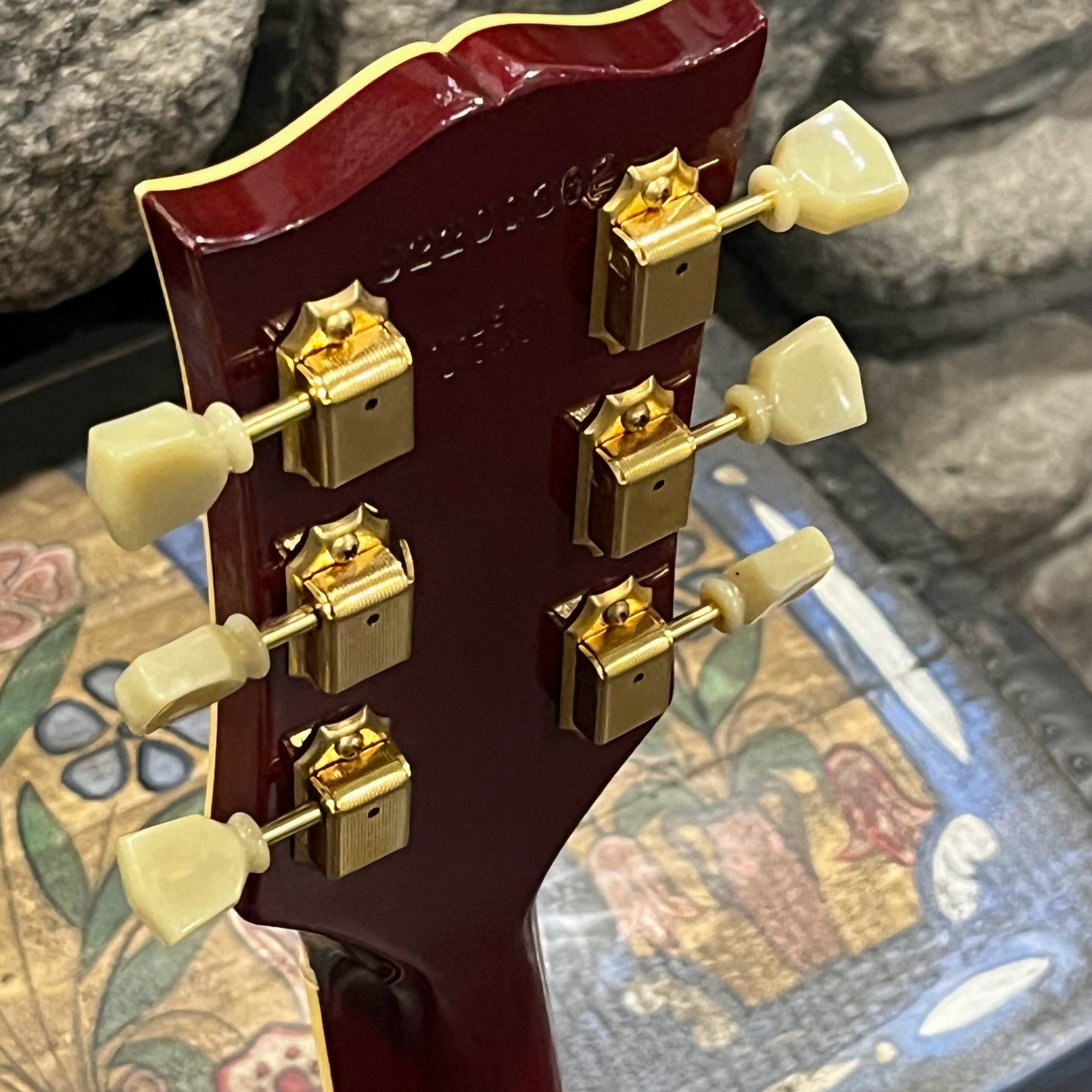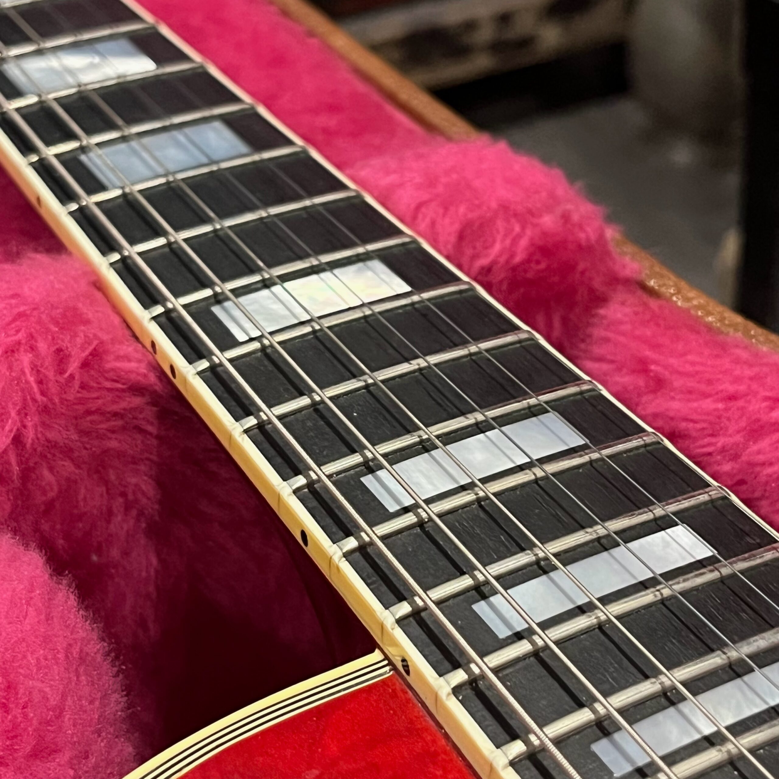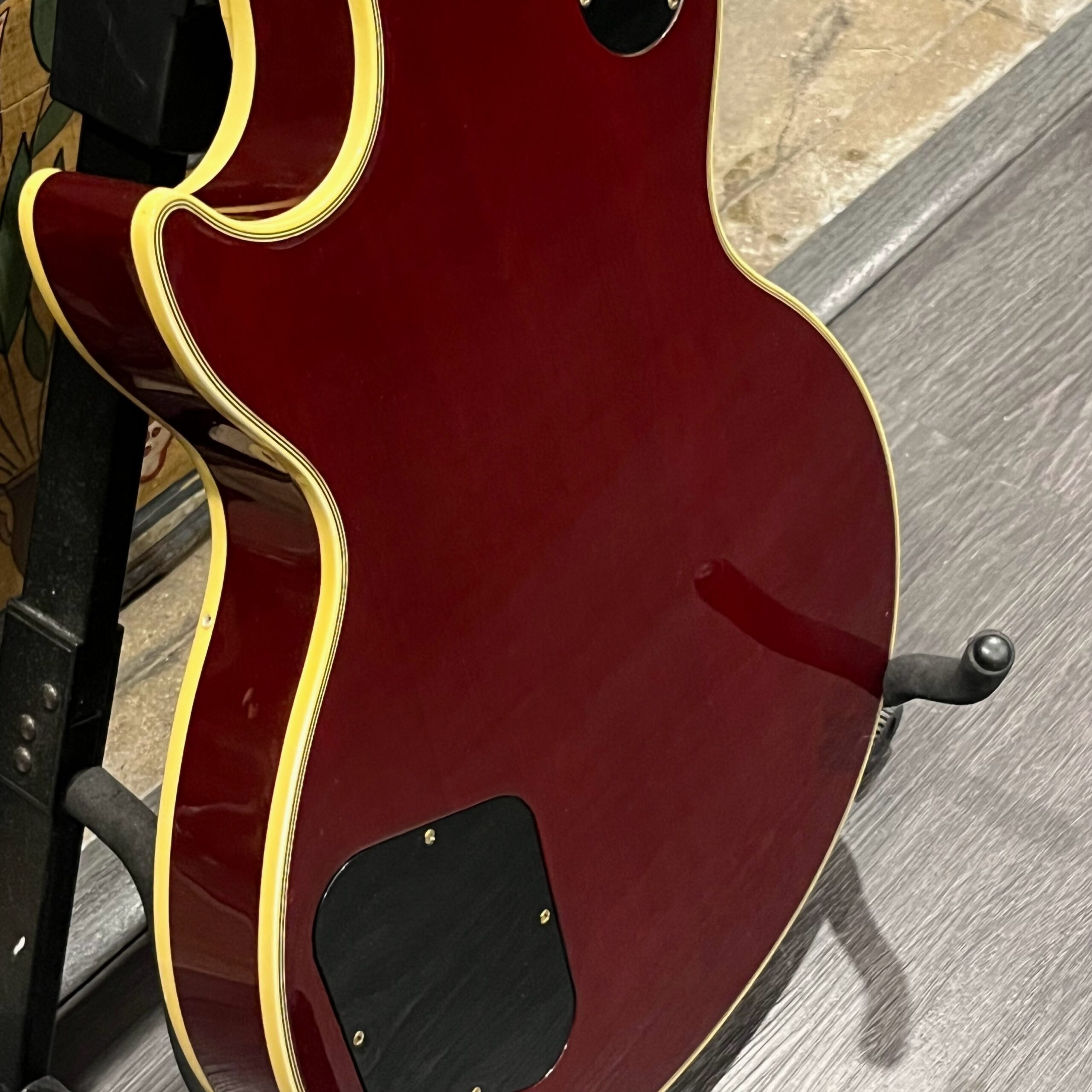 Not new or pristine, shows very light checking, lacquer sink, light impressions from play, swirls, light buckle-rash, small flaws in the binding. Presents as excellent, beautiful instrument with light playwear, no repairs or damage. Gold lightly worn off the bass side tail stud, light patina on metal and plastic, bridge and off the edges of the pickups. Original nut nicely replaced with a bone one in 2006. Heavily figured top looks fantastic. See the pictures, ask for more. As always, lots more pictures of this one at my site which Reverb doesn’t want me to link to, but if you put a dotcom behind my shop name, you’d already be there.
