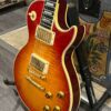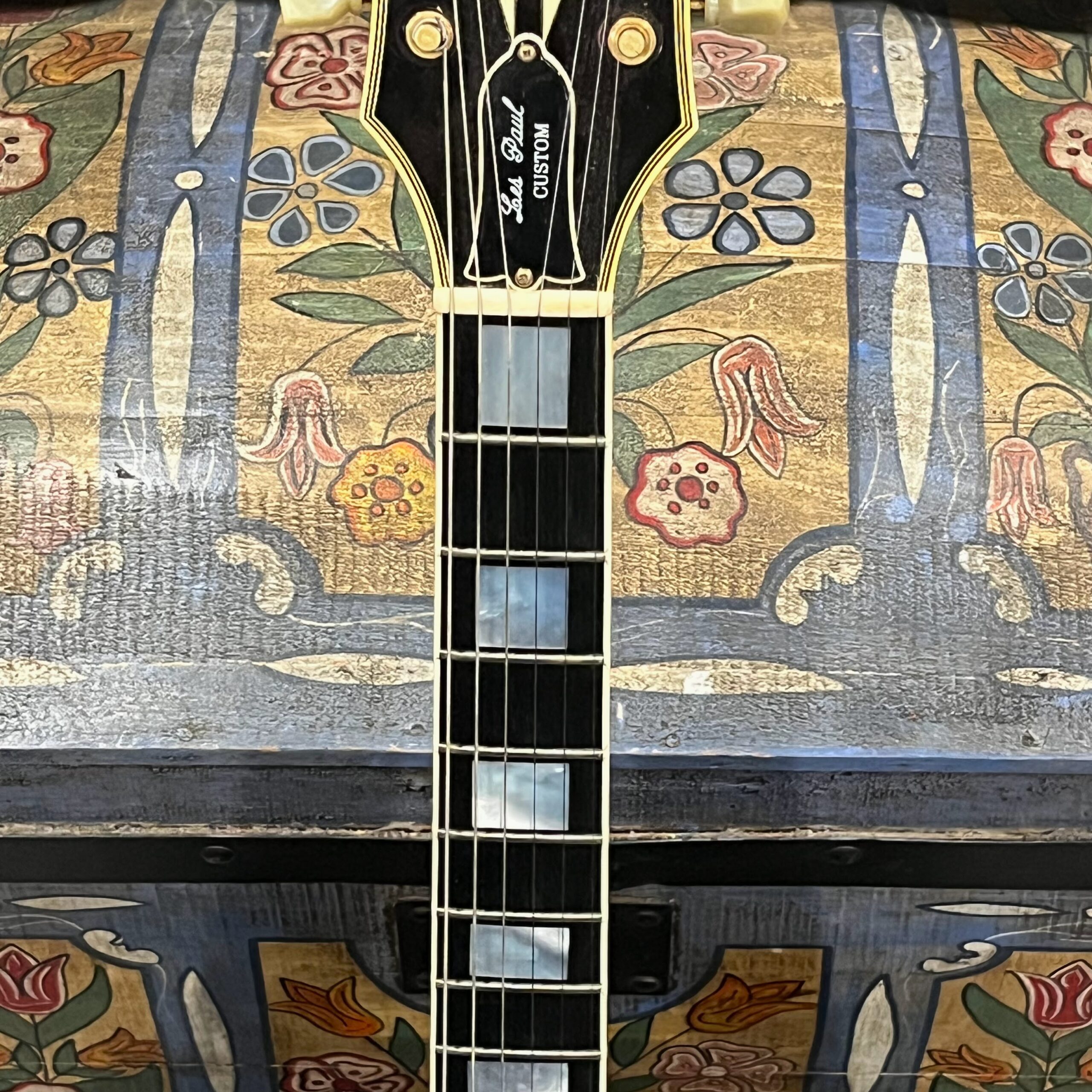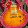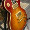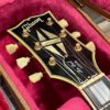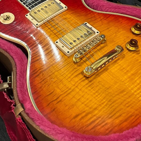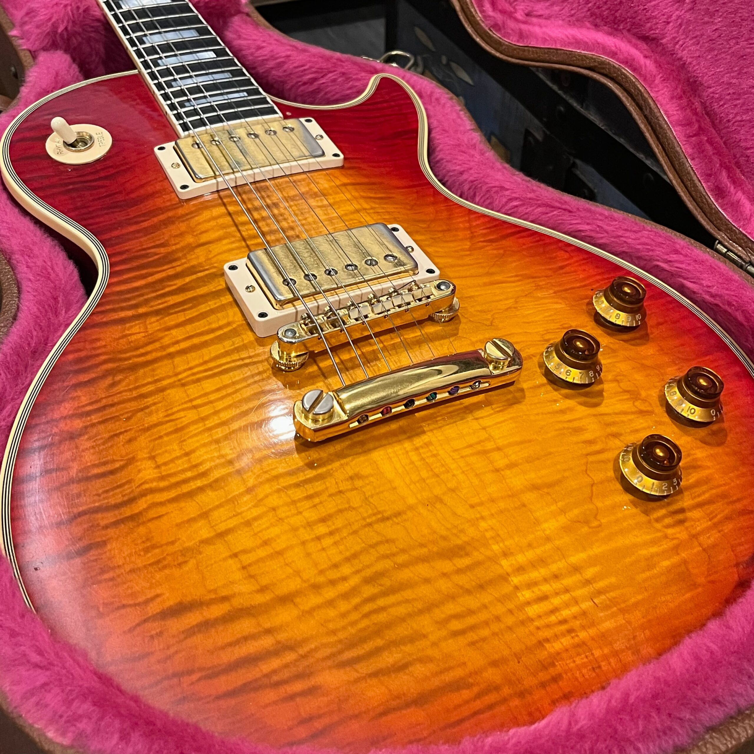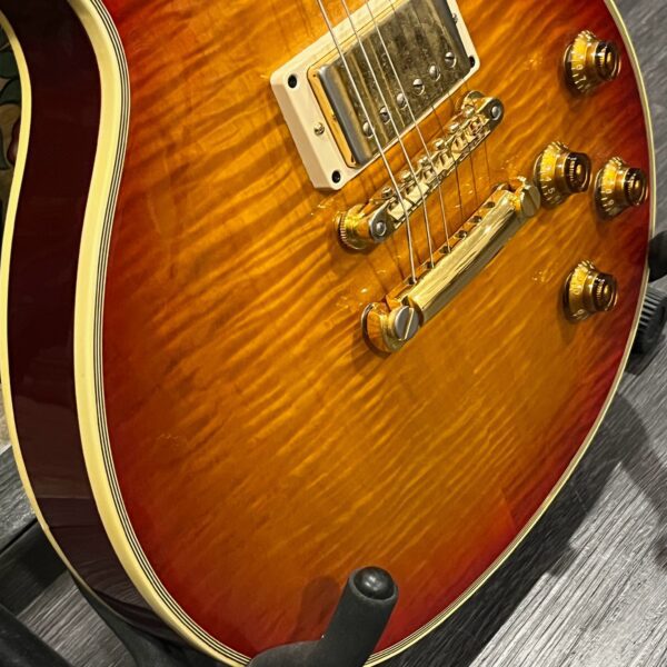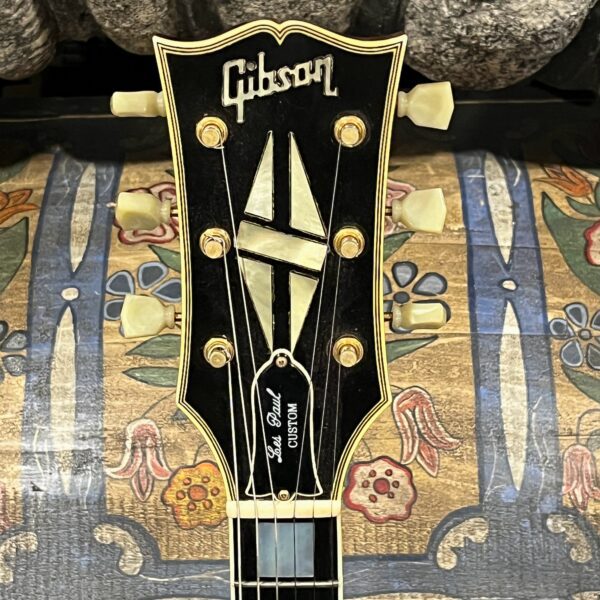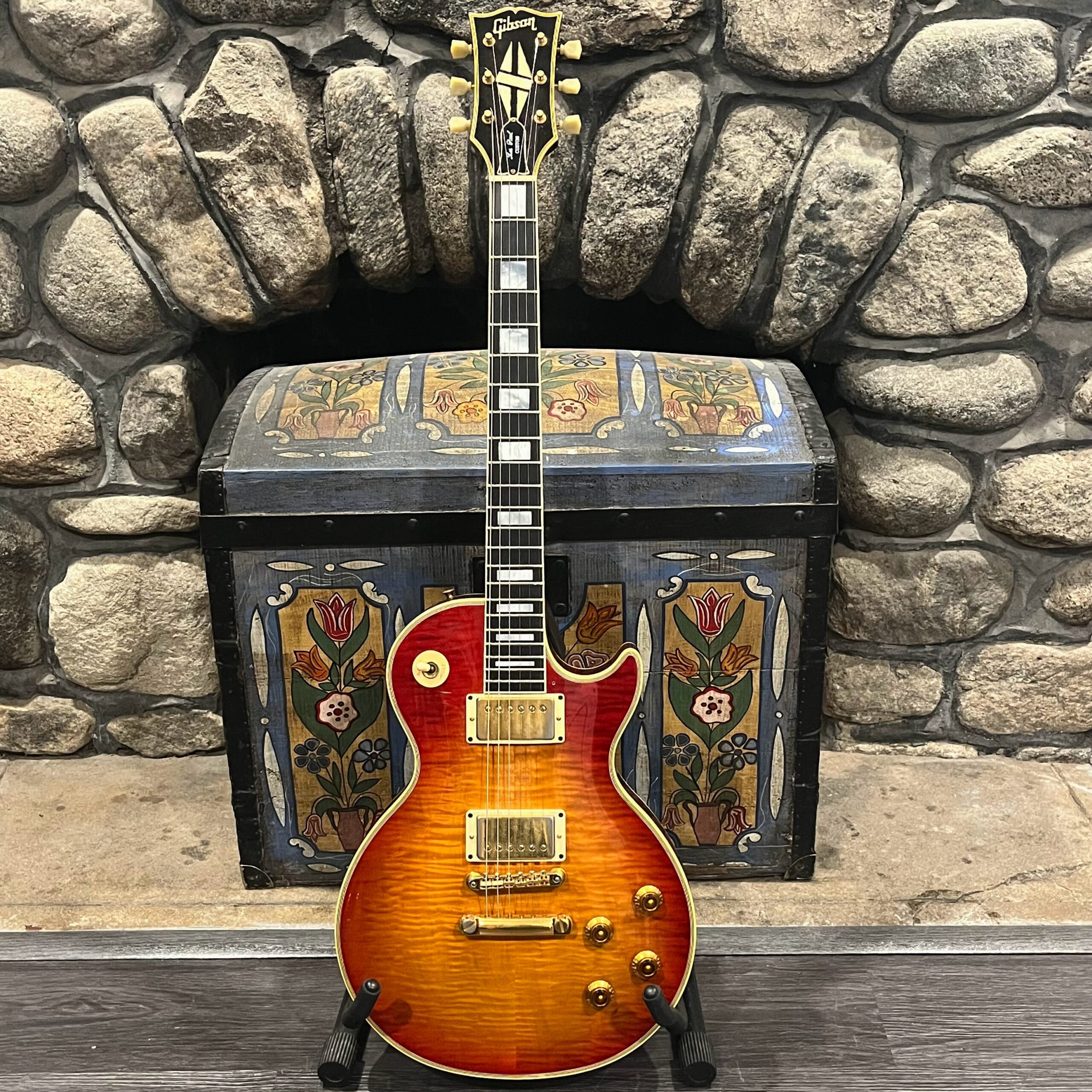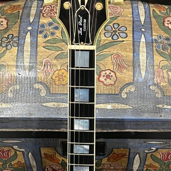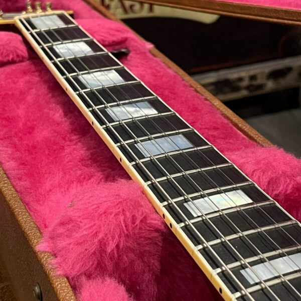 Check out this turkey – a rare Gibson Custom from 1990, before the Custom Shop proper kicked off, a Pre-Historic with a heavily flamed top and a regular serial number dating to August 8th of that year. Beautiful 2 piece heavily figured, almost tiger-striped top book-matched with 57 Classic pickups with an ebony board and wide flat frets and block Mother of Pearl inlays. Binding everywhere and rare cream plastics, all original. The guitar is not wearing the pickguard which shows as little wear as the rest of the instrument but is included with original mounting hardware. Original wiring, metal shielding plate still in place, truss rod has full adjustment still. The guitar is as it appears, a very rare and beautiful pre-Custom Shop Cherry Sunburst Les Paul Custom with a fantastic top, in excellent condition. Comes in a period correct Gibson factory hardcase with satin shroud, and the pickguard and original gold mounting hardware to fit. Weighs an un-weight-relieved 9lb and 6oz, setup on 10s. Pickups read 8k & 8.3k on neck and bridge.