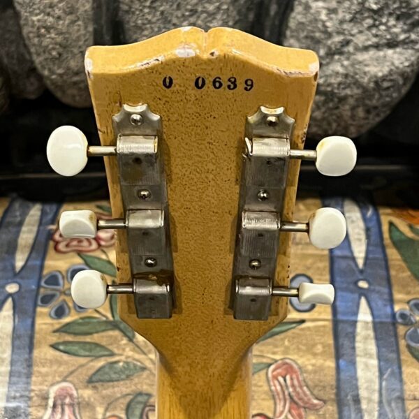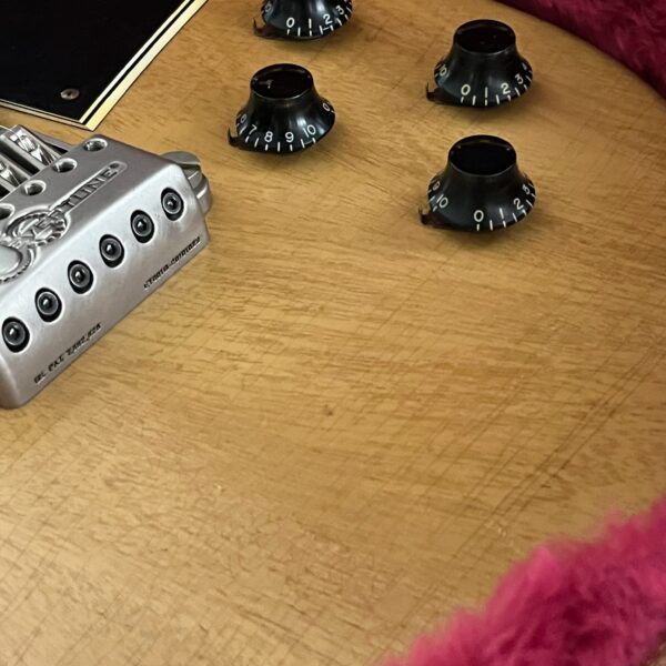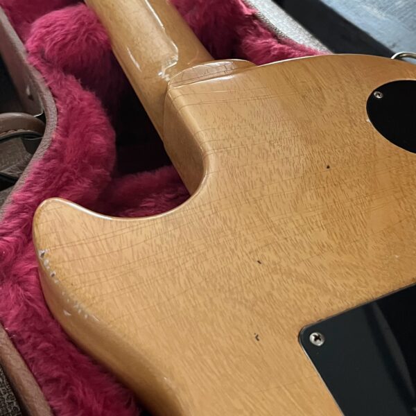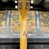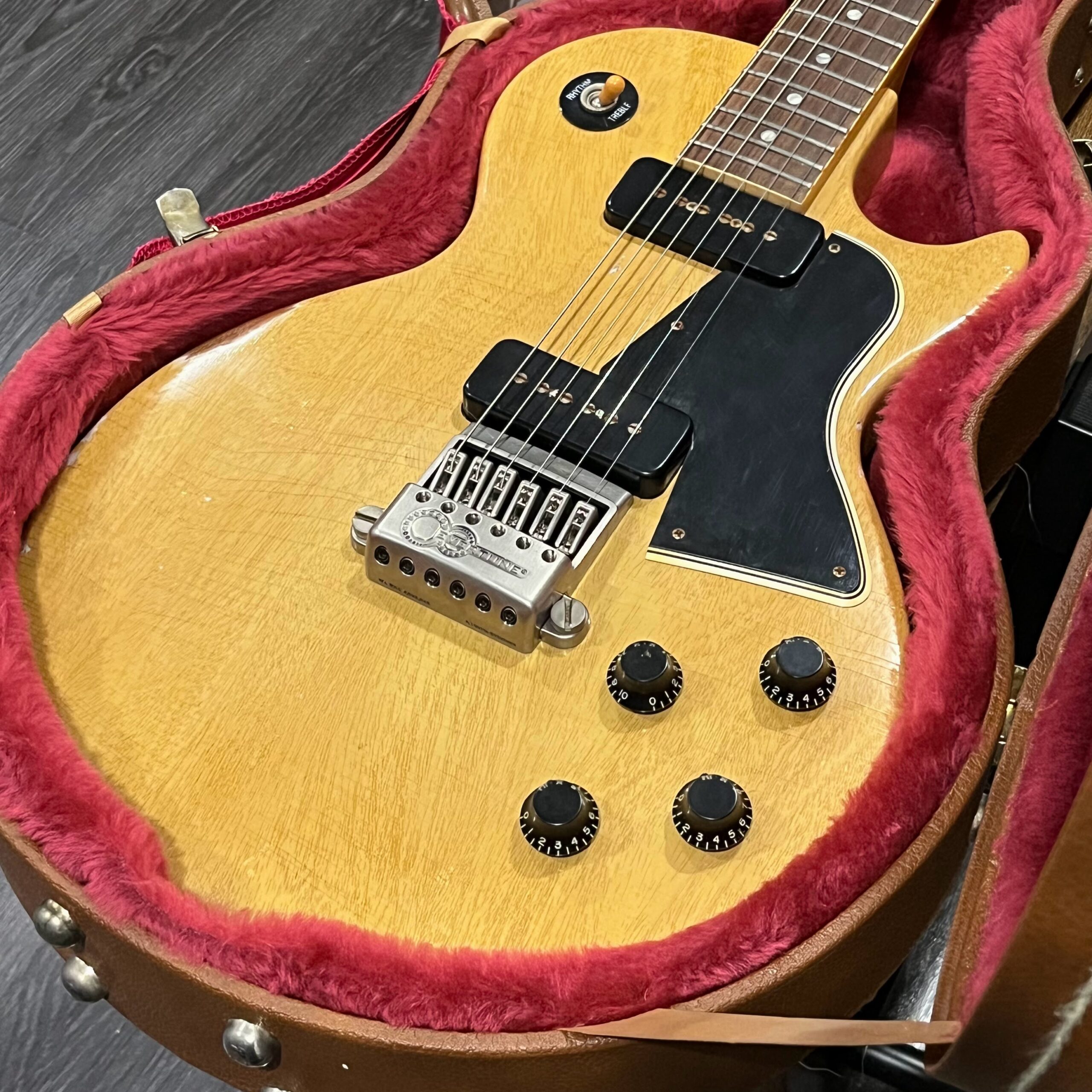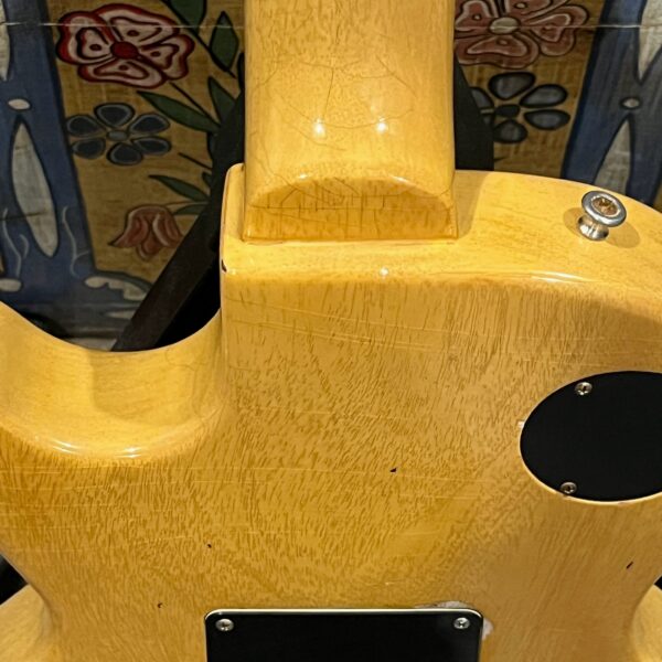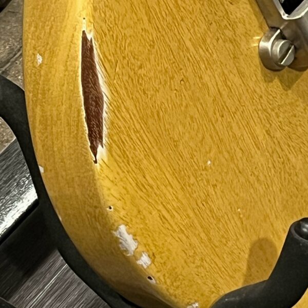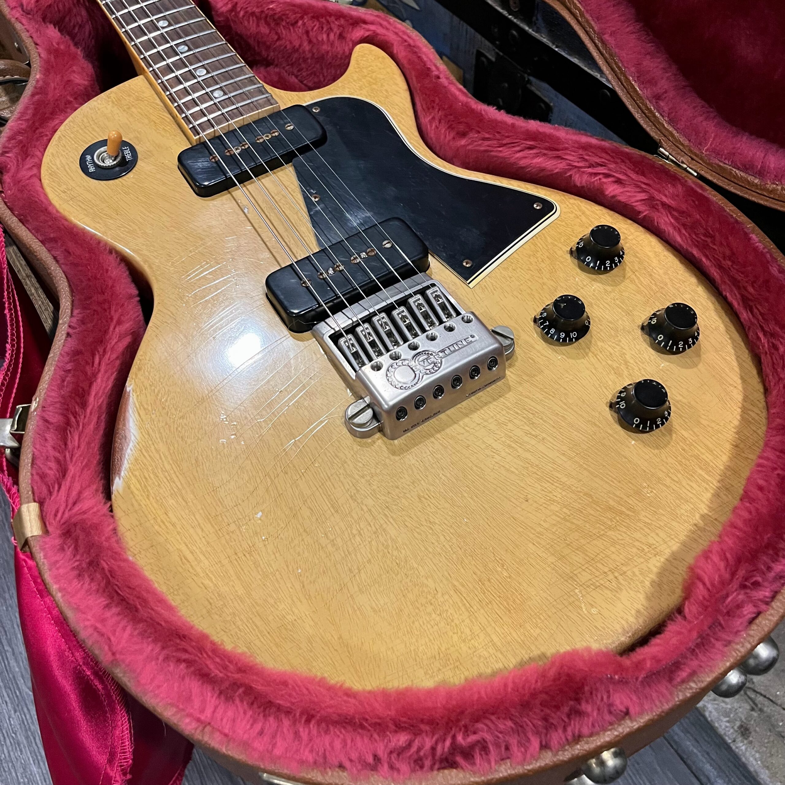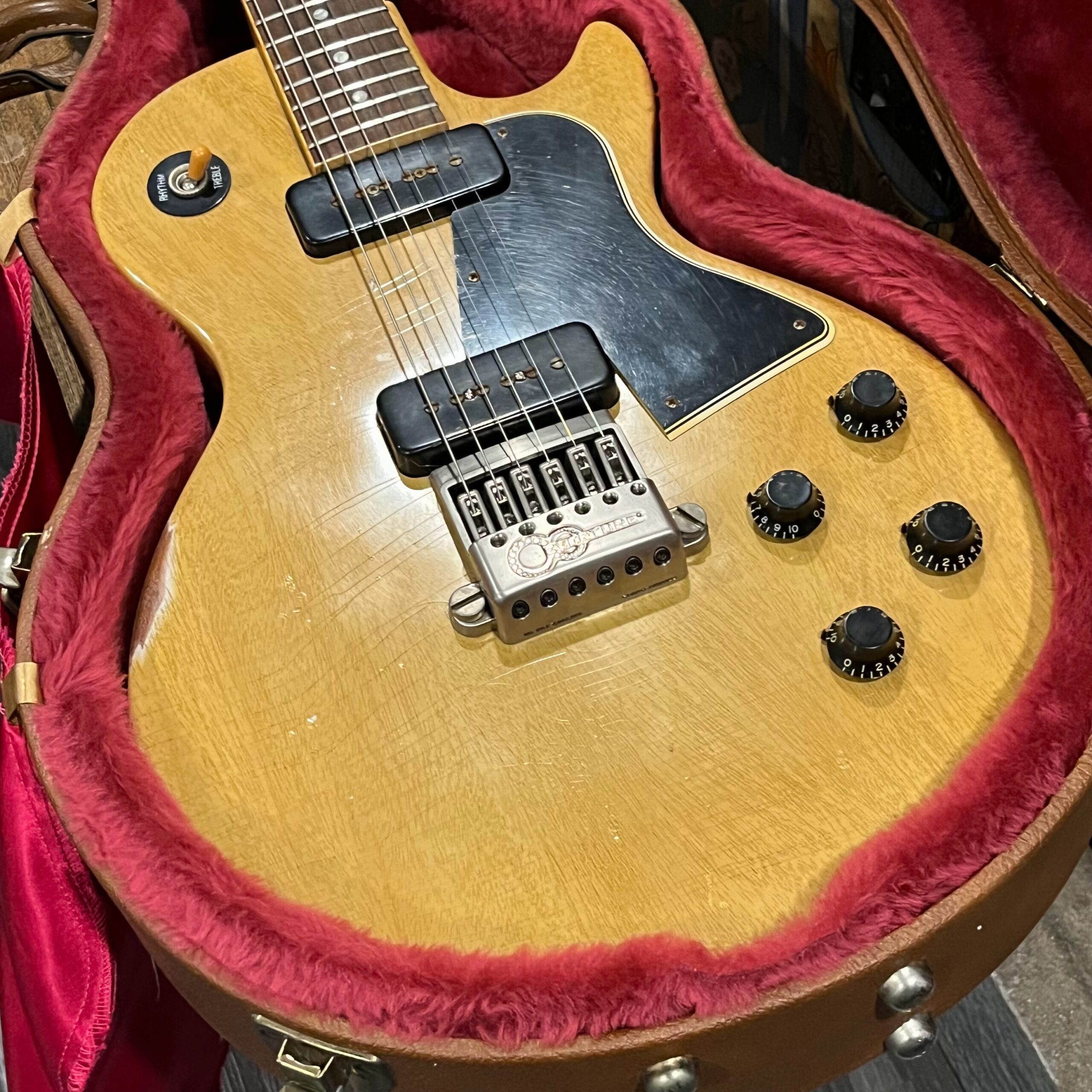 Il Monstro – the Monster; a fitting name perhaps for this monstrosity – who could do such a thing? What it essentially is a heavy relic Les Paul Special in R0 flavor in heavily relic’d TV yellow of the muddiest, most oxidized shade, which some maniac has purchased, routed and installed an Evertune system on. R0 means a thinner neck profile, hot P90 pickups, button style vintage Kluson tuners, UFO knobs and thumb-bleeders – classic recipe. The paint is the color or mustard, everything is covered in wear and patina, checking abounds, paint is missing – it is still glorious. For the so very few. Fresh setup on 10s by the guys at Eric’s Guitars in Van Nuys, CA, who are my go-to luthiers in Los Angeles. Weighs a fairly chunky 8lb and 8oz. It looks like a strange alien weapon, very cool thing. Tuning stability is obviously excellent, pickups sound amazing, handwired with bumblebee capacitors. Comes in a vintage 90s Gibson case with satin shroud that’s seen some things but is still fit for purpose with working latches and lock.