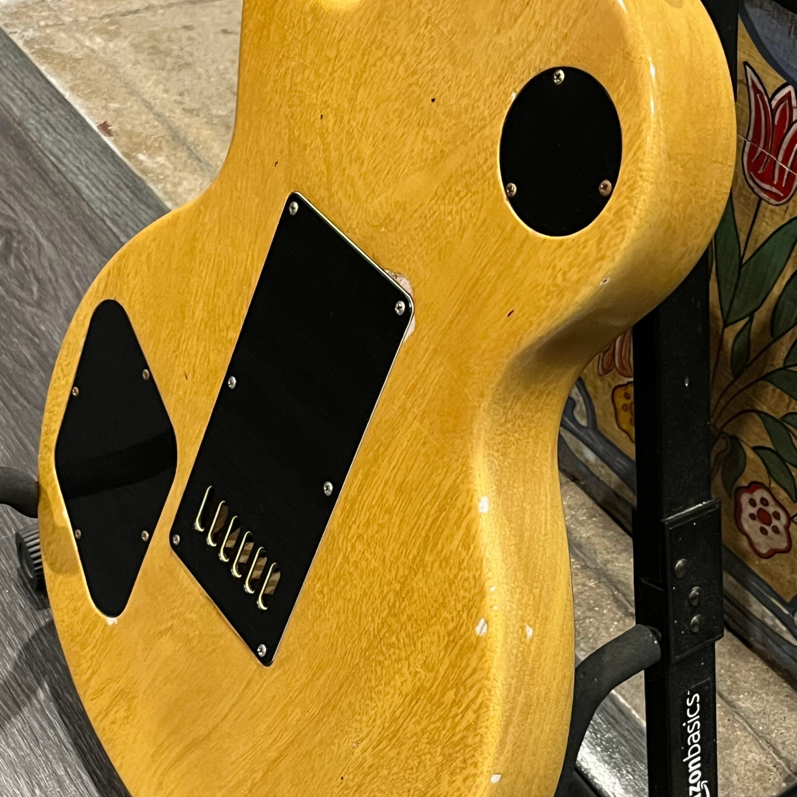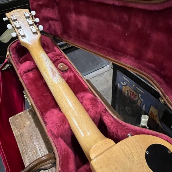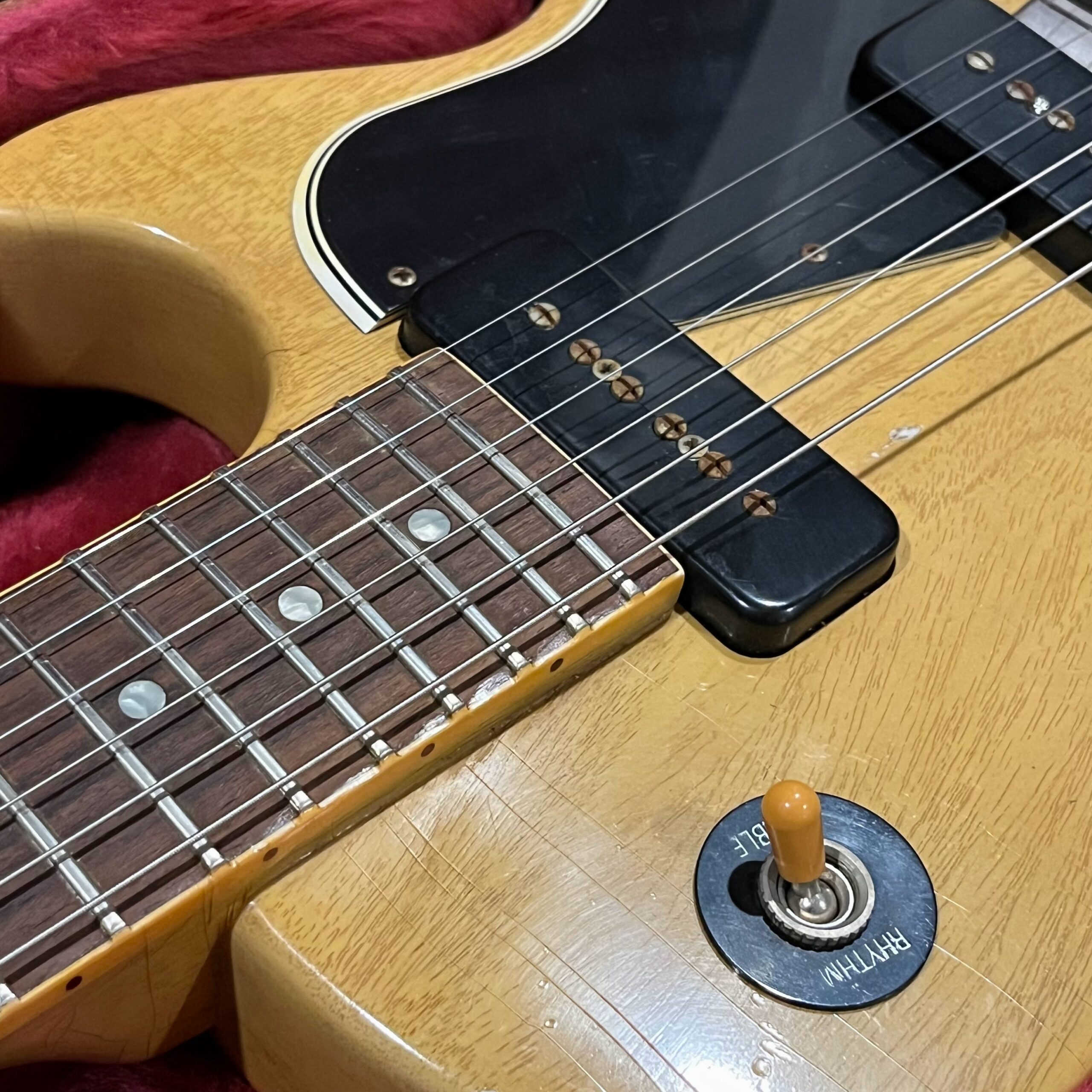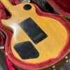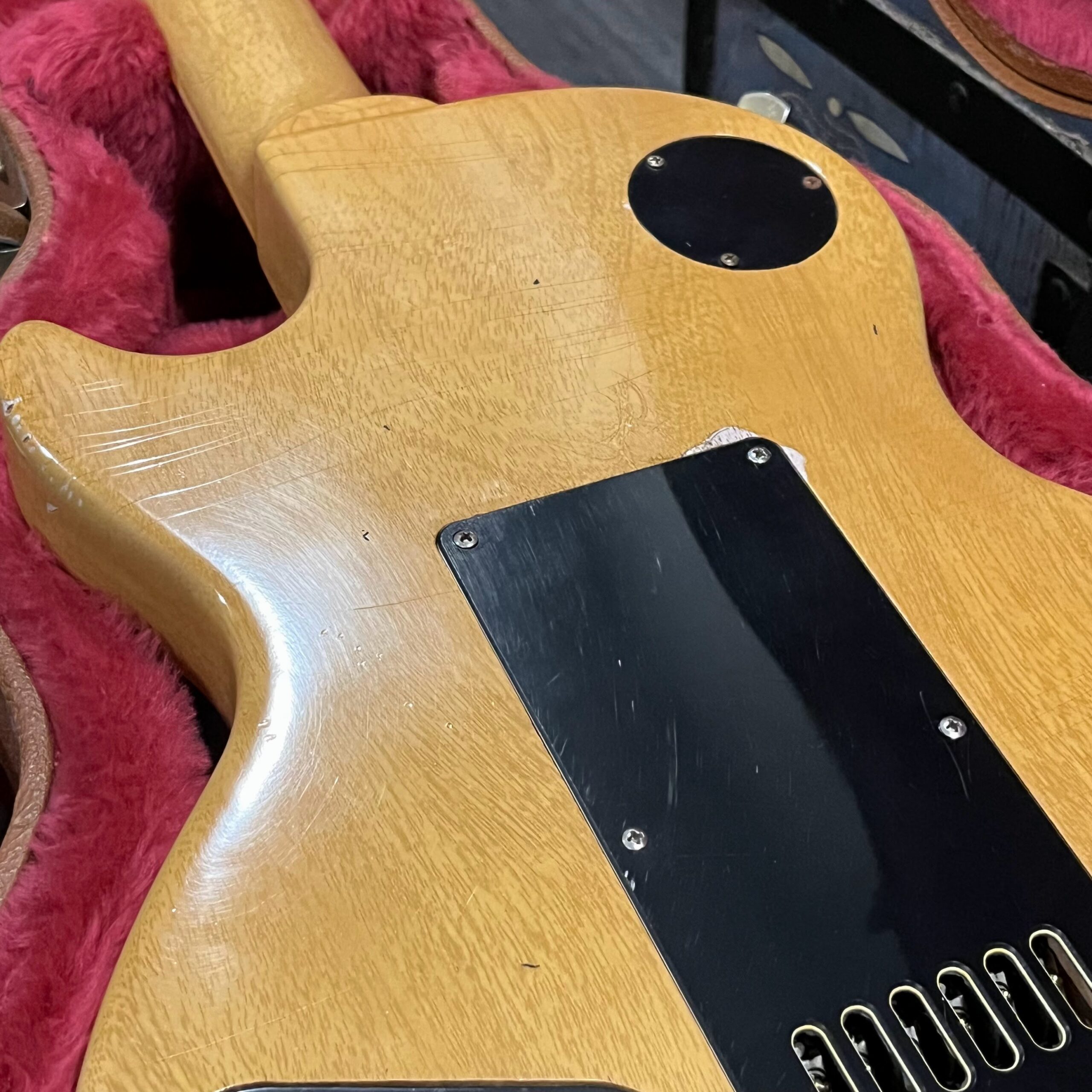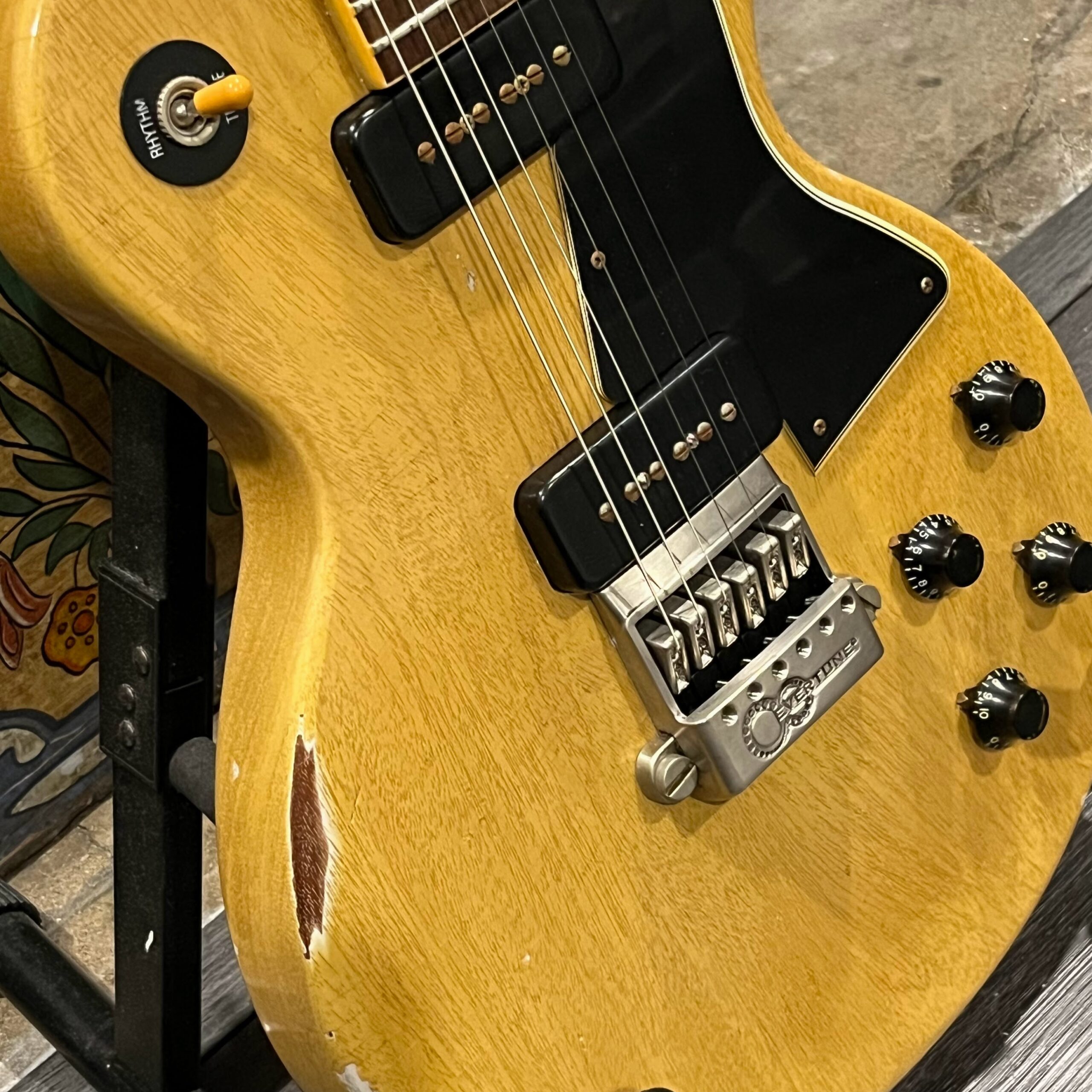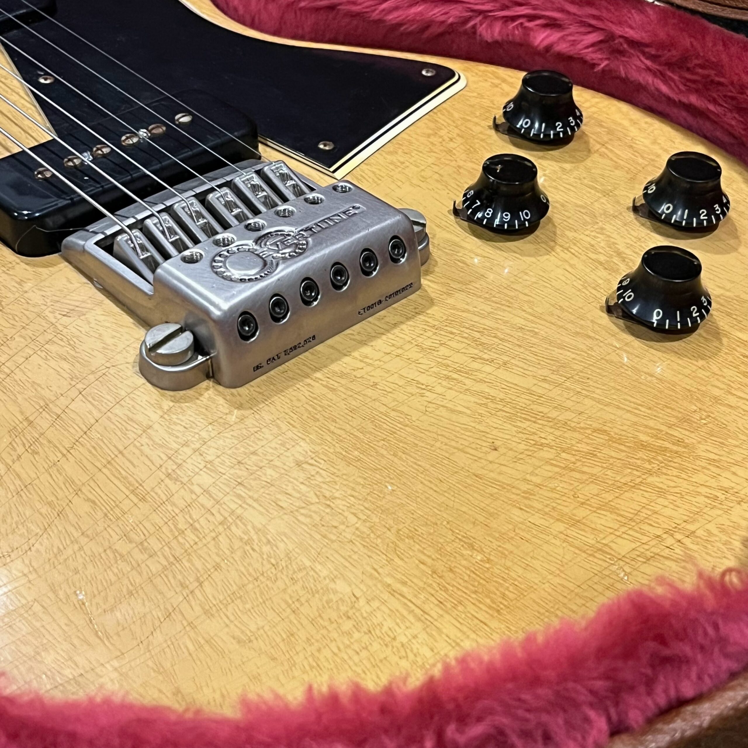 Il Monstro – the Monster; a fitting name perhaps for this monstrosity – who could do such a thing? What it essentially is a heavy relic Les Paul Special in R0 flavor in heavily relic’d TV yellow of the muddiest, most oxidized shade, which some maniac has purchased, routed and installed an Evertune system on. R0 means a thinner neck profile, hot P90 pickups, button style vintage Kluson tuners, UFO knobs and thumb-bleeders – classic recipe. The paint is the color or mustard, everything is covered in wear and patina, checking abounds, paint is missing – it is still glorious. For the so very few. Fresh setup on 10s by the guys at Eric’s Guitars in Van Nuys, CA, who are my go-to luthiers in Los Angeles. Weighs a fairly chunky 8lb and 8oz. It looks like a strange alien weapon, very cool thing. Tuning stability is obviously excellent, pickups sound amazing, handwired with bumblebee capacitors. Comes in a vintage 90s Gibson case with satin shroud that’s seen some things but is still fit for purpose with working latches and lock.
