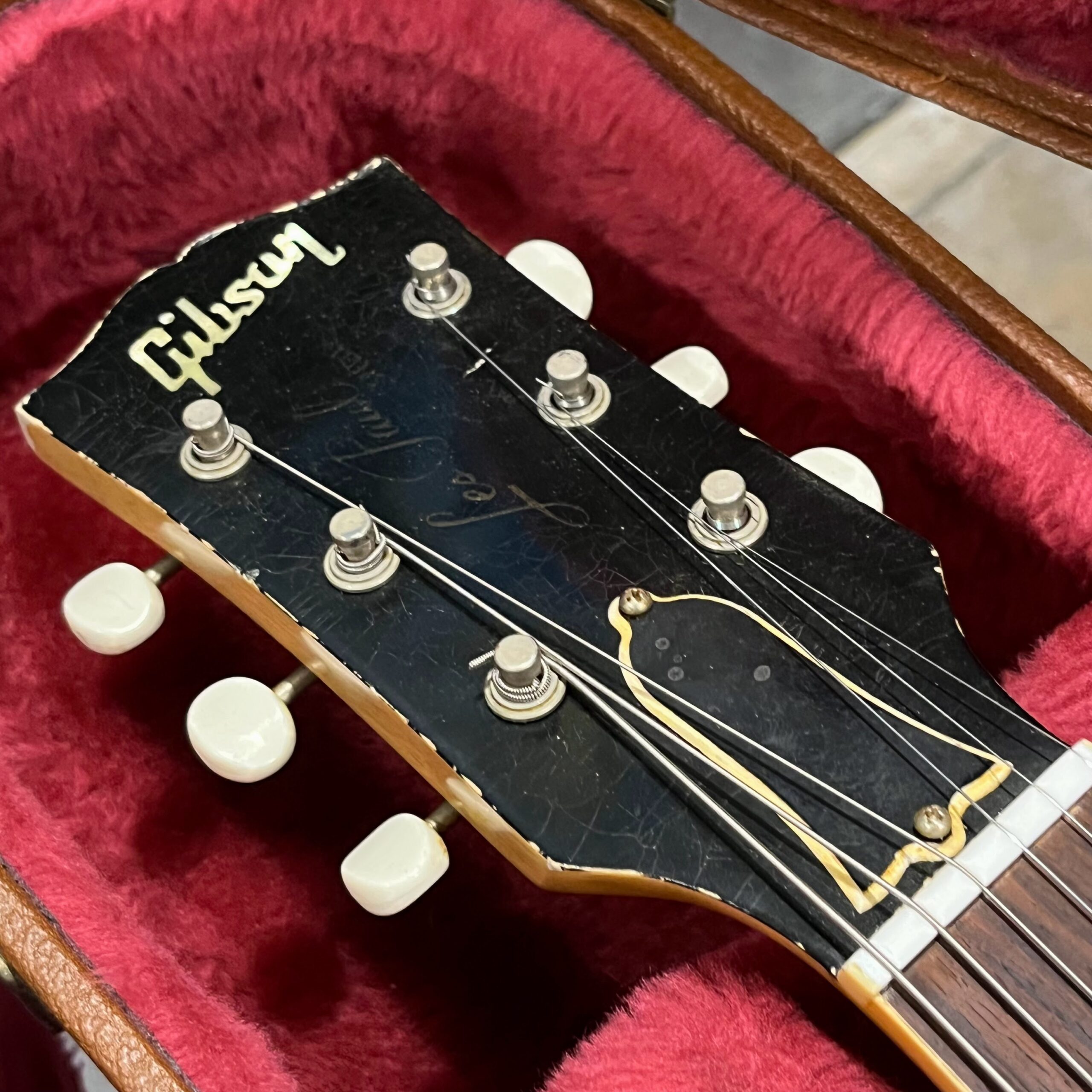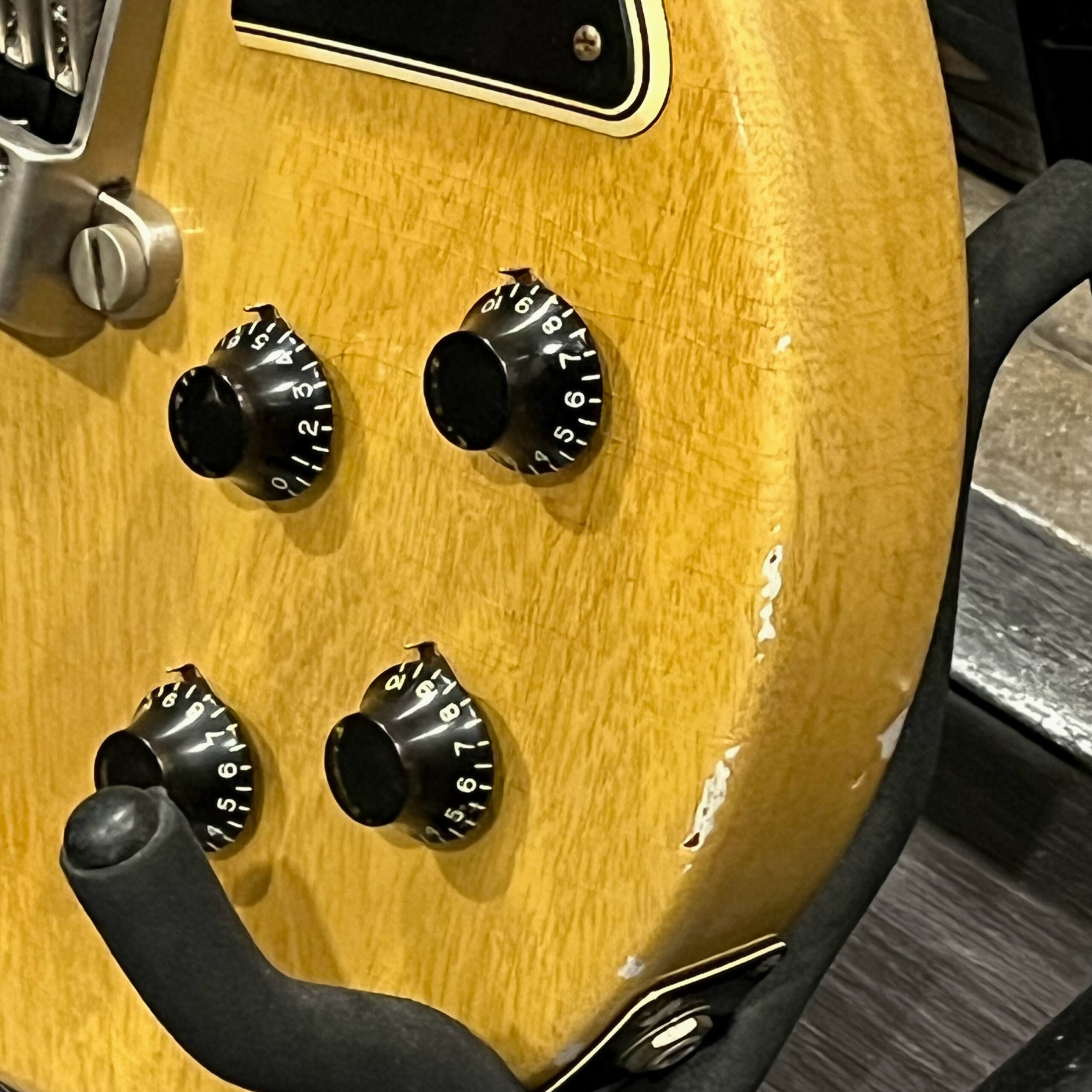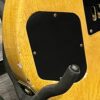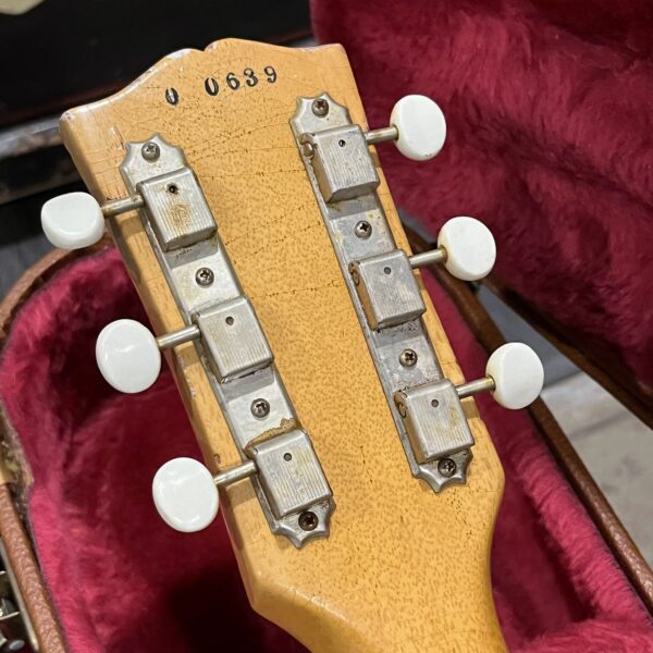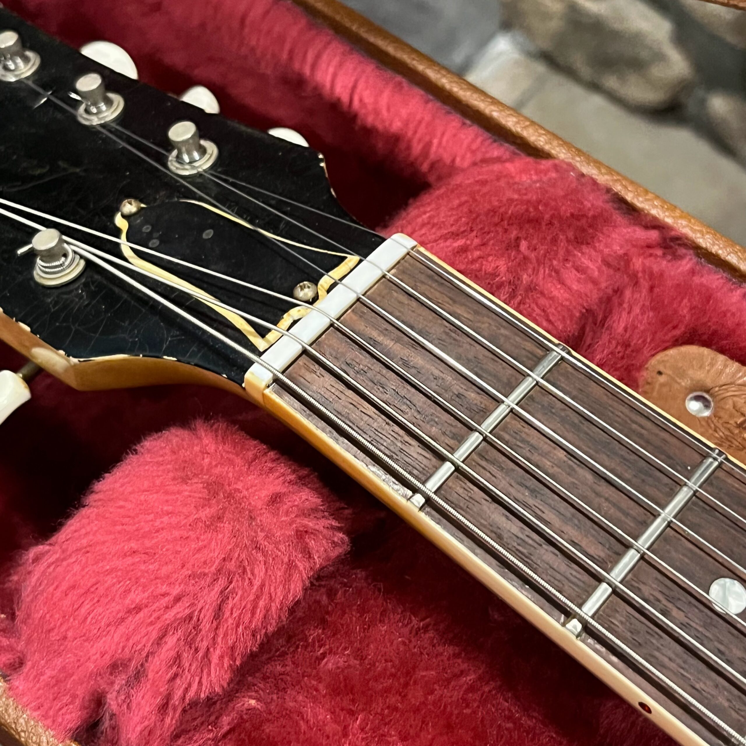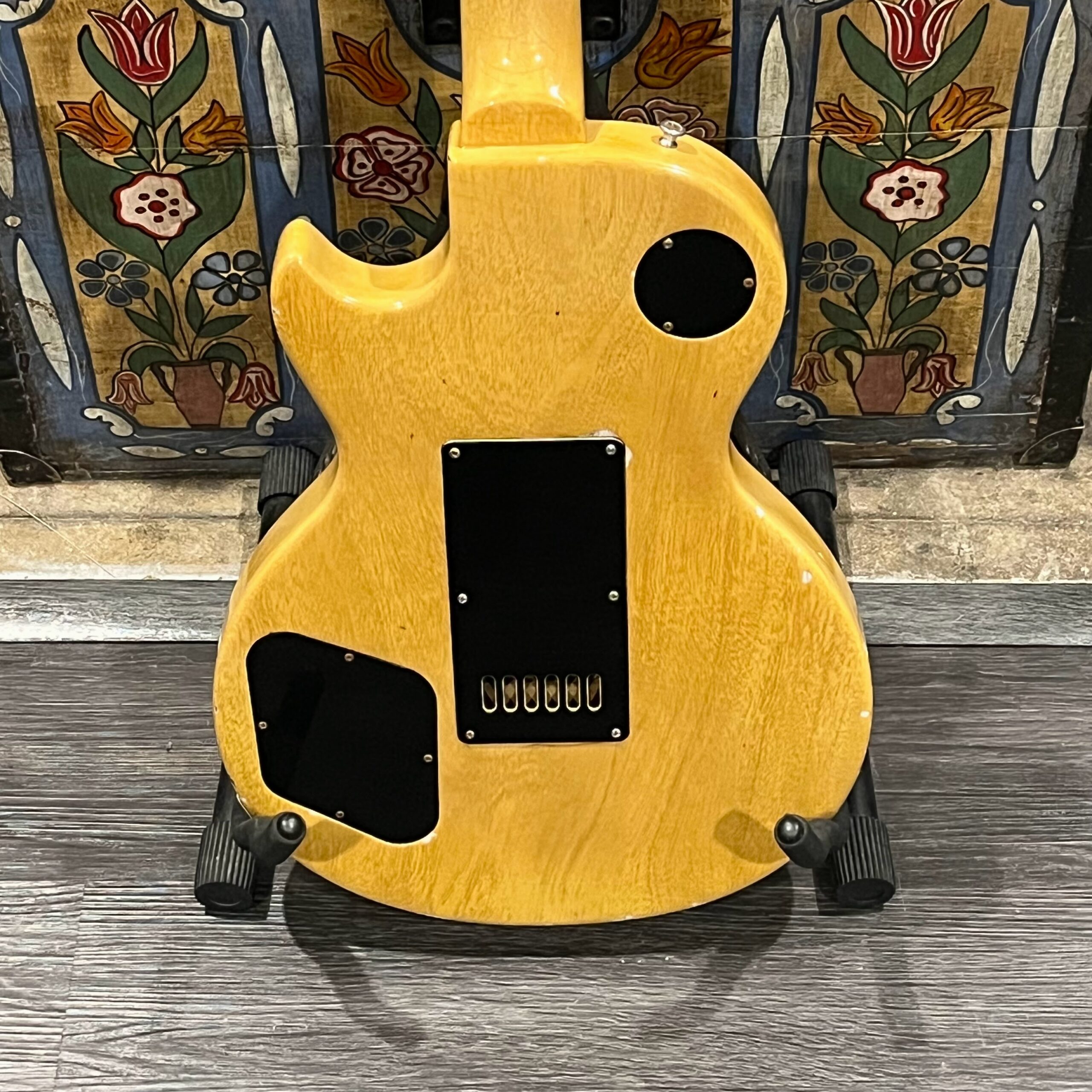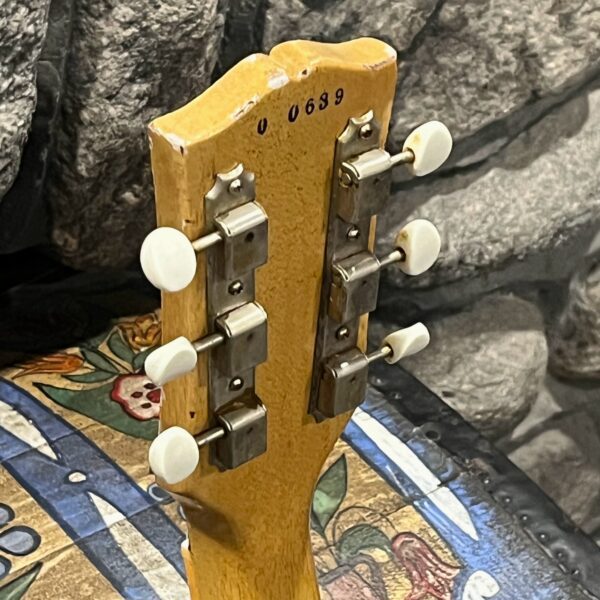 Il Monstro – the Monster; a fitting name perhaps for this monstrosity – who could do such a thing? What it essentially is a heavy relic Les Paul Special in R0 flavor in heavily relic’d TV yellow of the muddiest, most oxidized shade, which some maniac has purchased, routed and installed an Evertune system on. R0 means a thinner neck profile, hot P90 pickups, button style vintage Kluson tuners, UFO knobs and thumb-bleeders – classic recipe. The paint is the color or mustard, everything is covered in wear and patina, checking abounds, paint is missing – it is still glorious. For the so very few. Fresh setup on 10s by the guys at Eric’s Guitars in Van Nuys, CA, who are my go-to luthiers in Los Angeles. Weighs a fairly chunky 8lb and 8oz. It looks like a strange alien weapon, very cool thing. Tuning stability is obviously excellent, pickups sound amazing, handwired with bumblebee capacitors. Comes in a vintage 90s Gibson case with satin shroud that’s seen some things but is still fit for purpose with working latches and lock.