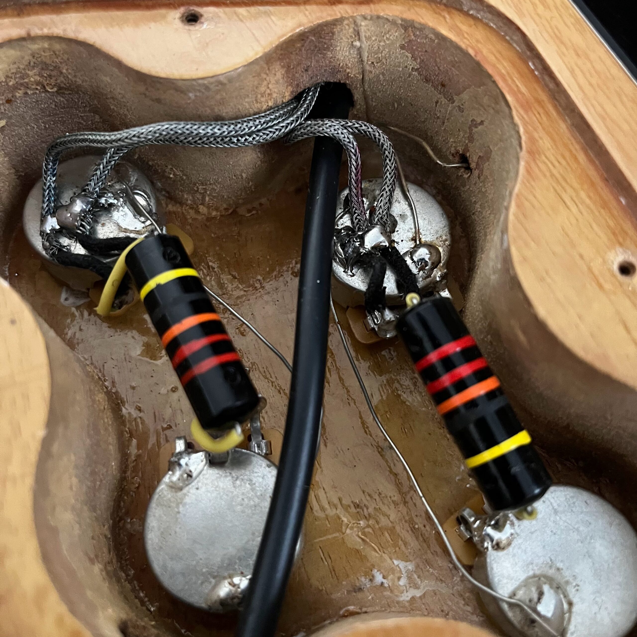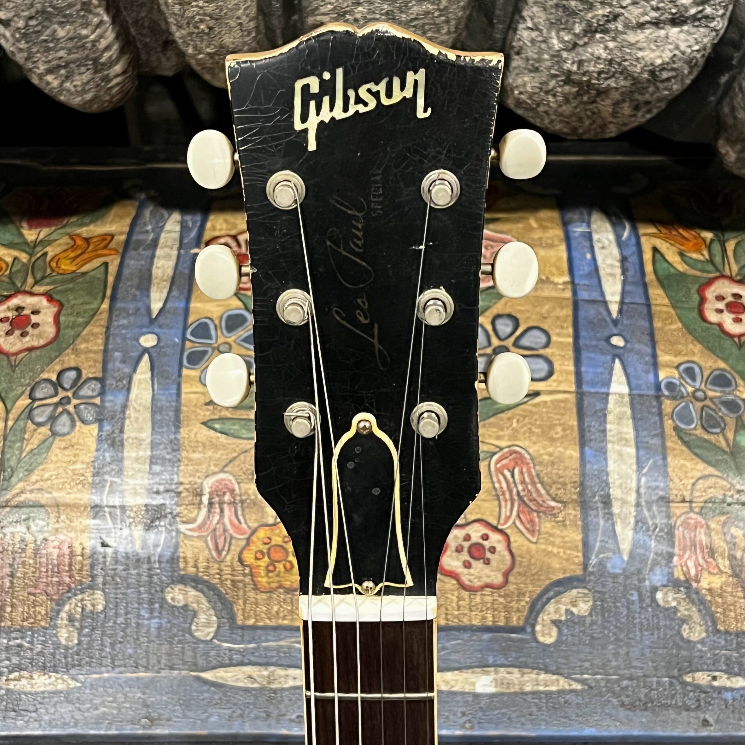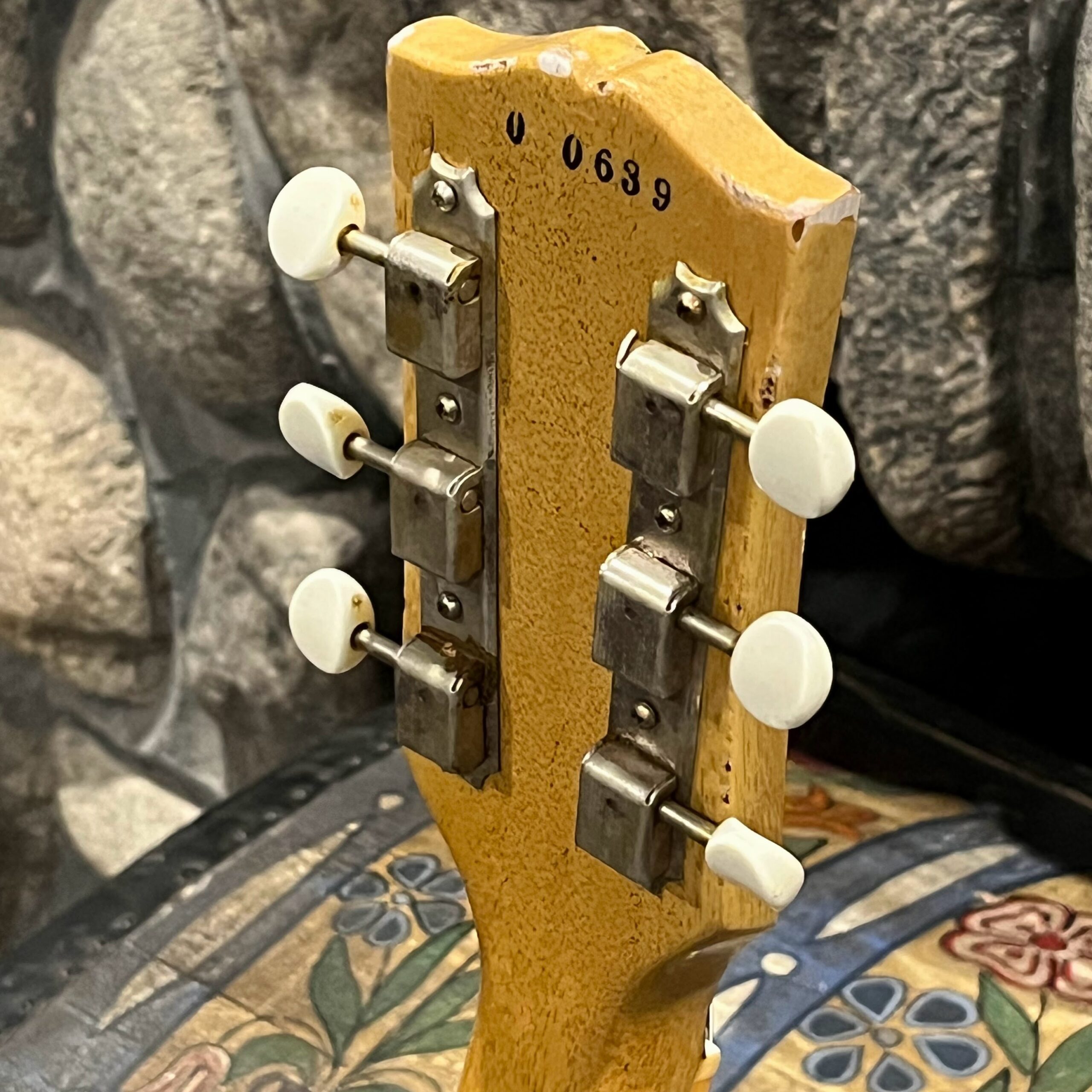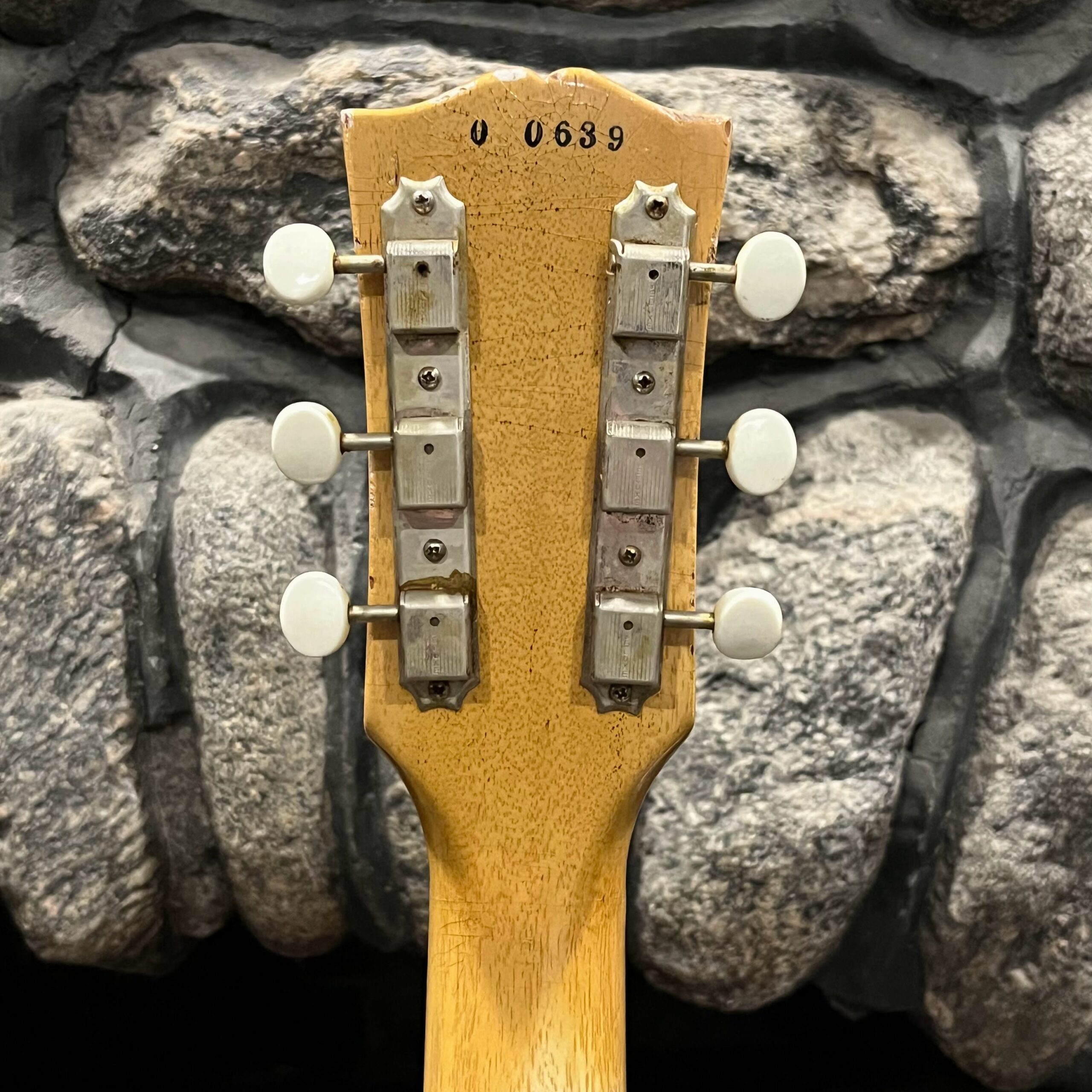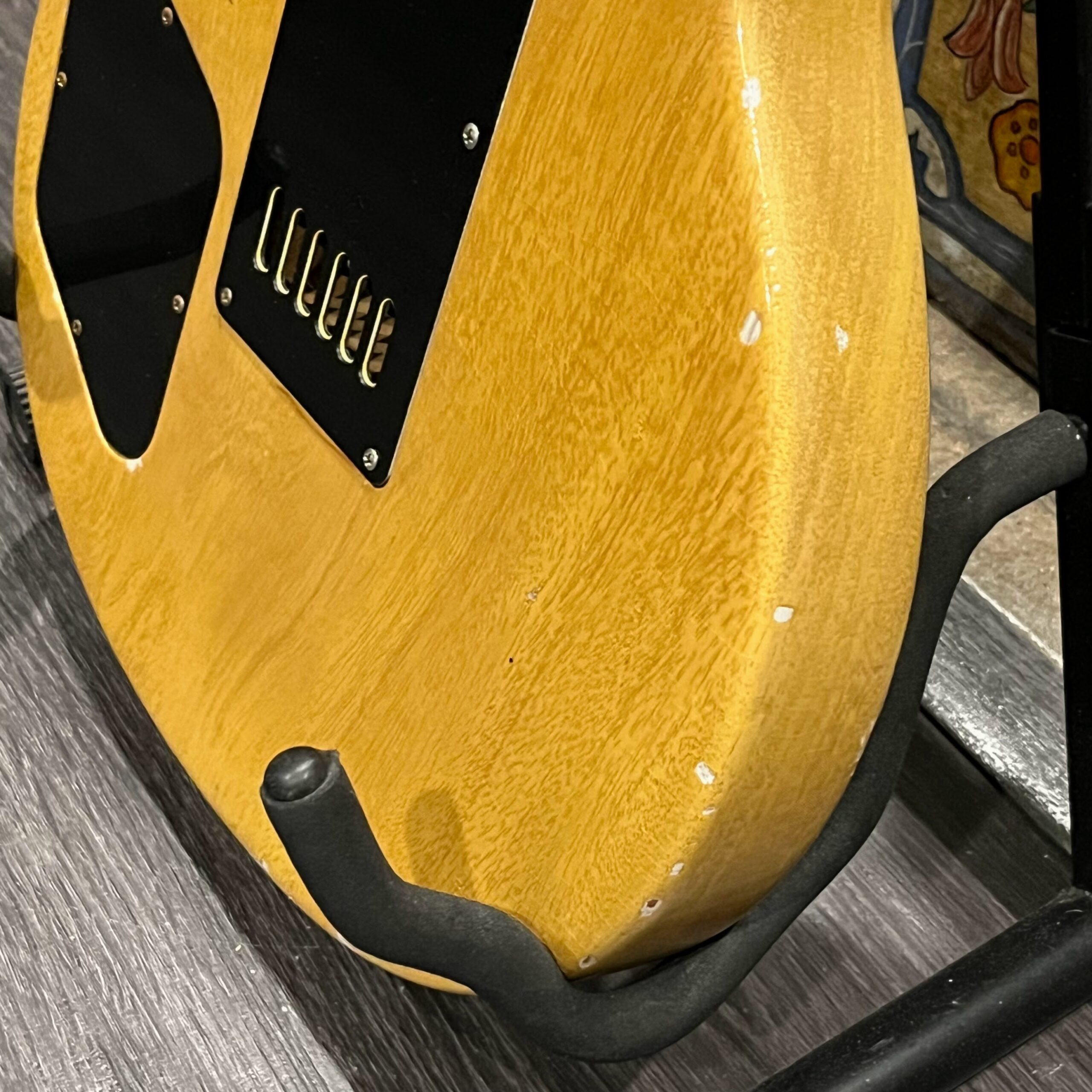 Il Monstro – the Monster; a fitting name perhaps for this monstrosity – who could do such a thing? What it essentially is a heavy relic Les Paul Special in R0 flavor in heavily relic’d TV yellow of the muddiest, most oxidized shade, which some maniac has purchased, routed and installed an Evertune system on. R0 means a thinner neck profile, hot P90 pickups, button style vintage Kluson tuners, UFO knobs and thumb-bleeders – classic recipe. The paint is the color or mustard, everything is covered in wear and patina, checking abounds, paint is missing – it is still glorious. For the so very few. Fresh setup on 10s by the guys at Eric’s Guitars in Van Nuys, CA, who are my go-to luthiers in Los Angeles. Weighs a fairly chunky 8lb and 8oz. It looks like a strange alien weapon, very cool thing. Tuning stability is obviously excellent, pickups sound amazing, handwired with bumblebee capacitors. Comes in a vintage 90s Gibson case with satin shroud that’s seen some things but is still fit for purpose with working latches and lock.