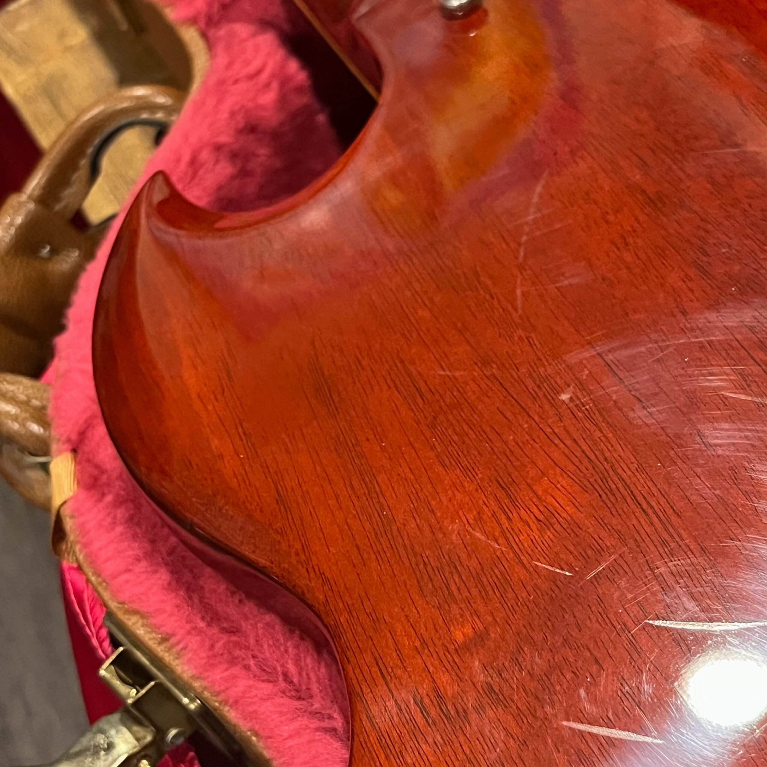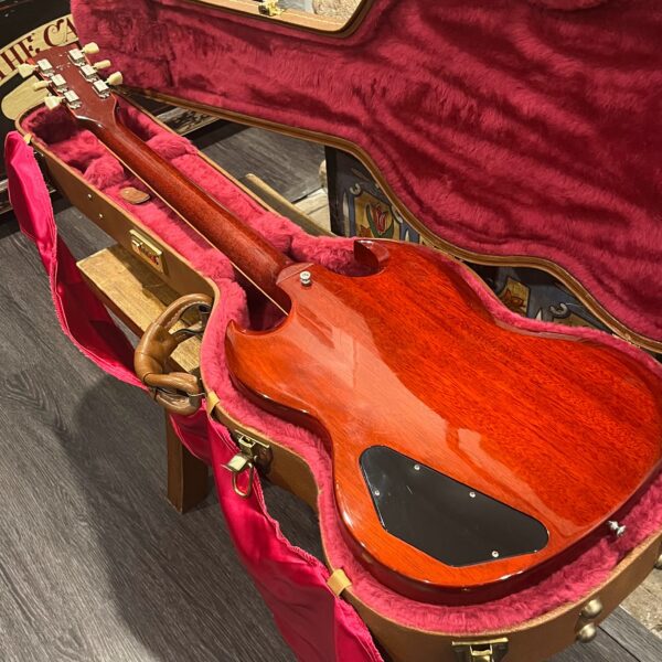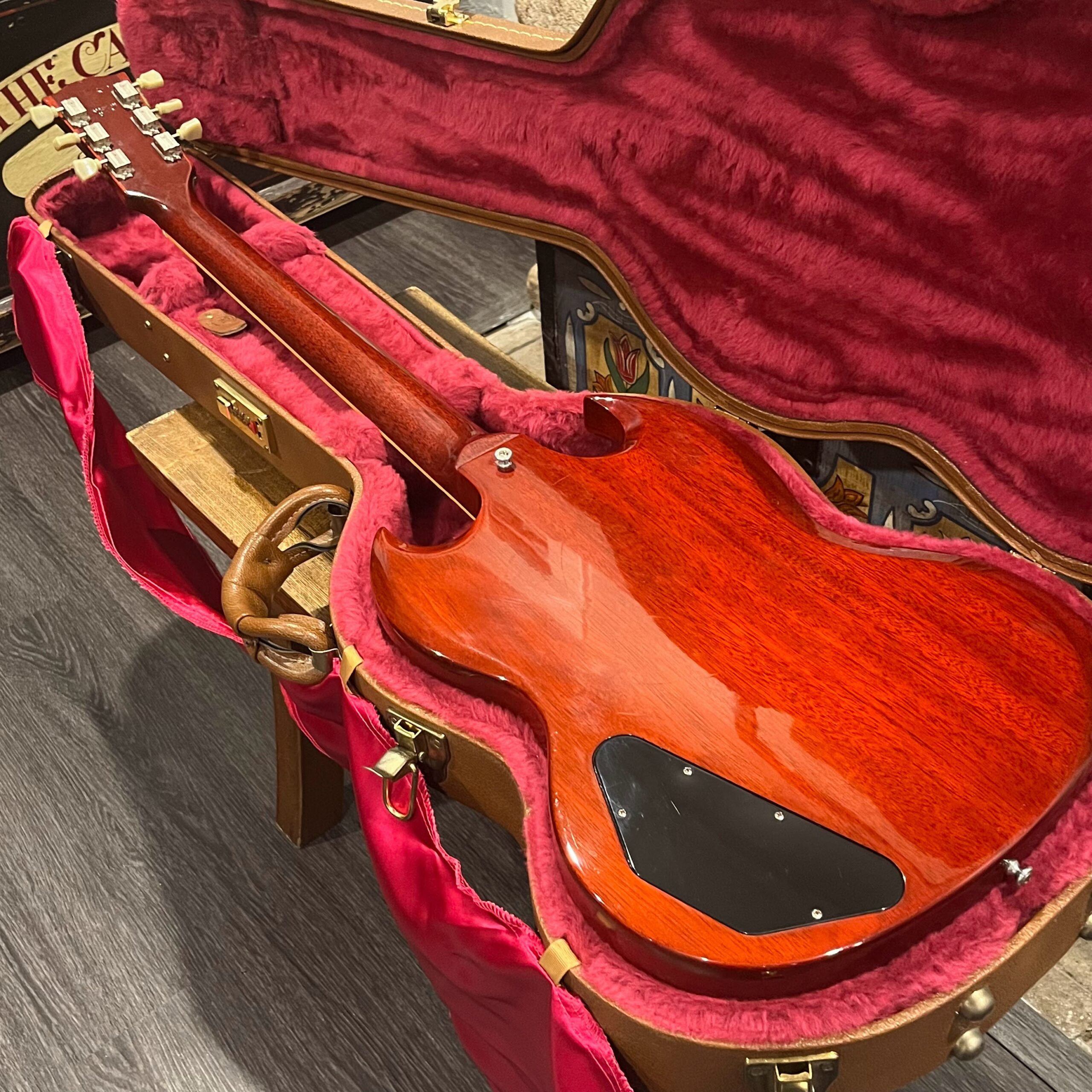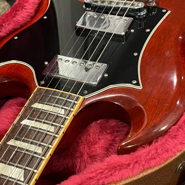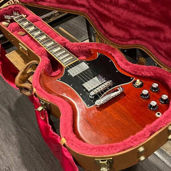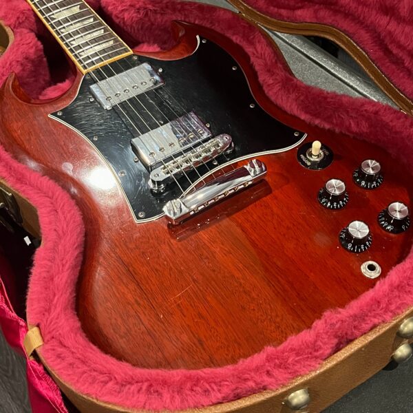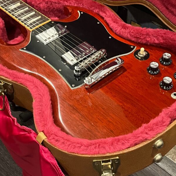 The Gibson SG Standard rocks the classic looks and features associated with the late-60s-style SG™ models so many players love. A solid mahogany body provides the backbone for singing sustain, while a rounded profile mahogany neck and bound rosewood fingerboard deliver a comfortable playing experience across all 22 frets. A long tenon 19th fret neck joint enhances resonance, making it ideal for everything from vintage blues to modern high-gain solos. In the electronics department, the 490R (neck) and 490T (bridge) Alnico 2 humbuckers™ produce a versatile range of tones. Their clear, balanced output can easily cover a wide range of genres—softening nicely for warm clean passages and roaring to life when pushing an amp into overdrive. Dedicated volume and tone controls, along with a 3-way toggle switch, offer quick access to any sound you need. Visually, a black 5-ply full-face pickguard sets this SG Standard apart from other models, and chrome-finished hardware adds a timeless touch. Kluson Deluxe tuners keep tuning precise, while the aluminum Tune-O-Matic™ bridge and Stop Bar tailpiece ensure reliable intonation. Rounded out by silver reflectors, this SG Standard captures the look and spirit of Gibson’s classic late-60s design. Beautiful deep Heritage Cherry nitro finish looks excellent, comes with original plastics, cream switch tip, beautiful almost ebony dark rosewood fretboard, 22 frets. Weighs 7lb and 5oz and is set up on 10s. Comes in a good older Gibson hardshell case with satin shroud, looks good in it. Very resonant, lightweight instrument.