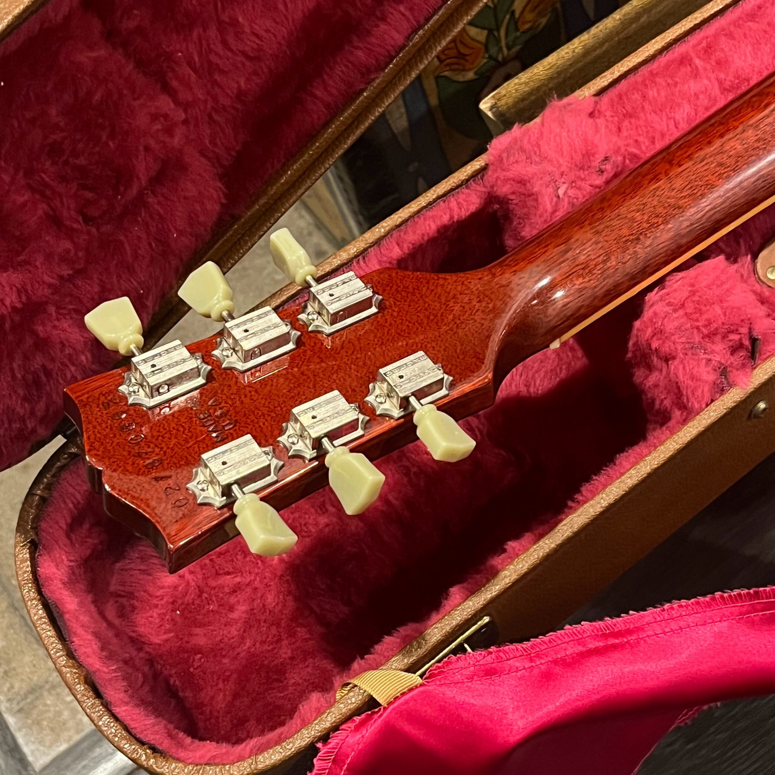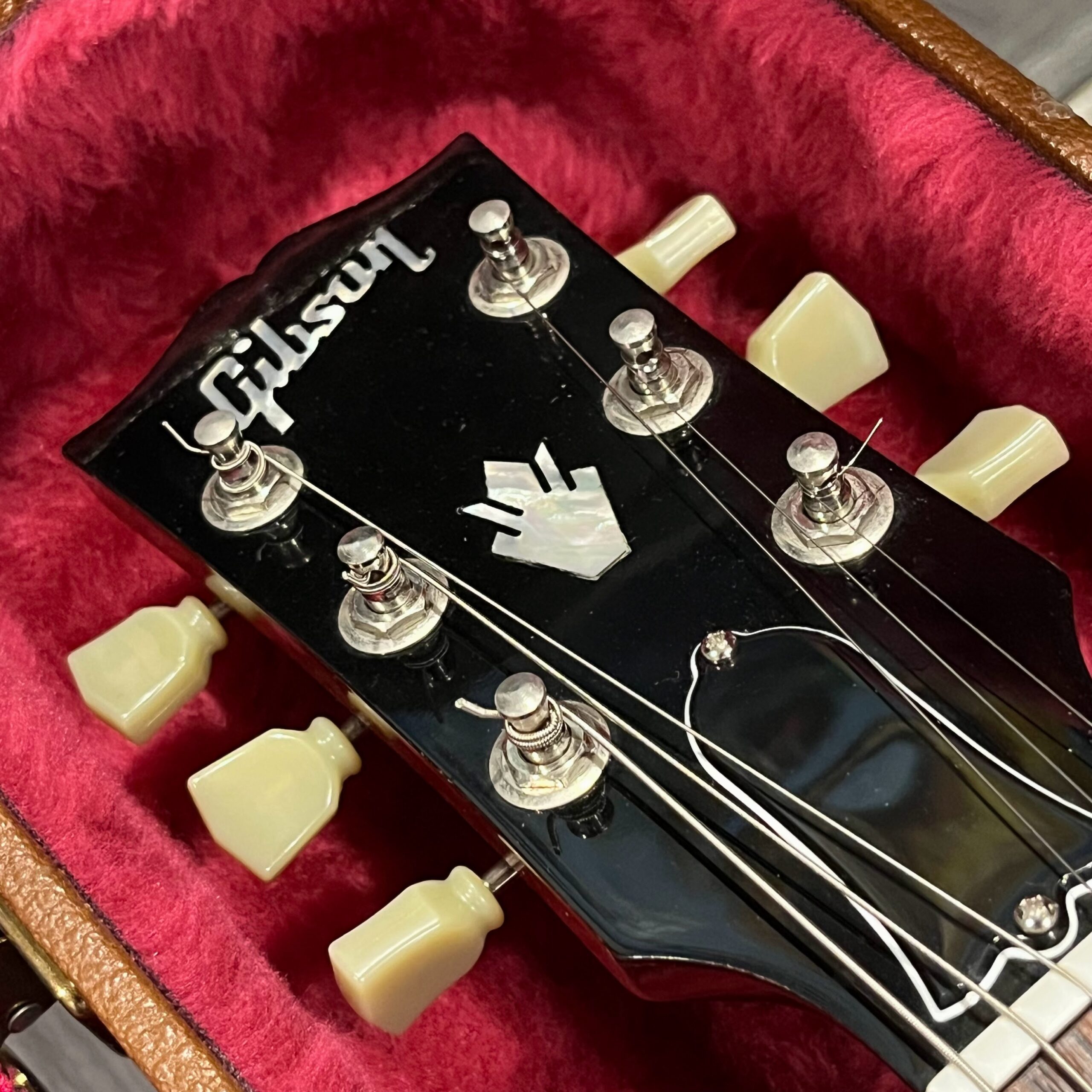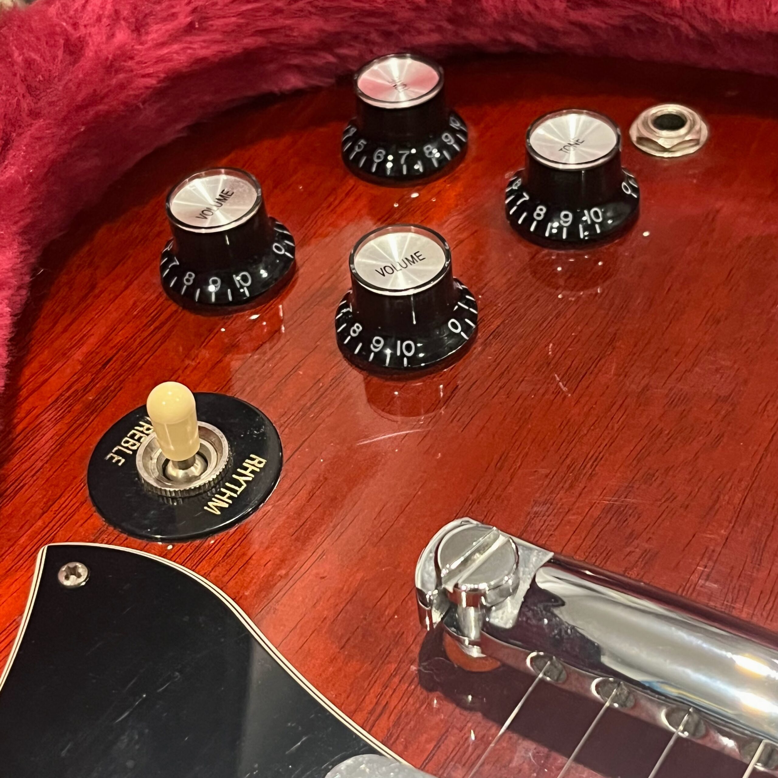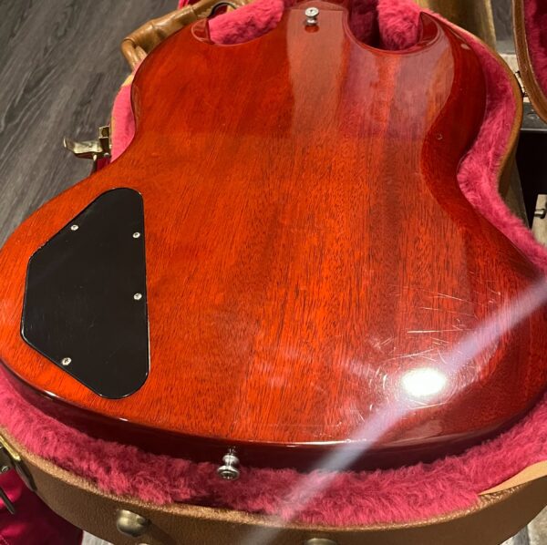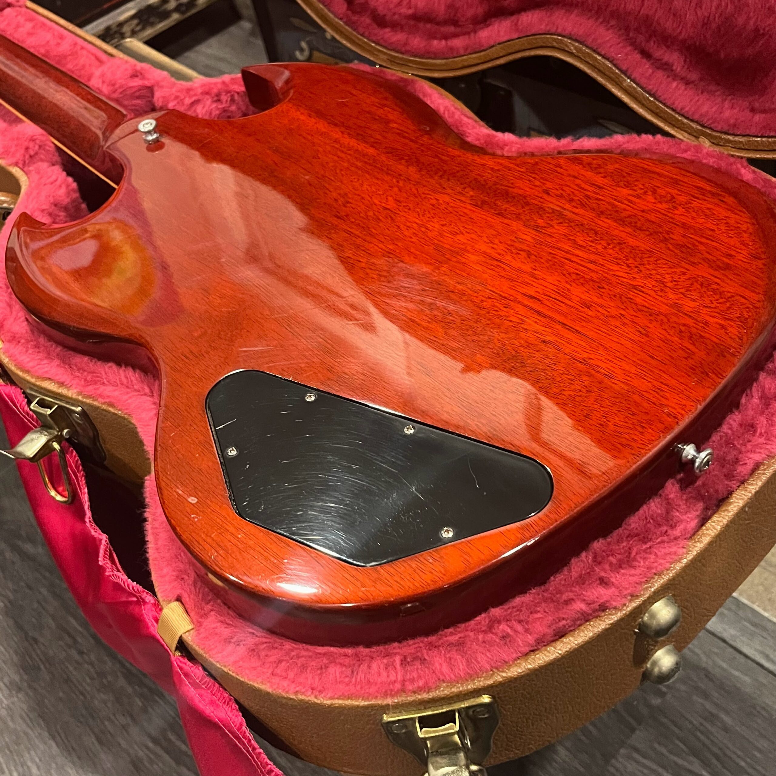 The Gibson SG Standard rocks the classic looks and features associated with the late-60s-style SG™ models so many players love. A solid mahogany body provides the backbone for singing sustain, while a rounded profile mahogany neck and bound rosewood fingerboard deliver a comfortable playing experience across all 22 frets. A long tenon 19th fret neck joint enhances resonance, making it ideal for everything from vintage blues to modern high-gain solos. In the electronics department, the 490R (neck) and 490T (bridge) Alnico 2 humbuckers™ produce a versatile range of tones. Their clear, balanced output can easily cover a wide range of genres—softening nicely for warm clean passages and roaring to life when pushing an amp into overdrive. Dedicated volume and tone controls, along with a 3-way toggle switch, offer quick access to any sound you need. Visually, a black 5-ply full-face pickguard sets this SG Standard apart from other models, and chrome-finished hardware adds a timeless touch. Kluson Deluxe tuners keep tuning precise, while the aluminum Tune-O-Matic™ bridge and Stop Bar tailpiece ensure reliable intonation. Rounded out by silver reflectors, this SG Standard captures the look and spirit of Gibson’s classic late-60s design. Beautiful deep Heritage Cherry nitro finish looks excellent, comes with original plastics, cream switch tip, beautiful almost ebony dark rosewood fretboard, 22 frets. Weighs 7lb and 5oz and is set up on 10s. Comes in a good older Gibson hardshell case with satin shroud, looks good in it. Very resonant, lightweight instrument.
