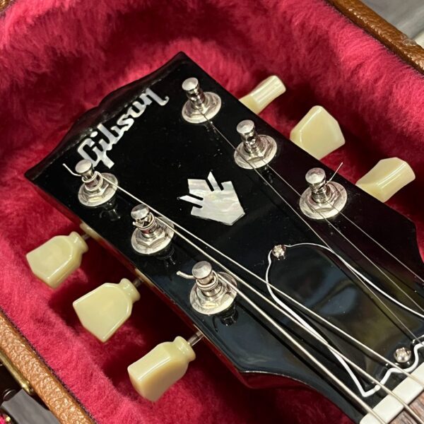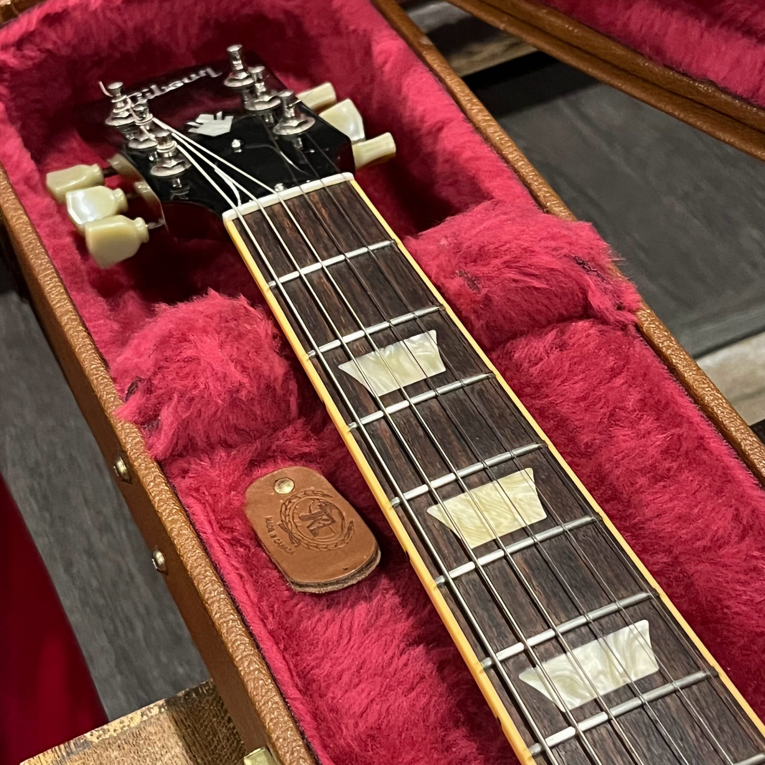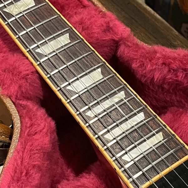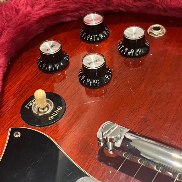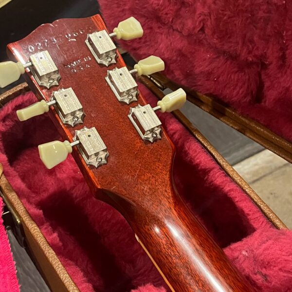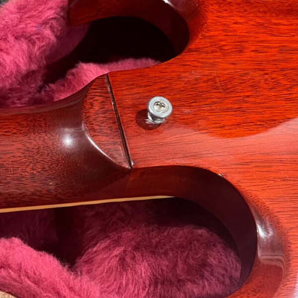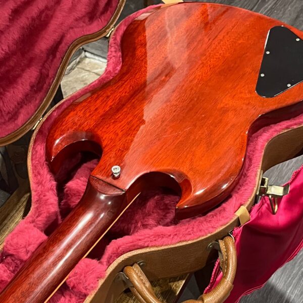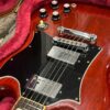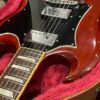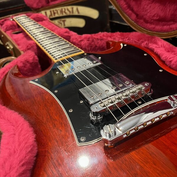 Fair amount of patina and playwear on this excellent player-grade SG, light hazing, light checking, small dings, scratches, whirls in plastic. Truss rod cover not the original one, missing the SG. Lots more pictures of this one at my site which Reverb doesn’t want me to link to, but if you put a dotcom behind my shop name, you’d already be there.