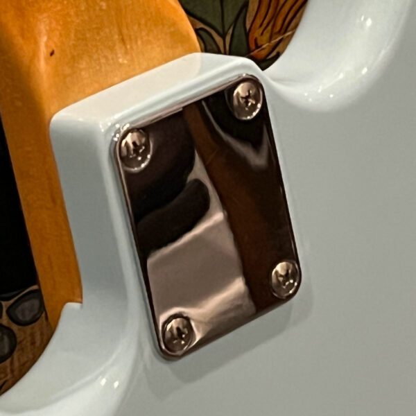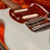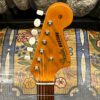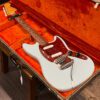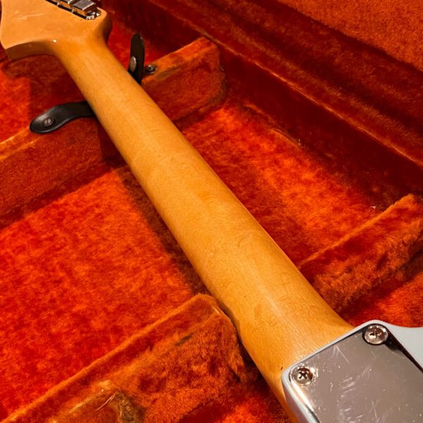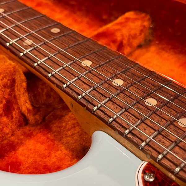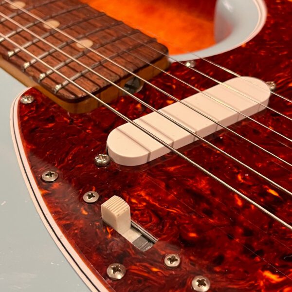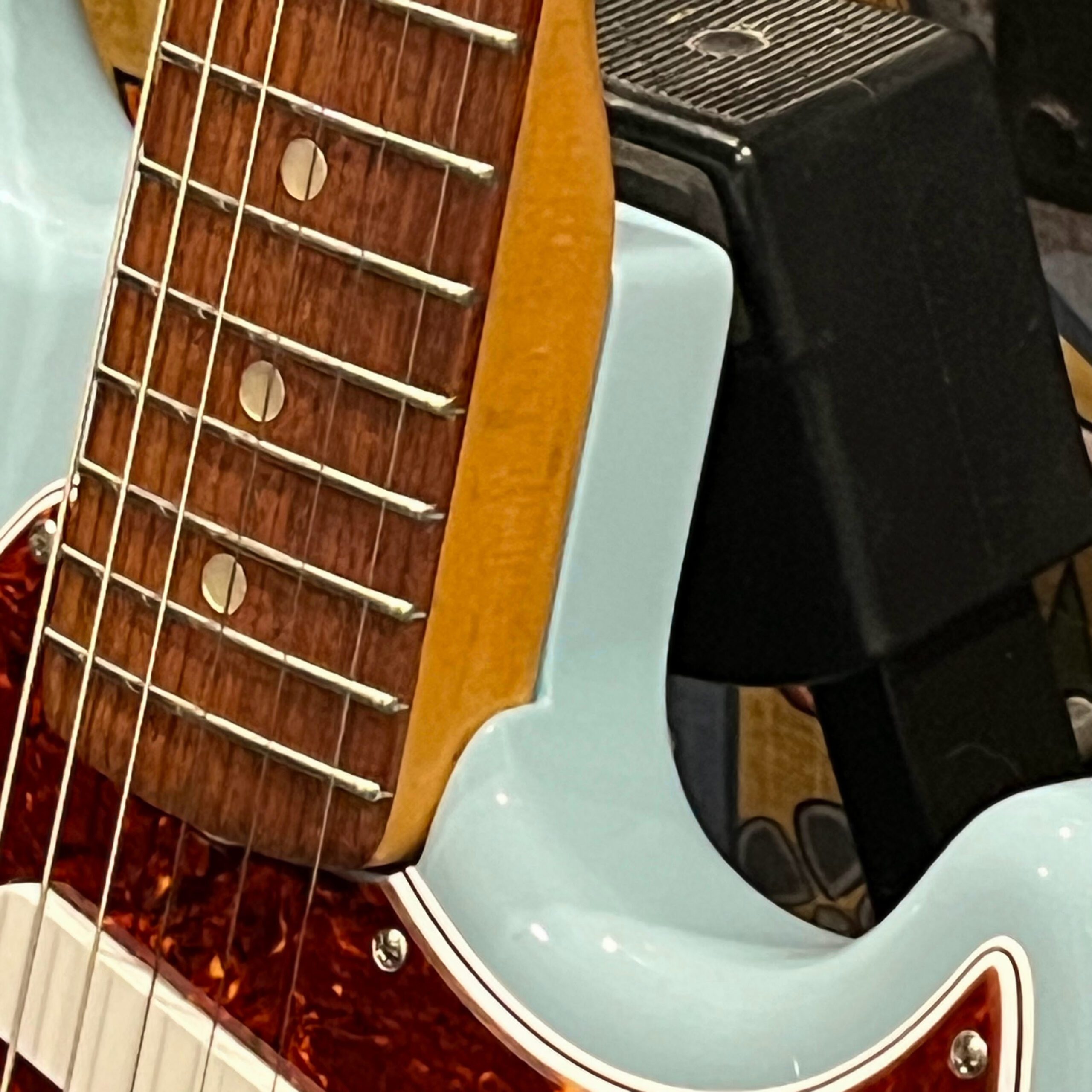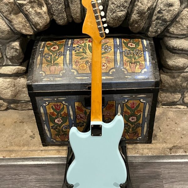 A beautiful marriage of old and new parts – an early 2000s Japanese MG-65 body with hotter set of pickups from Curtis Novak, but the star of the show is the neck, it’s a real 1965 USA Fender rosewood neck with pale clay dots with new vintage 6105 ‘tall – narrow’ frets, and with new vintage button style tuners and new bone nut applied to the old, old wood. Lots of wear, as you’d expect from something now pushing 60 years old. The neck is marked ‘8Jun65B’ The string tree is original to the instrument, as is the finish on the neck, decals etc. The re-fret was done by the guys at Eric’s Guitars in Van Nuys, California. Comes in an original 60s hardcase with working latches and catches, and tremolo arm. All the usual in an out of phase switching is stock, makes lots of great noises, has mad energy, looks and feels great doing it. Weighs 7lb and 6oz and is setup on 10s. Camera doesn’t quite capture the Daphne Blue, can look a little too light in the photos.