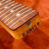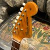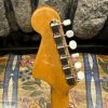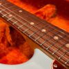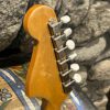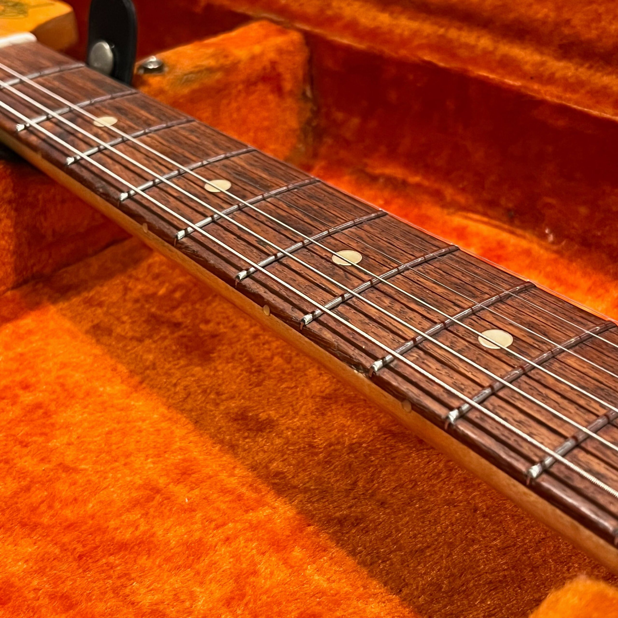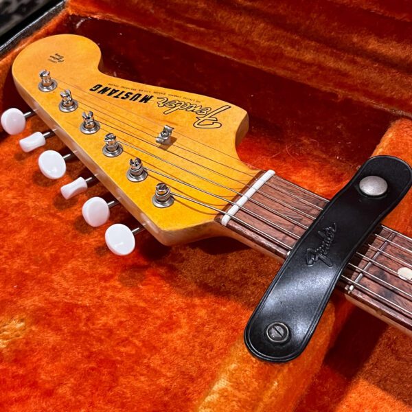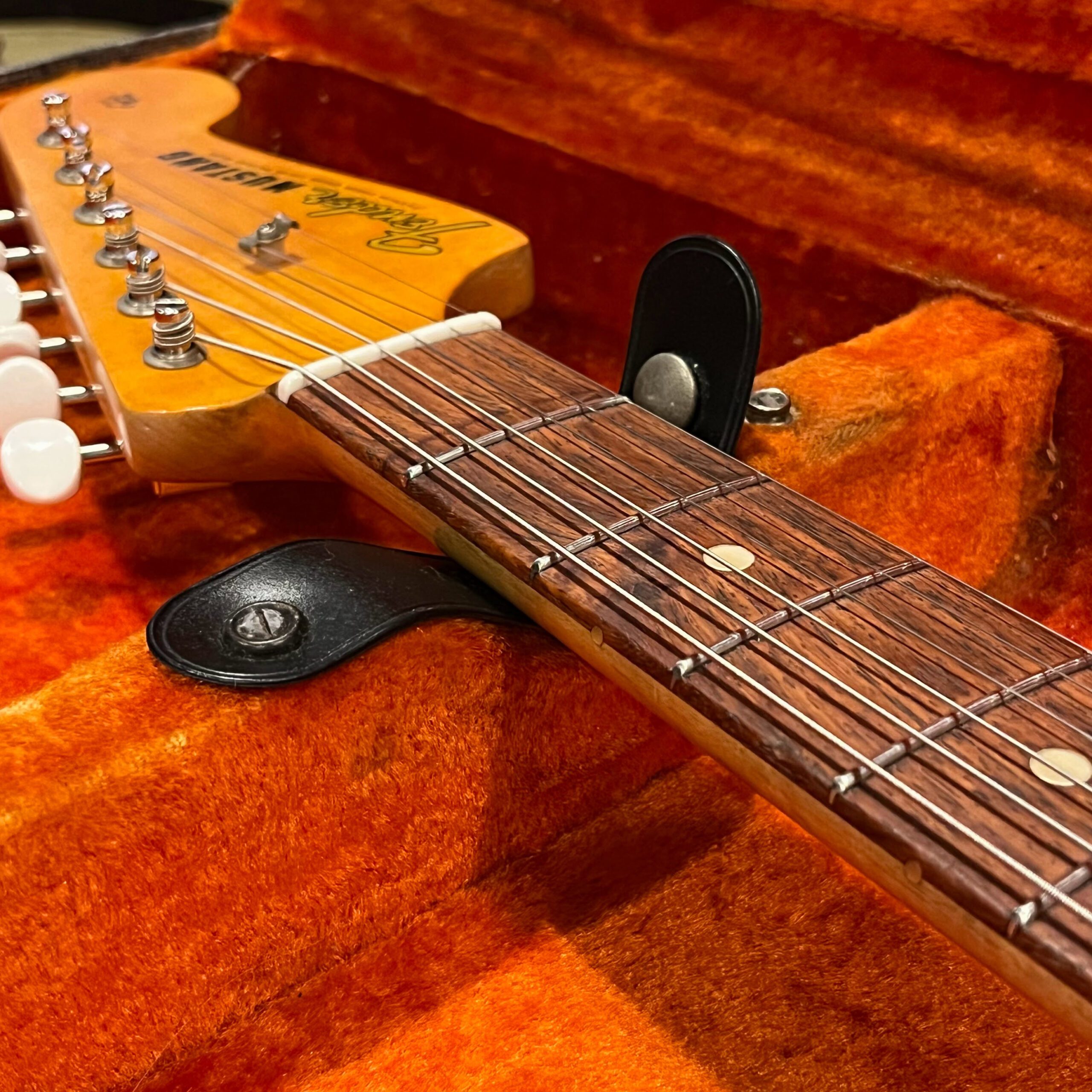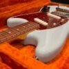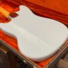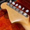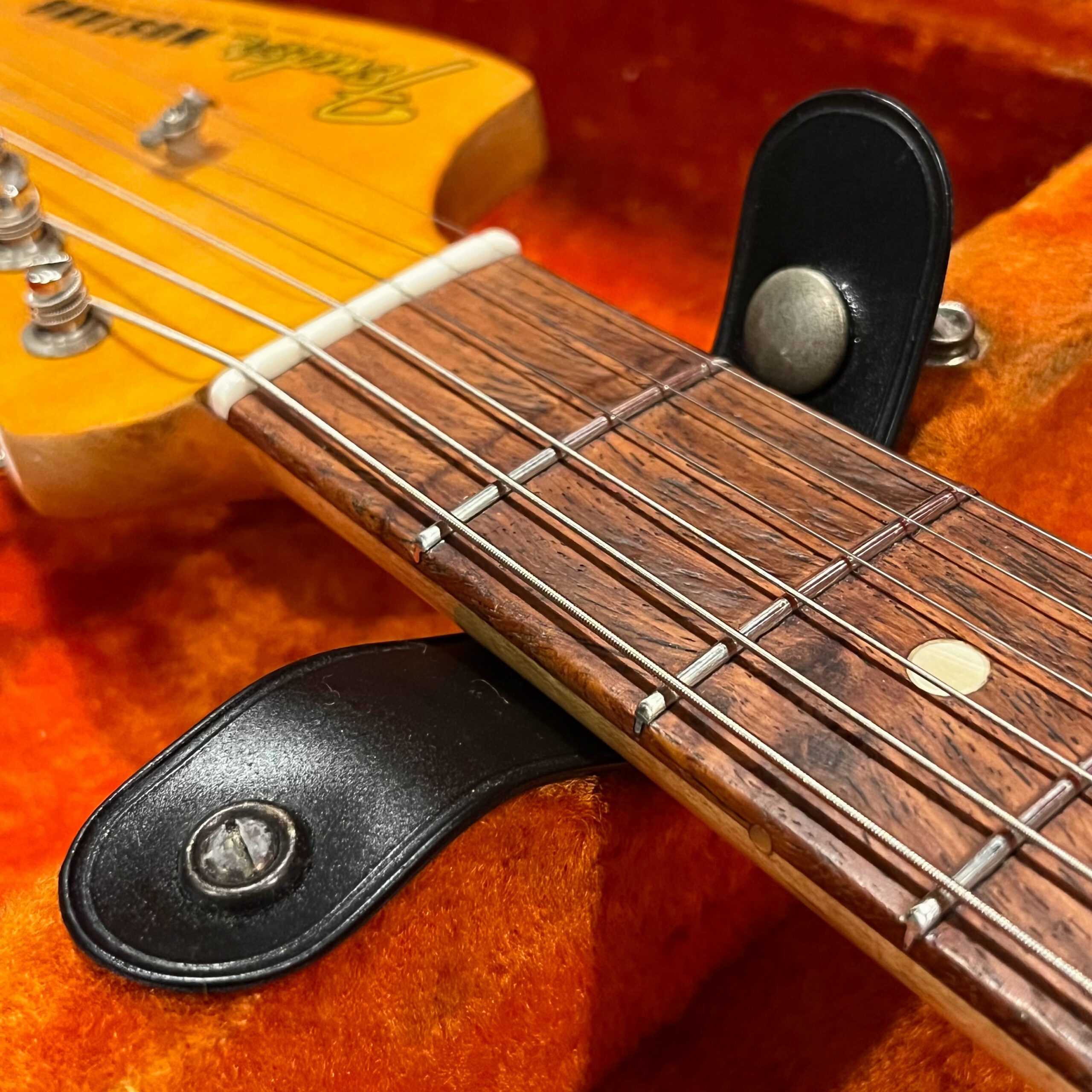A beautiful marriage of old and new parts – an early 2000s Japanese MG-65 body with hotter set of pickups from Curtis Novak, but the star of the show is the neck, it’s a real 1965 USA Fender rosewood neck with pale clay dots with new vintage 6105 ‘tall – narrow’ frets, and with new vintage button style tuners and new bone nut applied to the old, old wood. Lots of wear, as you’d expect from something now pushing 60 years old. The neck is marked ‘8Jun65B’ The string tree is original to the instrument, as is the finish on the neck, decals etc. The re-fret was done by the guys at Eric’s Guitars in Van Nuys, California. Comes in an original 60s hardcase with working latches and catches, and tremolo arm. All the usual in an out of phase switching is stock, makes lots of great noises, has mad energy, looks and feels great doing it. Weighs 7lb and 6oz and is setup on 10s. Camera doesn’t quite capture the Daphne Blue, can look a little too light in the photos.