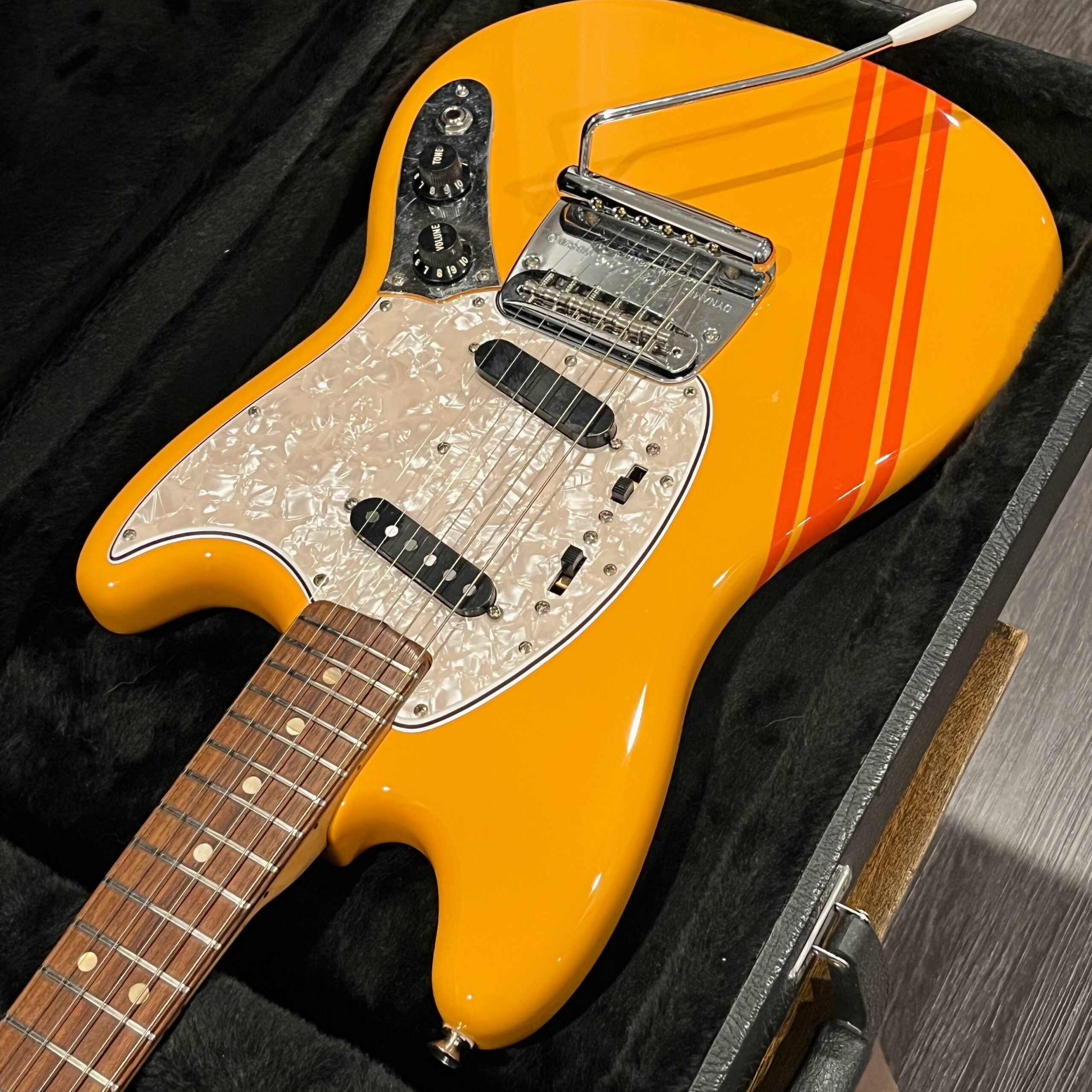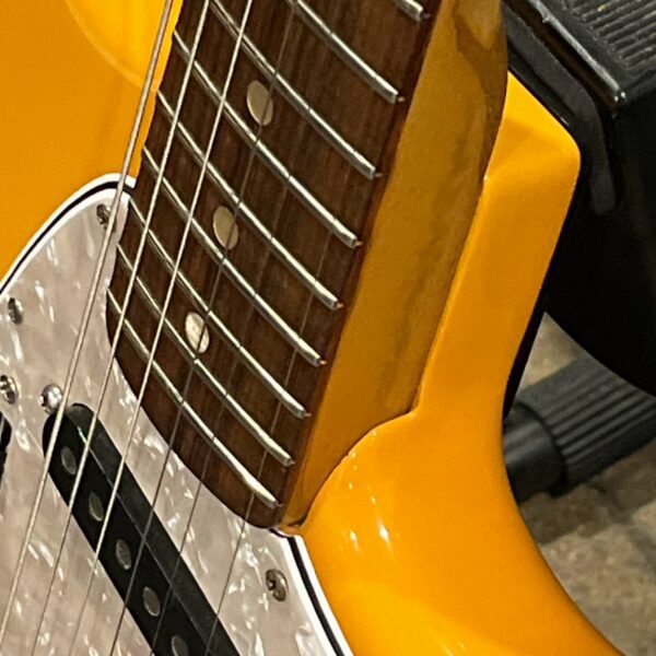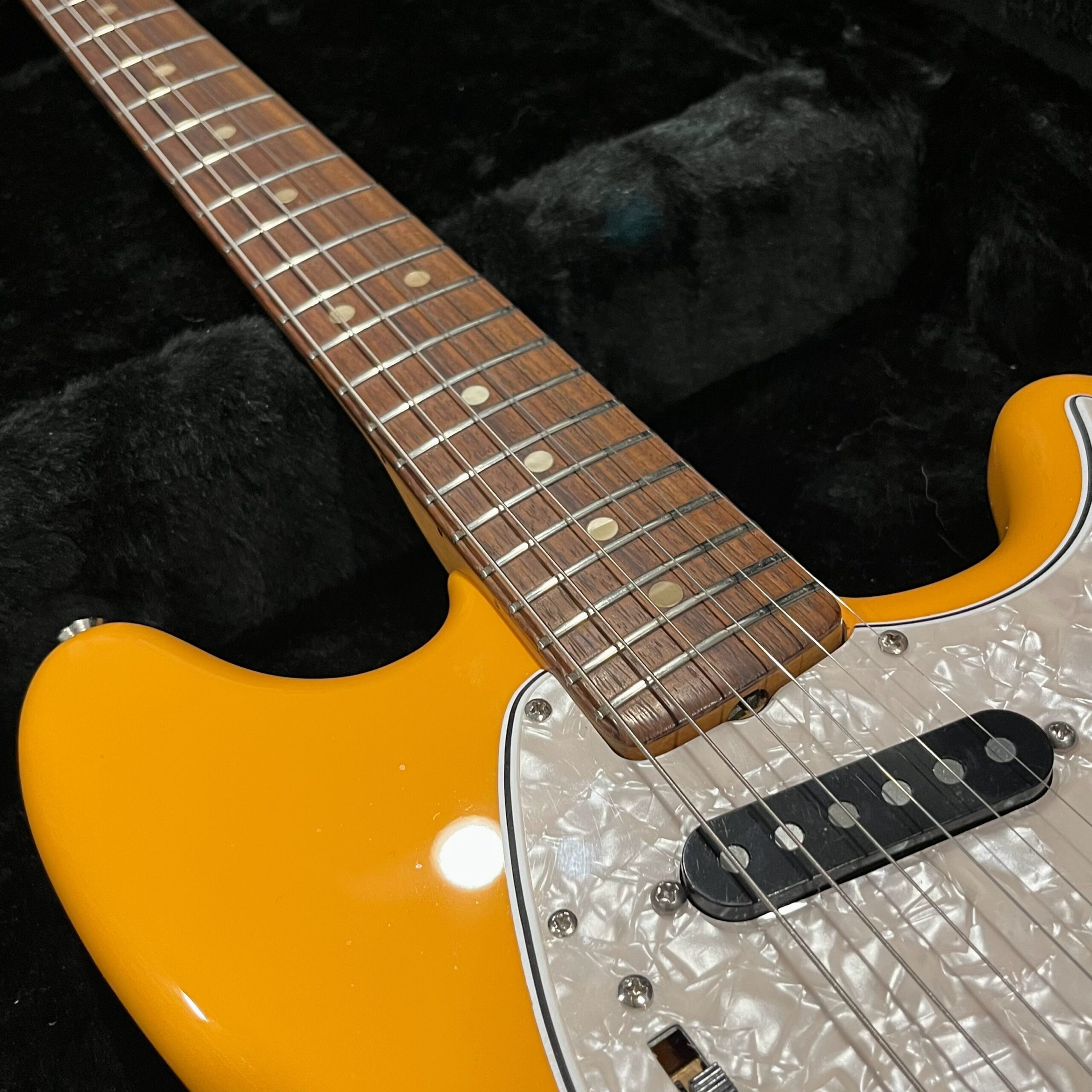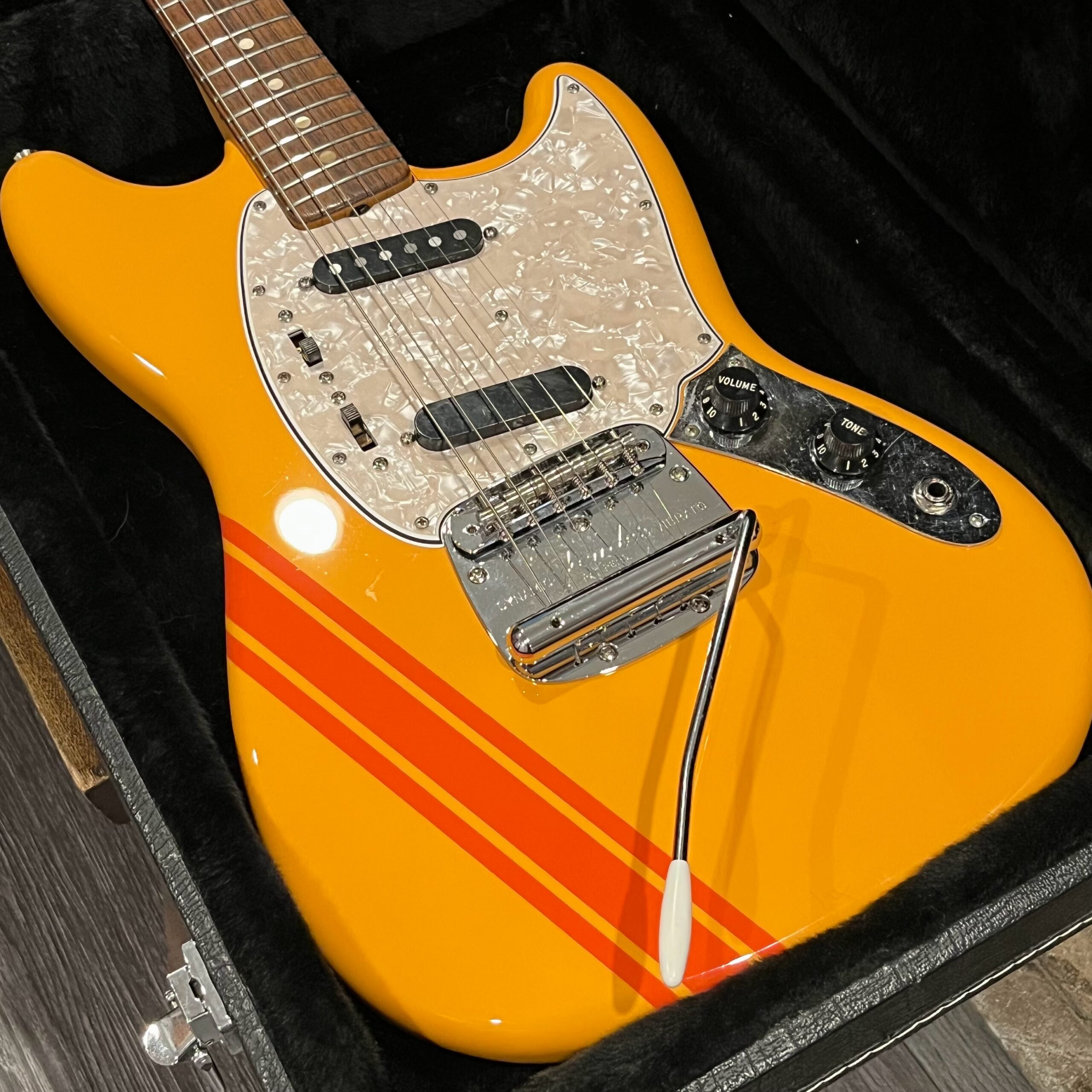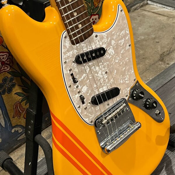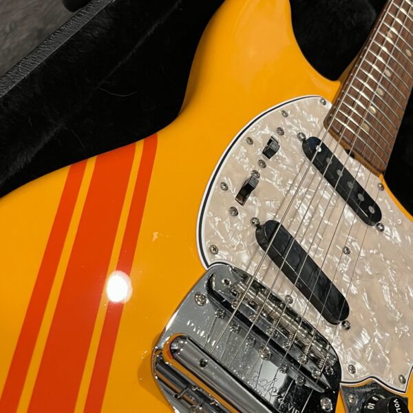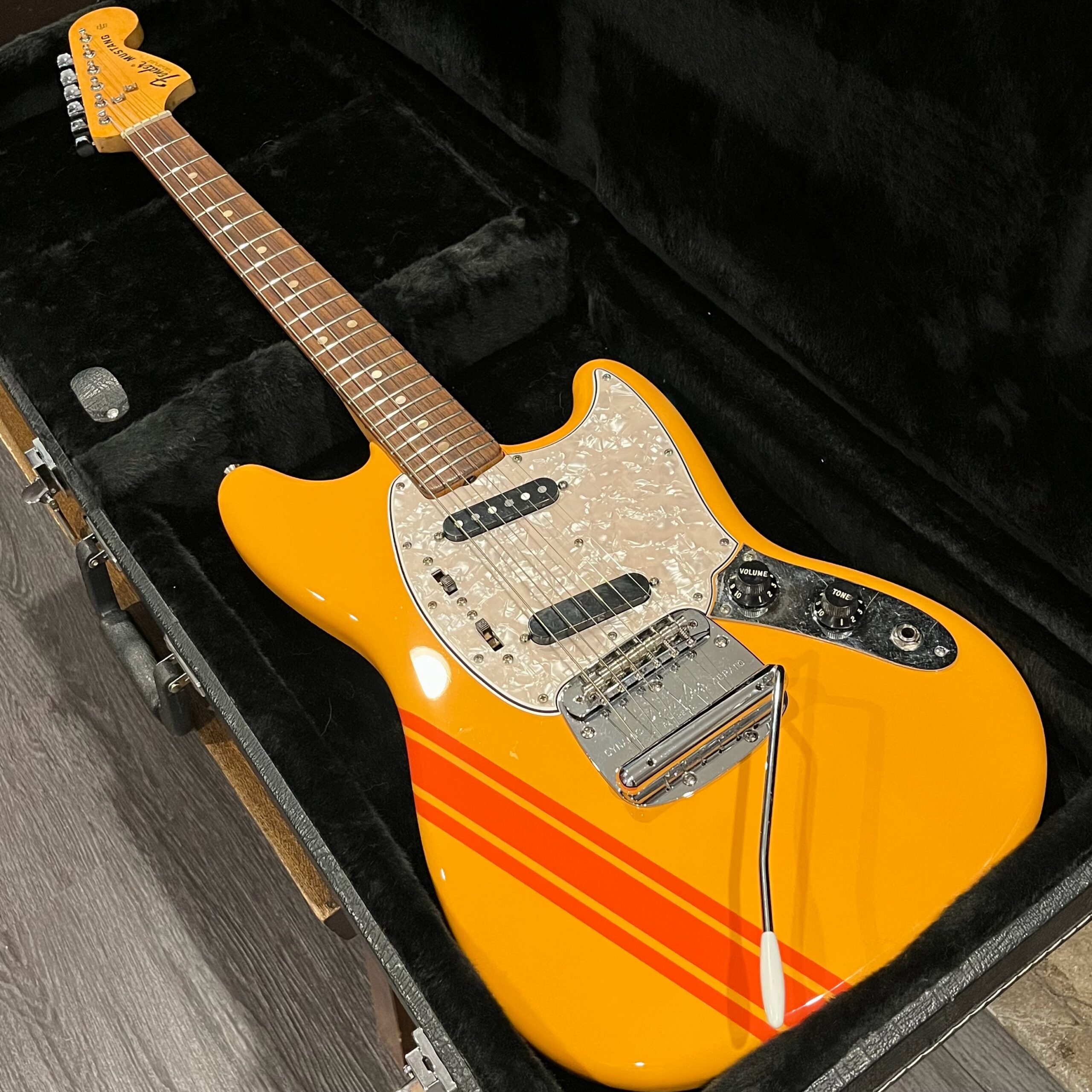 A beautiful marriage of old and new parts – with a modern 2025 Vintera Capri Orange MG-73 Competition body with vintage pickups, but the star of the show is the neck, it’s an original 1975 USA Fender Mustang 24″ rosewood neck with pearloid dots and matching neckplate dating to 1975, with new reproduction Fender F style tuners applied to the old wood. Lots of wear, as you’d expect from something now pushing past 50-years-old. The string trees are original to the neck, as is the finish on the neck and the decals. Frets fresh crowned and leveled and a new bone nut cut by the guys at Eric’s Guitar in Van Nuys, CA.