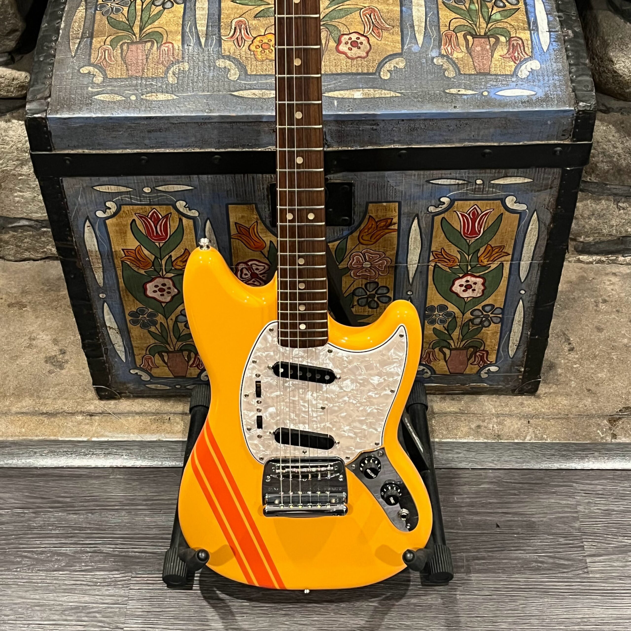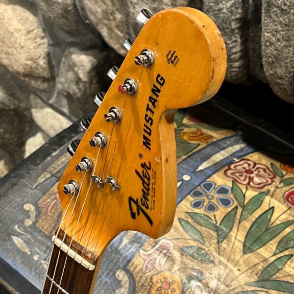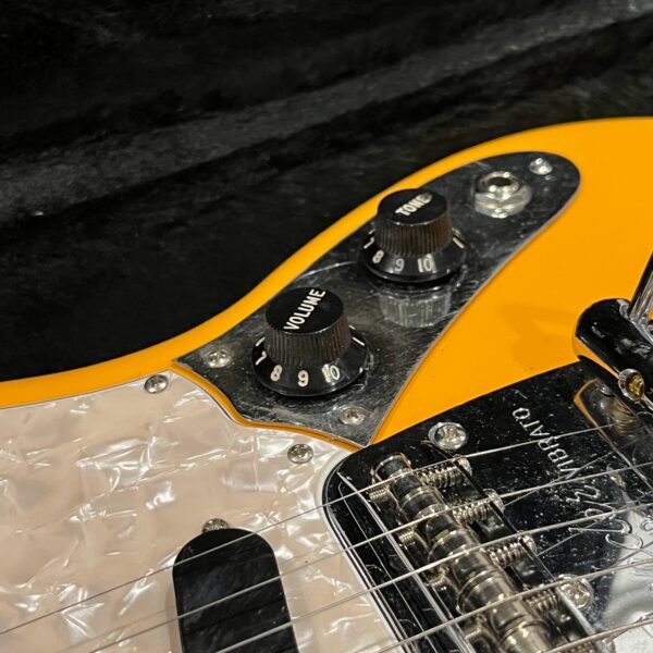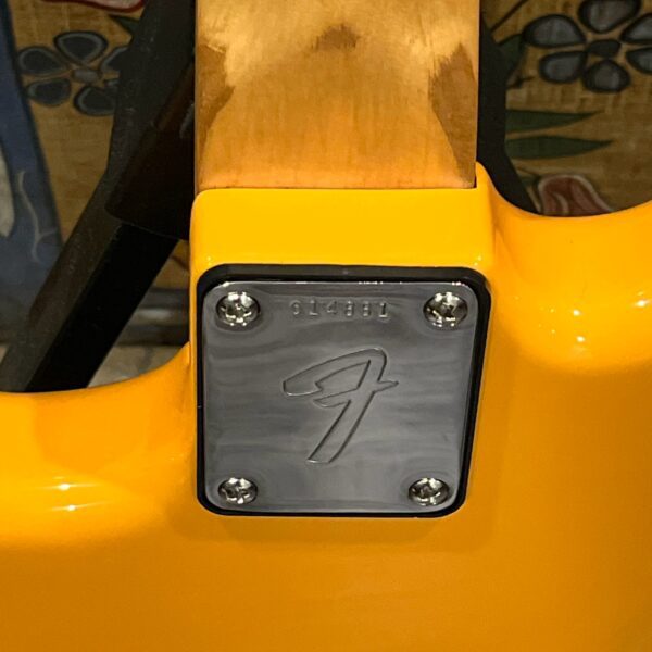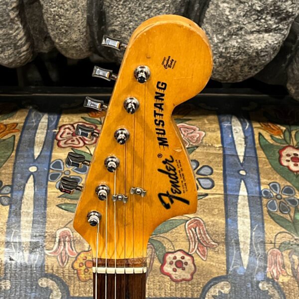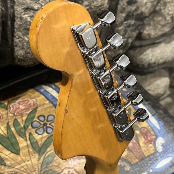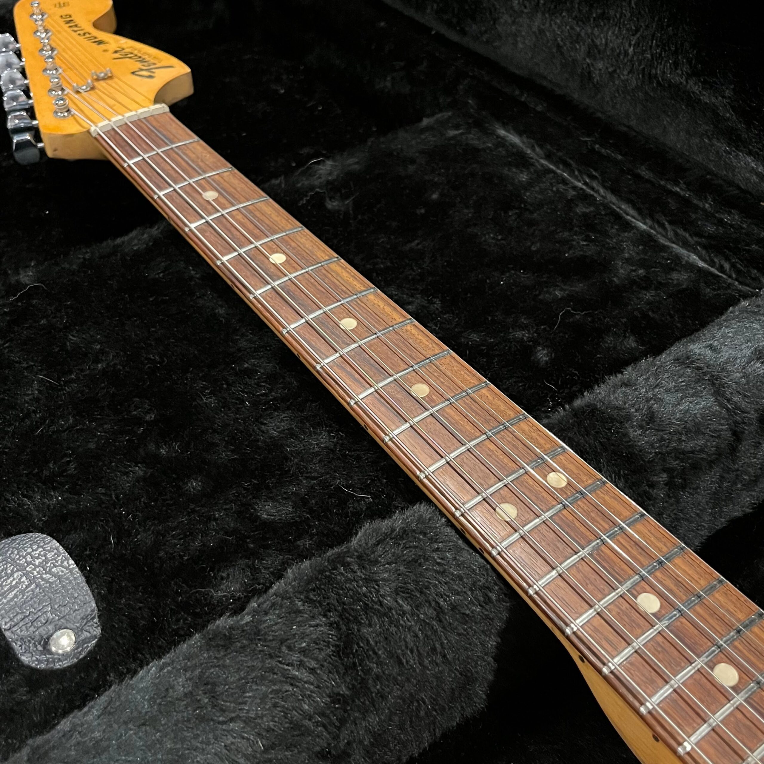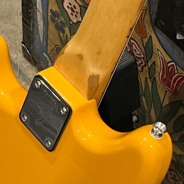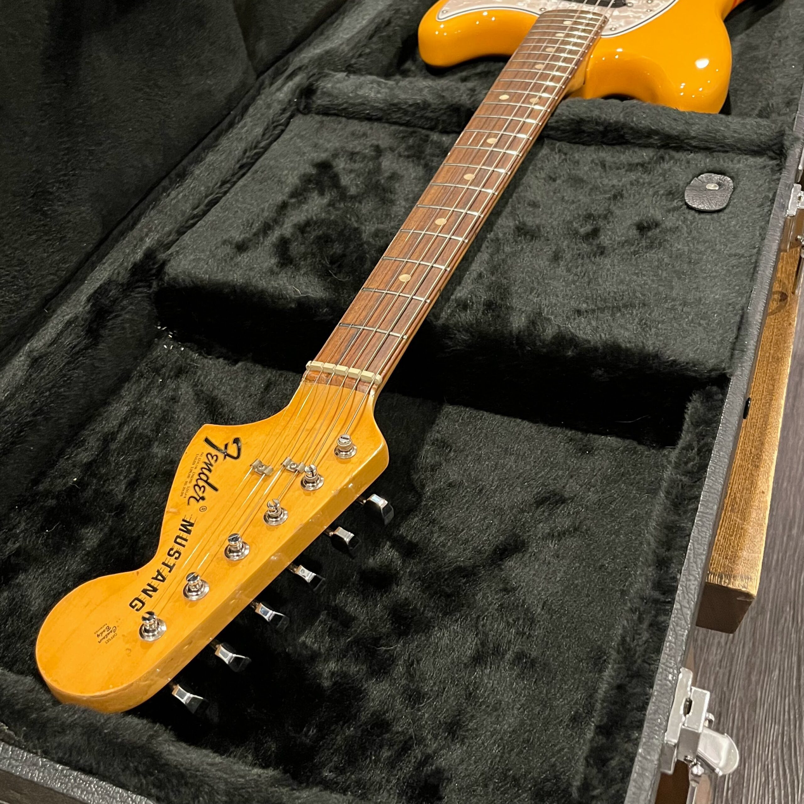 A beautiful marriage of old and new parts – with a modern 2025 Vintera Capri Orange MG-73 Competition body with vintage pickups, but the star of the show is the neck, it’s an original 1975 USA Fender Mustang 24″ rosewood neck with pearloid dots and matching neckplate dating to 1975, with new reproduction Fender F style tuners applied to the old wood. Lots of wear, as you’d expect from something now pushing past 50-years-old. The string trees are original to the neck, as is the finish on the neck and the decals. Frets fresh crowned and leveled and a new bone nut cut by the guys at Eric’s Guitar in Van Nuys, CA.