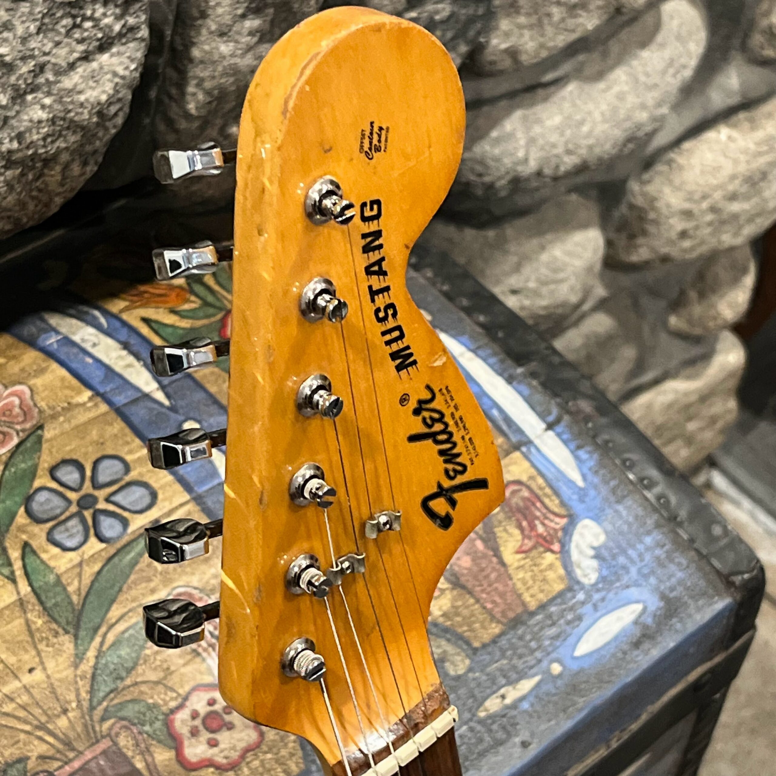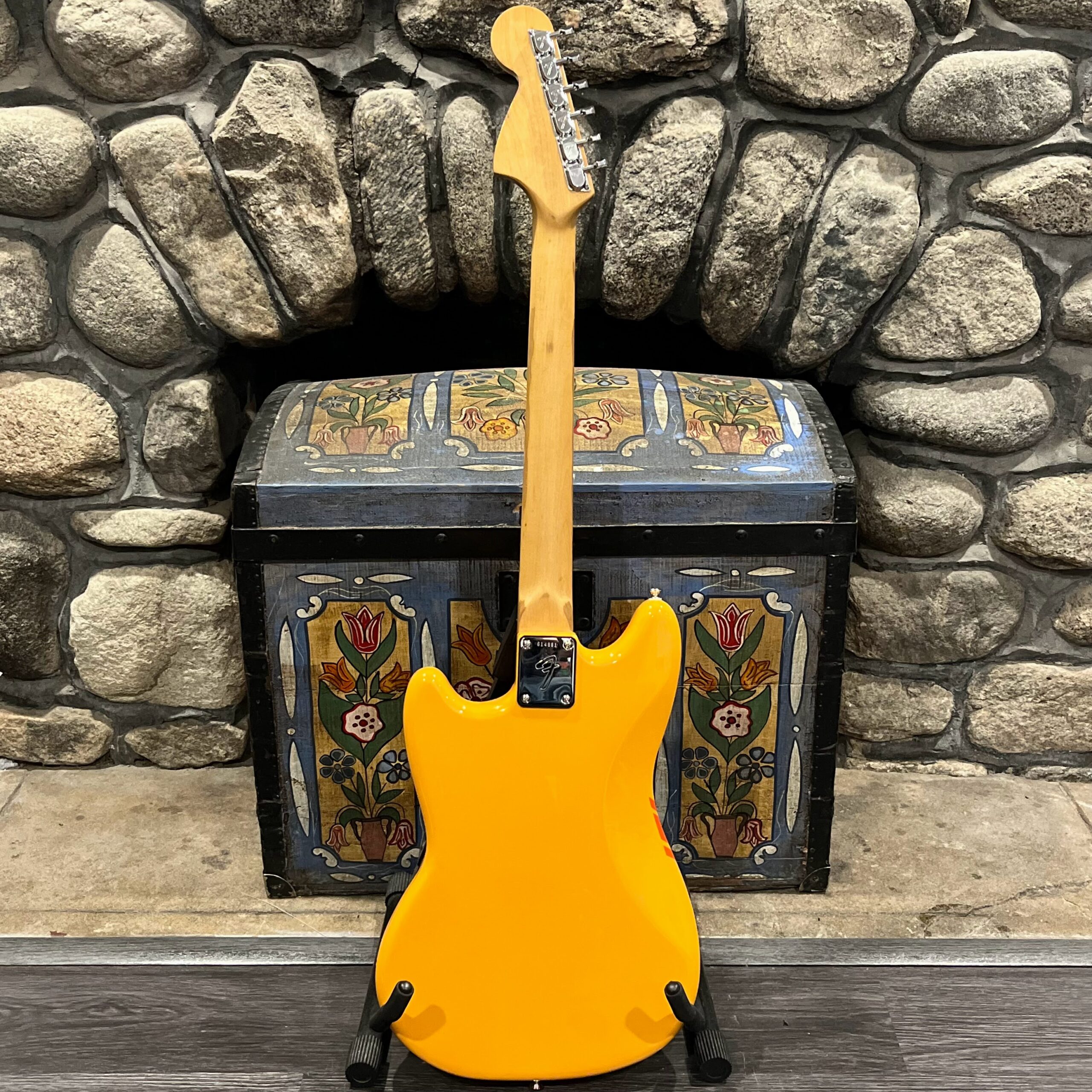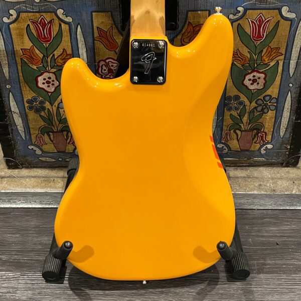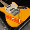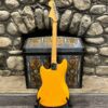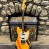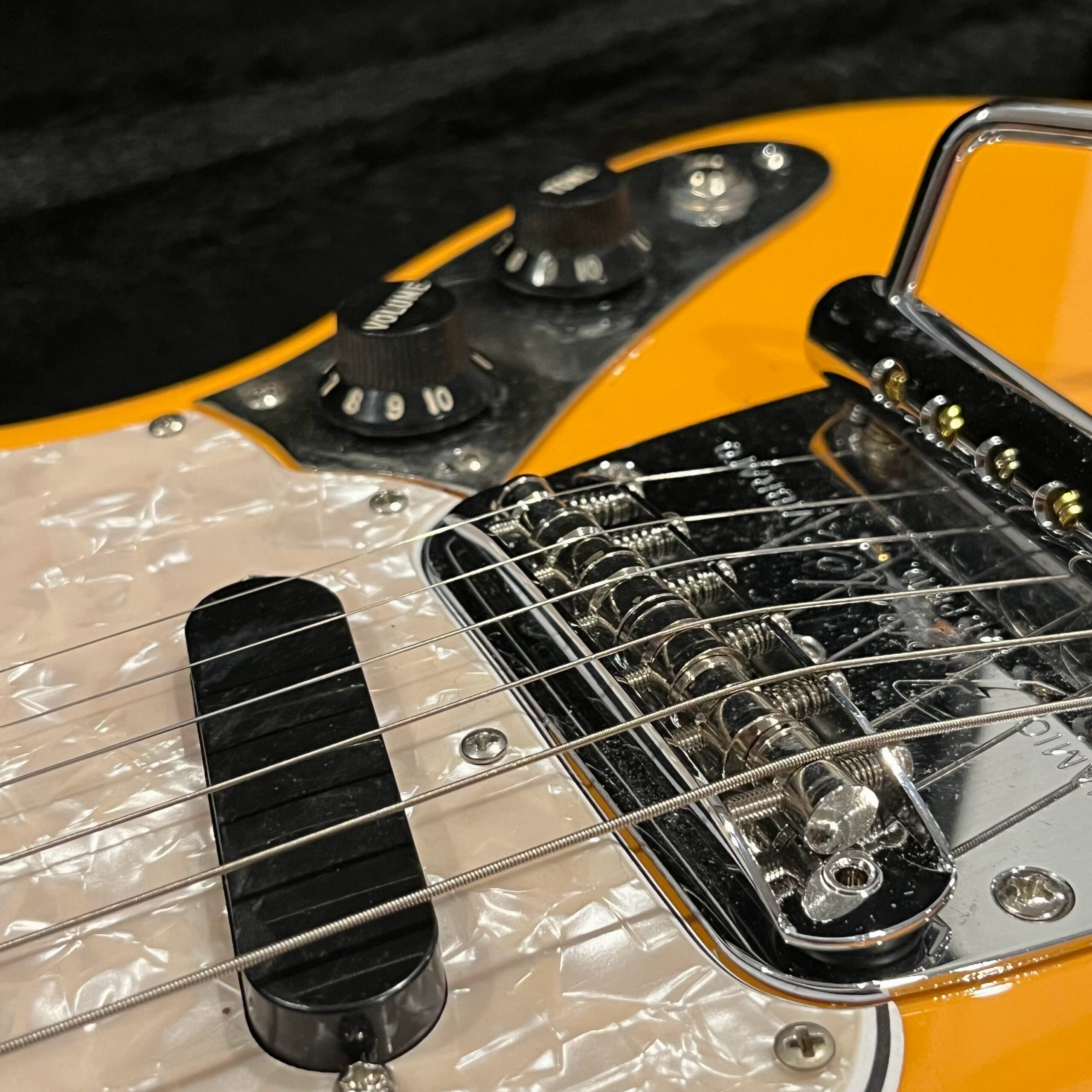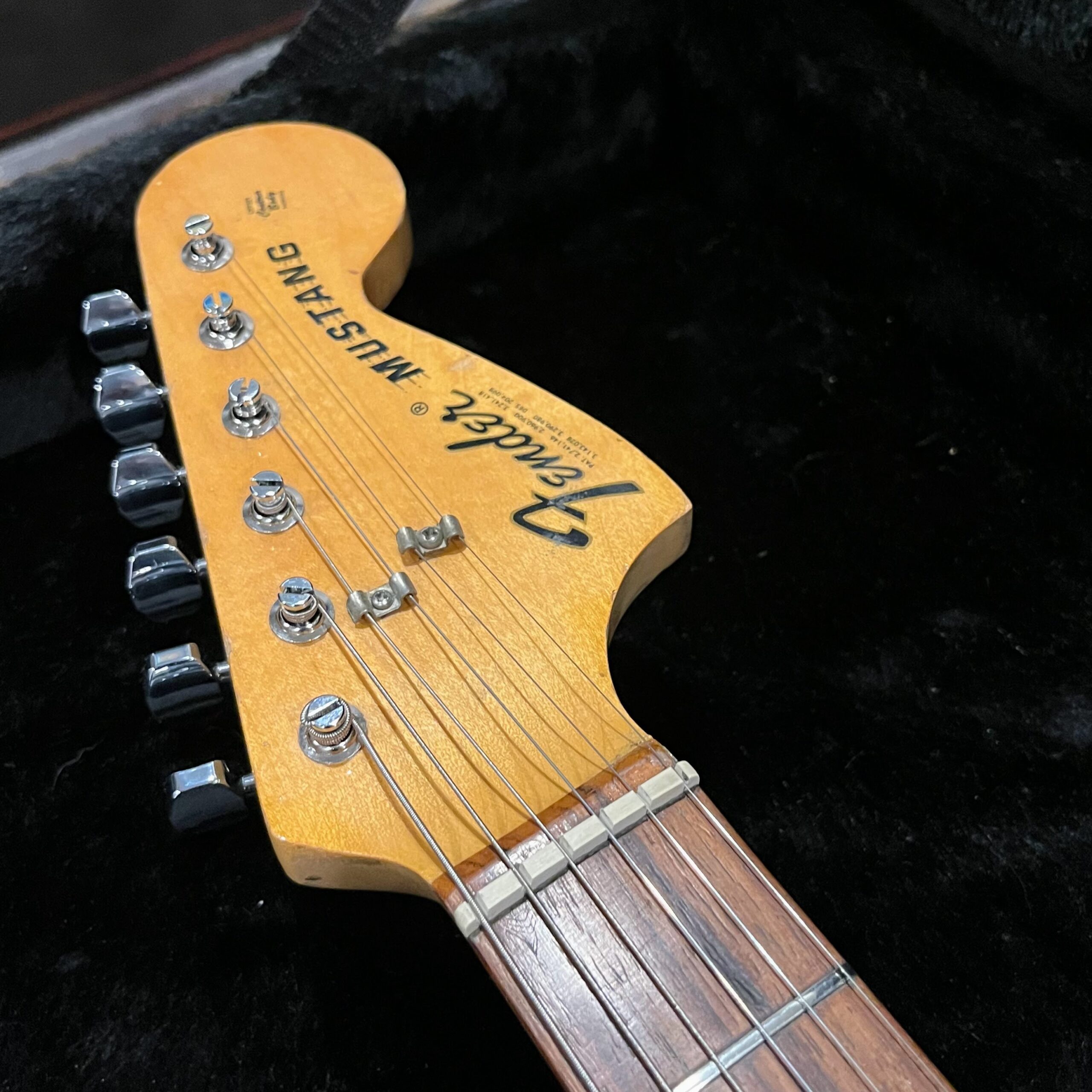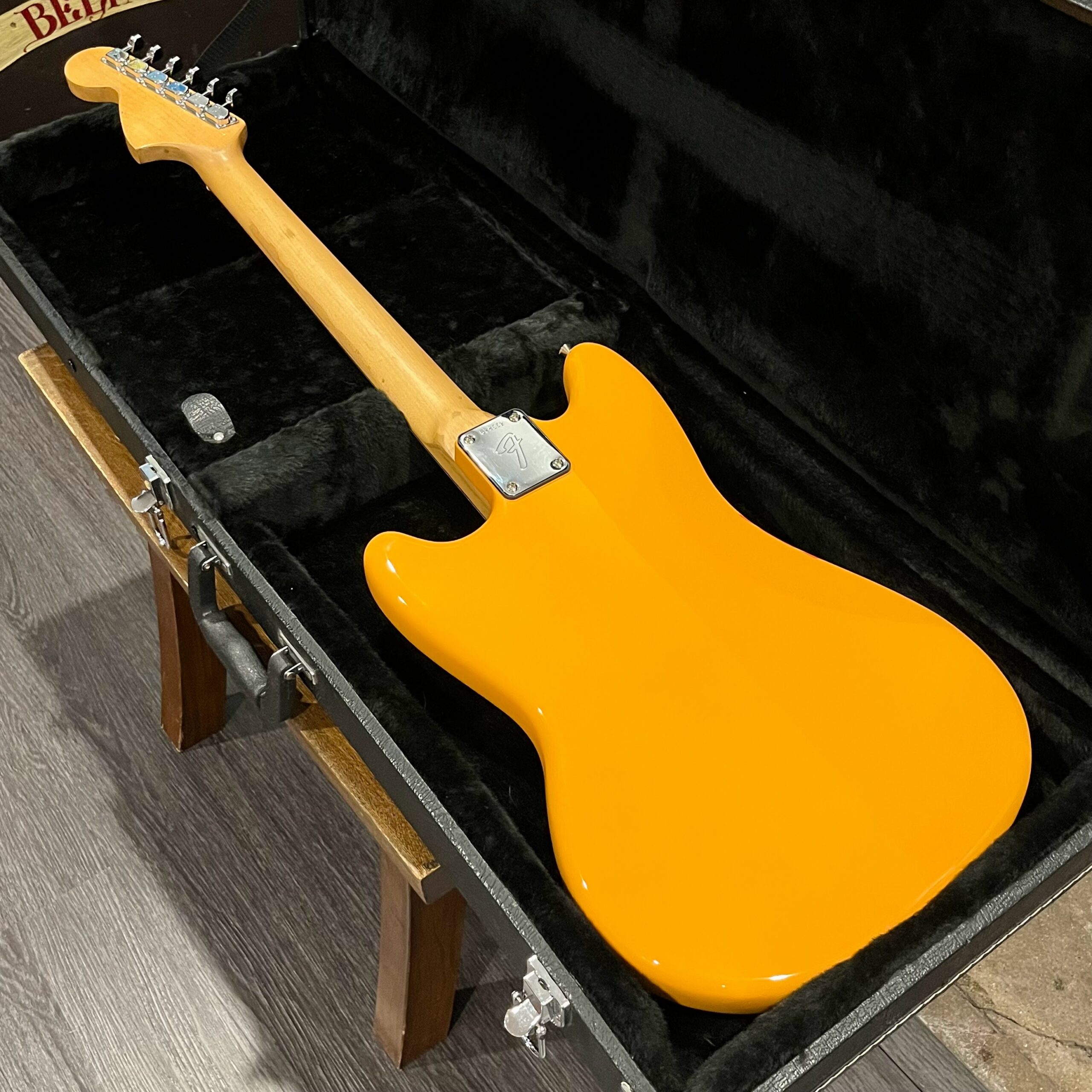 A beautiful marriage of old and new parts – with a modern 2025 Vintera Capri Orange MG-73 Competition body with vintage pickups, but the star of the show is the neck, it’s an original 1975 USA Fender Mustang 24″ rosewood neck with pearloid dots and matching neckplate dating to 1975, with new reproduction Fender F style tuners applied to the old wood. Lots of wear, as you’d expect from something now pushing past 50-years-old. The string trees are original to the neck, as is the finish on the neck and the decals. Frets fresh crowned and leveled and a new bone nut cut by the guys at Eric’s Guitar in Van Nuys, CA.