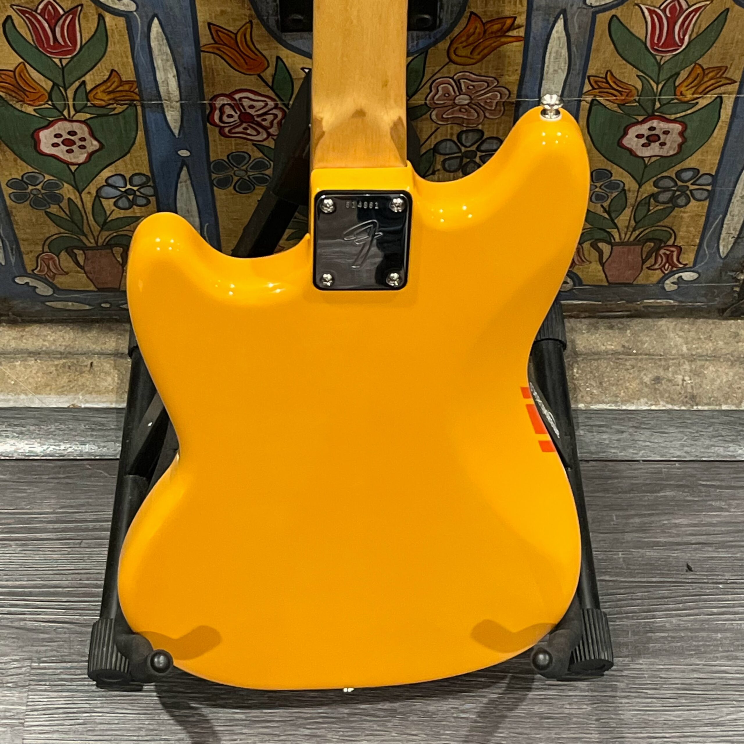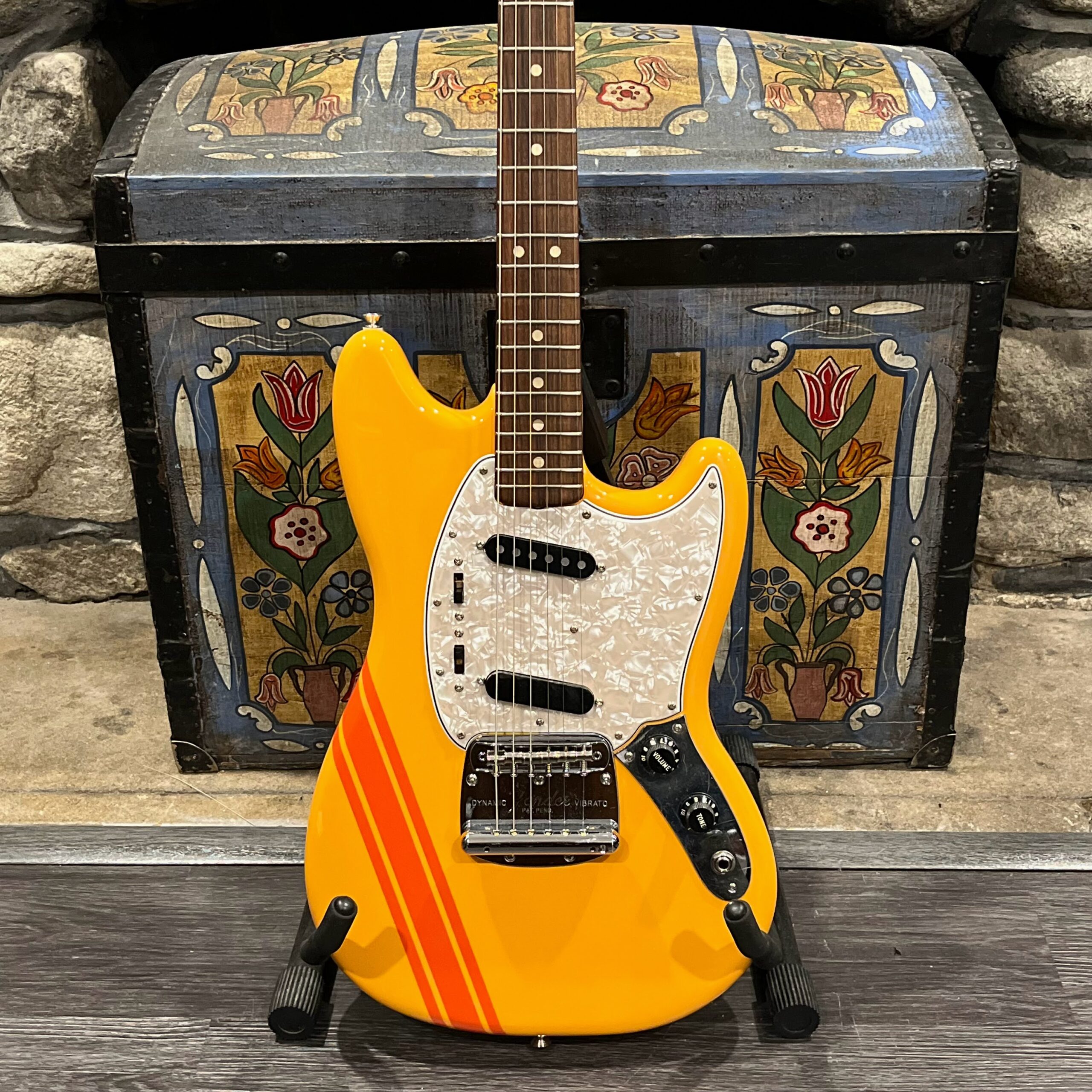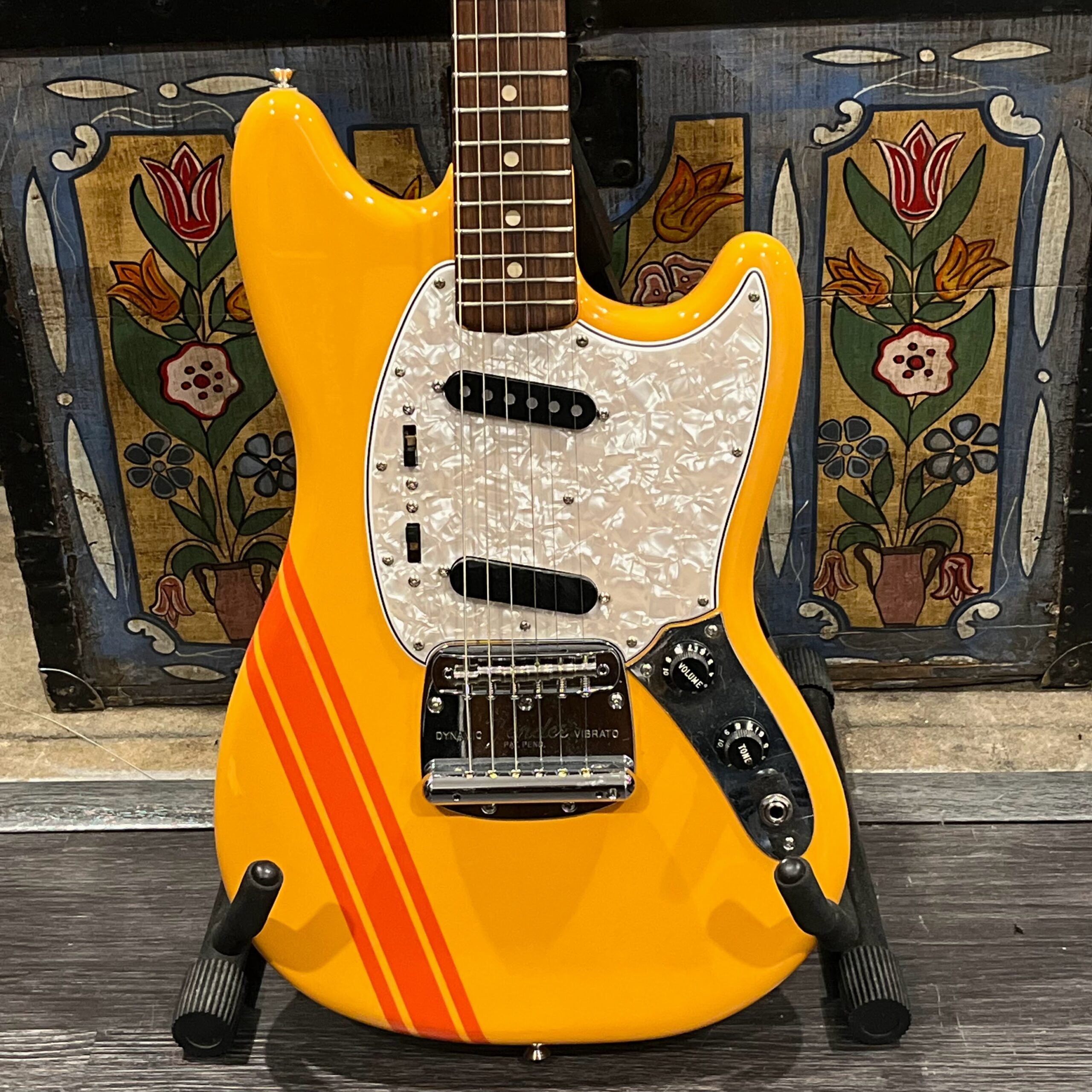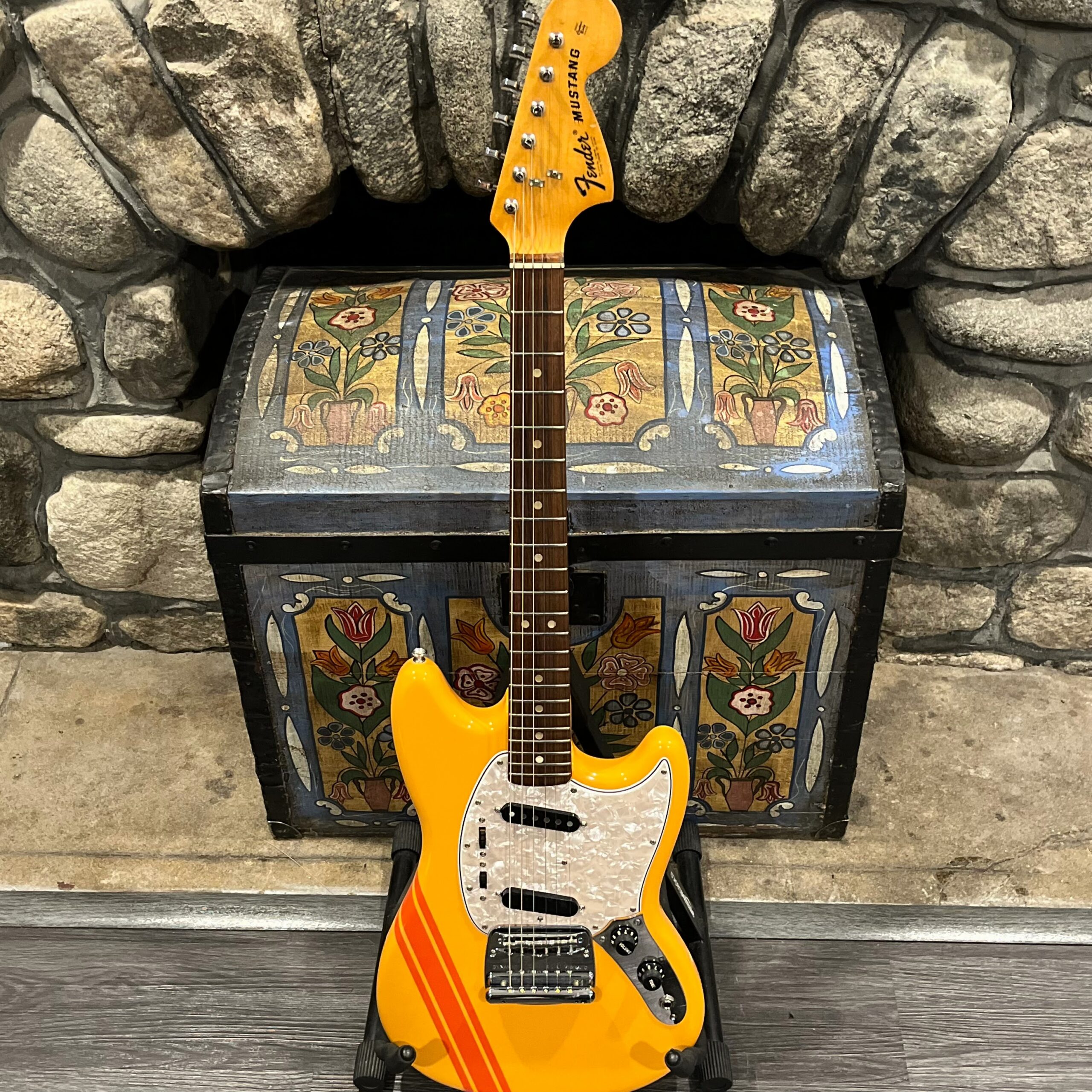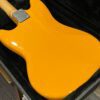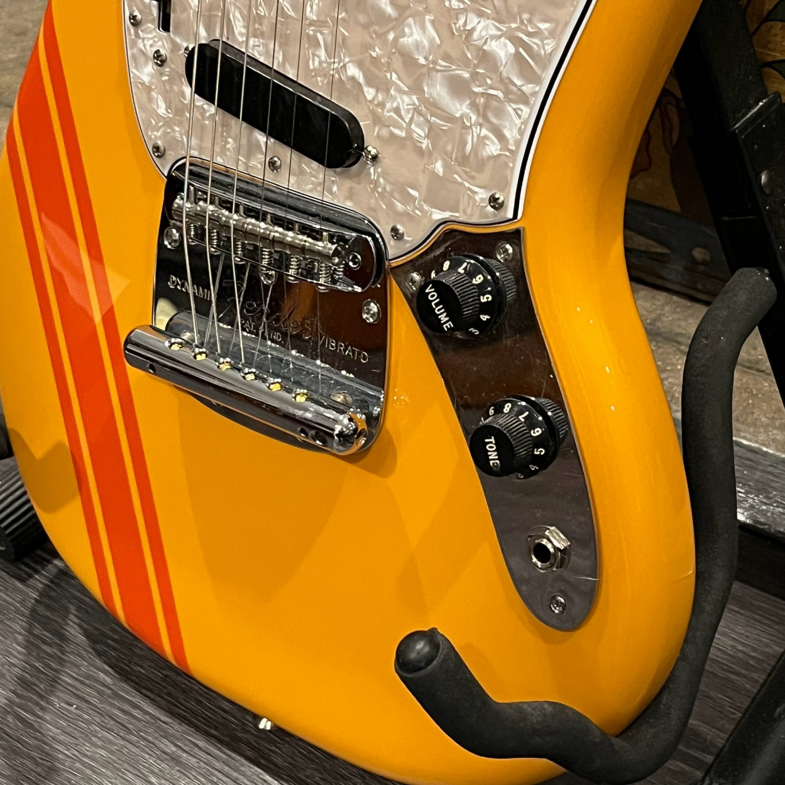 A beautiful marriage of old and new parts – with a modern 2025 Vintera Capri Orange MG-73 Competition body with vintage pickups, but the star of the show is the neck, it’s an original 1975 USA Fender Mustang 24″ rosewood neck with pearloid dots and matching neckplate dating to 1975, with new reproduction Fender F style tuners applied to the old wood. Lots of wear, as you’d expect from something now pushing past 50-years-old. The string trees are original to the neck, as is the finish on the neck and the decals. Frets fresh crowned and leveled and a new bone nut cut by the guys at Eric’s Guitar in Van Nuys, CA.