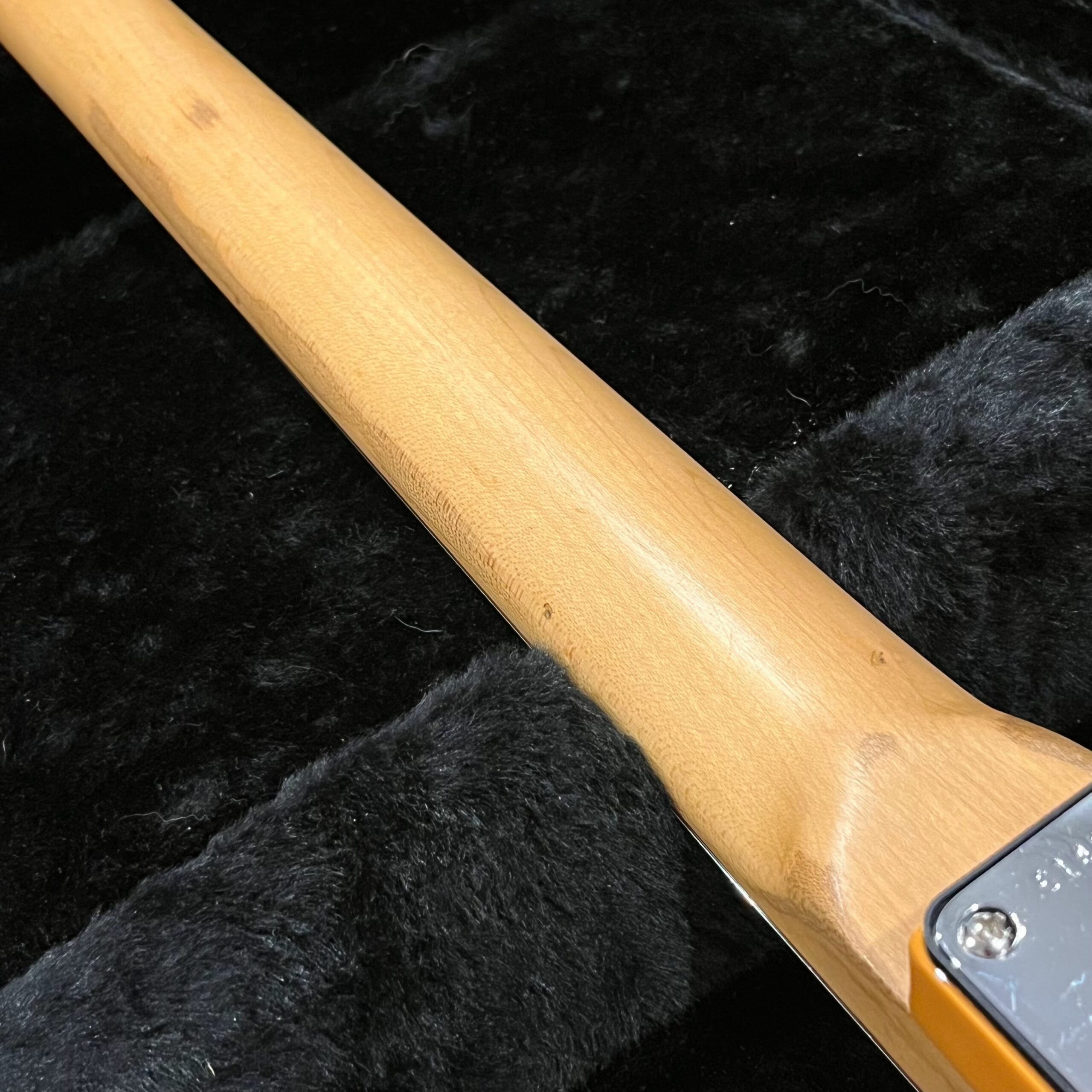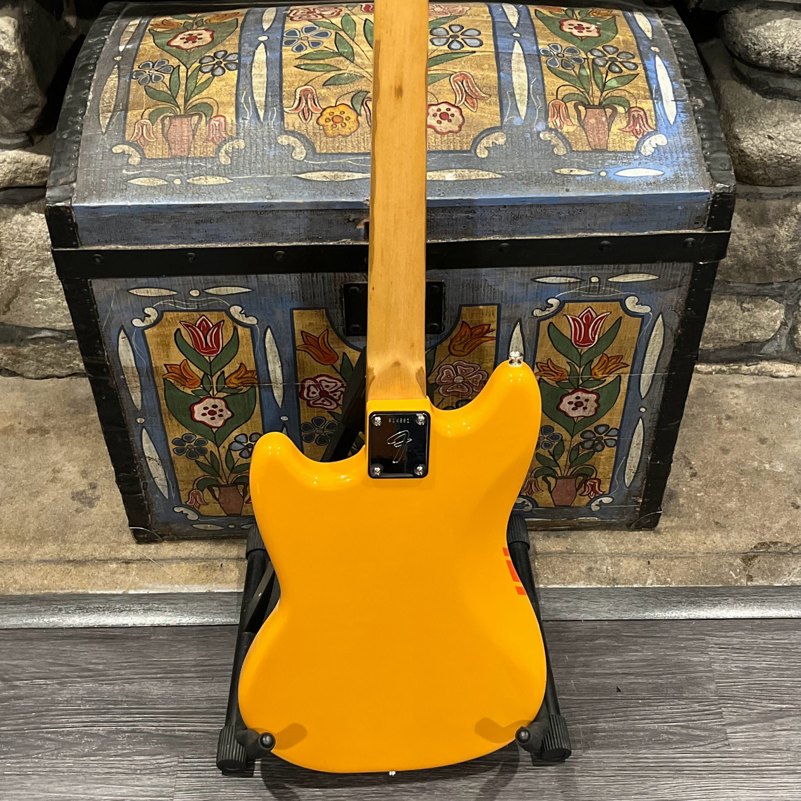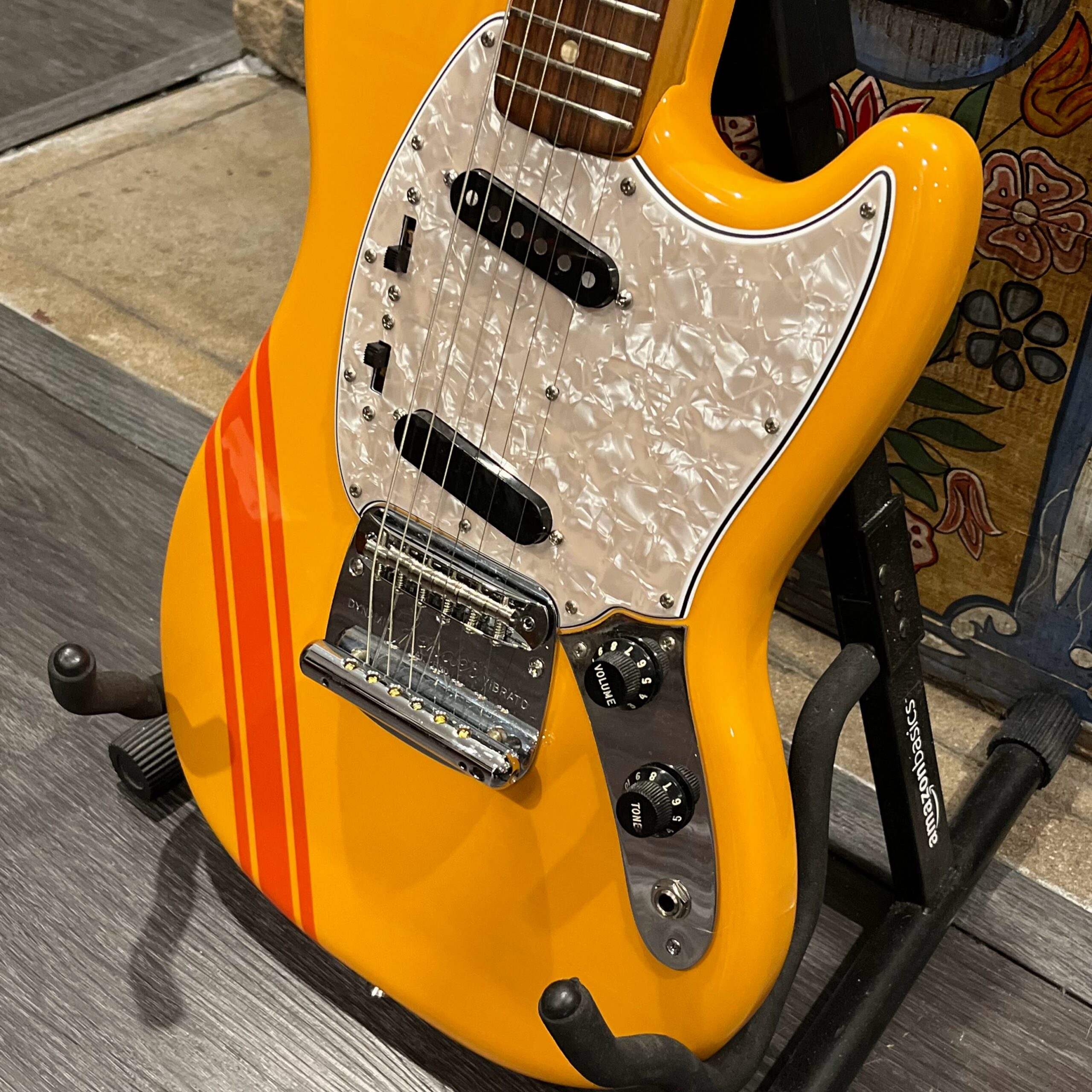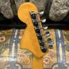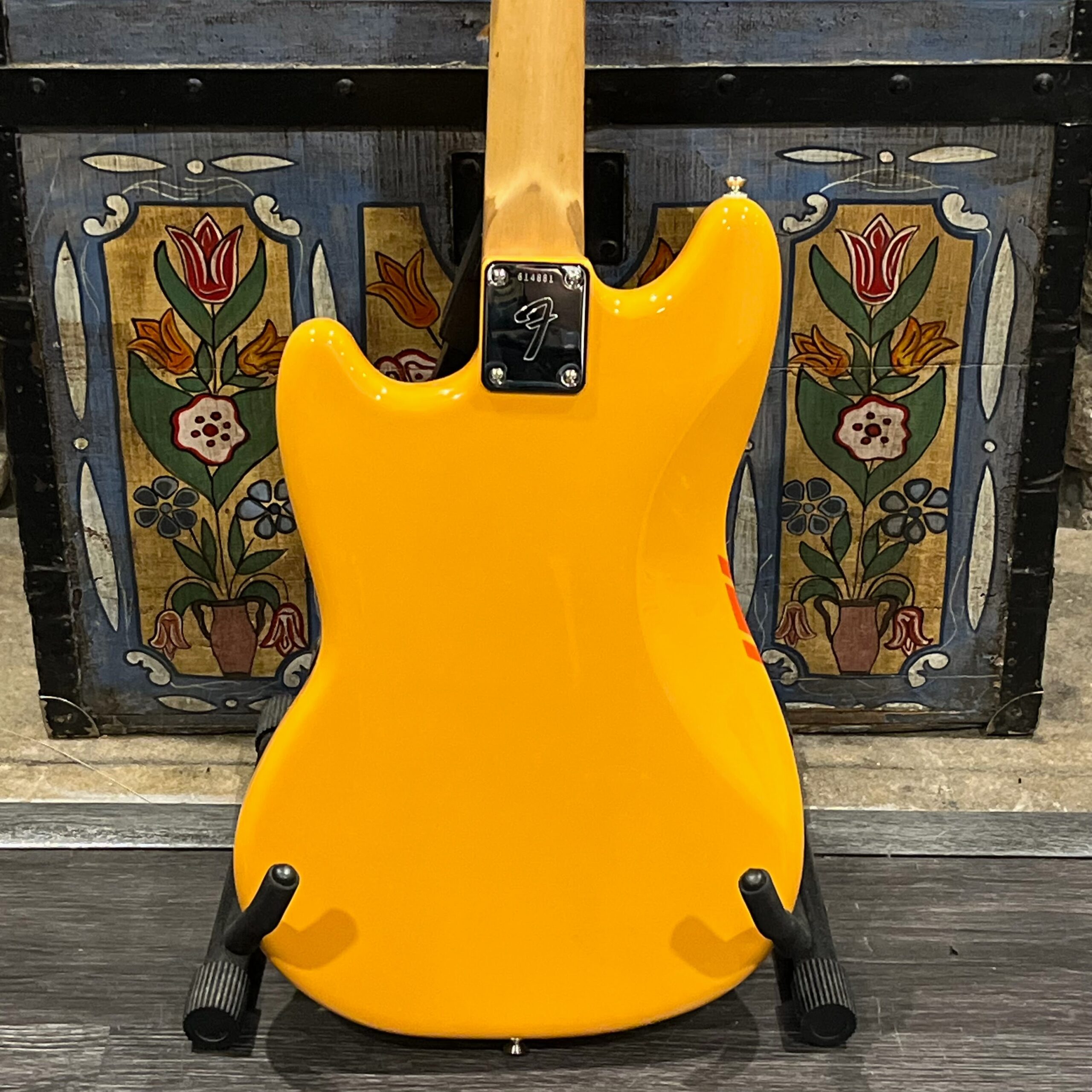 A beautiful marriage of old and new parts – with a modern 2025 Vintera Capri Orange MG-73 Competition body with vintage pickups, but the star of the show is the neck, it’s an original 1975 USA Fender Mustang 24″ rosewood neck with pearloid dots and matching neckplate dating to 1975, with new reproduction Fender F style tuners applied to the old wood. Lots of wear, as you’d expect from something now pushing past 50-years-old. The string trees are original to the neck, as is the finish on the neck and the decals. Frets fresh crowned and leveled and a new bone nut cut by the guys at Eric’s Guitar in Van Nuys, CA.
