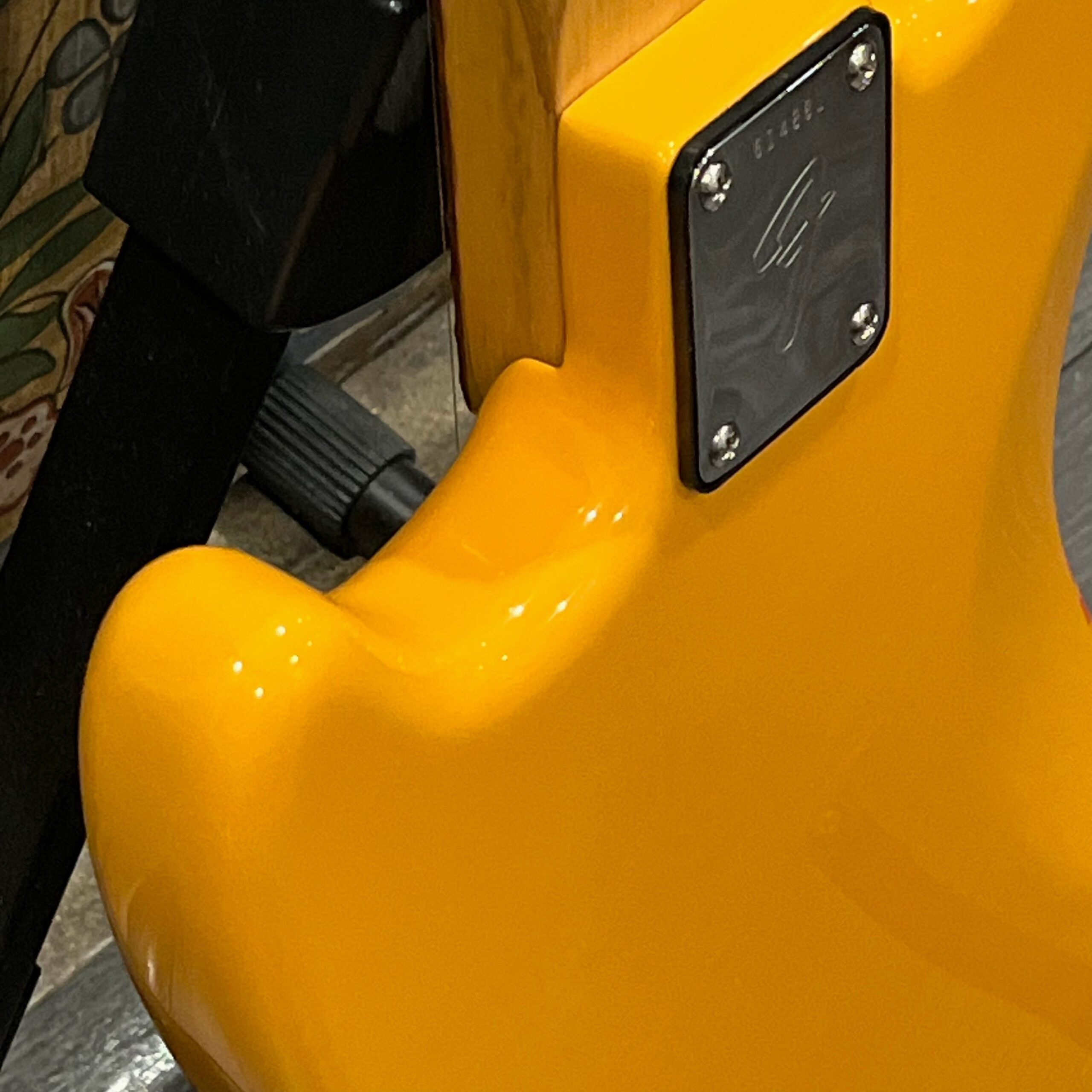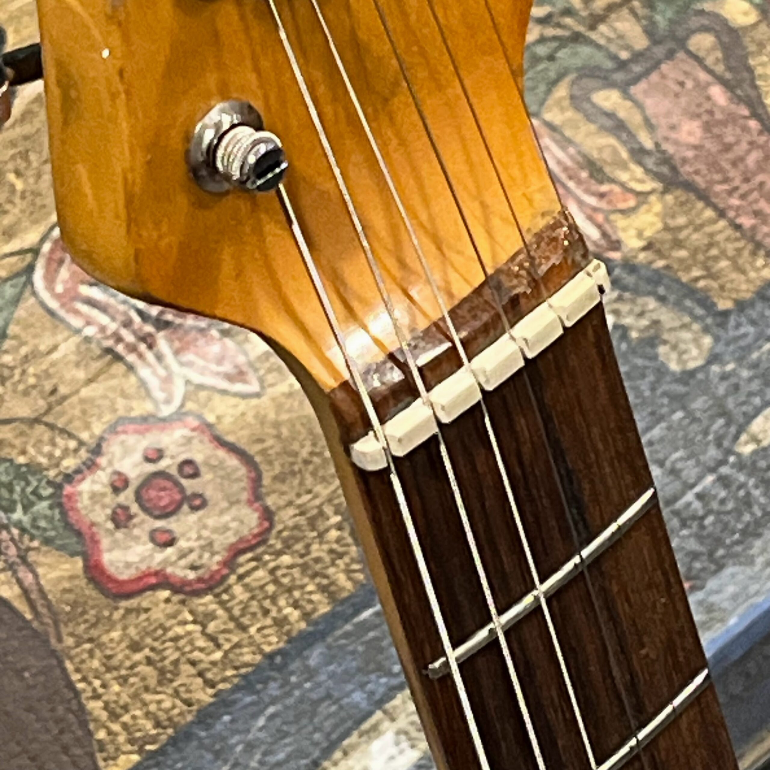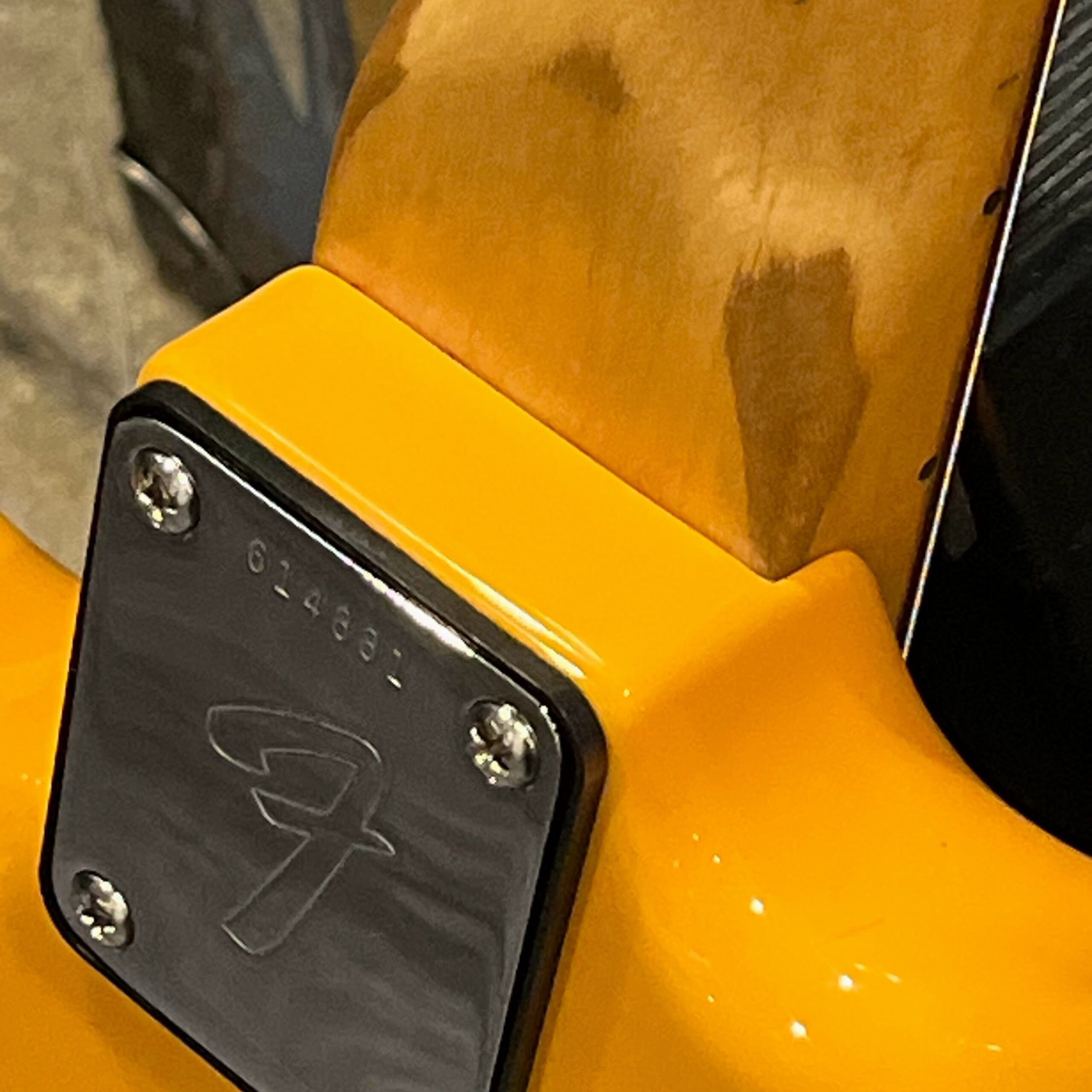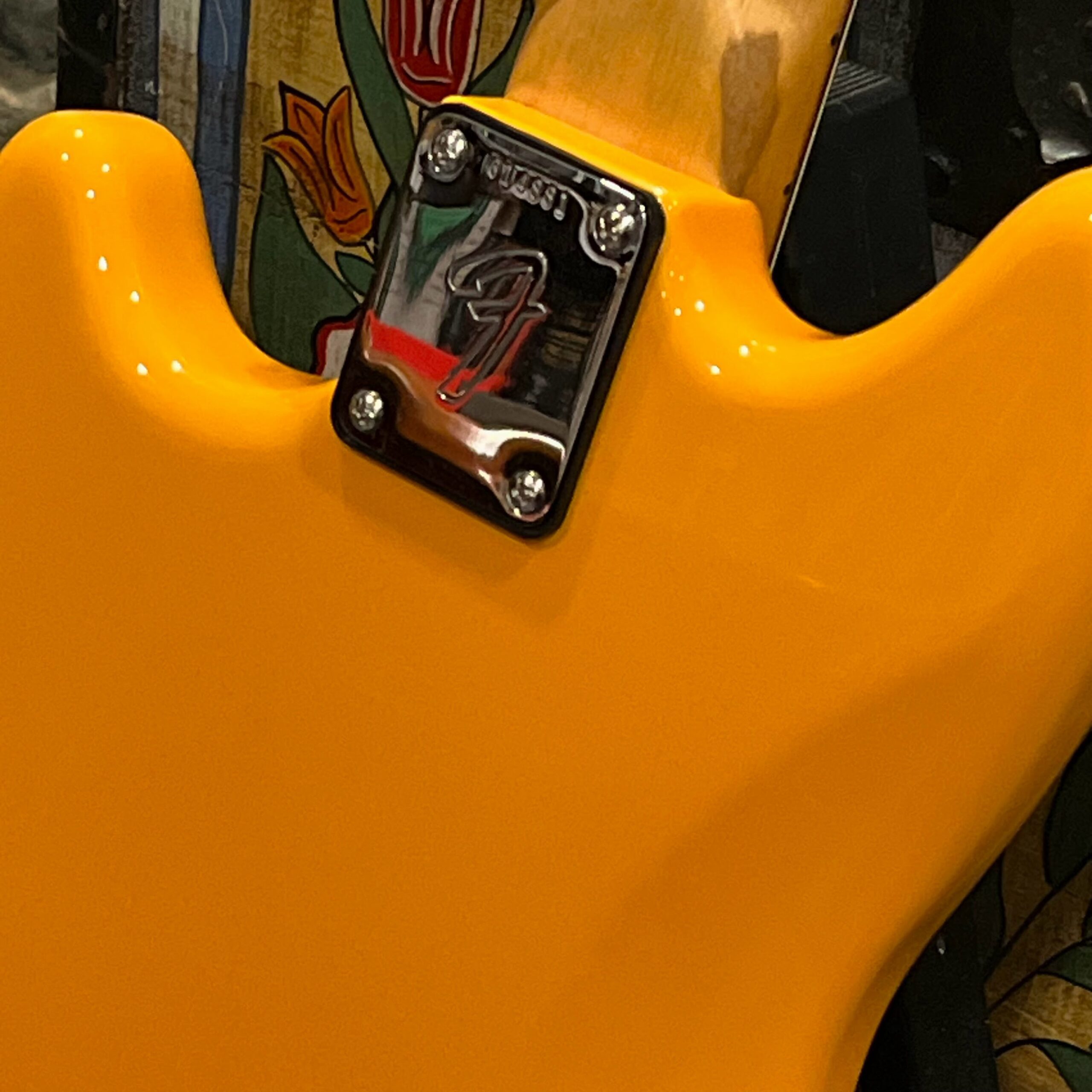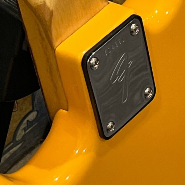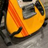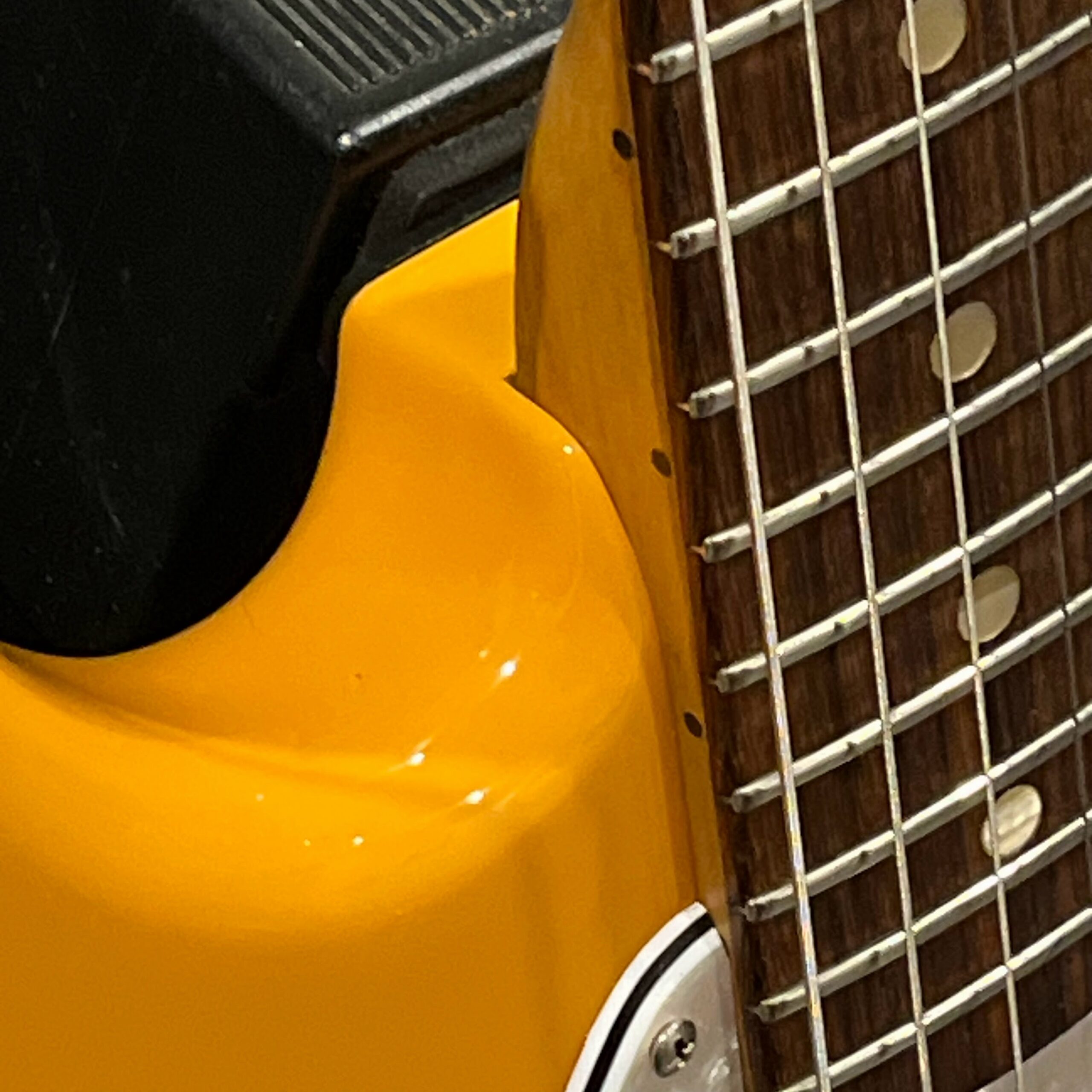 A beautiful marriage of old and new parts – with a modern 2025 Vintera Capri Orange MG-73 Competition body with vintage pickups, but the star of the show is the neck, it’s an original 1975 USA Fender Mustang 24″ rosewood neck with pearloid dots and matching neckplate dating to 1975, with new reproduction Fender F style tuners applied to the old wood. Lots of wear, as you’d expect from something now pushing past 50-years-old. The string trees are original to the neck, as is the finish on the neck and the decals. Frets fresh crowned and leveled and a new bone nut cut by the guys at Eric’s Guitar in Van Nuys, CA.