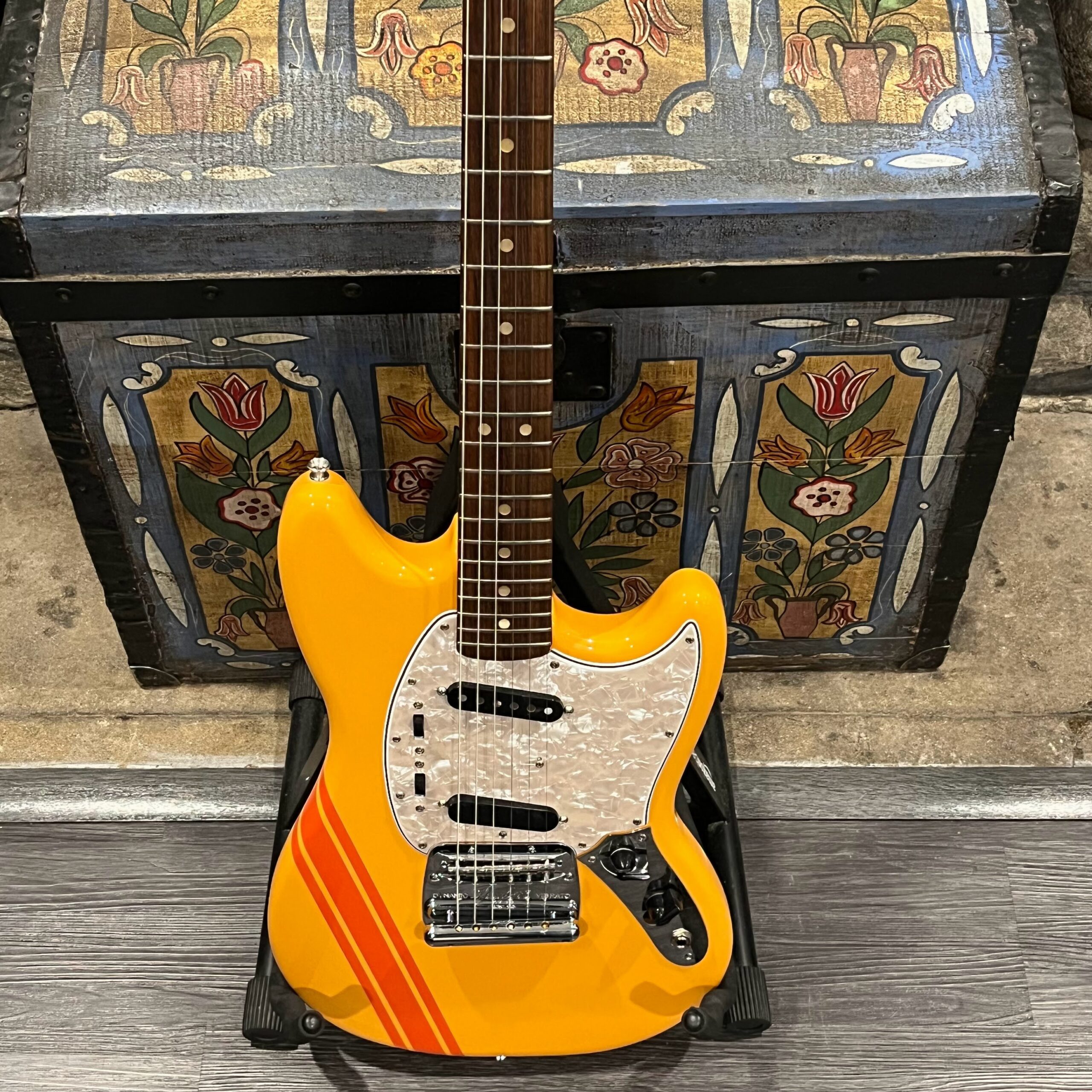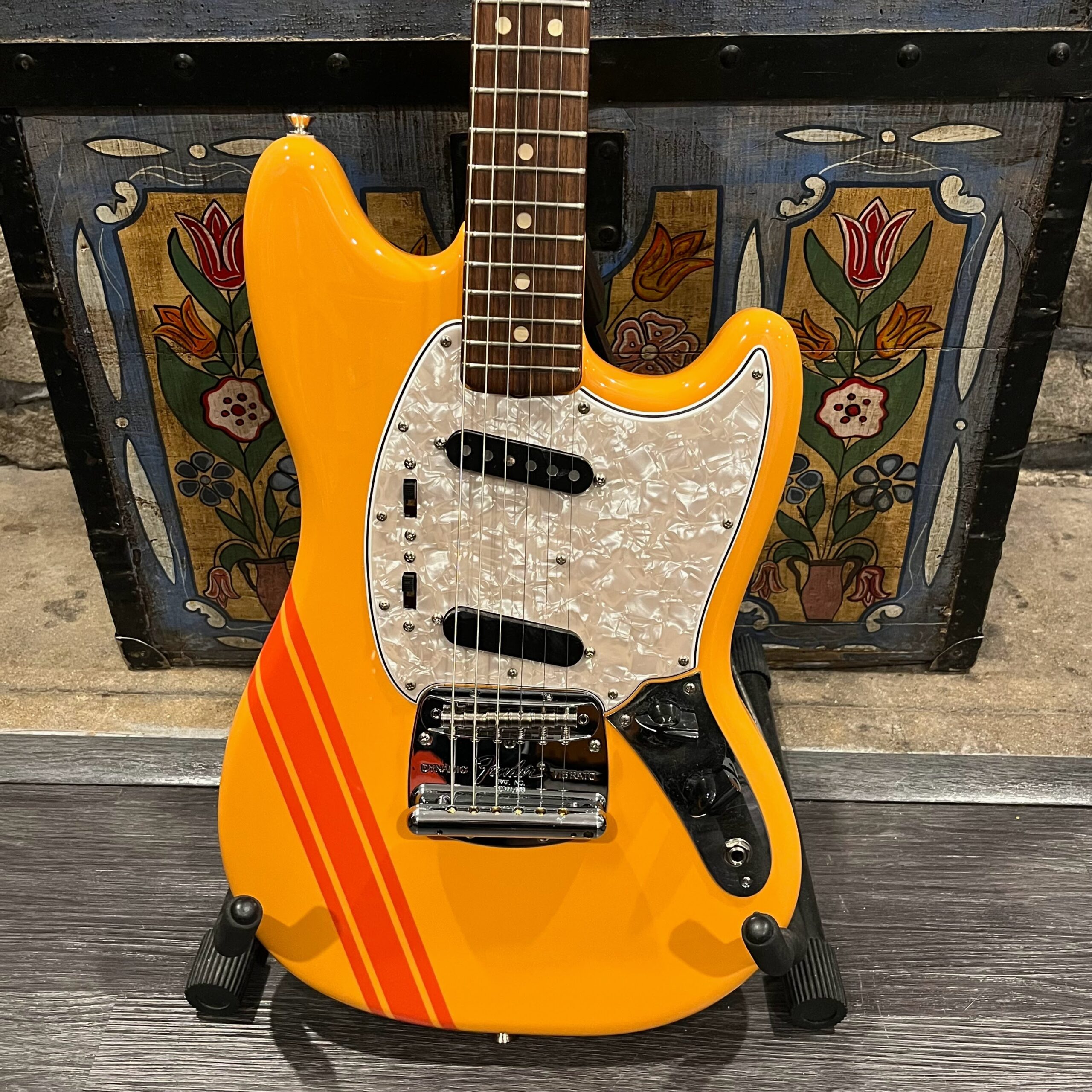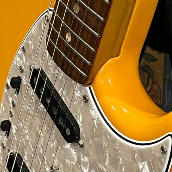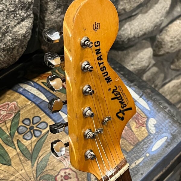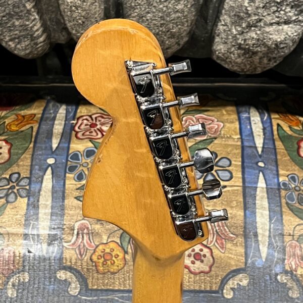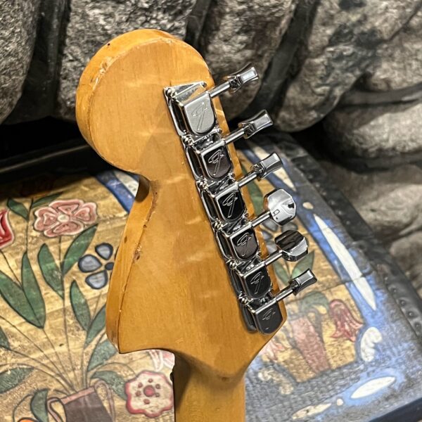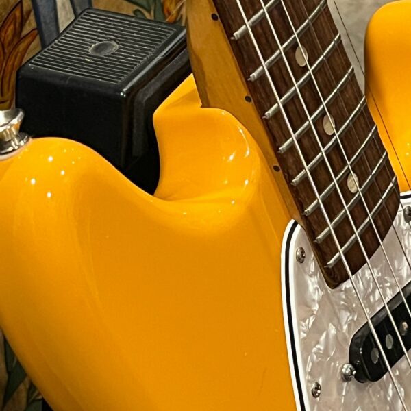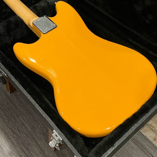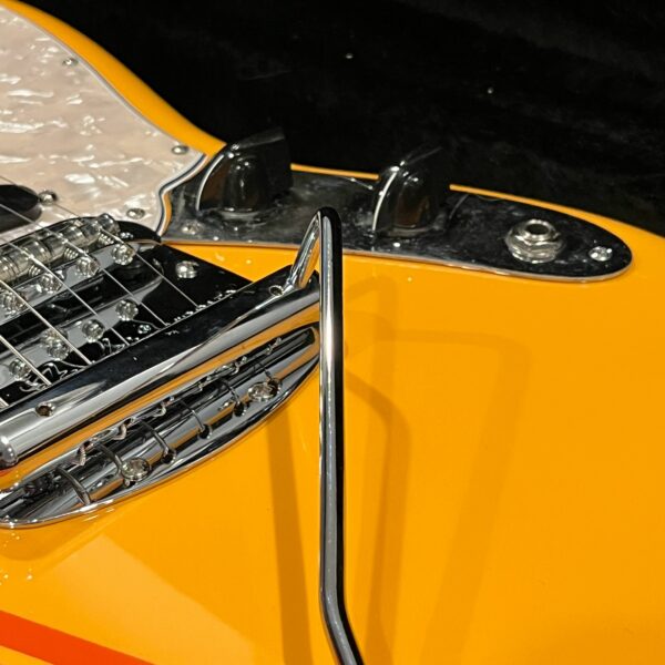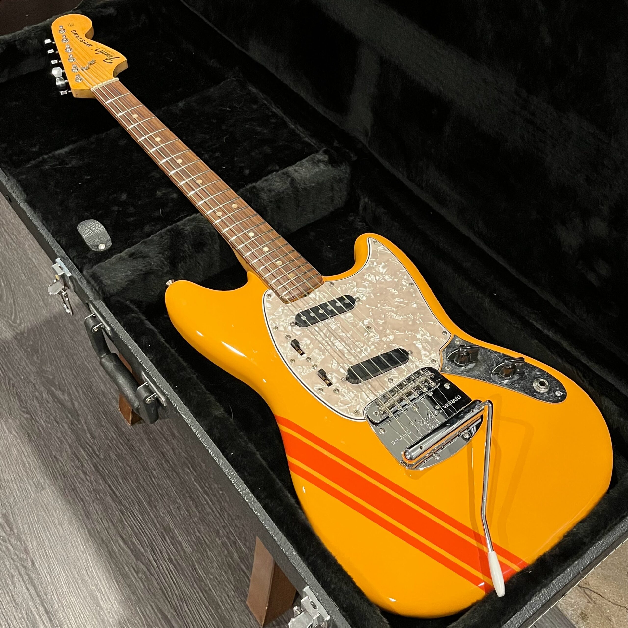 A beautiful marriage of old and new parts – with a modern 2025 Vintera Capri Orange MG-73 Competition body with vintage pickups, but the star of the show is the neck, it’s a real 1975 USA Fender rosewood neck with pearloid dots, with new Fender F style tuners applied to the old, old wood. Lots of wear, as you’d expect from something now pushing 50-years-old. The numbered F style neckplate is original to the neck, dates to 1975. The string trees are original to the instrument, as is the finish on the neck, so are the decals etc. The neck pickup reads 5.7k, the bridge reads a hot 9.1k. Chicken head knobs do duty on the Volume and Tone controls, a nice vintage looking touch. The frets are freshly leveled, crowned and polished by the guys at Eric’s Guitars in Van Nuys, California. Comes in an aftermarket hardcase with tremolo arm. All the usual in an out of phase switching is stock, all the wiring is of the vintage cloth type, makes lots of great noises, has mad energy, looks and feels great doing it. Weighs a lightweight 7lb and 4oz and is setup on 10s.