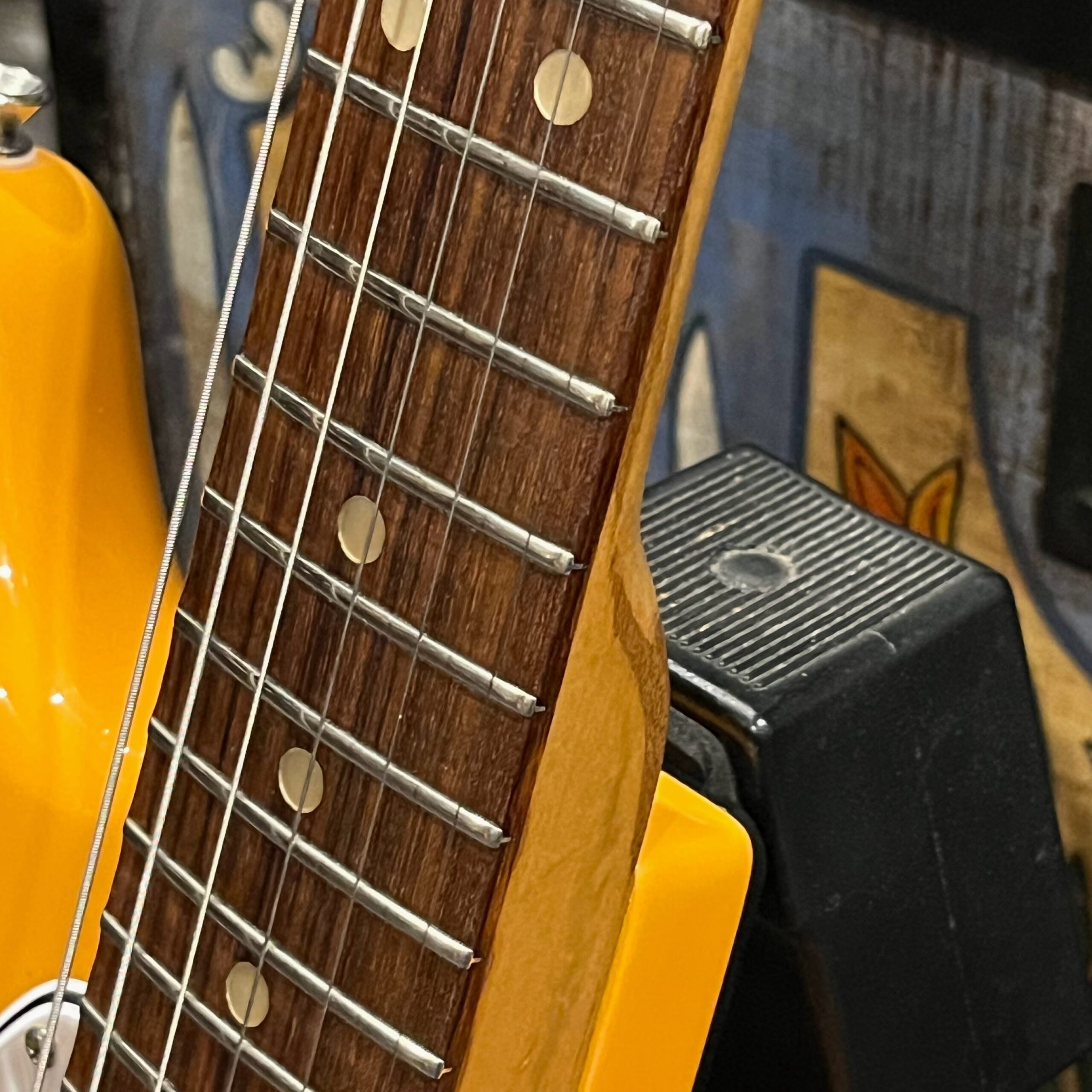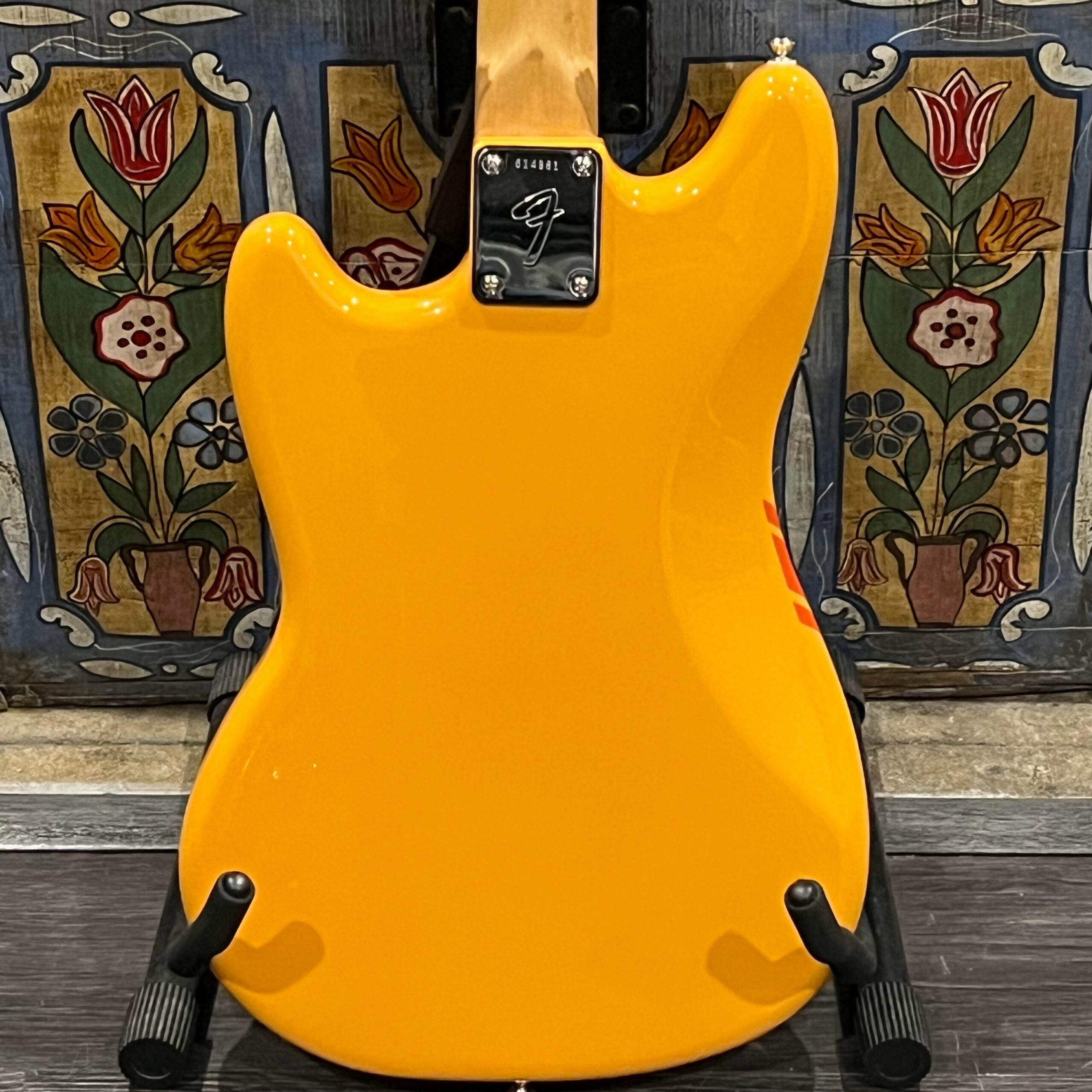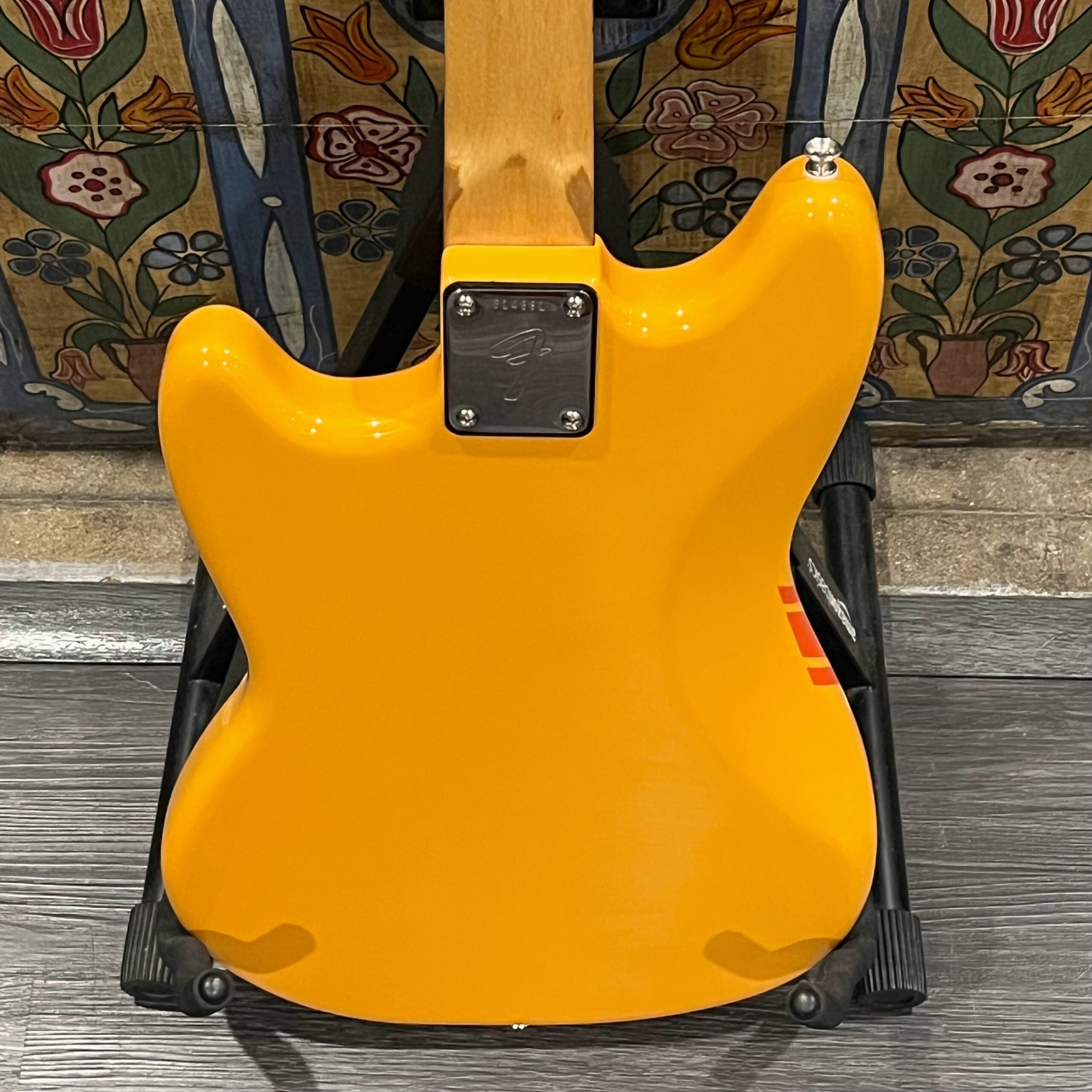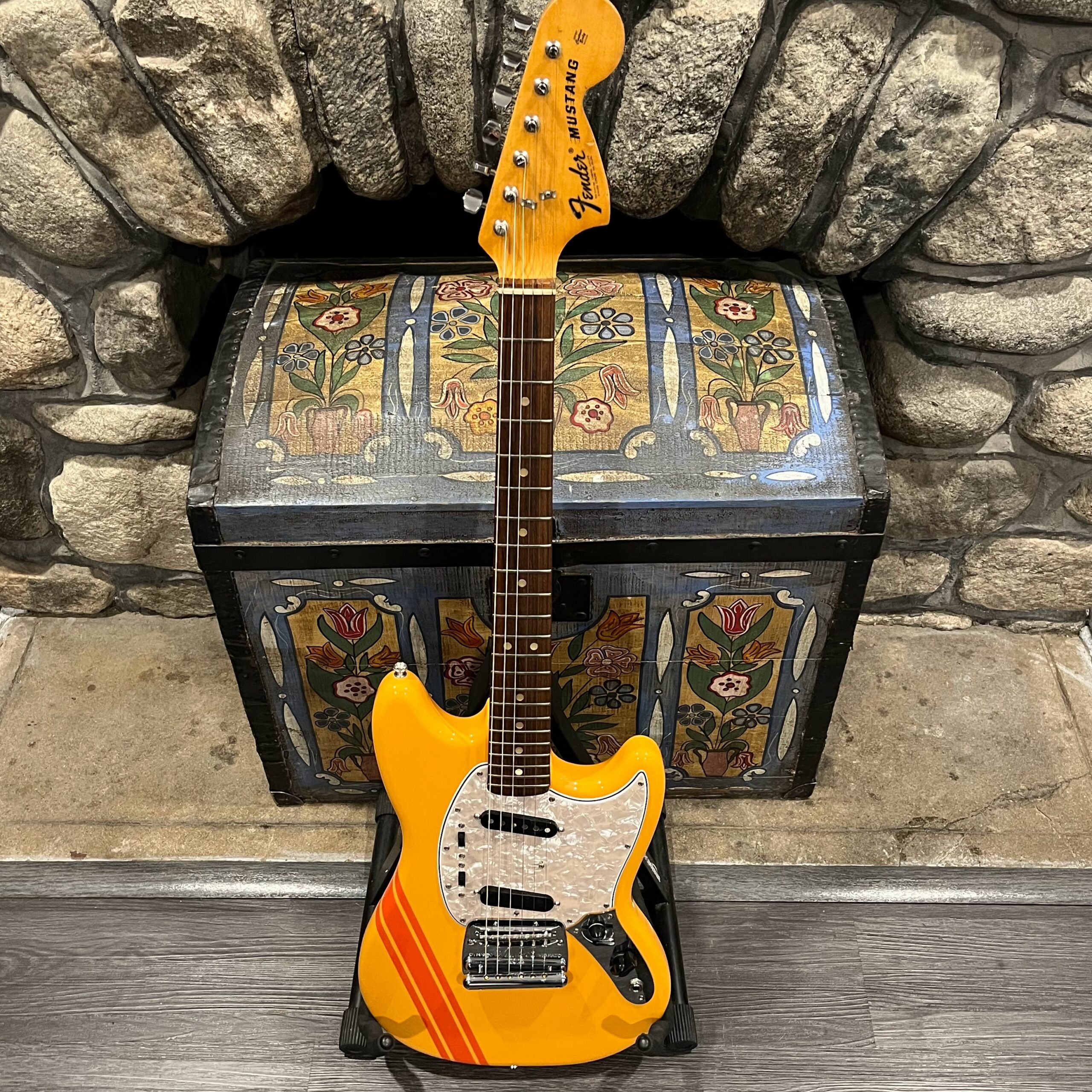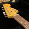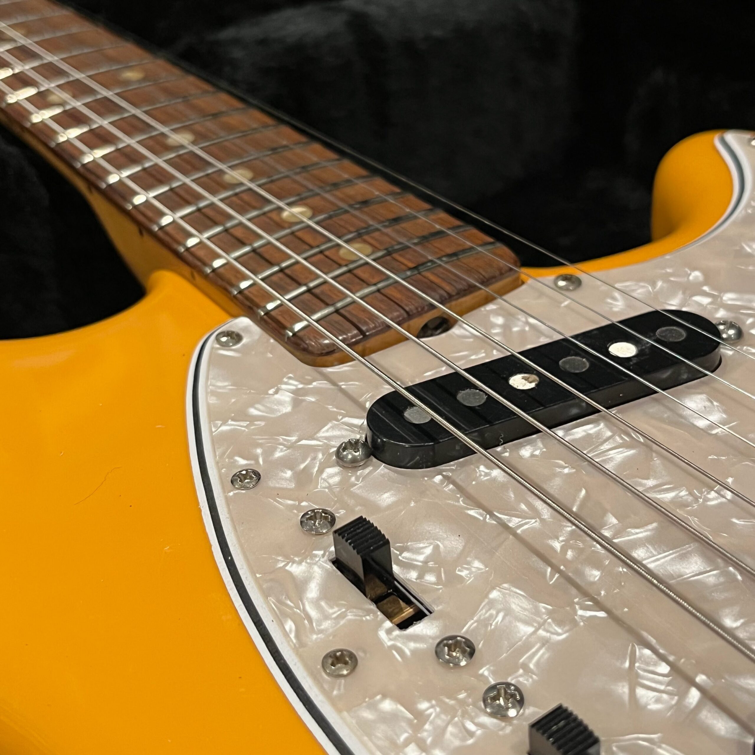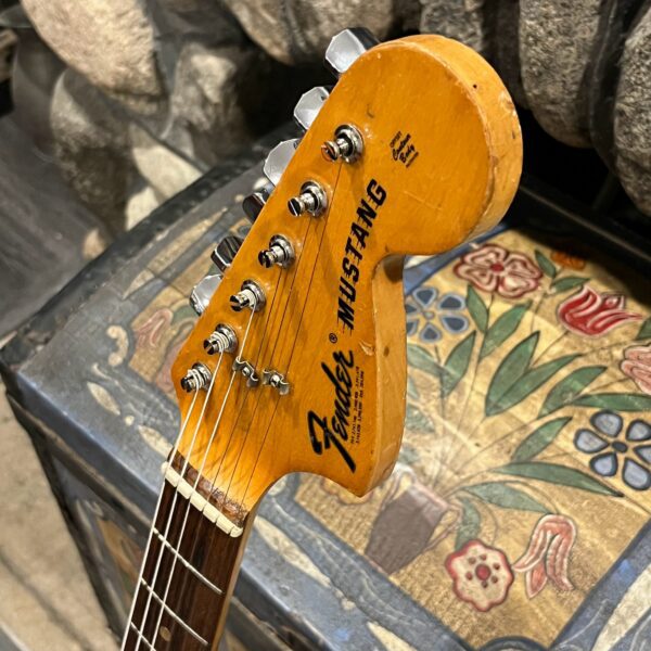 A beautiful marriage of old and new parts – with a modern 2025 Vintera Capri Orange MG-73 Competition body with vintage pickups, but the star of the show is the neck, it’s a real 1975 USA Fender rosewood neck with pearloid dots, with new Fender F style tuners applied to the old, old wood. Lots of wear, as you’d expect from something now pushing 50-years-old. The numbered F style neckplate is original to the neck, dates to 1975. The string trees are original to the instrument, as is the finish on the neck, so are the decals etc. The neck pickup reads 5.7k, the bridge reads a hot 9.1k. Chicken head knobs do duty on the Volume and Tone controls, a nice vintage looking touch. The frets are freshly leveled, crowned and polished by the guys at Eric’s Guitars in Van Nuys, California. Comes in an aftermarket hardcase with tremolo arm. All the usual in an out of phase switching is stock, all the wiring is of the vintage cloth type, makes lots of great noises, has mad energy, looks and feels great doing it. Weighs a lightweight 7lb and 4oz and is setup on 10s.