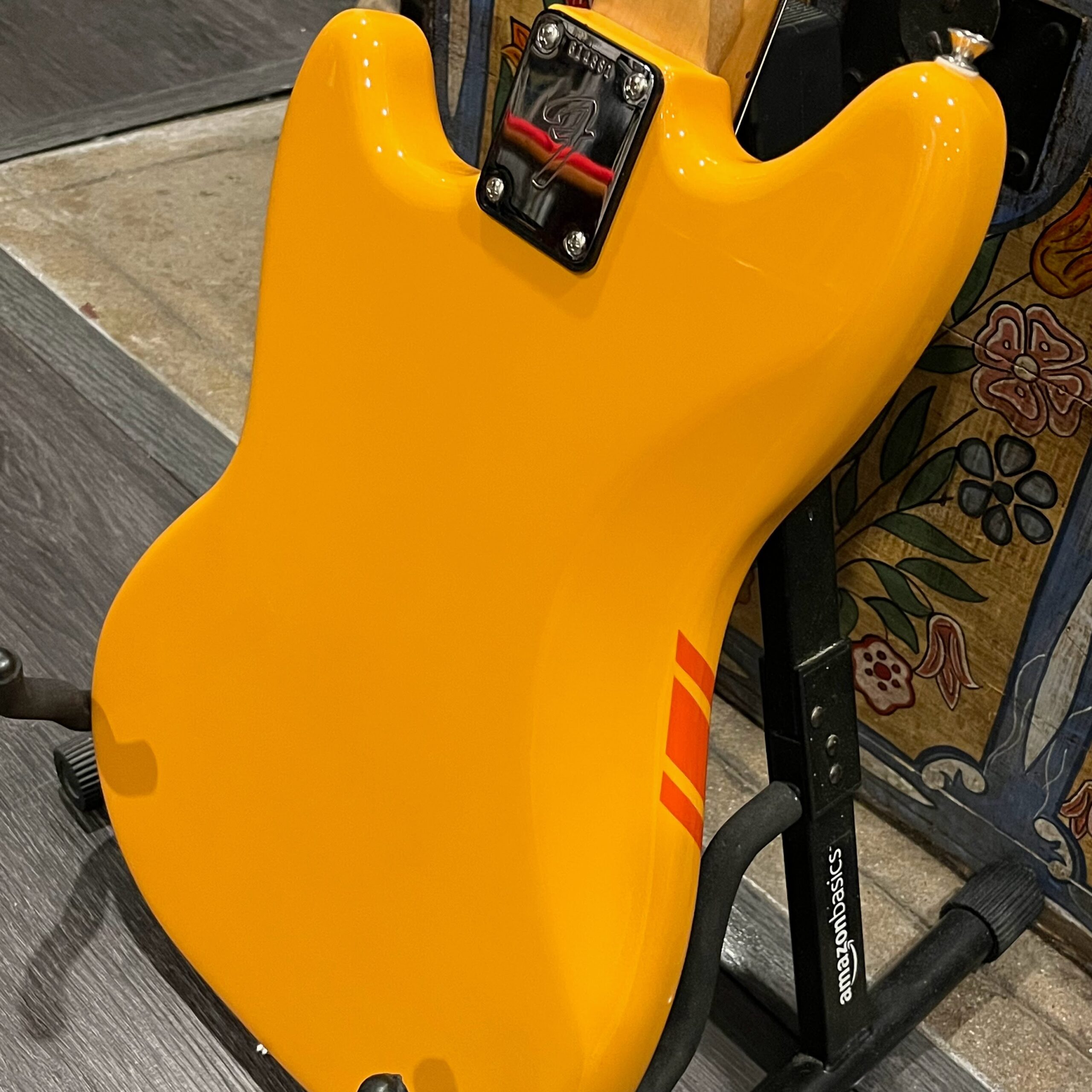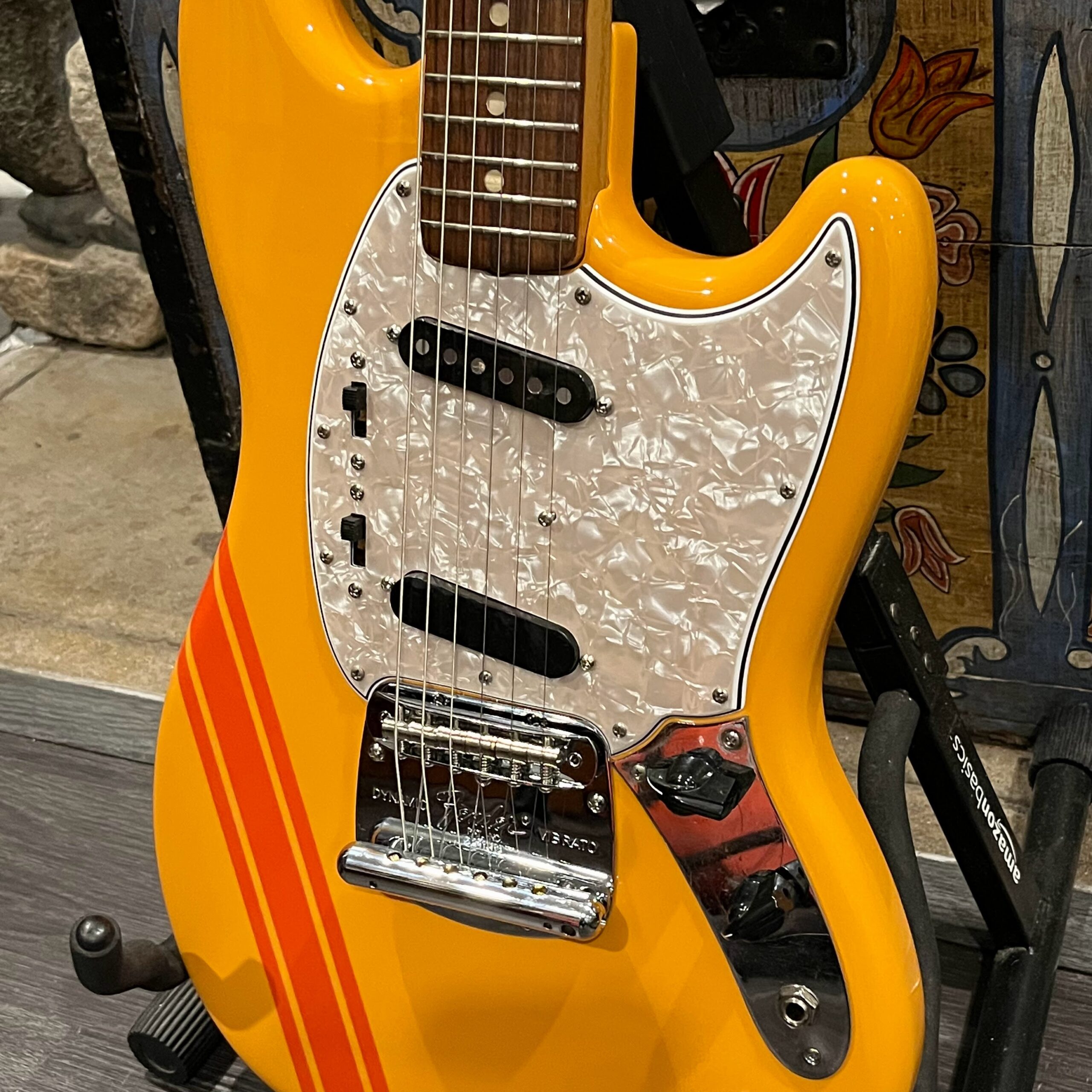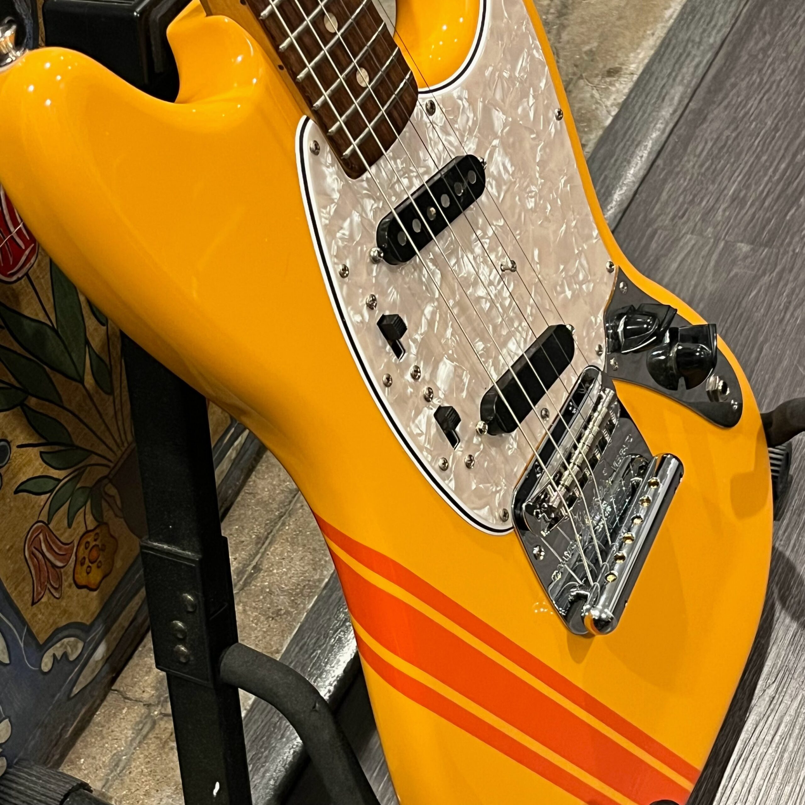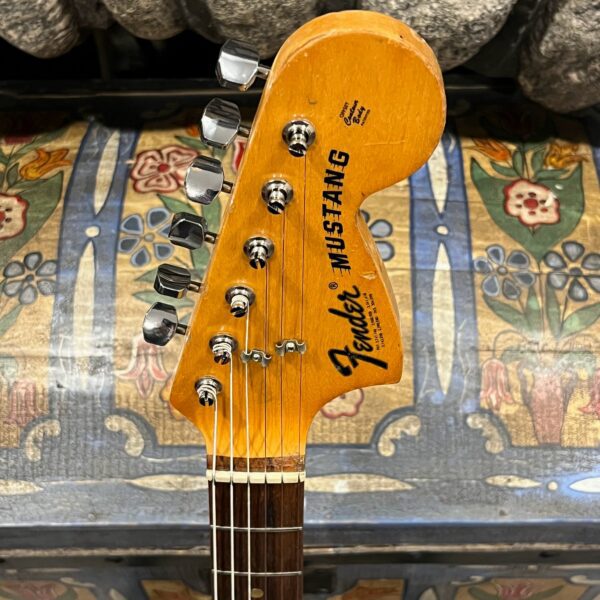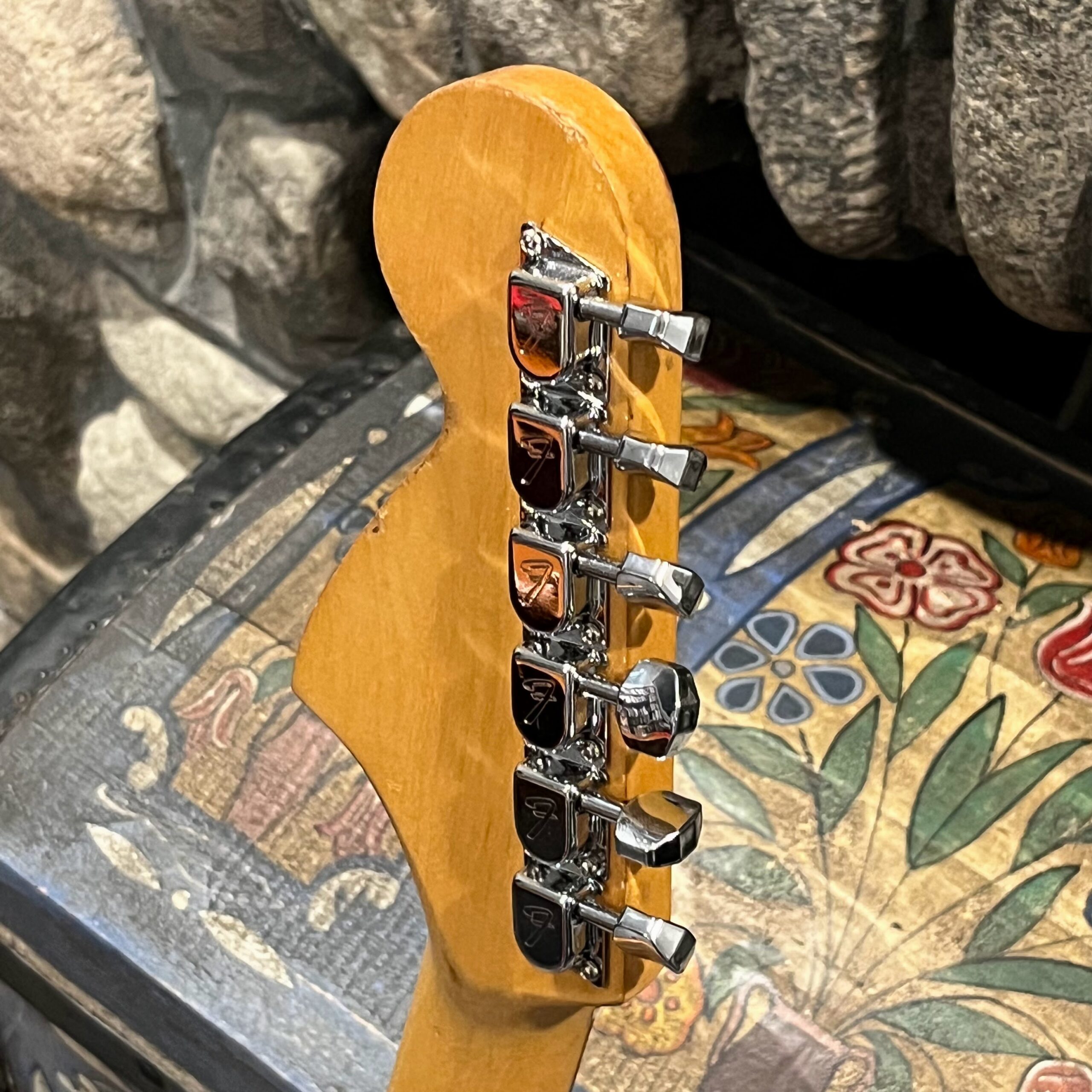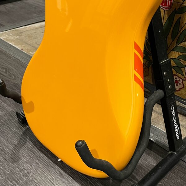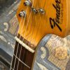 A beautiful marriage of old and new parts – with a modern 2025 Vintera Capri Orange MG-73 Competition body with vintage pickups, but the star of the show is the neck, it’s a real 1975 USA Fender rosewood neck with pearloid dots, with new Fender F style tuners applied to the old, old wood. Lots of wear, as you’d expect from something now pushing 50-years-old. The numbered F style neckplate is original to the neck, dates to 1975. The string trees are original to the instrument, as is the finish on the neck, so are the decals etc. The neck pickup reads 5.7k, the bridge reads a hot 9.1k. Chicken head knobs do duty on the Volume and Tone controls, a nice vintage looking touch. The frets are freshly leveled, crowned and polished by the guys at Eric’s Guitars in Van Nuys, California. Comes in an aftermarket hardcase with tremolo arm. All the usual in an out of phase switching is stock, all the wiring is of the vintage cloth type, makes lots of great noises, has mad energy, looks and feels great doing it. Weighs a lightweight 7lb and 4oz and is setup on 10s.