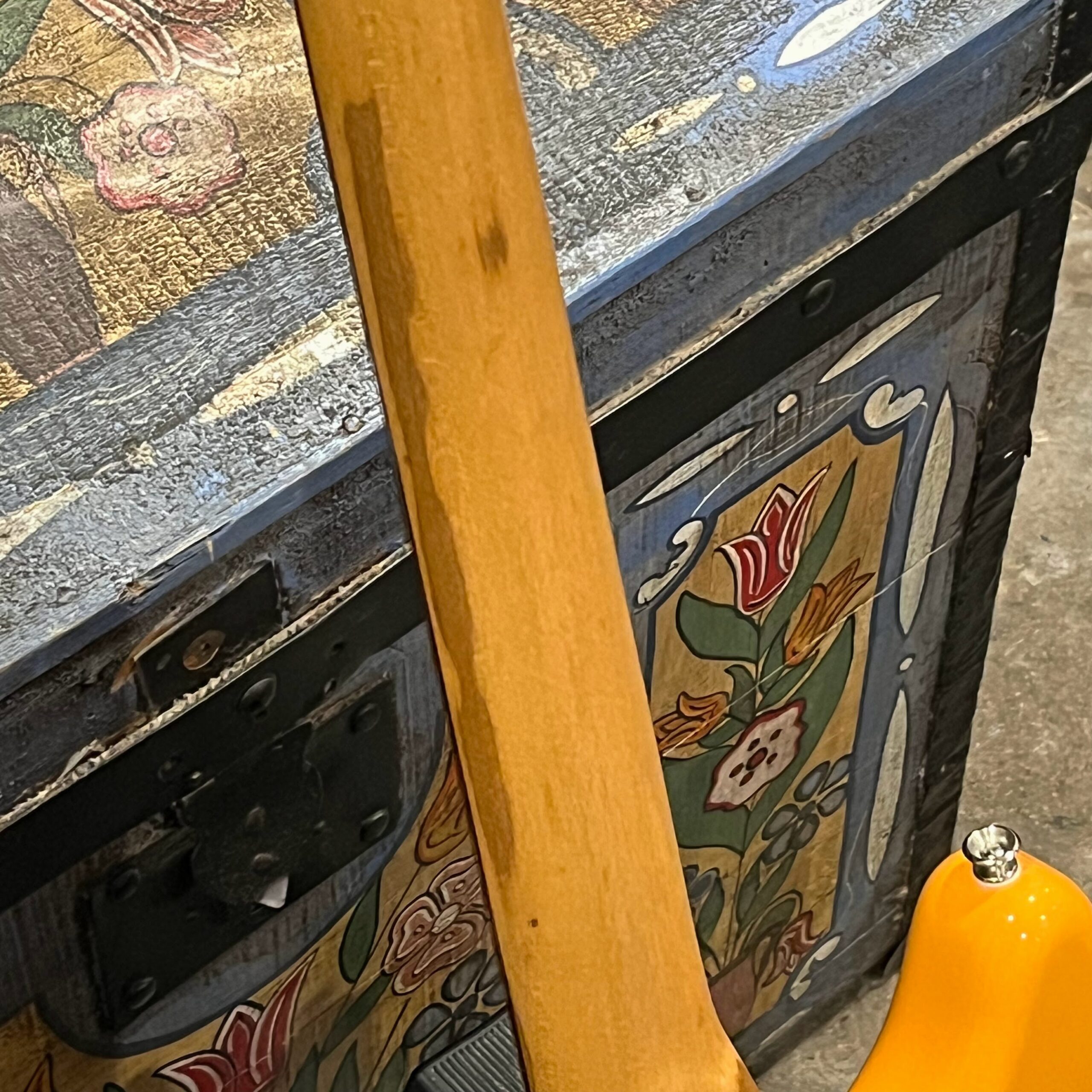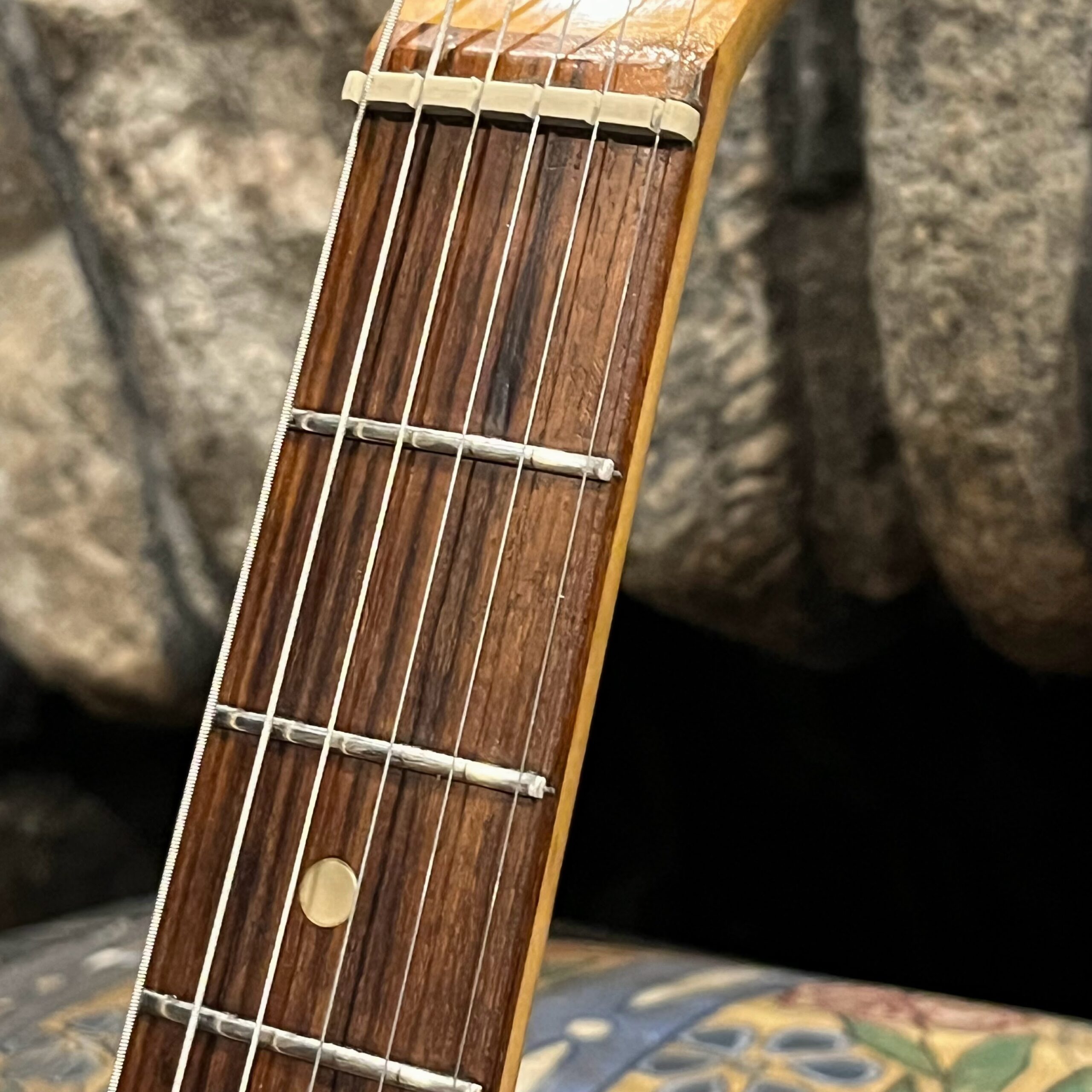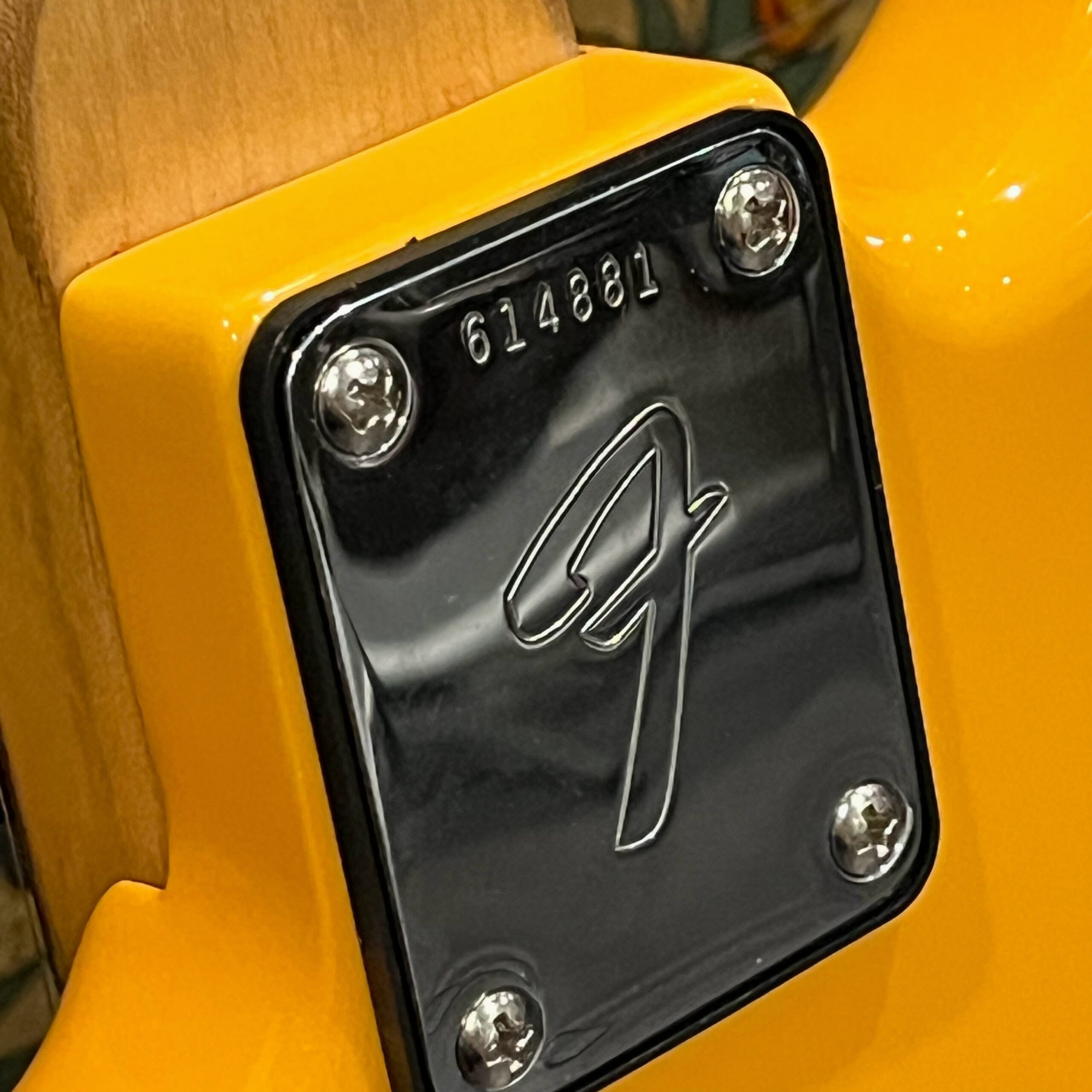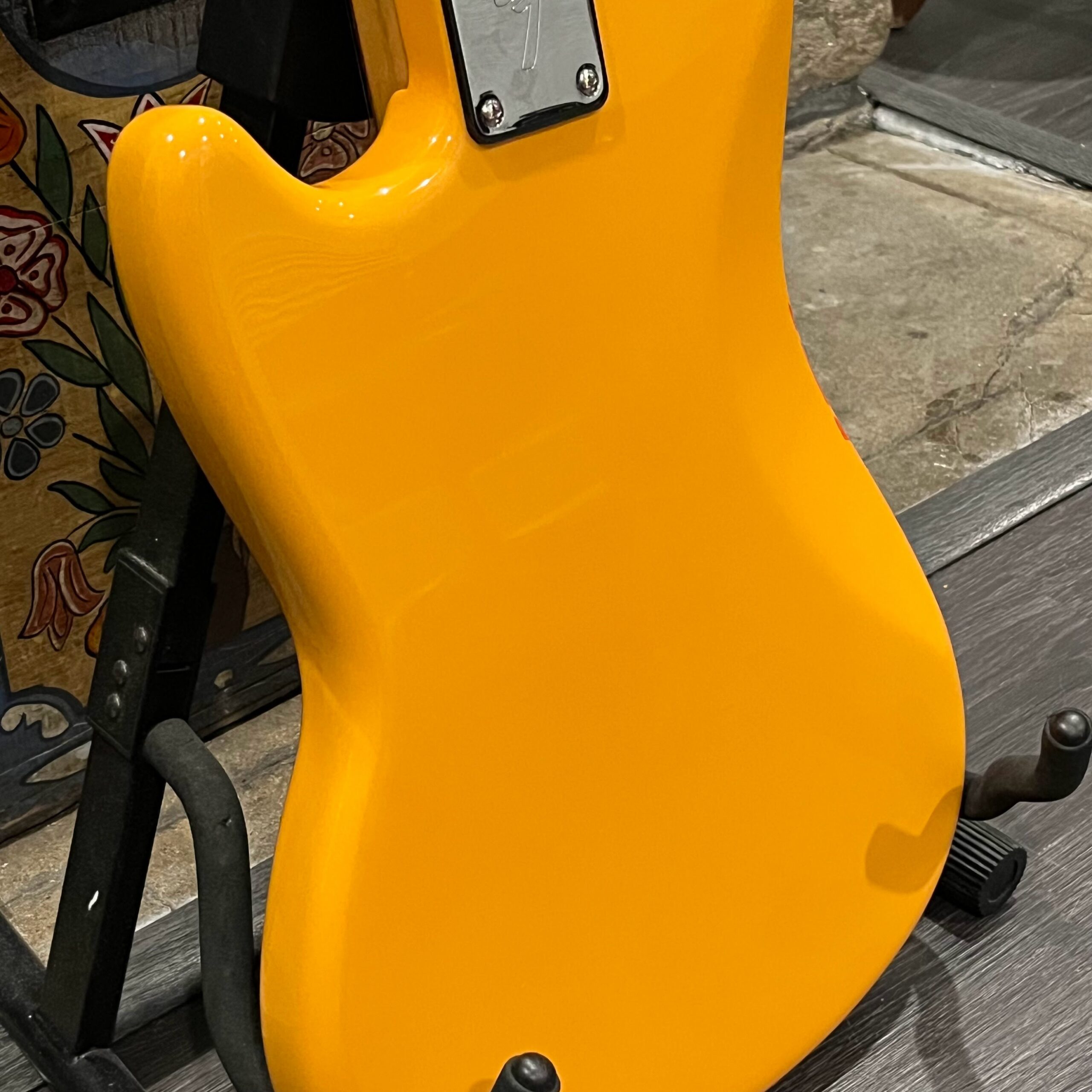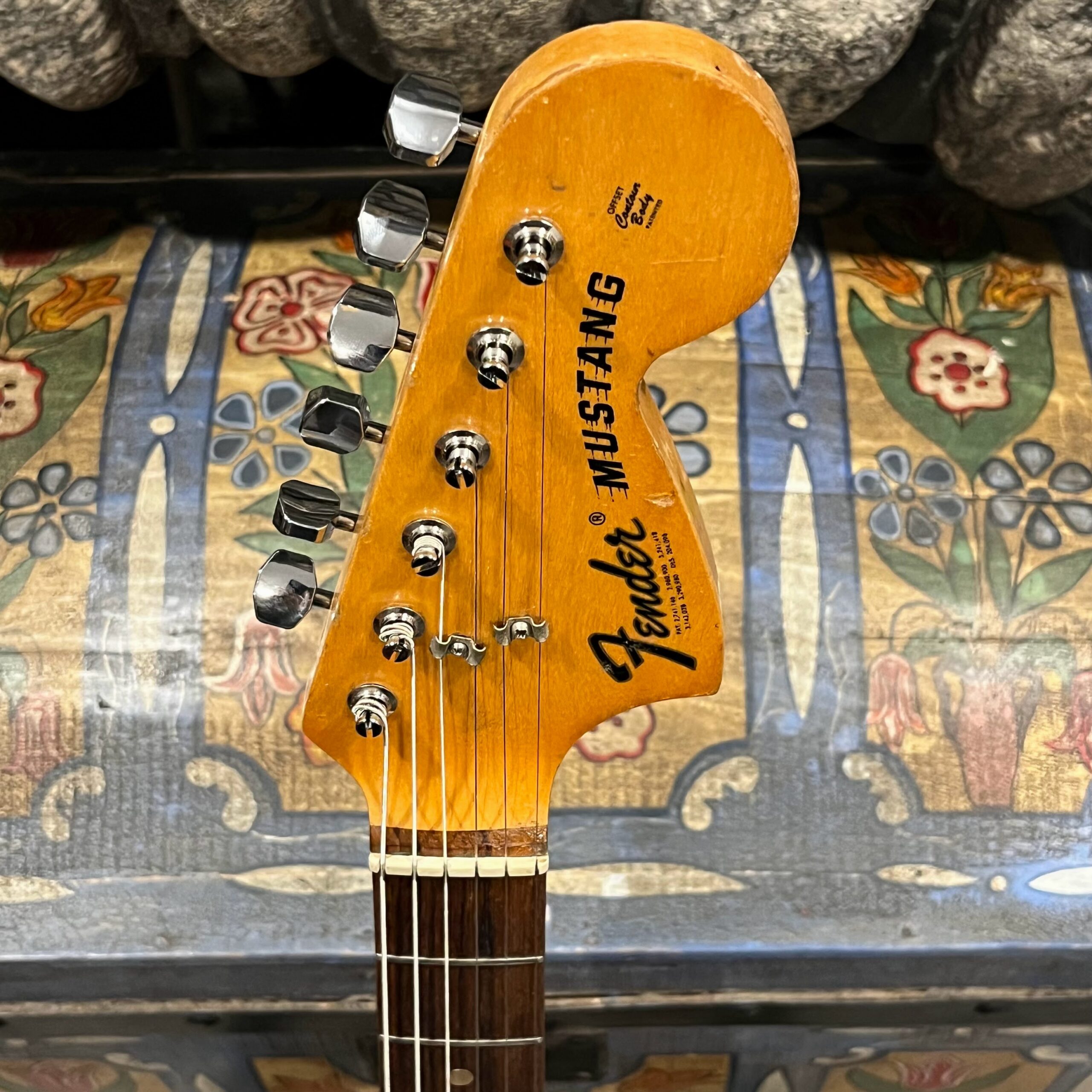 A beautiful marriage of old and new parts – with a modern 2025 Vintera Capri Orange MG-73 Competition body with vintage pickups, but the star of the show is the neck, it’s a real 1975 USA Fender rosewood neck with pearloid dots, with new Fender F style tuners applied to the old, old wood. Lots of wear, as you’d expect from something now pushing 50-years-old. The numbered F style neckplate is original to the neck, dates to 1975. The string trees are original to the instrument, as is the finish on the neck, so are the decals etc. The neck pickup reads 5.7k, the bridge reads a hot 9.1k. Chicken head knobs do duty on the Volume and Tone controls, a nice vintage looking touch. The frets are freshly leveled, crowned and polished by the guys at Eric’s Guitars in Van Nuys, California. Comes in an aftermarket hardcase with tremolo arm. All the usual in an out of phase switching is stock, all the wiring is of the vintage cloth type, makes lots of great noises, has mad energy, looks and feels great doing it. Weighs a lightweight 7lb and 4oz and is setup on 10s.