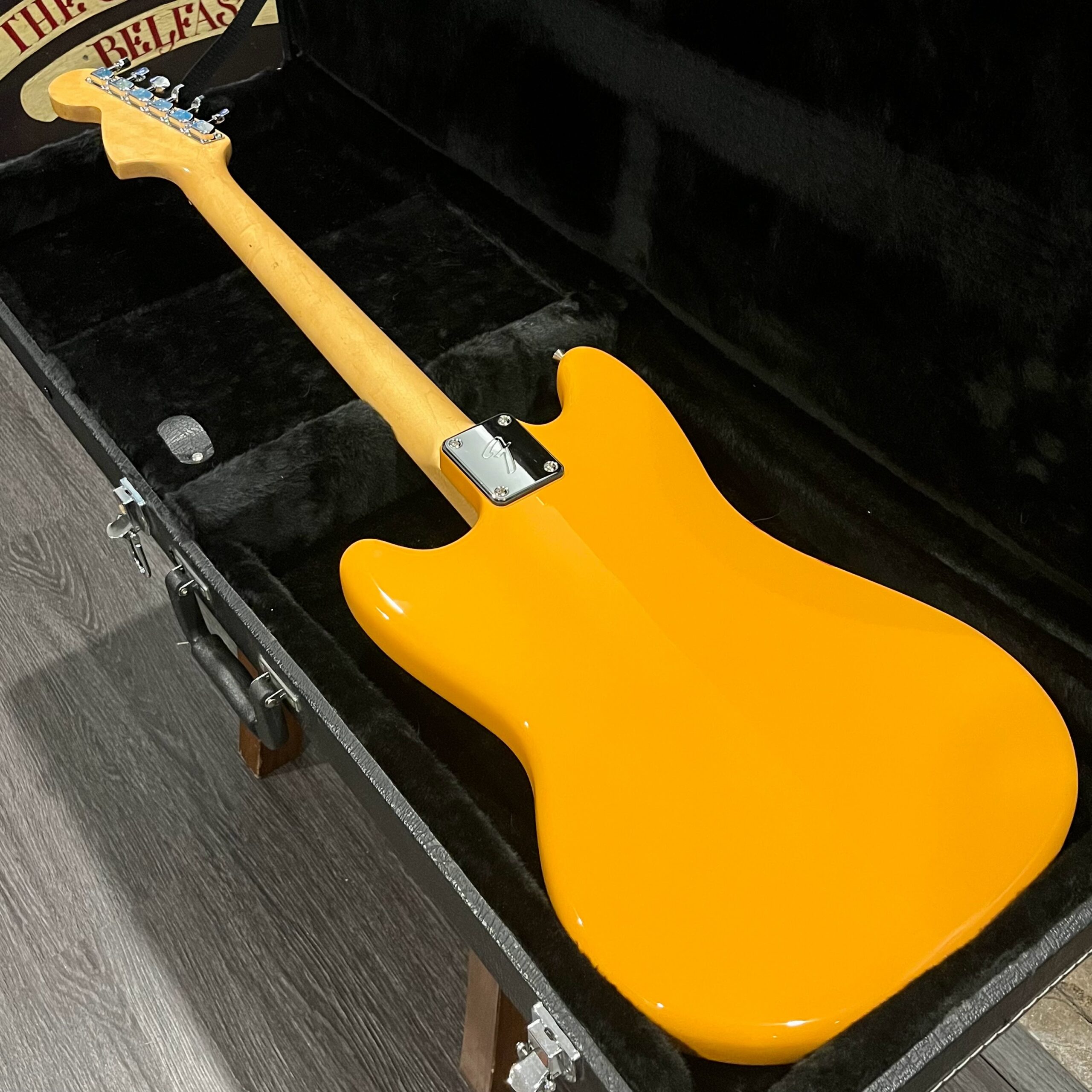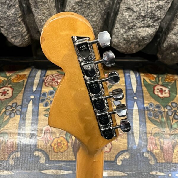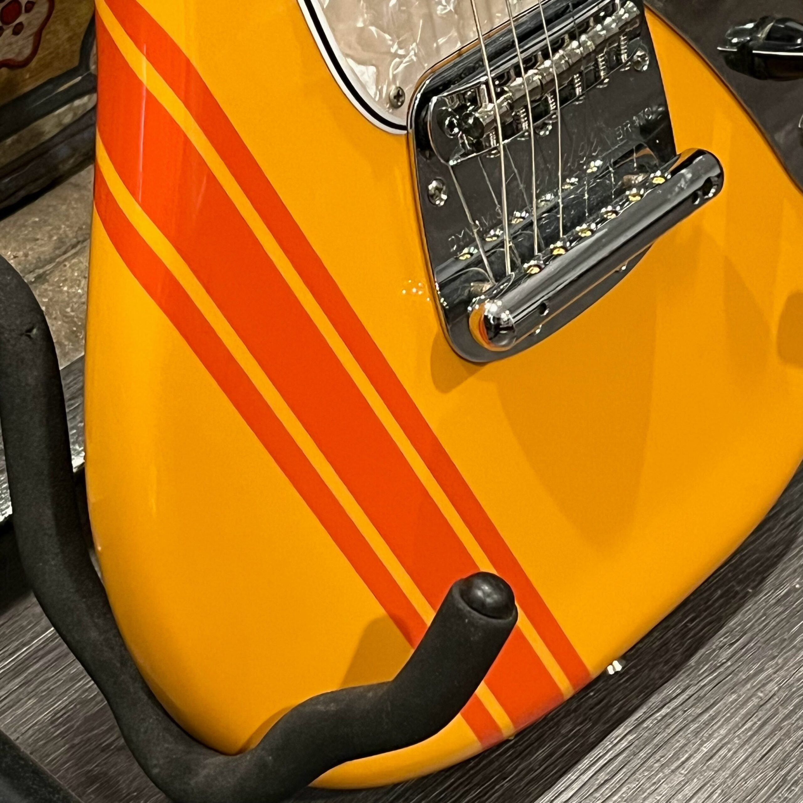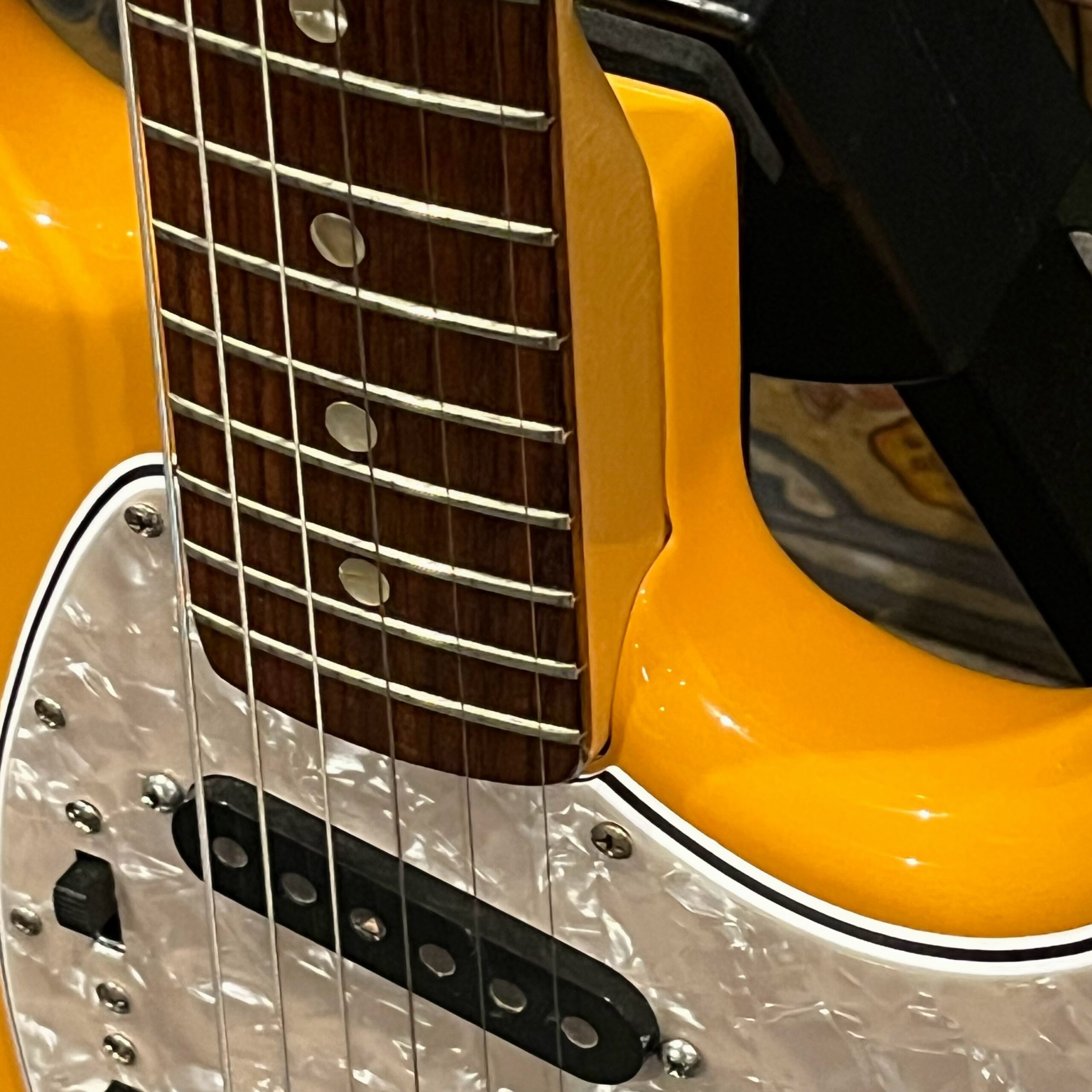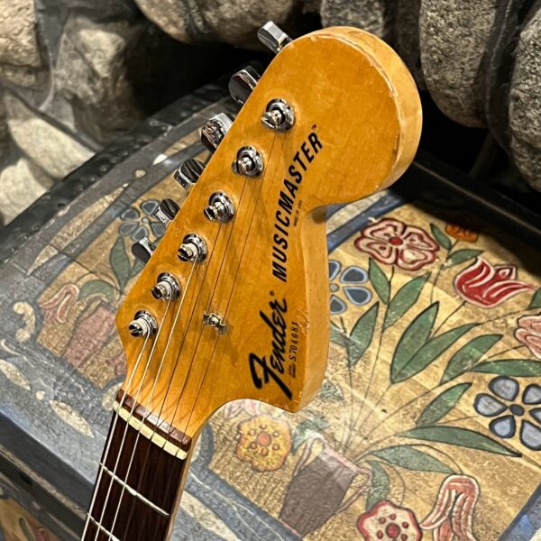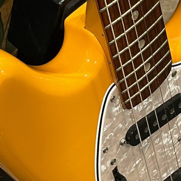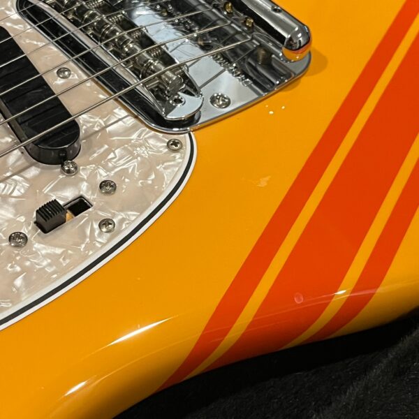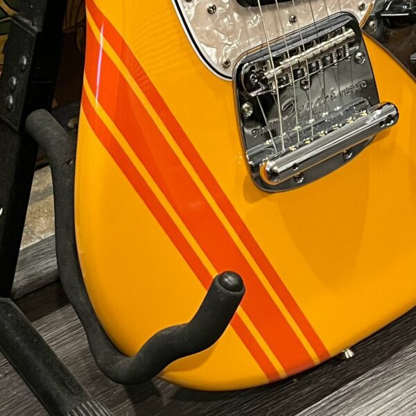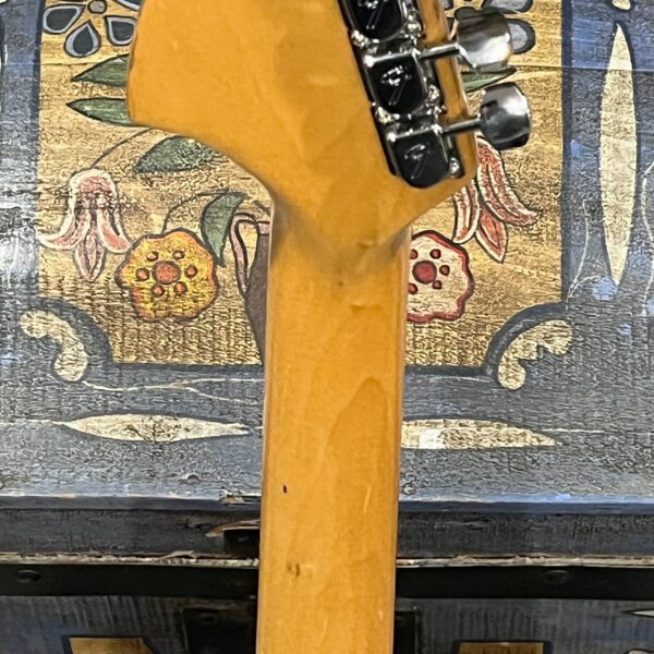 A beautiful marriage of old and new parts – with a modern 2025 Vintera Capri Orange MG-73 Competition body with vintage pickups, but the star of the show is the neck, it’s an original 1978 USA Fender Musicmaster 24″ rosewood neck with pearloid dots, with new Fender F style tuners applied to the old wood. Lots of wear, as you’d expect from something now pushing 50-years-old. The string trees are original to the neck, as is the finish on the neck and the decals. Usually a Musicmaster is 22.5″ scale instrument, but during the 70s a 24″ (Mustang scale) neck was used too, probably pulled from a batch, I can’t explain why but they are around.