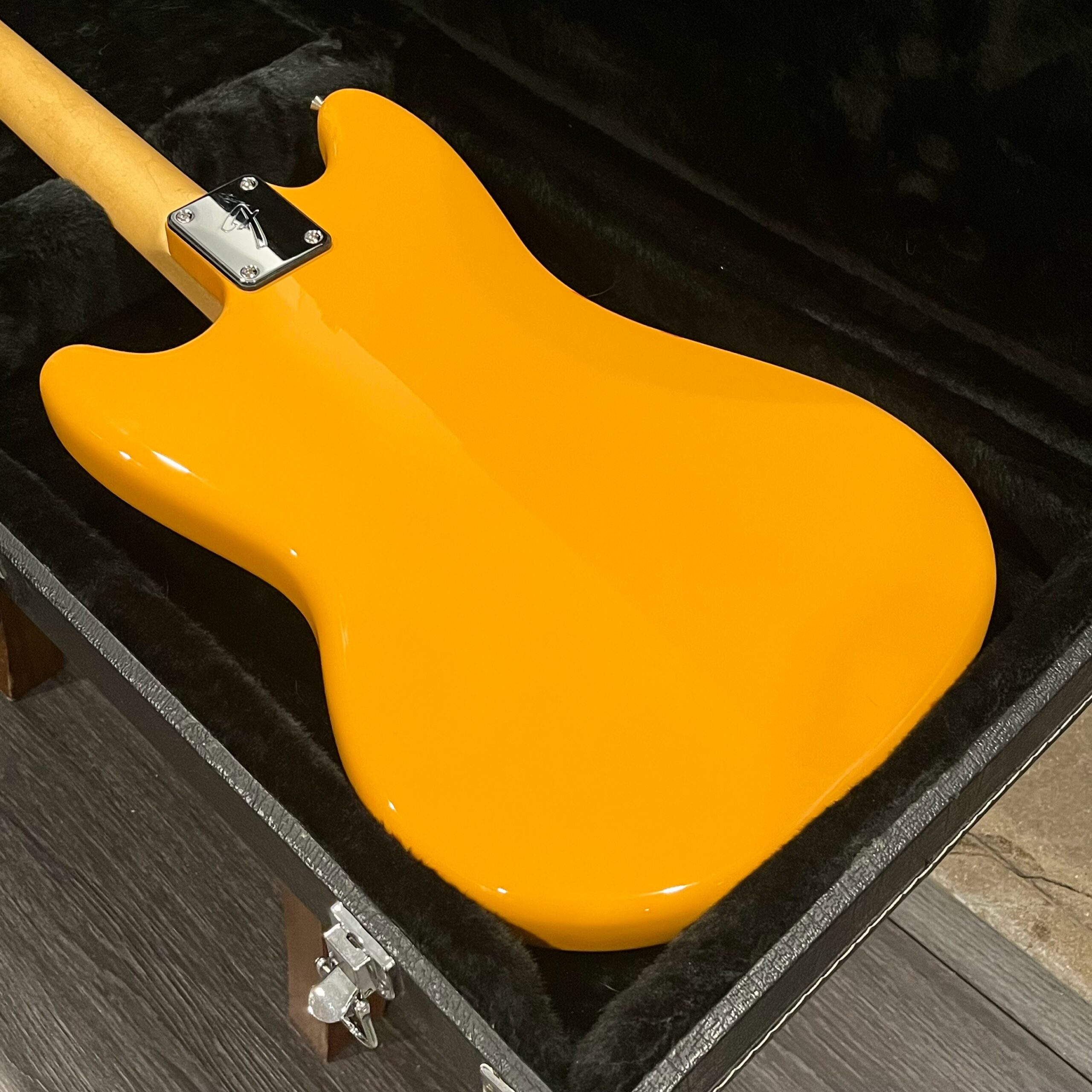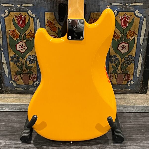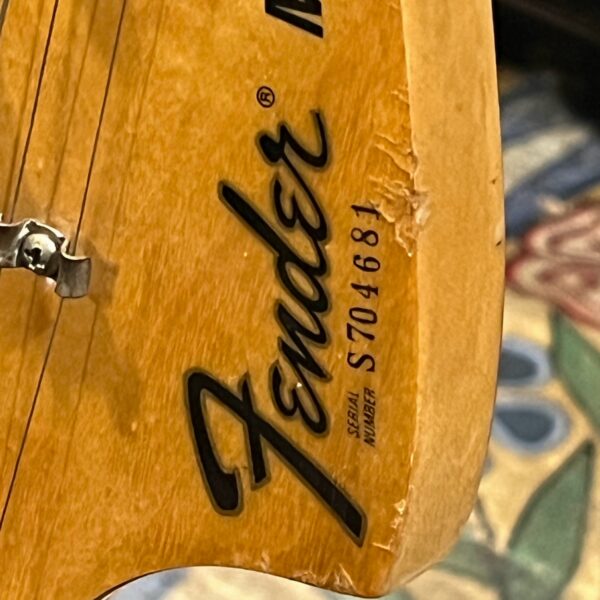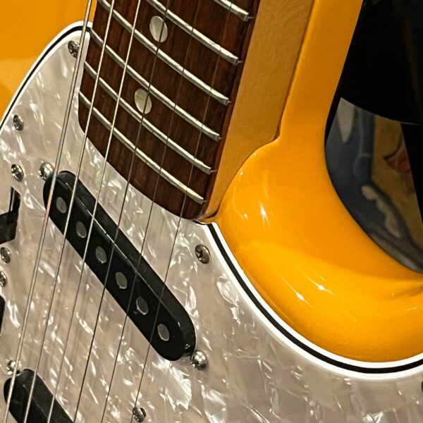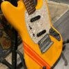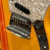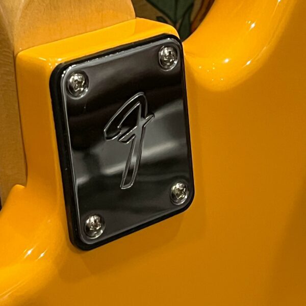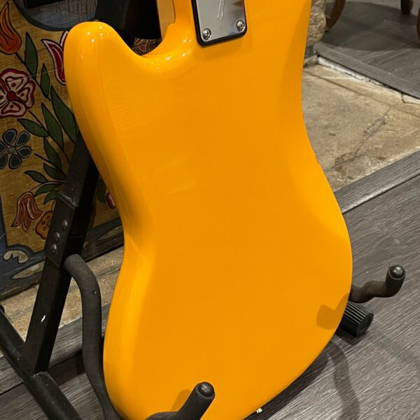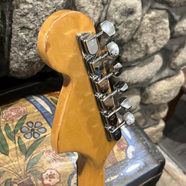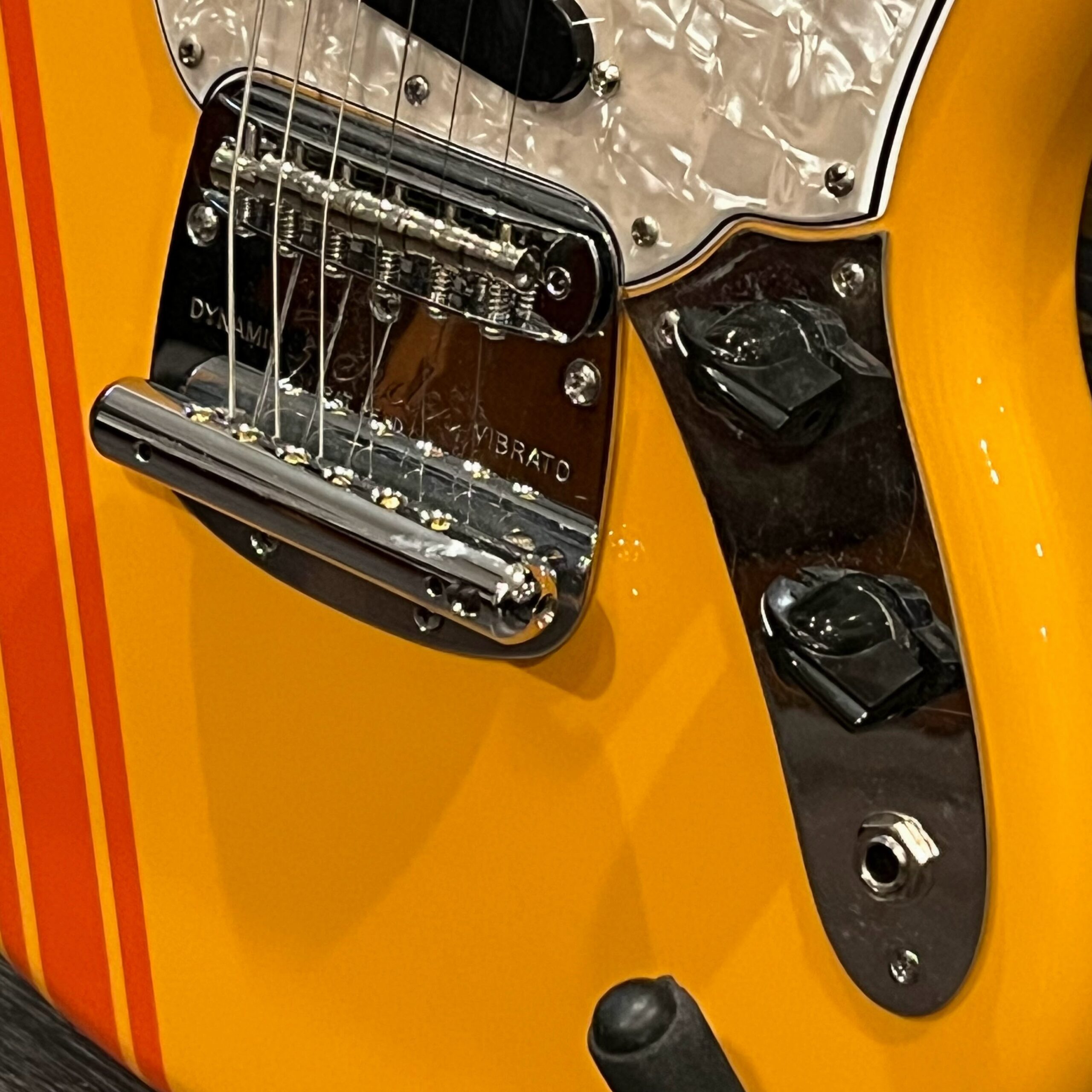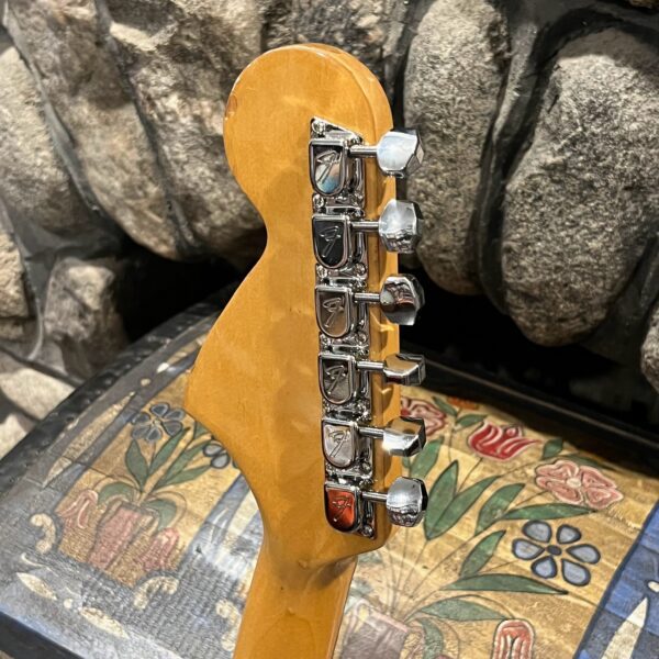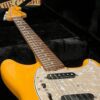 A beautiful marriage of old and new parts – with a modern 2025 Vintera Capri Orange MG-73 Competition body with vintage pickups, but the star of the show is the neck, it’s an original 1978 USA Fender Musicmaster 24″ rosewood neck with pearloid dots, with new Fender F style tuners applied to the old wood. Lots of wear, as you’d expect from something now pushing 50-years-old. The string trees are original to the neck, as is the finish on the neck and the decals. Usually a Musicmaster is 22.5″ scale instrument, but during the 70s a 24″ (Mustang scale) neck was used too, probably pulled from a batch, I can’t explain why but they are around.
