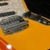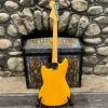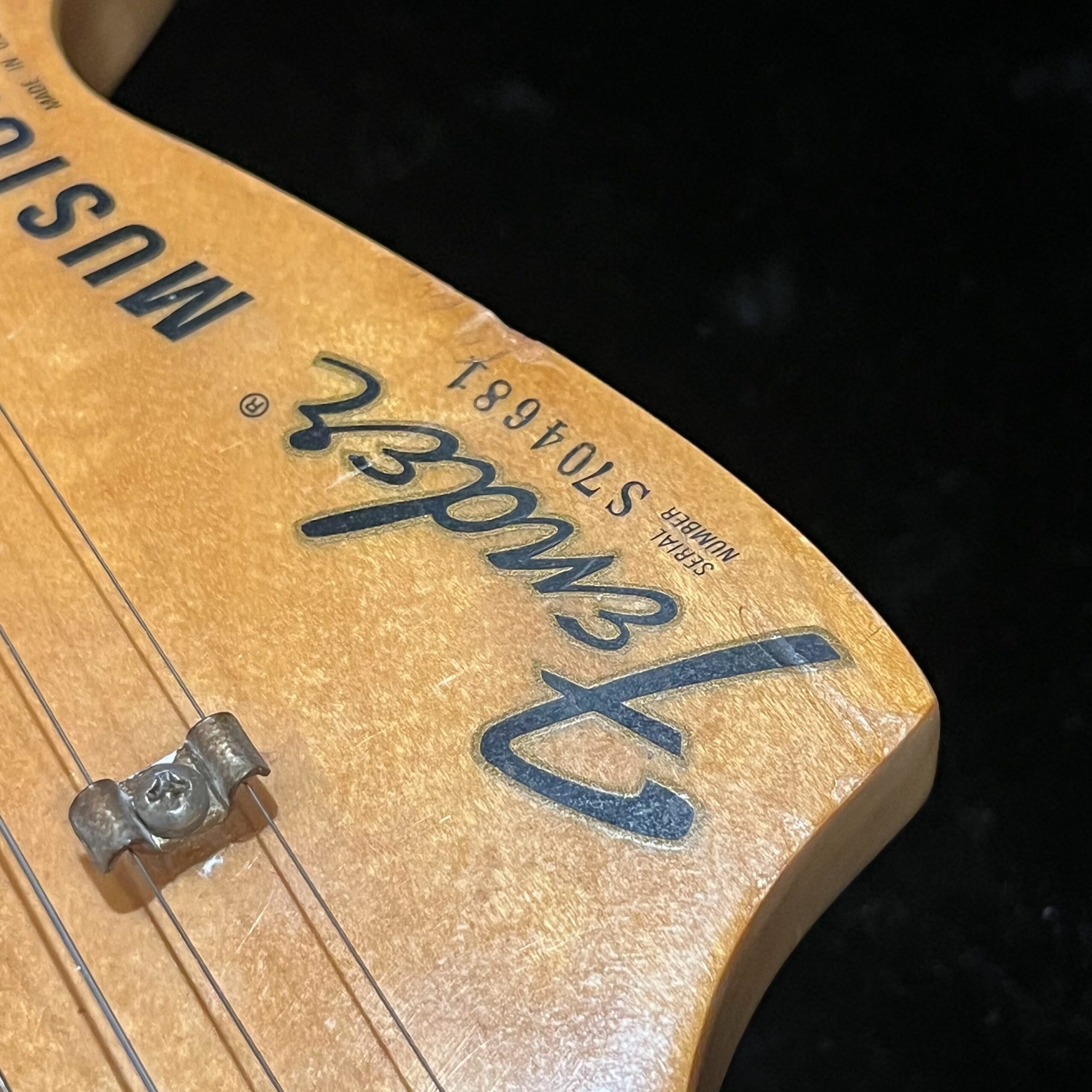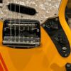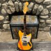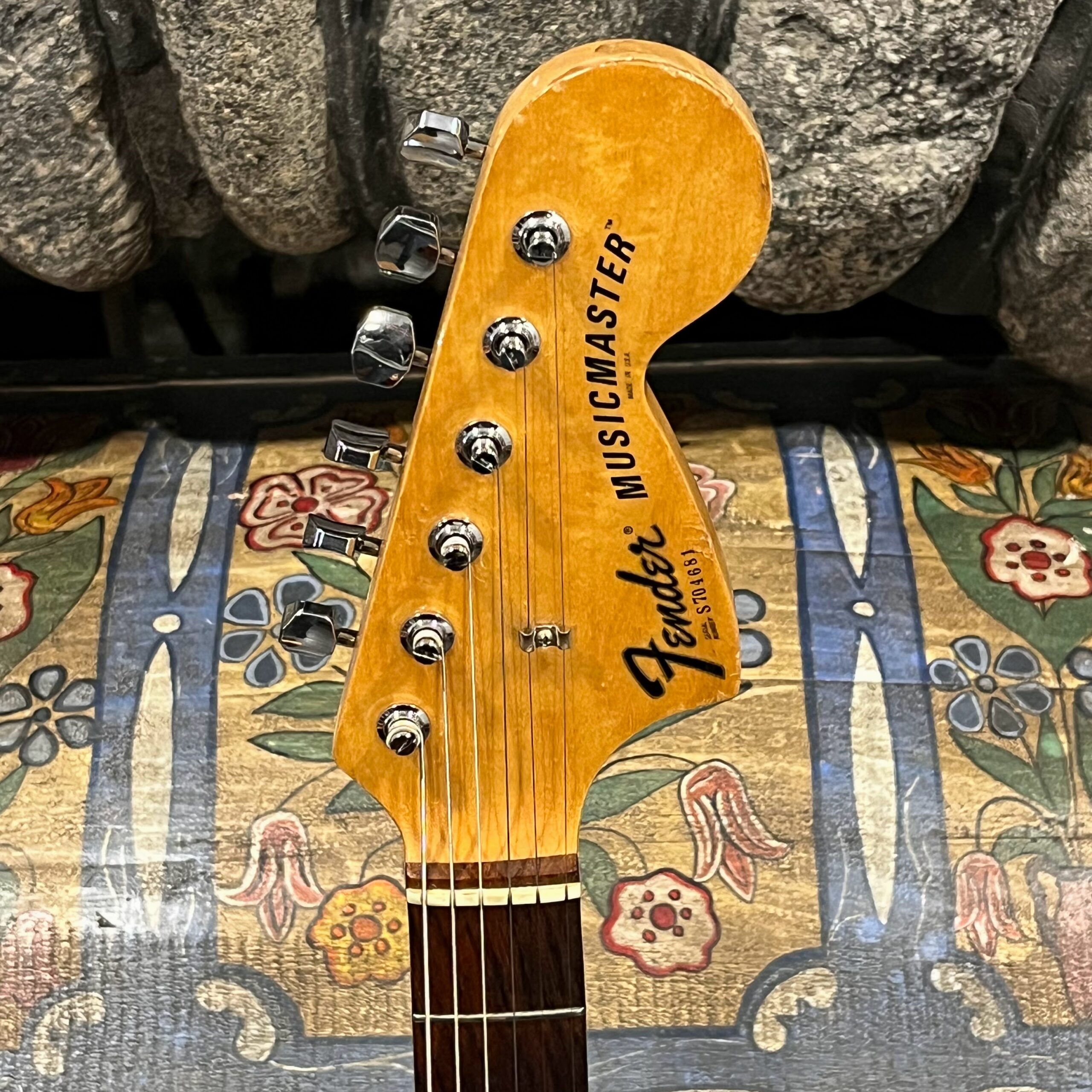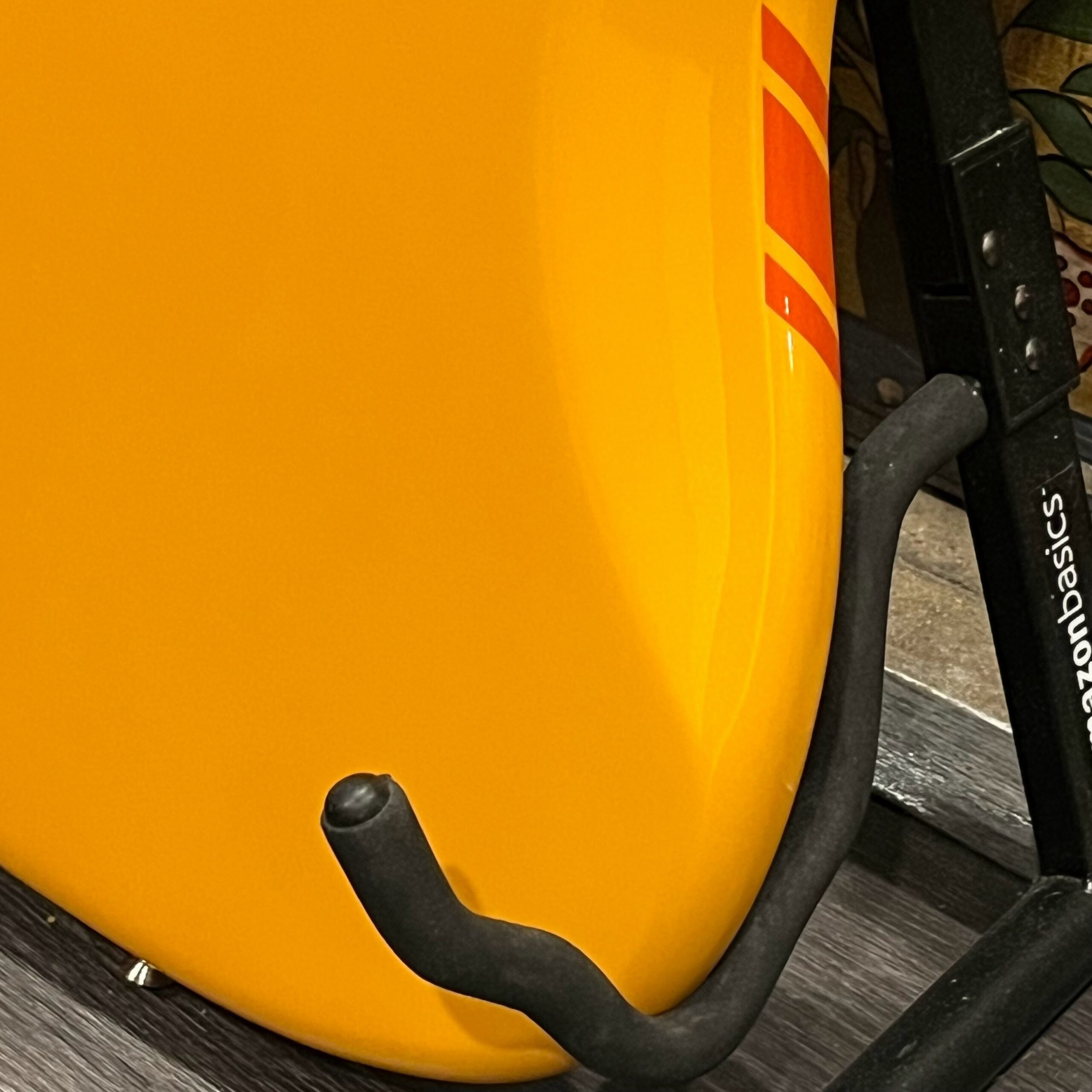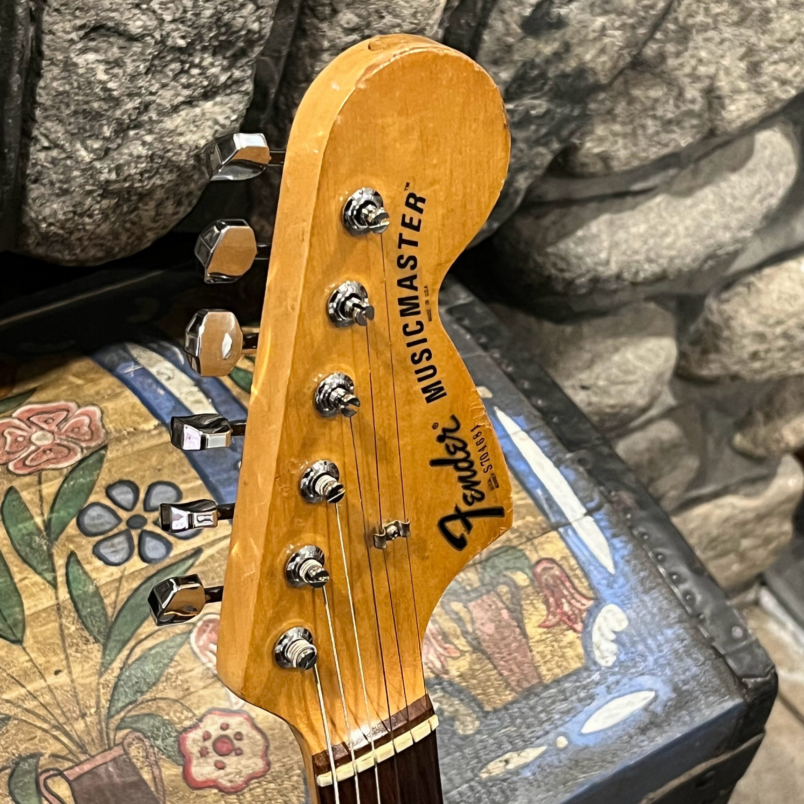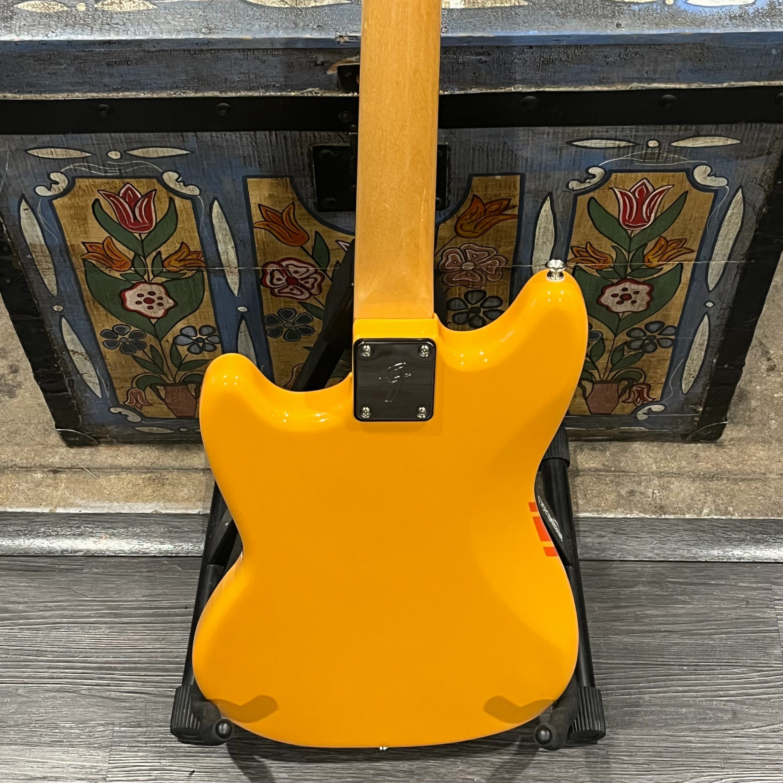 A beautiful marriage of old and new parts – with a modern 2025 Vintera Capri Orange MG-73 Competition body with vintage pickups, but the star of the show is the neck, it’s an original 1978 USA Fender Musicmaster 24″ rosewood neck with pearloid dots, with new Fender F style tuners applied to the old wood. Lots of wear, as you’d expect from something now pushing 50-years-old. The string trees are original to the neck, as is the finish on the neck and the decals. Usually a Musicmaster is 22.5″ scale instrument, but during the 70s a 24″ (Mustang scale) neck was used too, probably pulled from a batch, I can’t explain why but they are around.