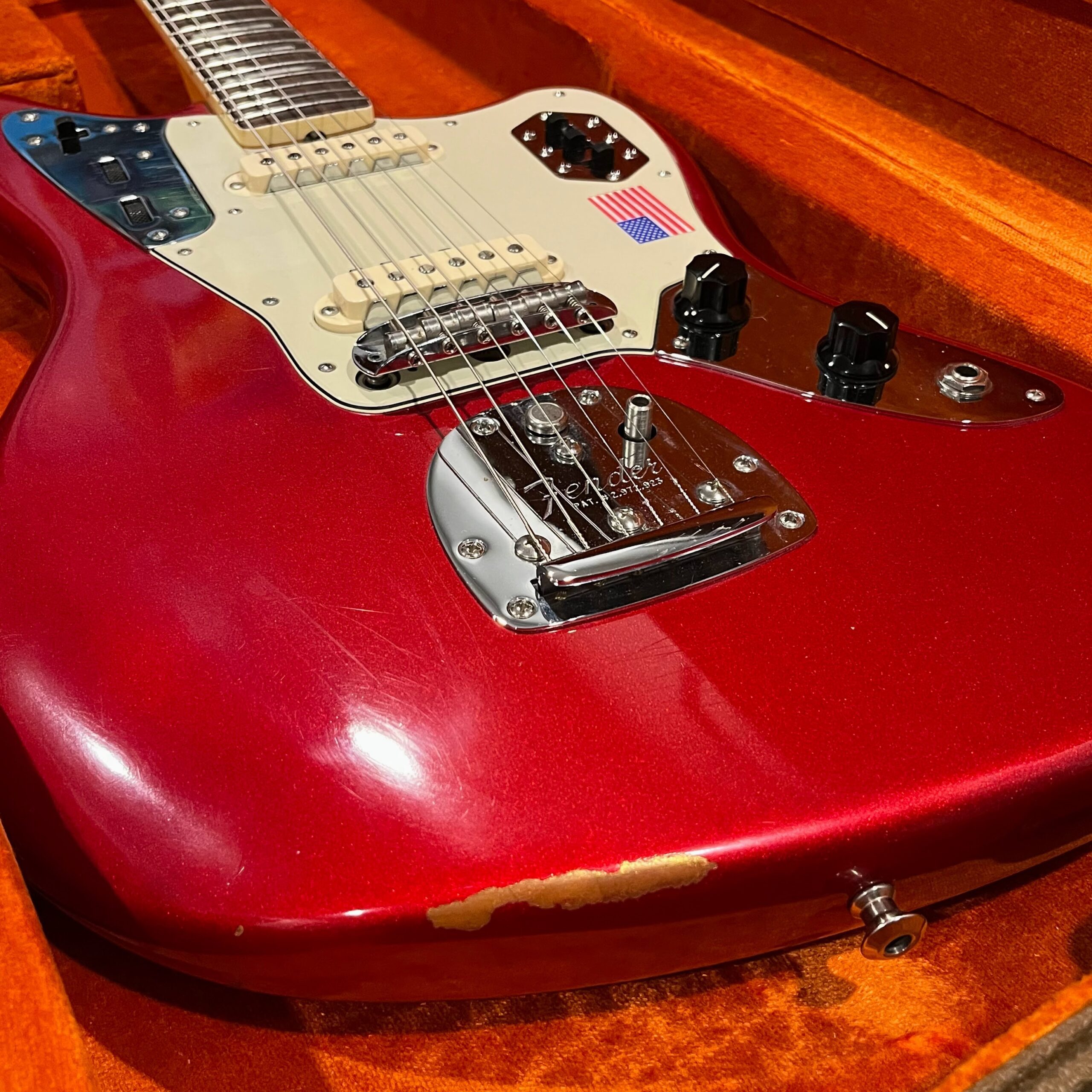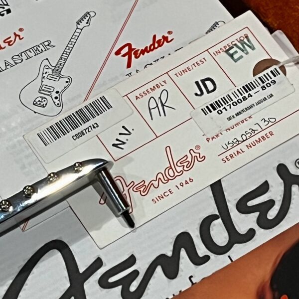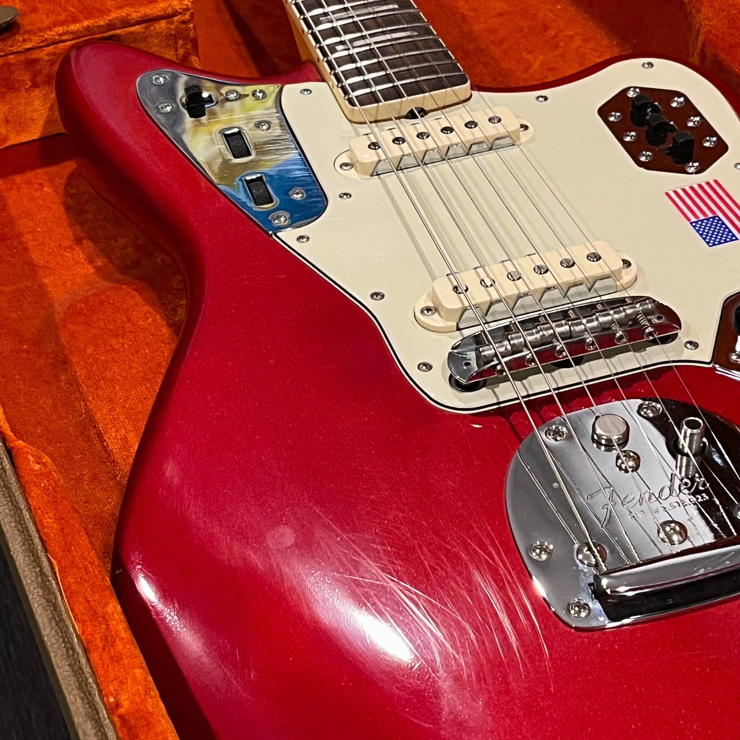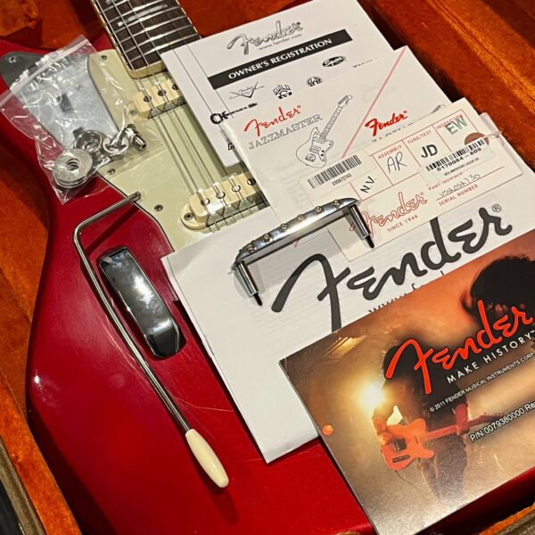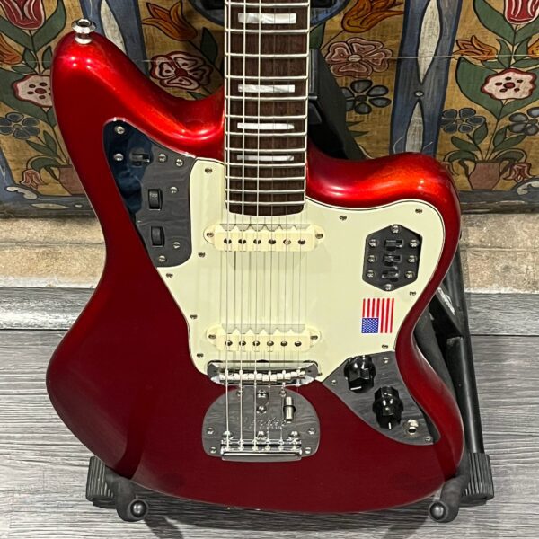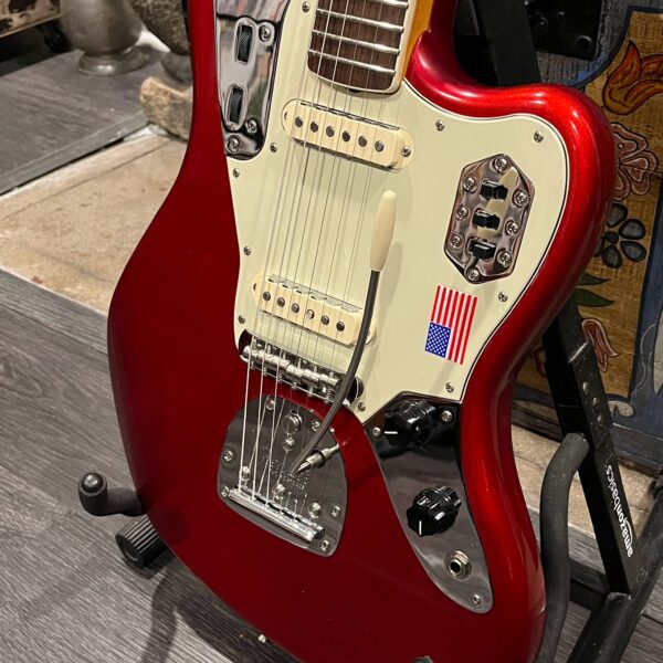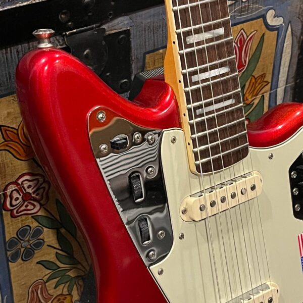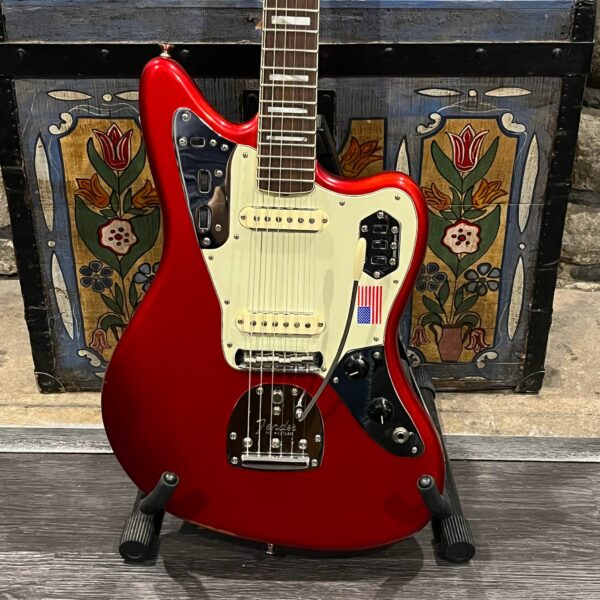 2012 50th Anniversary Jaguar in Candy Apple Red nitro lacquer with a rosewood bound, block inlayed 21 fret vintage style neck. Screaming special wind Anniversary pickups come stock from the factory, the bridge was swapped for a Mustang barrel style saddled one in the correct 9.5″ radius. This one comes in original hardcase with tags, tools, tremolo arm, straplock parts, original bridge and cover from the Fender factory in Corona, California. Weighs 8lb 12oz, setup on 10s. Pro setup by the guys at Eric’s Guitars in Van Nuys, CA, still has the American flag on the 3-ply mint pickguard. The earlier instruments in each color were numbered, this one is a nice low Lucky #7 – marked at the factory by the luthiers who made them.