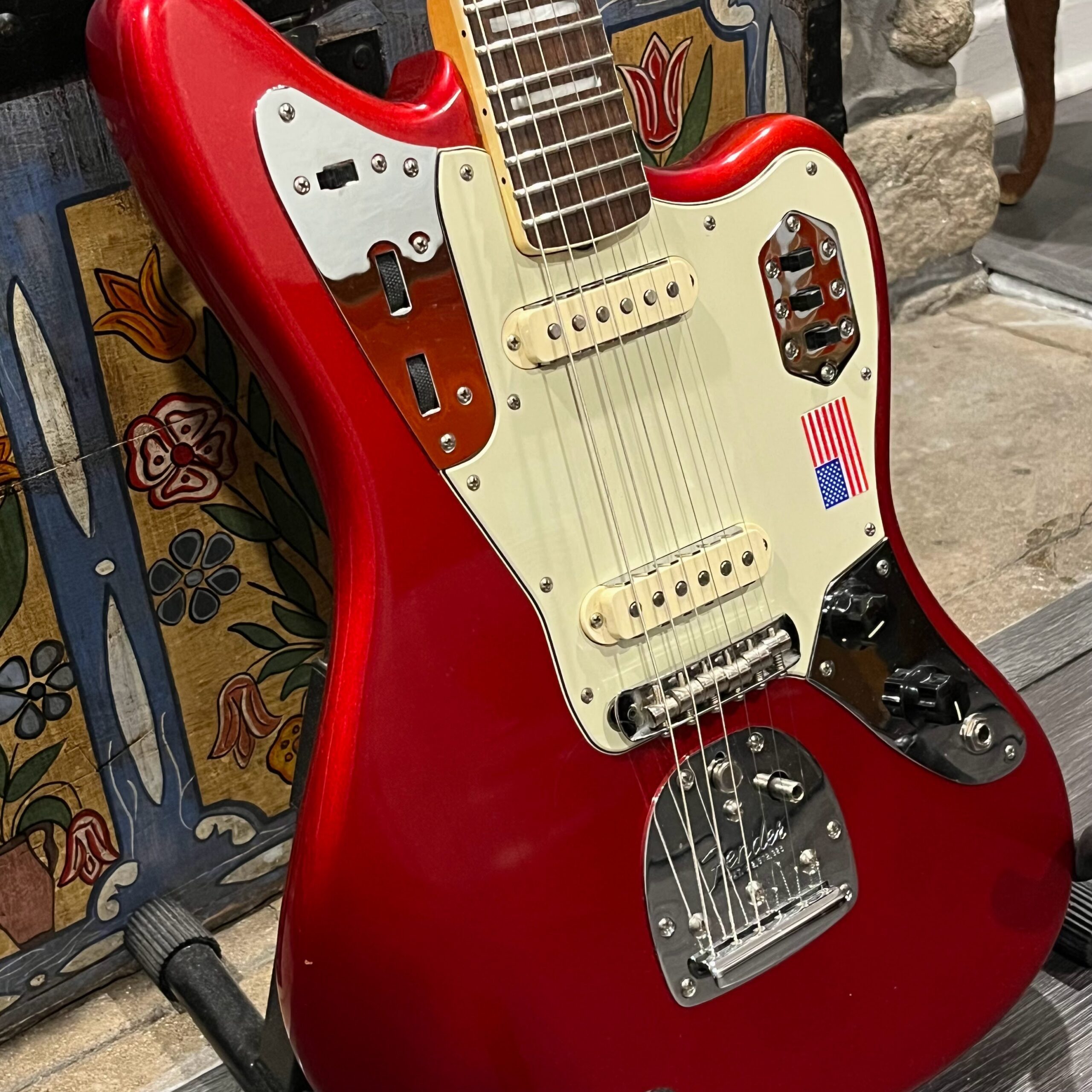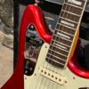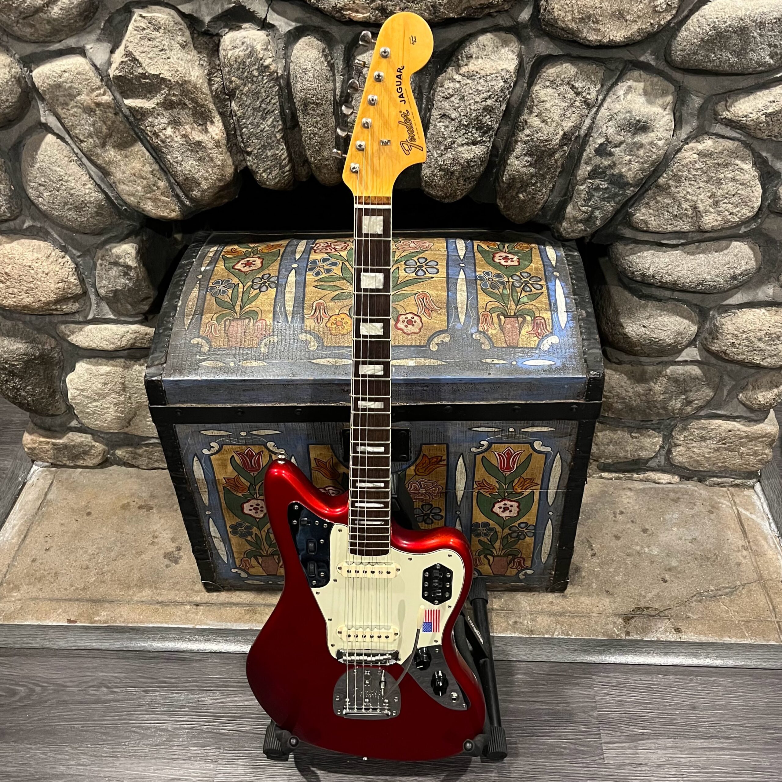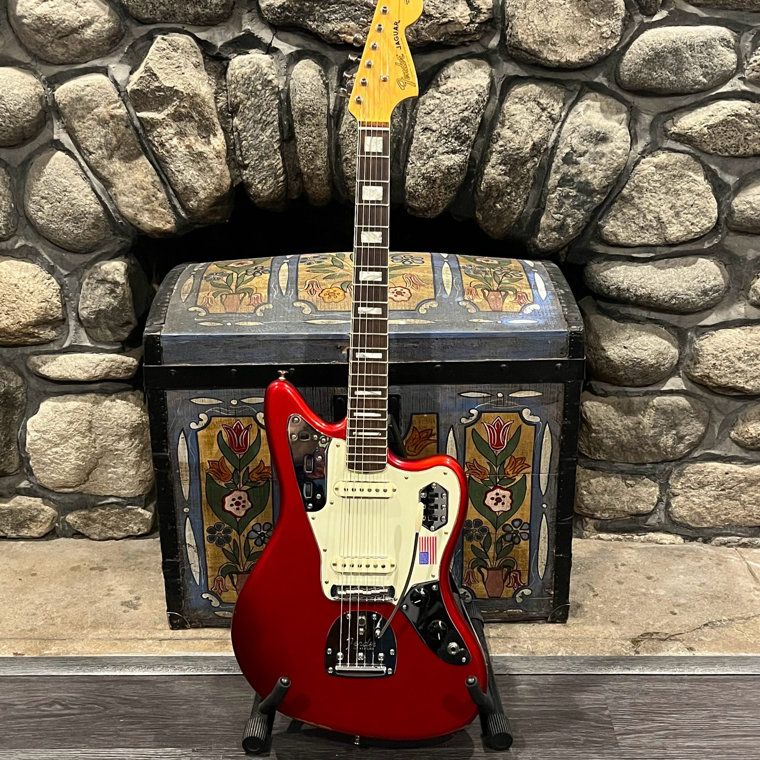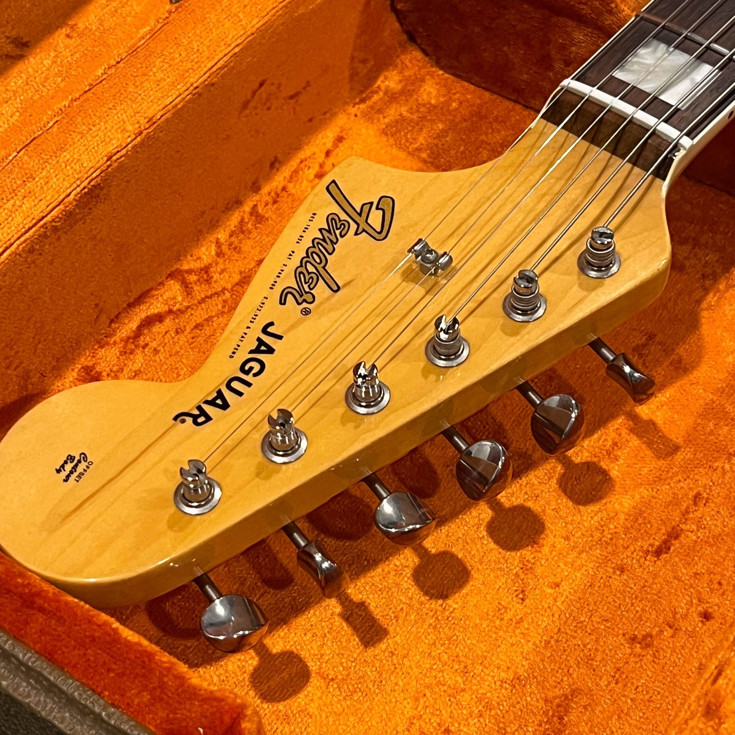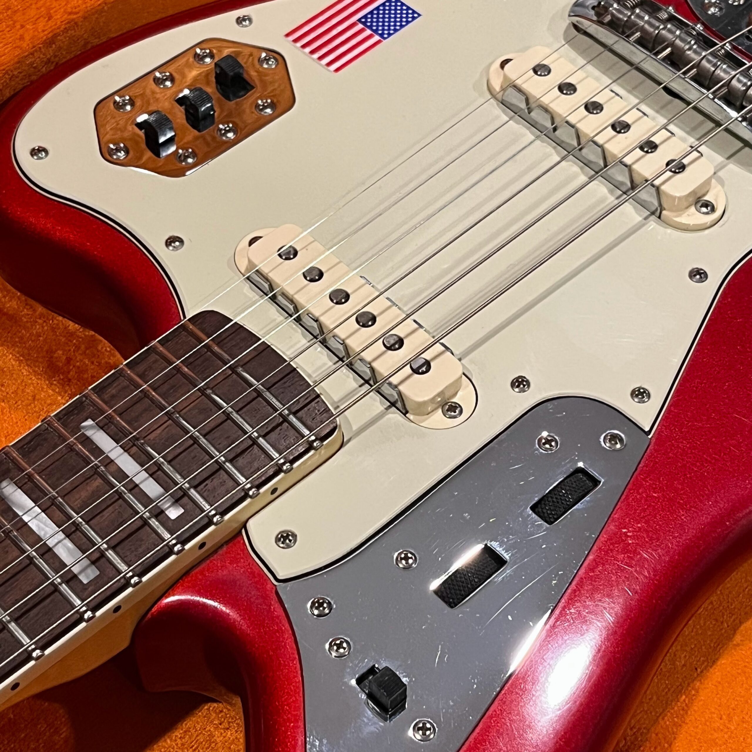 2012 50th Anniversary Jaguar in Candy Apple Red nitro lacquer with a rosewood bound, block inlayed 21 fret vintage style neck. Screaming special wind Anniversary pickups come stock from the factory, the bridge was swapped for a Mustang barrel style saddled one in the correct 9.5″ radius. This one comes in original hardcase with tags, tools, tremolo arm, straplock parts, original bridge and cover from the Fender factory in Corona, California. Weighs 8lb 12oz, setup on 10s. Pro setup by the guys at Eric’s Guitars in Van Nuys, CA, still has the American flag on the 3-ply mint pickguard. The earlier instruments in each color were numbered, this one is a nice low Lucky #7 – marked at the factory by the luthiers who made them.