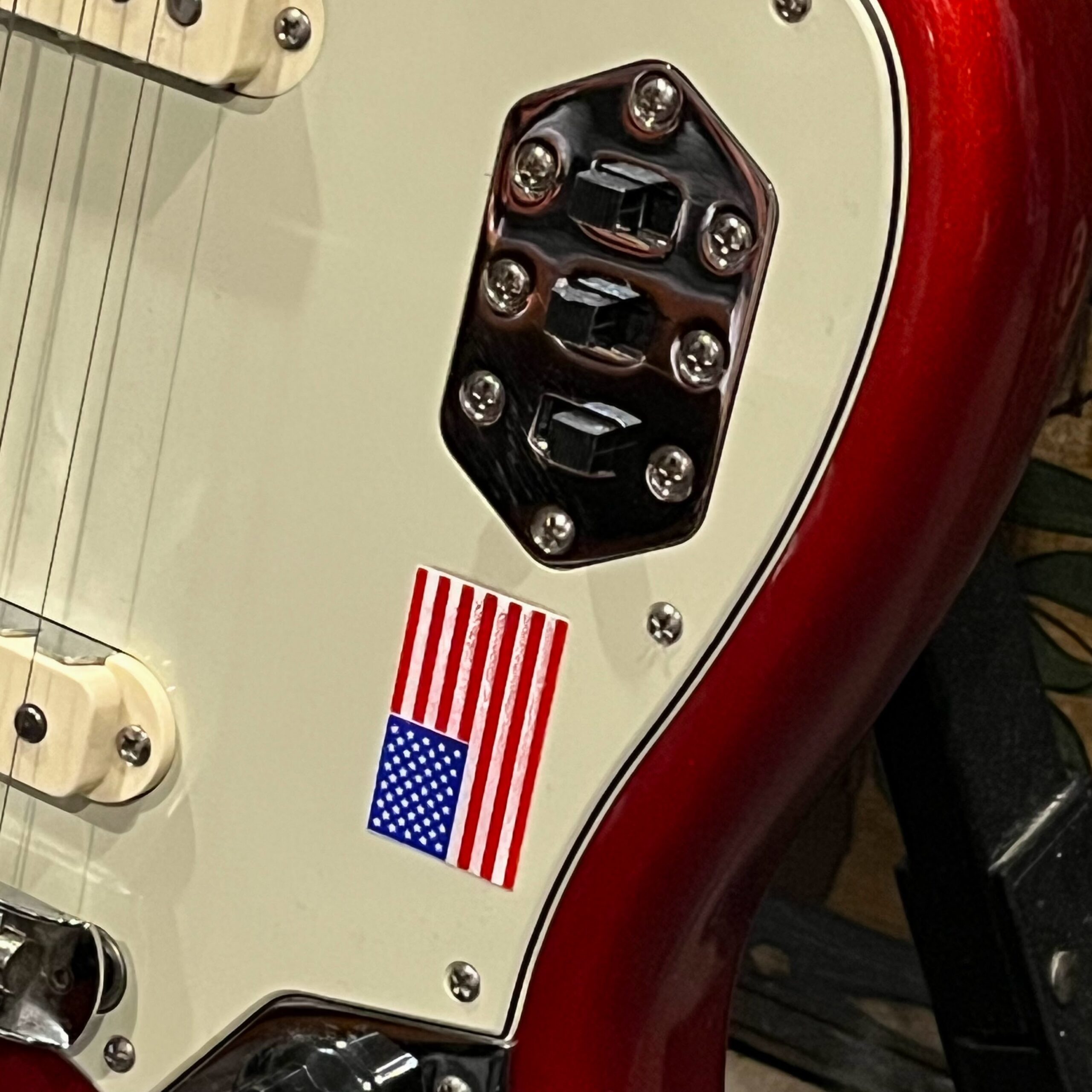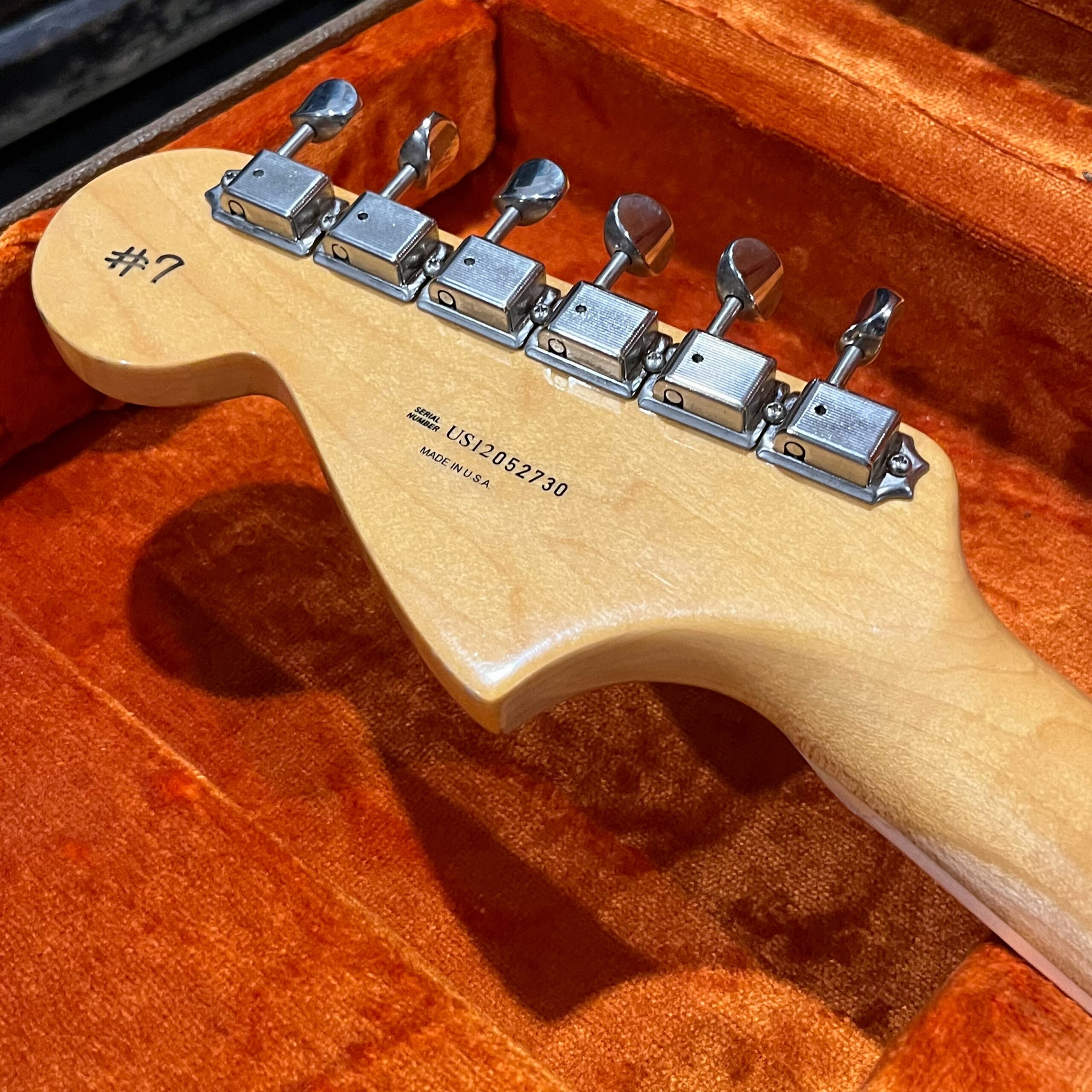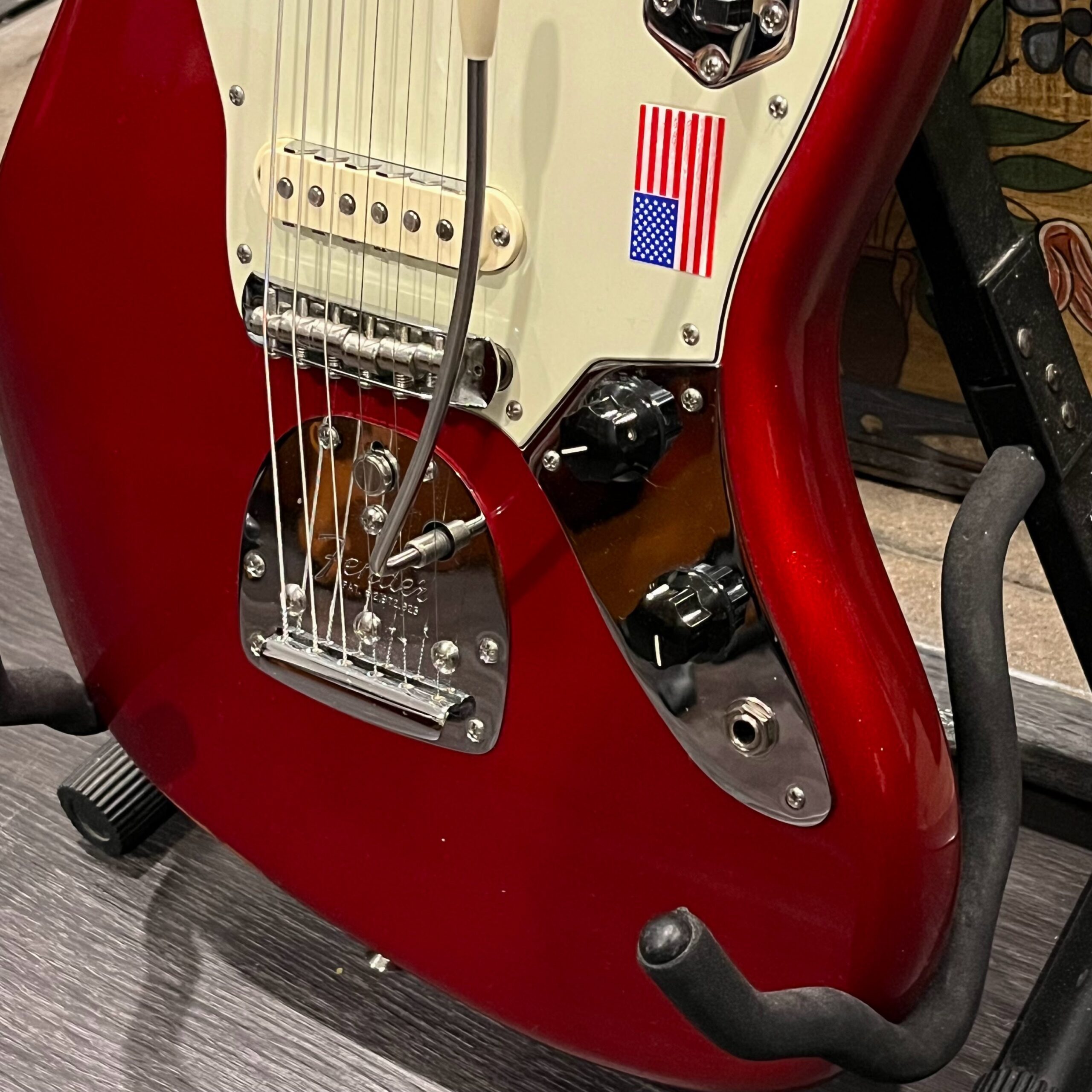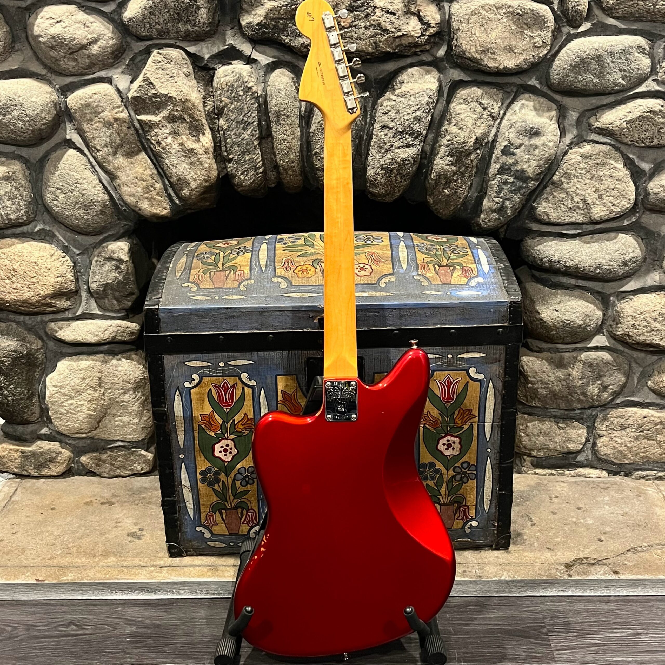 2012 50th Anniversary Jaguar in Candy Apple Red nitro lacquer with a rosewood bound, block inlayed 21 fret vintage style neck. Screaming special wind Anniversary pickups come stock from the factory, the bridge was swapped for a Mustang barrel style saddled one in the correct 9.5″ radius. This one comes in original hardcase with tags, tools, tremolo arm, straplock parts, original bridge and cover from the Fender factory in Corona, California. Weighs 8lb 12oz, setup on 10s. Pro setup by the guys at Eric’s Guitars in Van Nuys, CA, still has the American flag on the 3-ply mint pickguard. The earlier instruments in each color were numbered, this one is a nice low Lucky #7 – marked at the factory by the luthiers who made them.