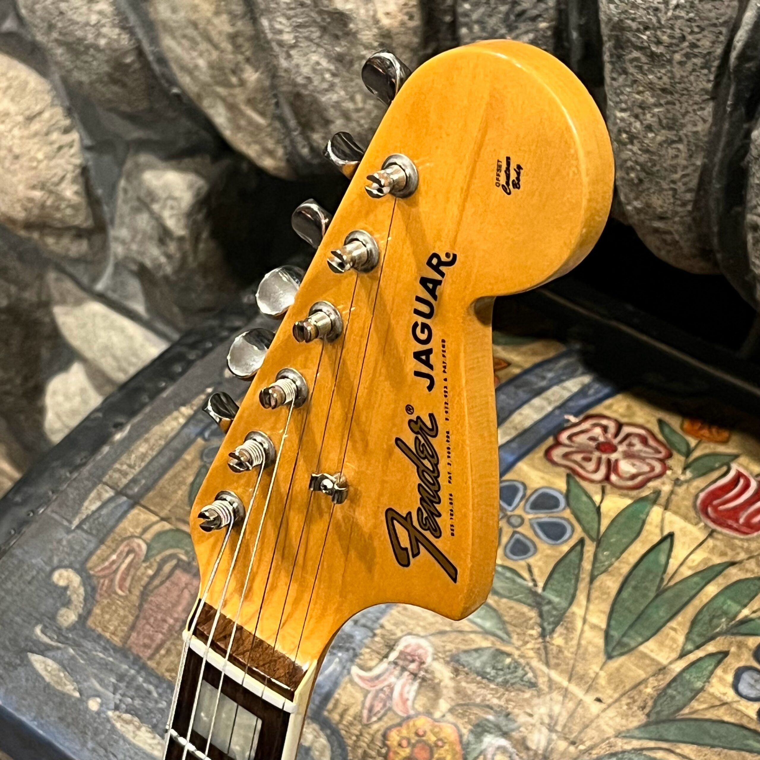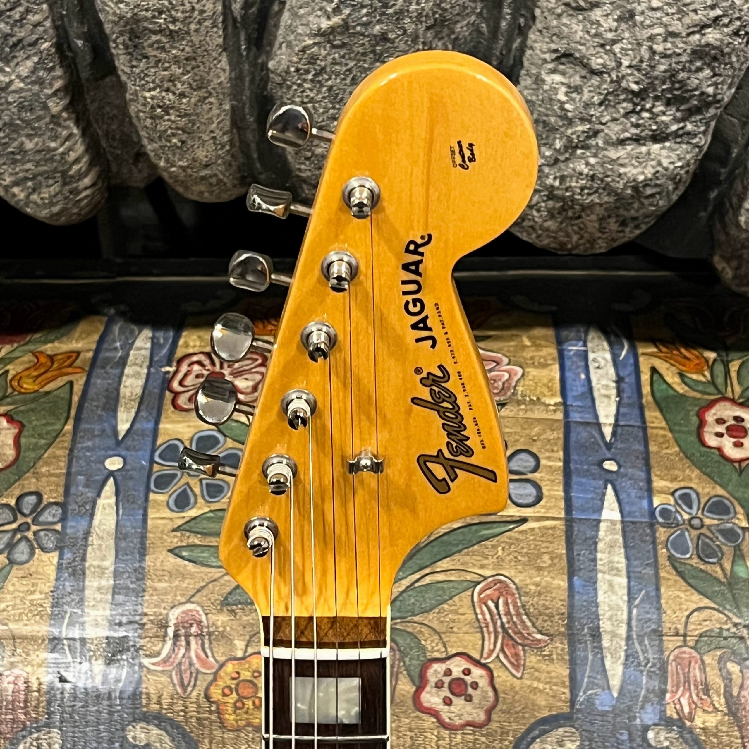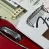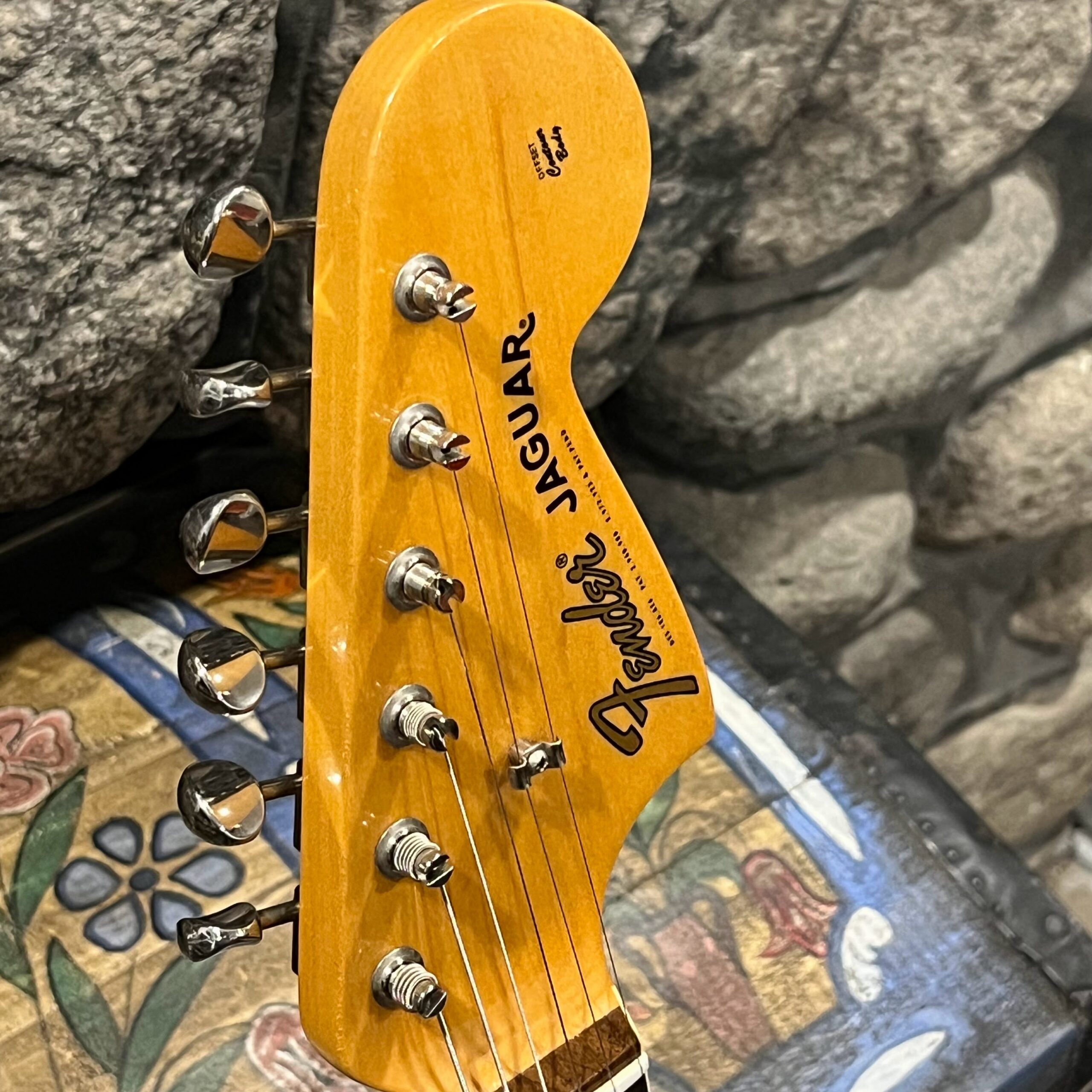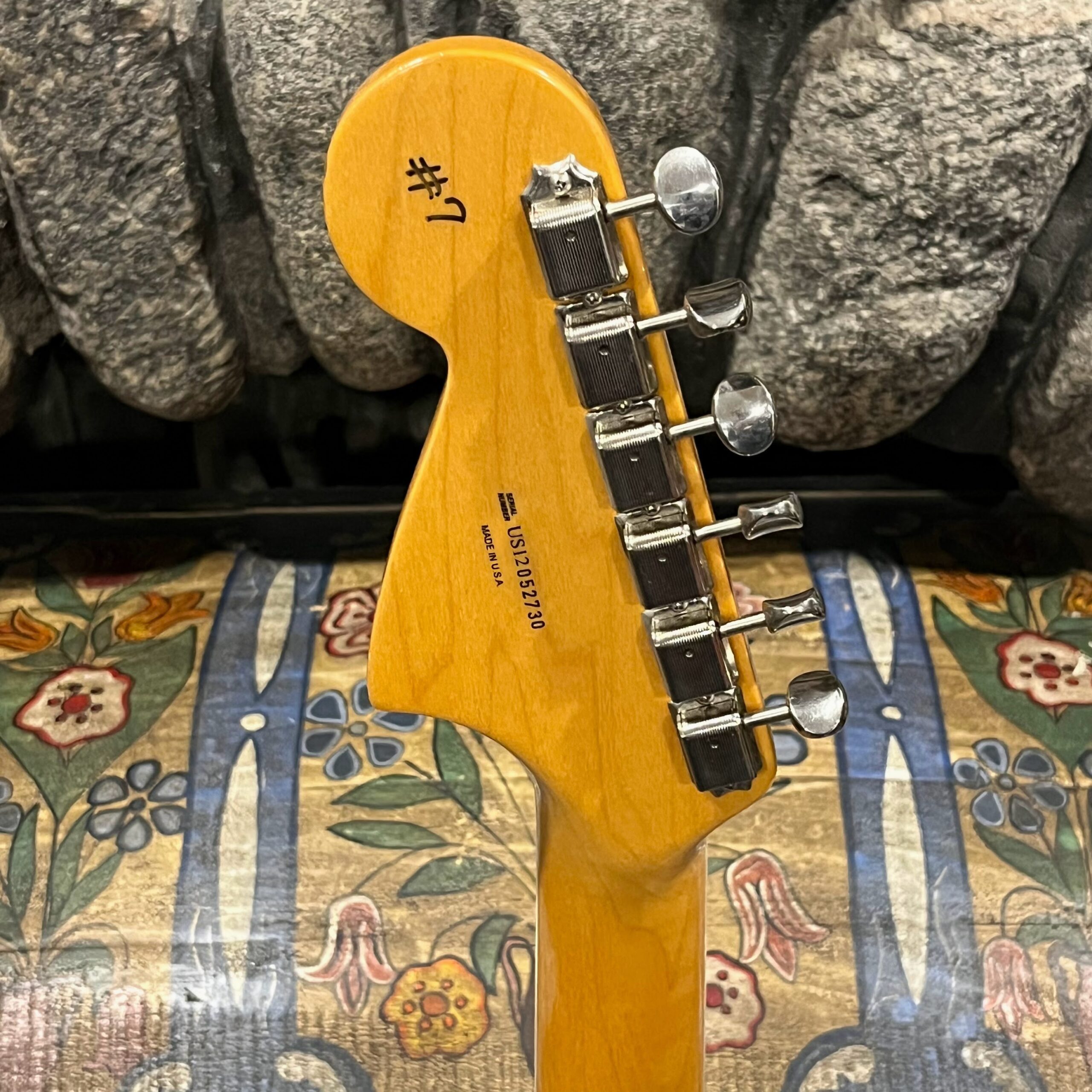 2012 50th Anniversary Jaguar in Candy Apple Red nitro lacquer with a rosewood bound, block inlayed 21 fret vintage style neck. Screaming special wind Anniversary pickups come stock from the factory, the bridge was swapped for a Mustang barrel style saddled one in the correct 9.5″ radius. This one comes in original hardcase with tags, tools, tremolo arm, straplock parts, original bridge and cover from the Fender factory in Corona, California. Weighs 8lb 12oz, setup on 10s. Pro setup by the guys at Eric’s Guitars in Van Nuys, CA, still has the American flag on the 3-ply mint pickguard. The earlier instruments in each color were numbered, this one is a nice low Lucky #7 – marked at the factory by the luthiers who made them.