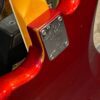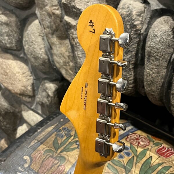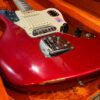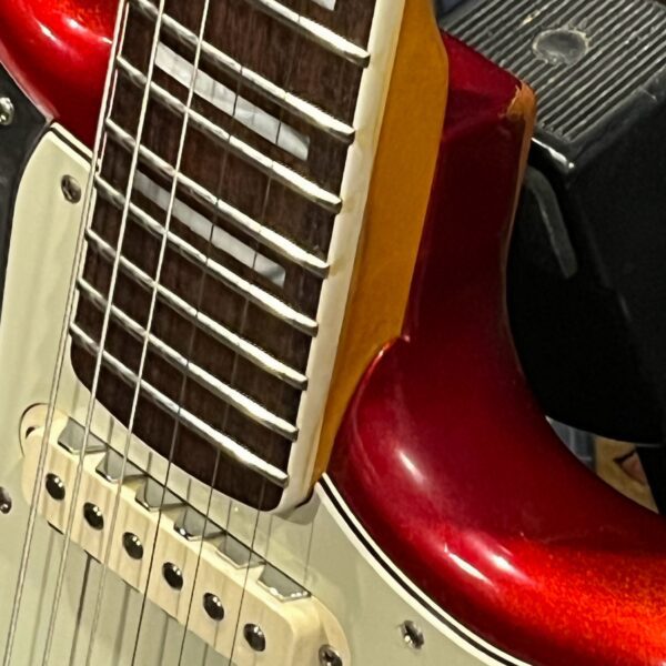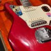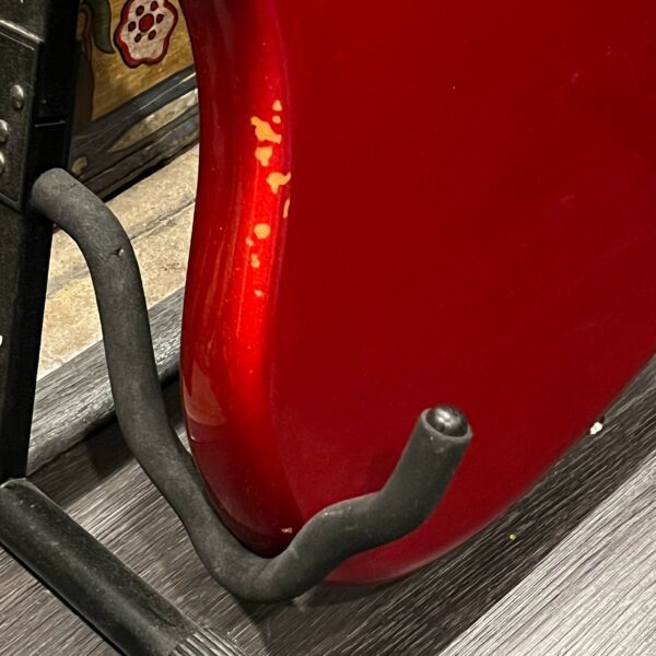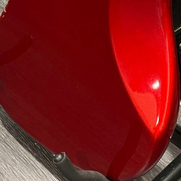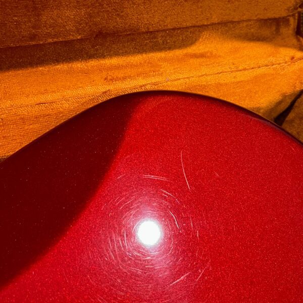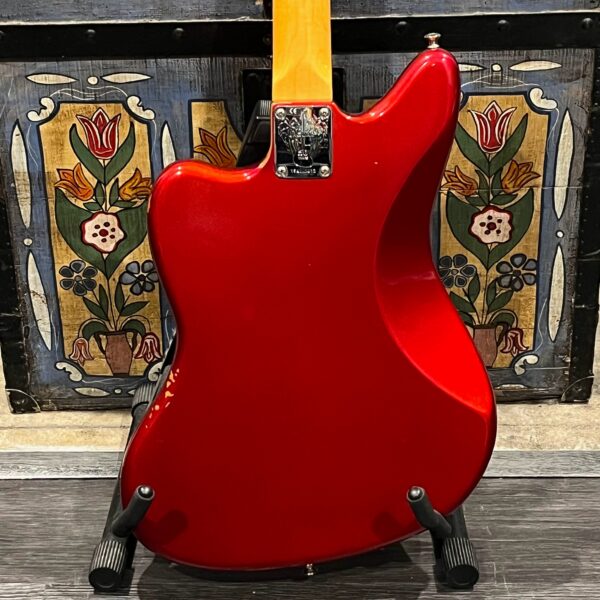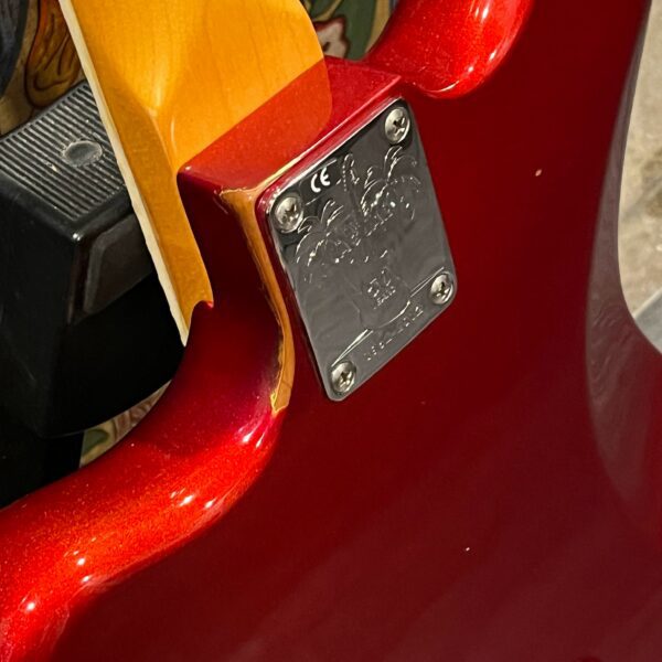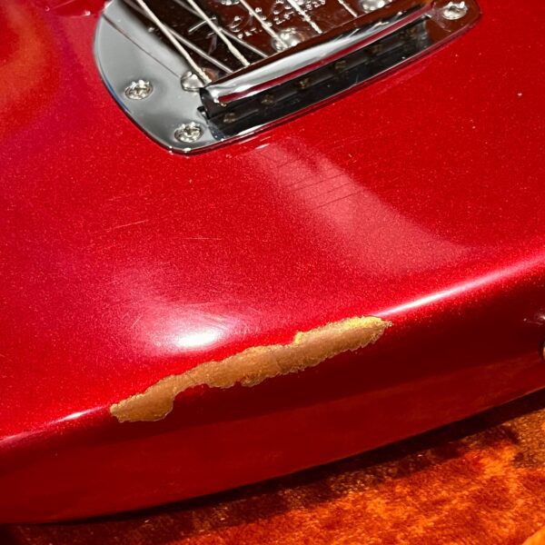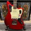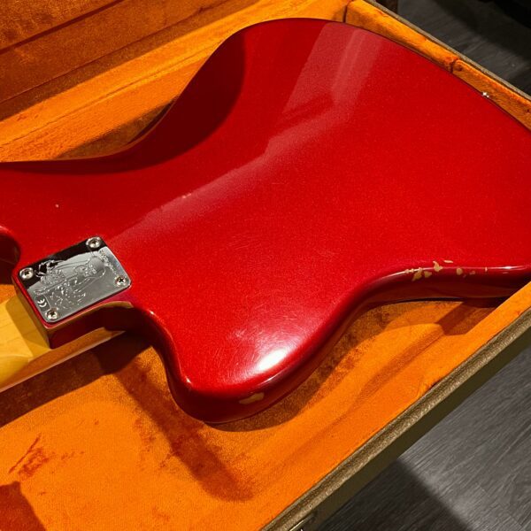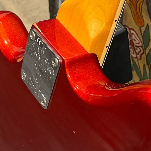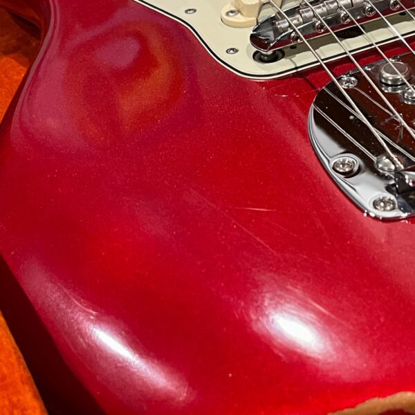 The guitar is in very good, mostly stock condition and is mechanically excellent. Modified with a Mustang style bridge and straplocks. The nitro on the body shows signs of wear, shows missing flakes of the red overcoat on the sides and lower bout, one or two chips on the back as well as swirls, hazing, scratches and impressions. The full spectrum of aging nitro sins – looks great, feels excellent. The first few of every color were hand-numbered, this one is lucky number 7. Frets just leveled, crowned and polished by the pros at Eric’s Guitar Shop in Van Nuys, CA. Lots more pictures of this one at my site which Reverb doesn’t want me to link to, but if you put a dotcom behind my shop name, you’d already be there. See the pictures, ask for more.