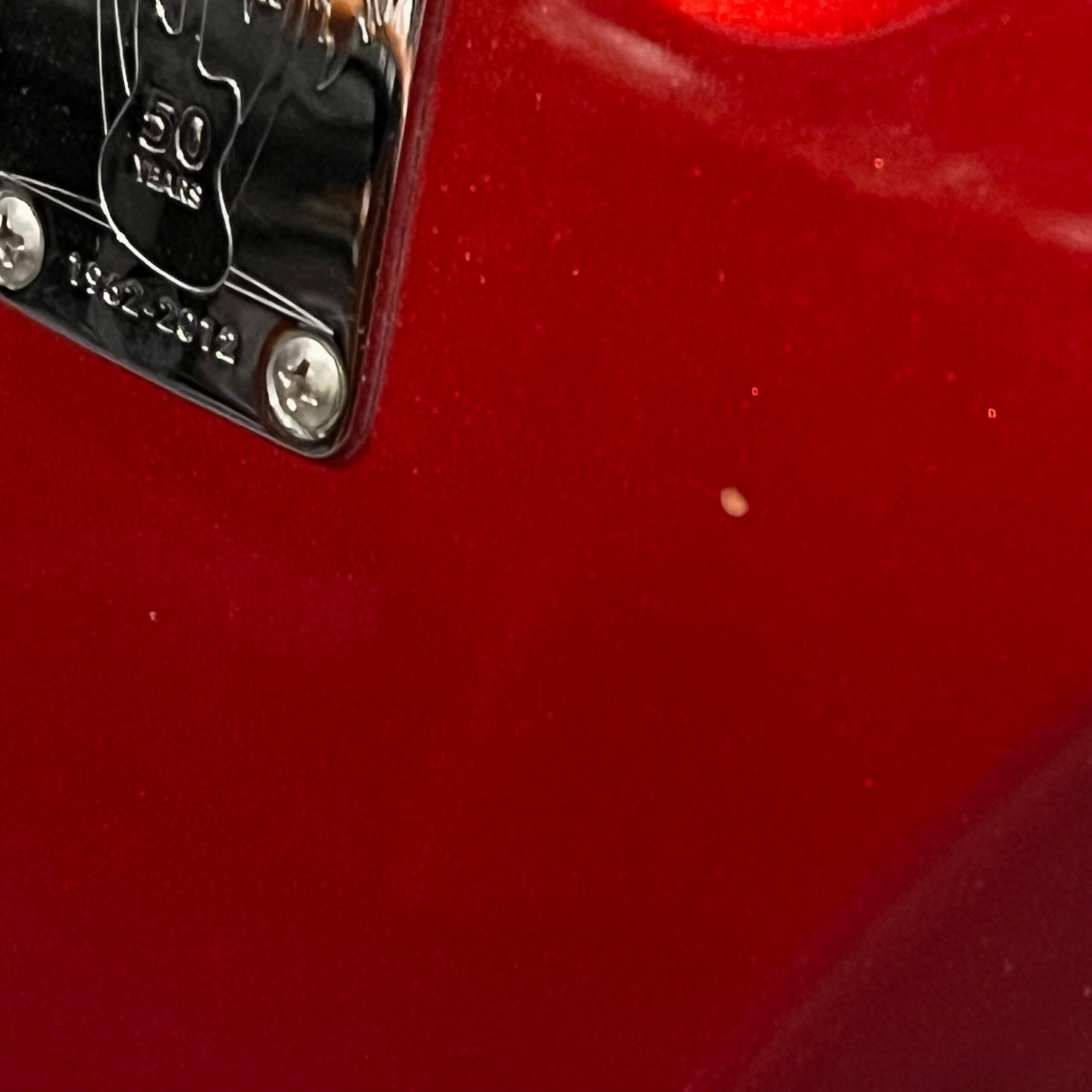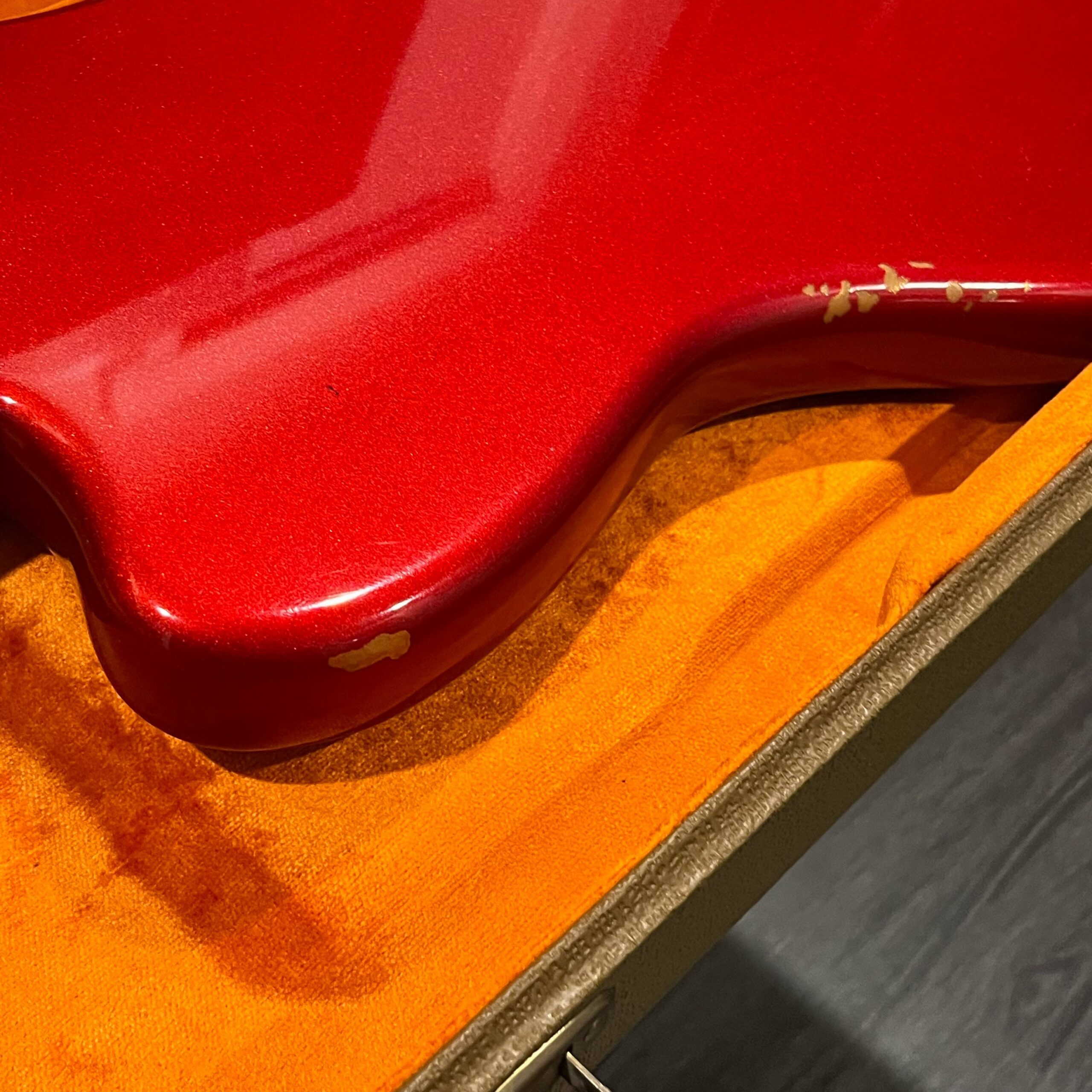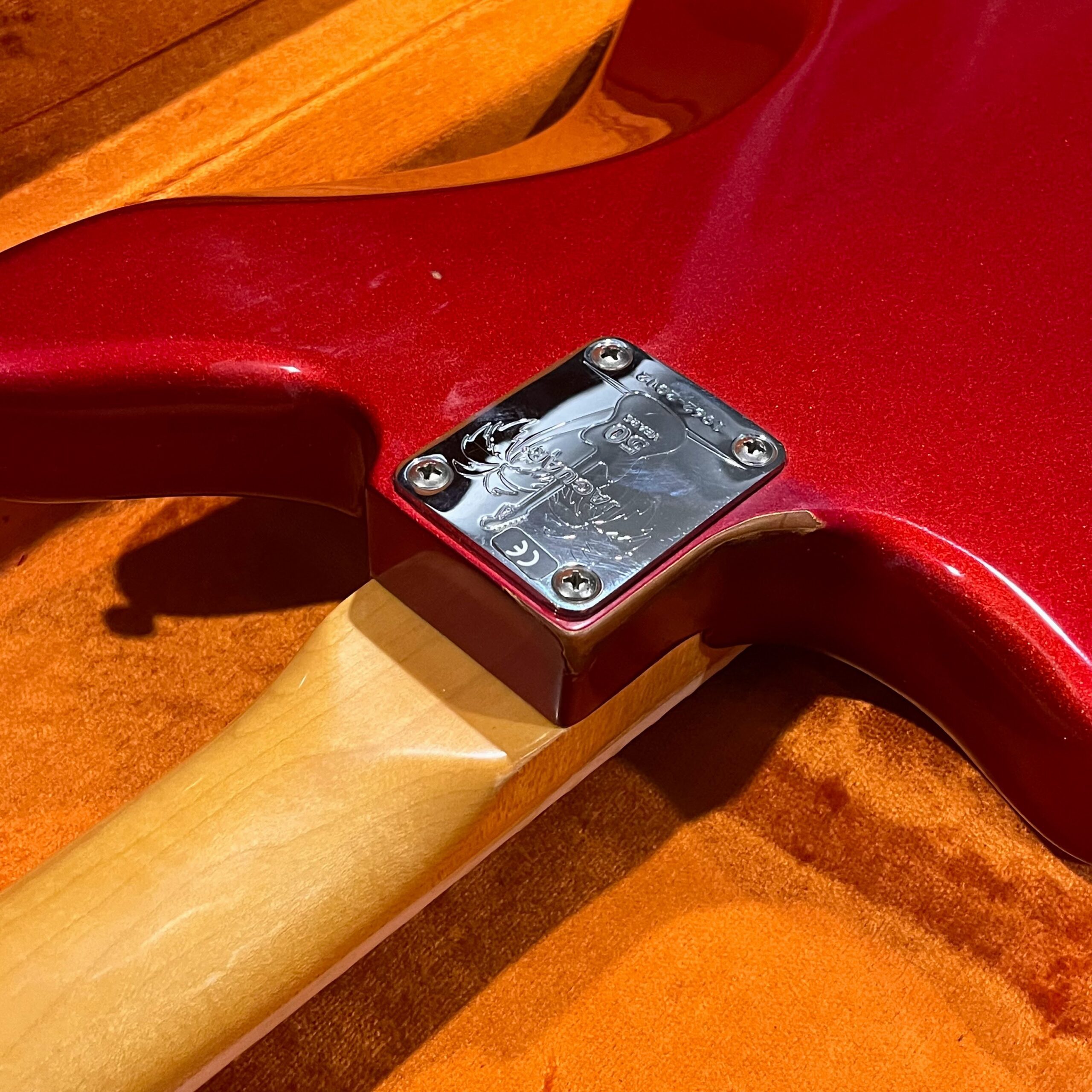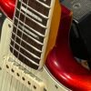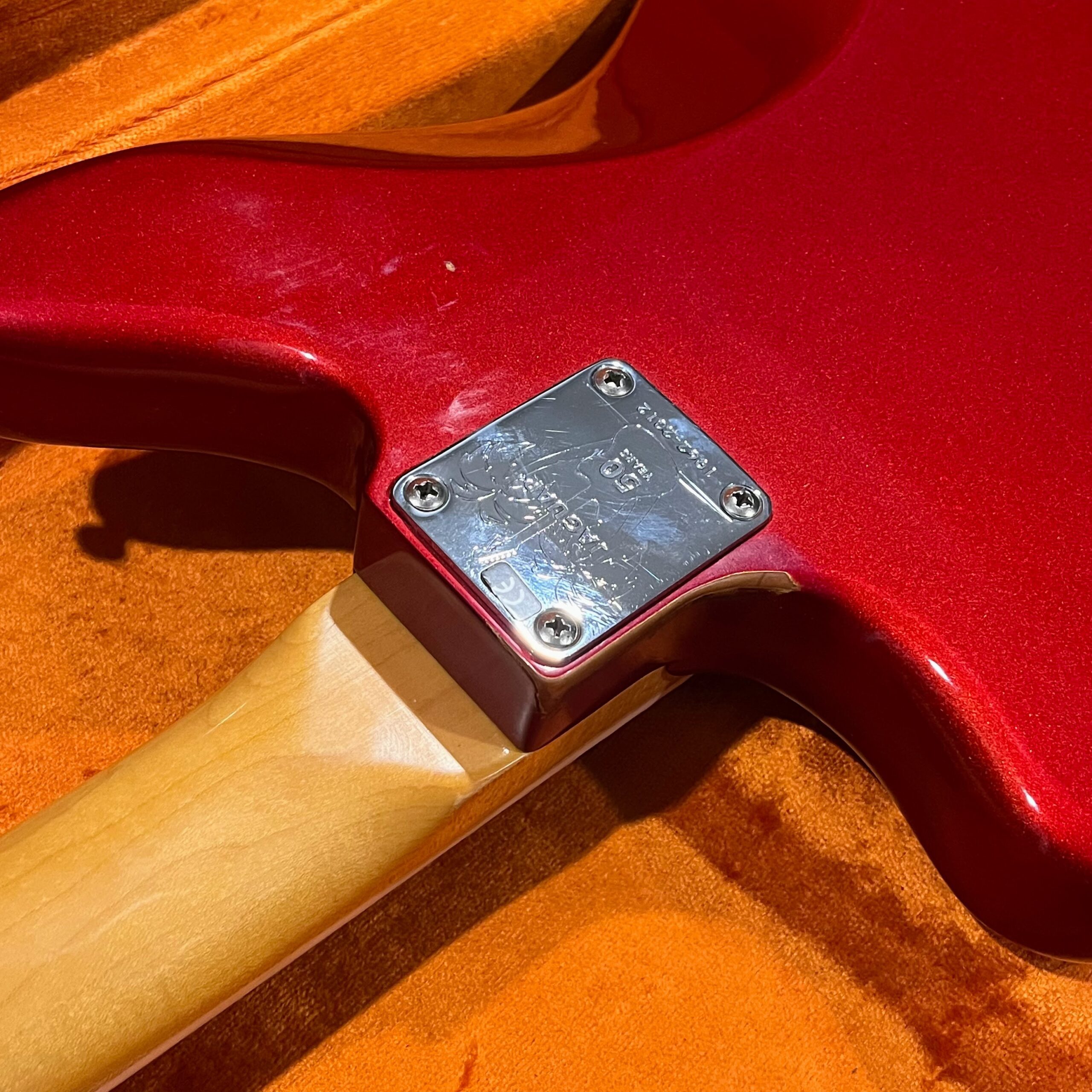 The guitar is in very good, mostly stock condition and is mechanically excellent. Modified with a Mustang style bridge and straplocks. The nitro on the body shows signs of wear, shows missing flakes of the red overcoat on the sides and lower bout, one or two chips on the back as well as swirls, hazing, scratches and impressions. The full spectrum of aging nitro sins – looks great, feels excellent. The first few of every color were hand-numbered, this one is lucky number 7. Frets just leveled, crowned and polished by the pros at Eric’s Guitar Shop in Van Nuys, CA. Lots more pictures of this one at my site which Reverb doesn’t want me to link to, but if you put a dotcom behind my shop name, you’d already be there. See the pictures, ask for more.
